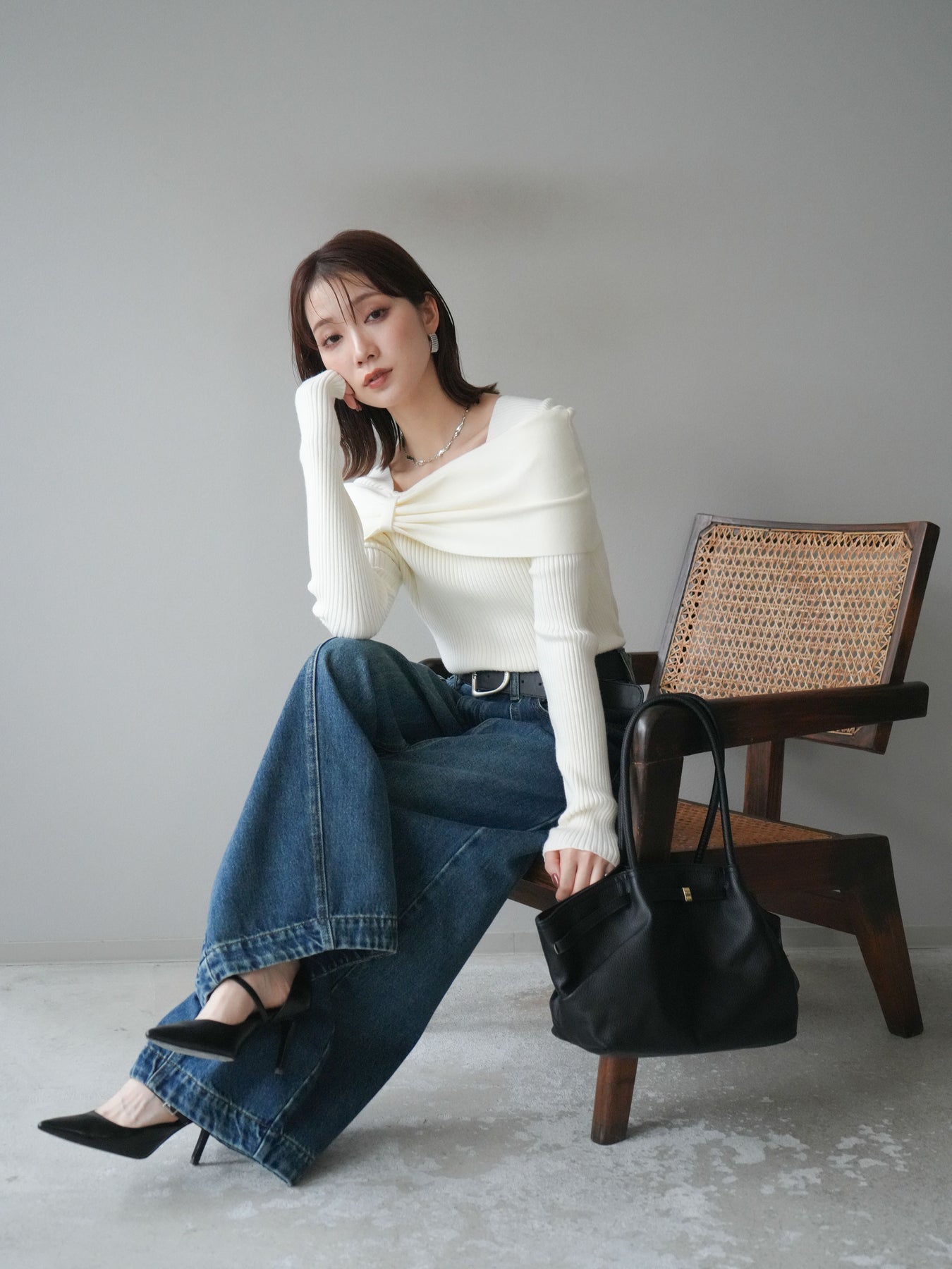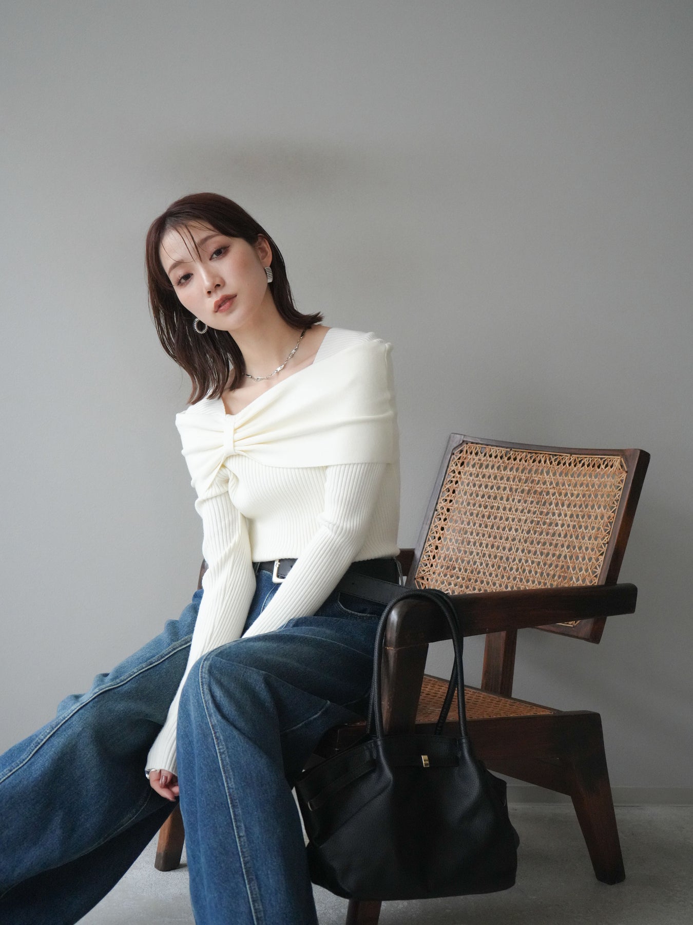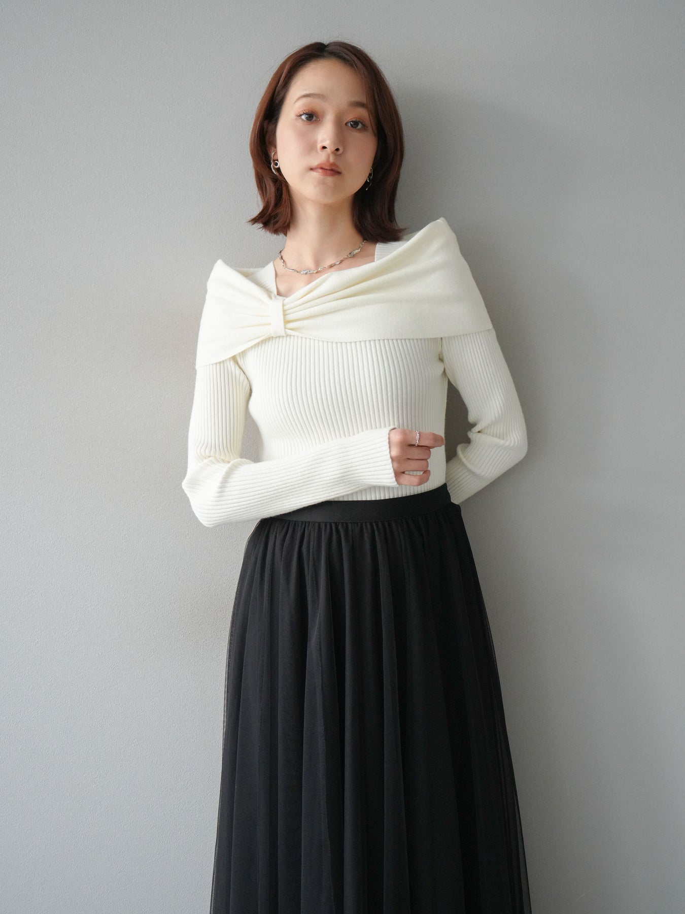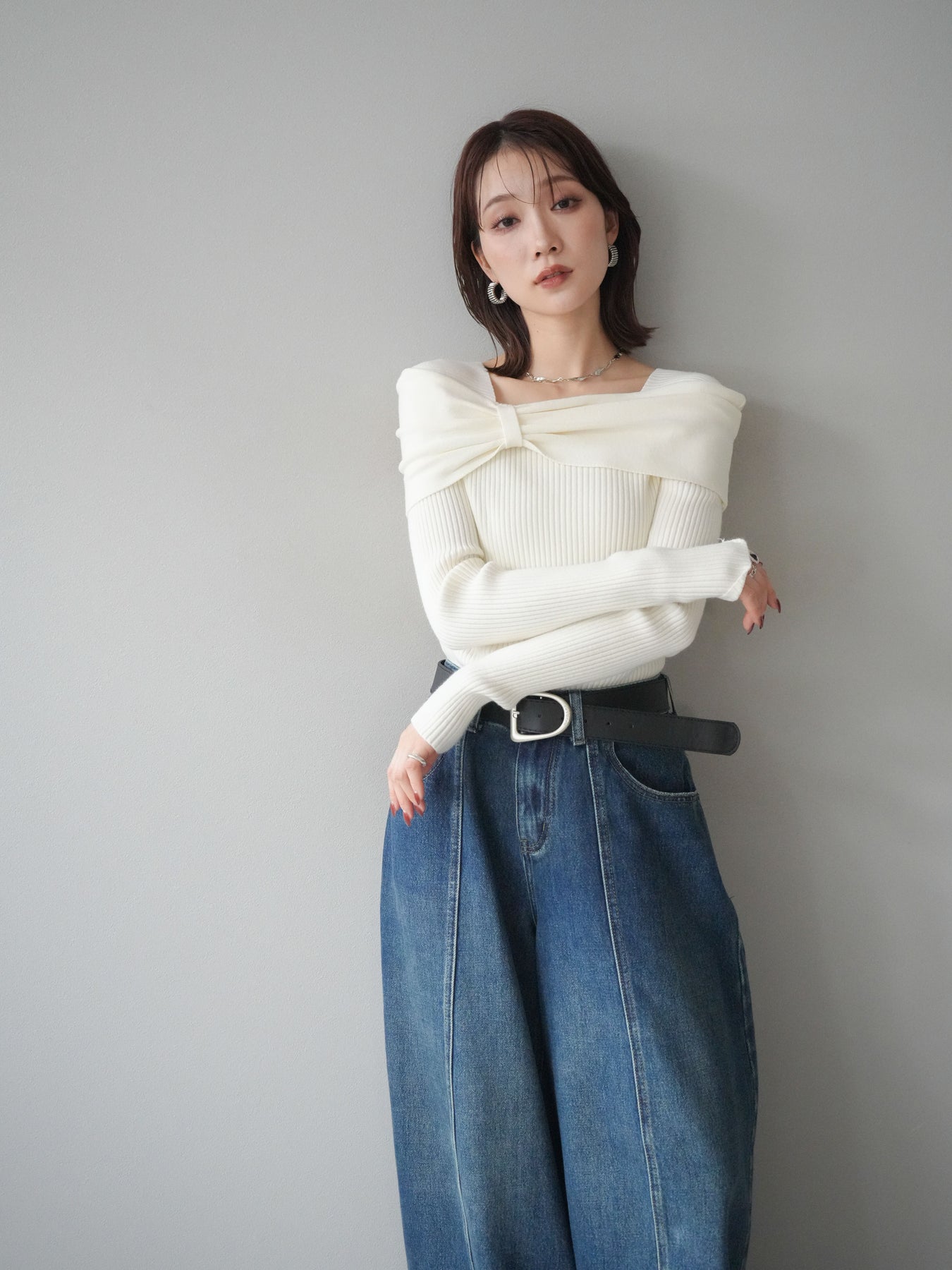 [予約]リボンモチーフオフショルリブニットトップス/white