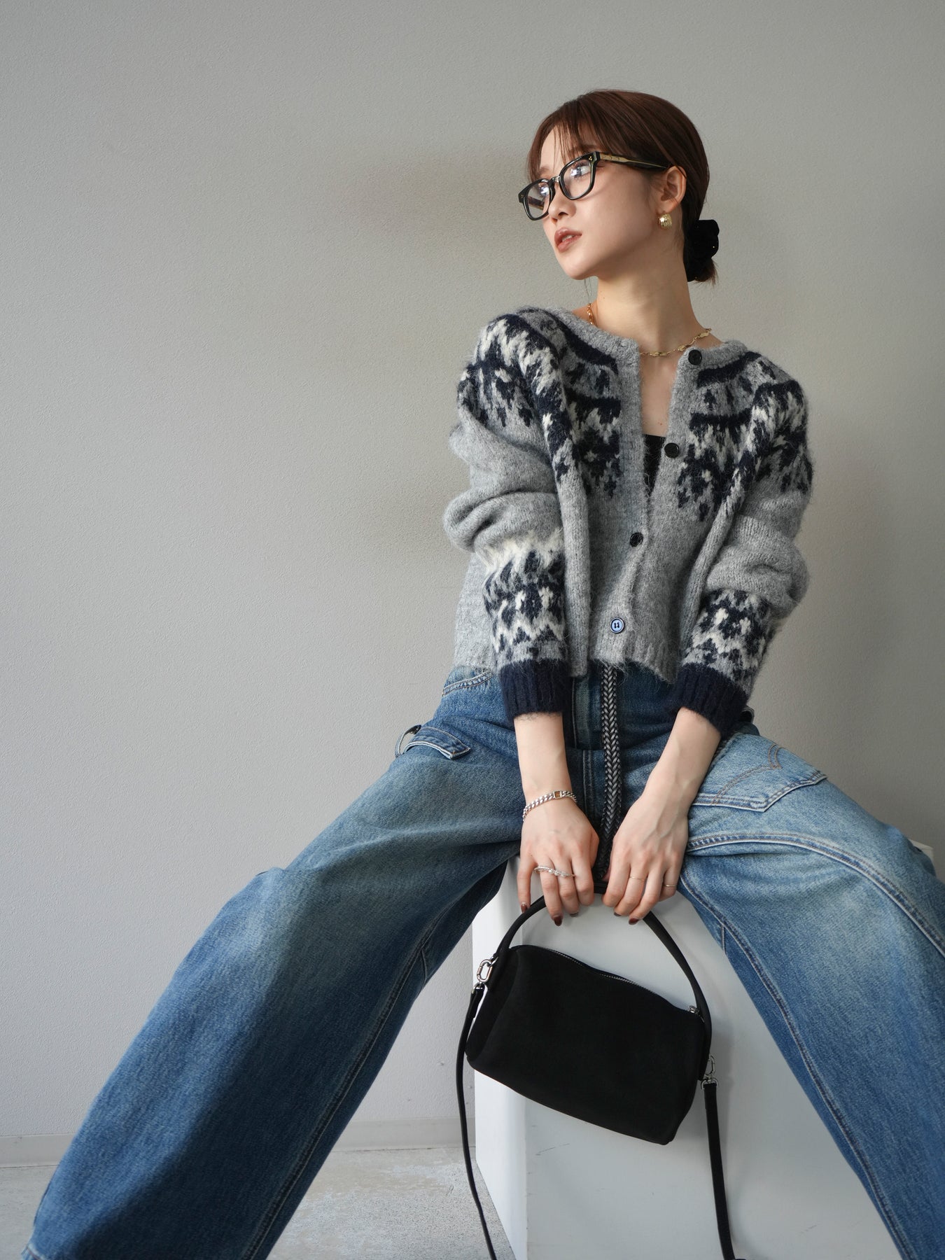 丸みのある求心柄が印象的なクロップド丈ニットカーディガン。 ふんわりとしたシャギー感のある編地がやさしい表情を演出し、柔らかく温かみのある着心地も魅力。 身頃と袖に施されたパターンが、シンプルながらも季節感のあるアクセントになっています。 ショート丈のバランスでワイドパンツやロングスカートとも好相性。 前開き仕様でアウター感覚でも着用でき、秋冬のスタイリングに活躍する1枚です。