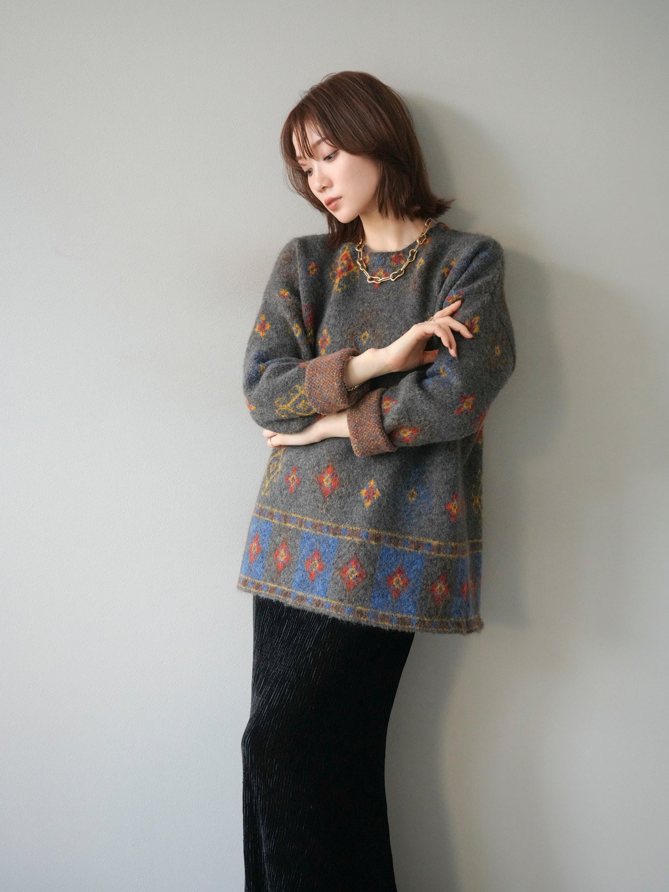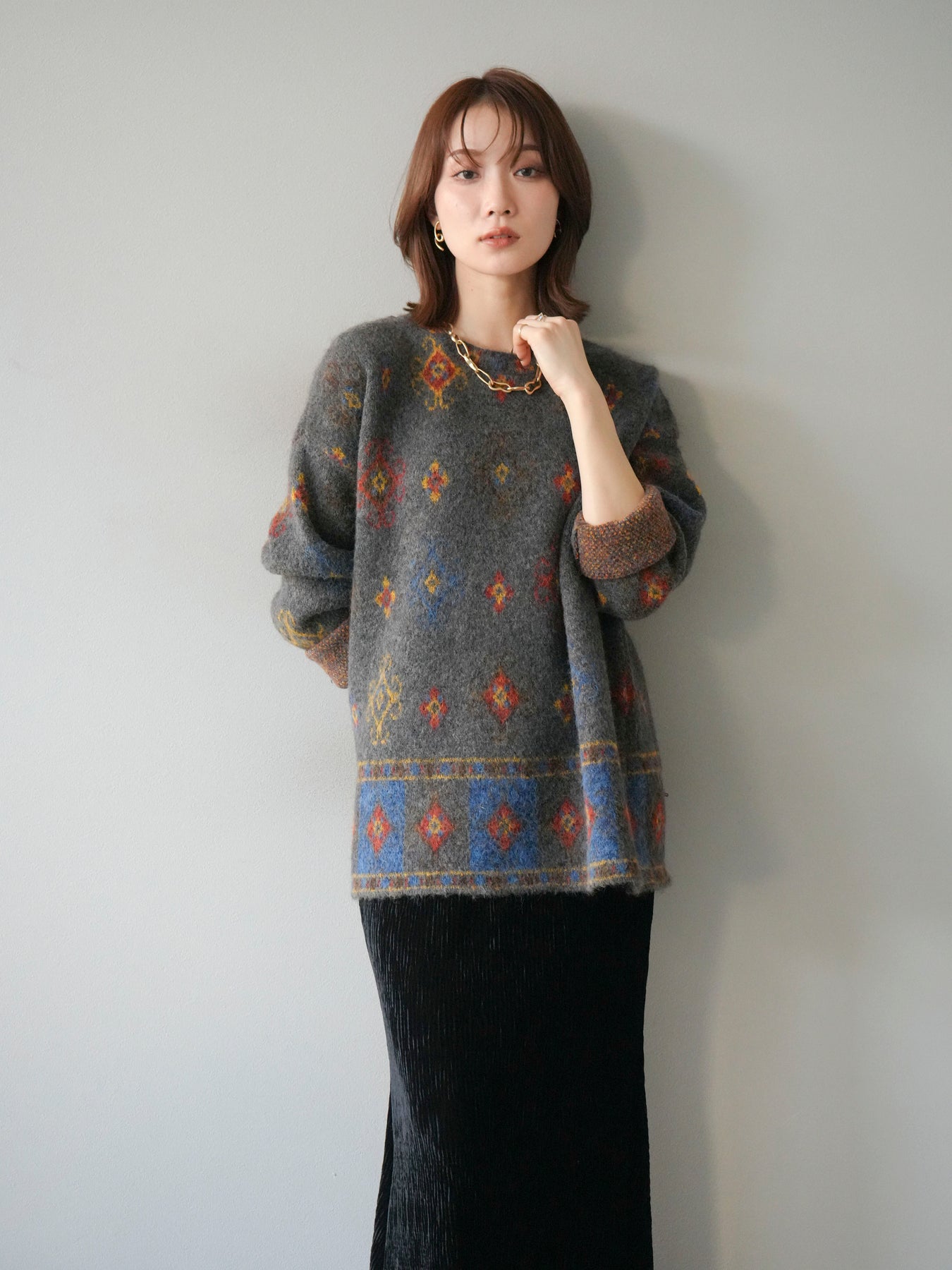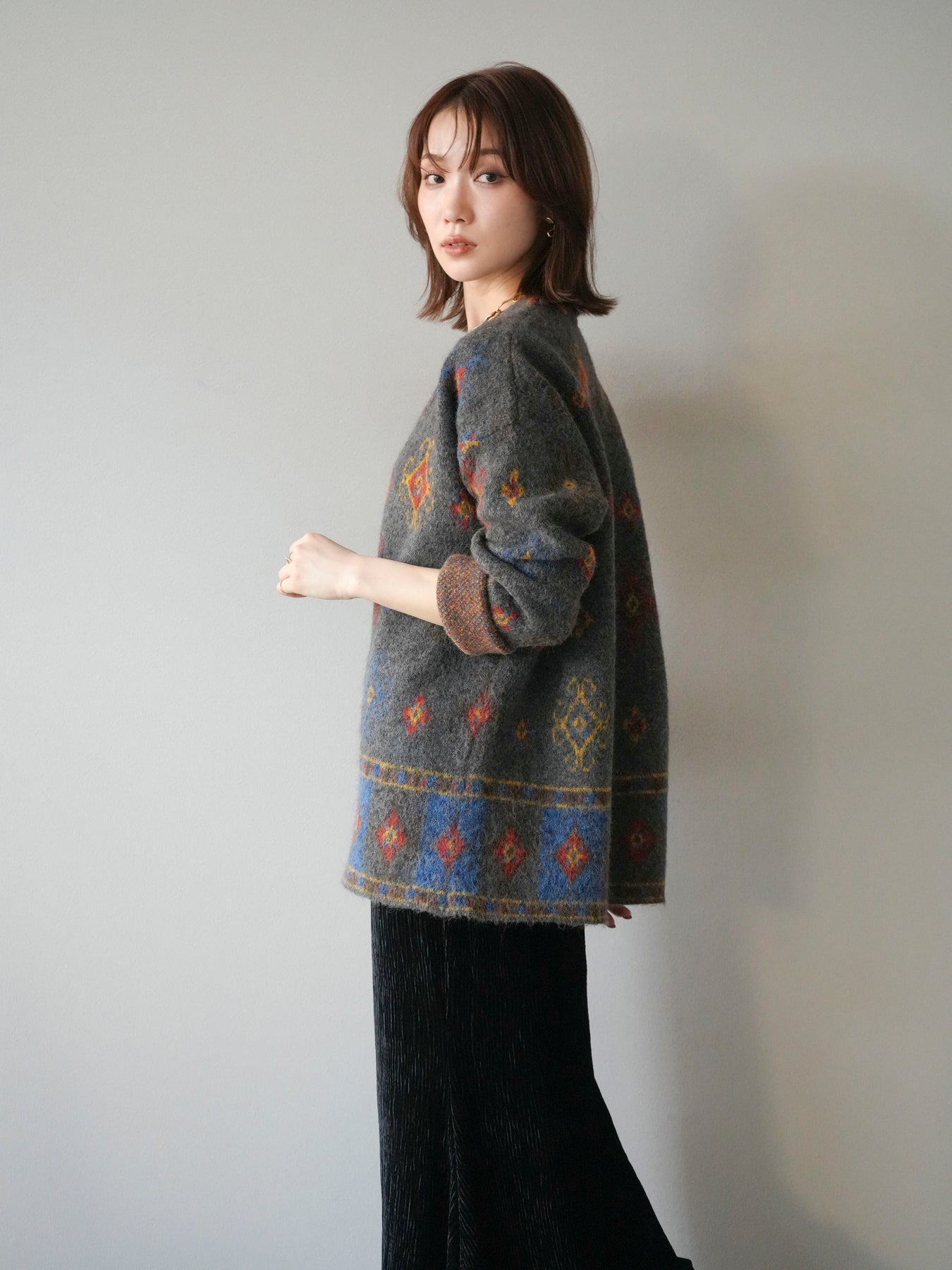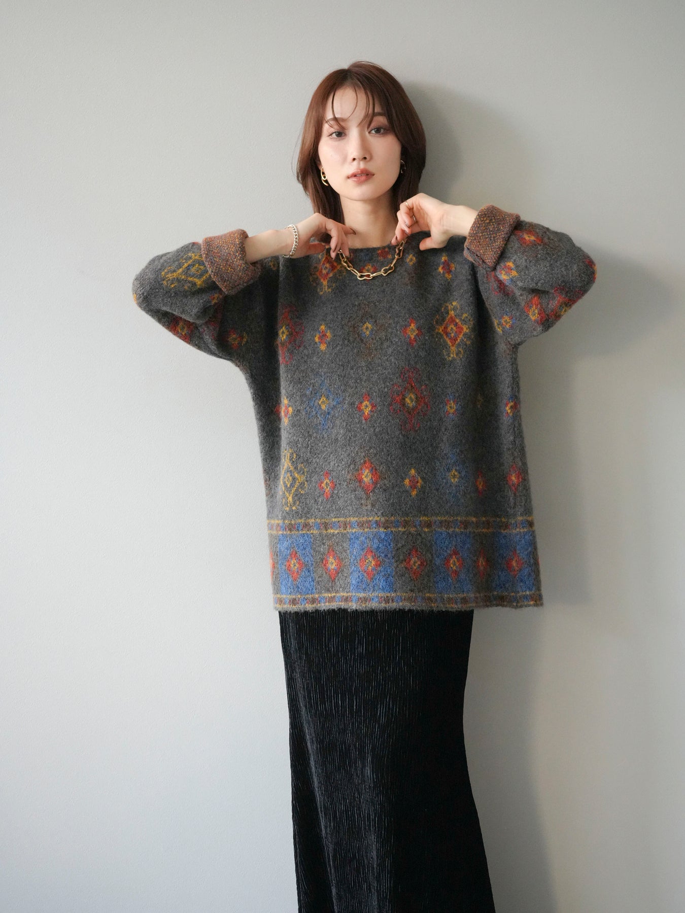 [予約]ヴィンテージ柄オーバーニットプルオーバー/チャコール