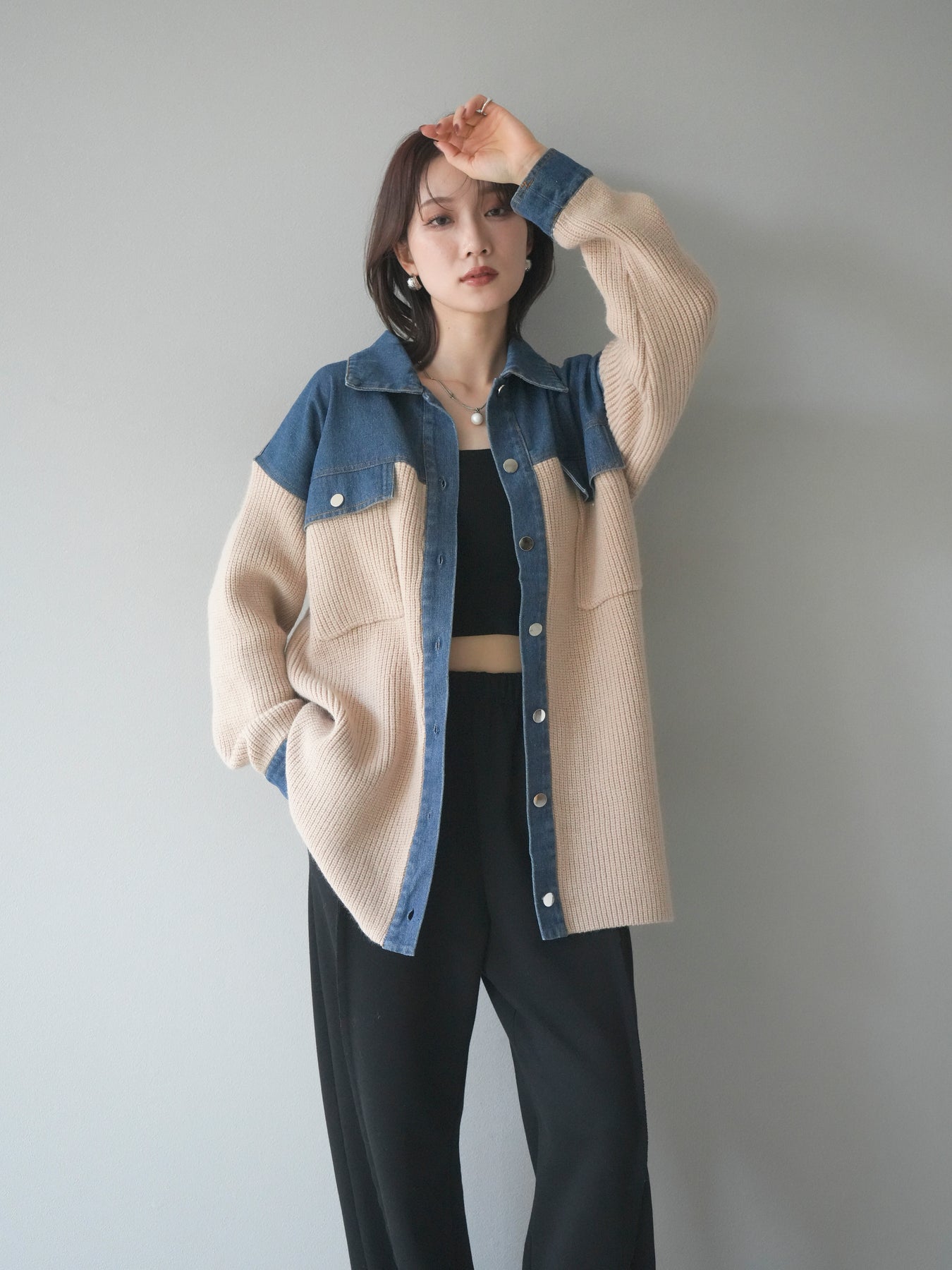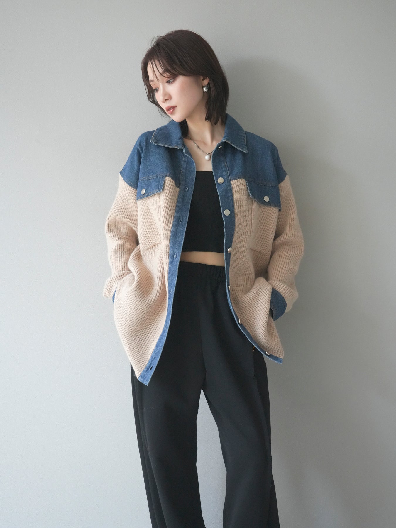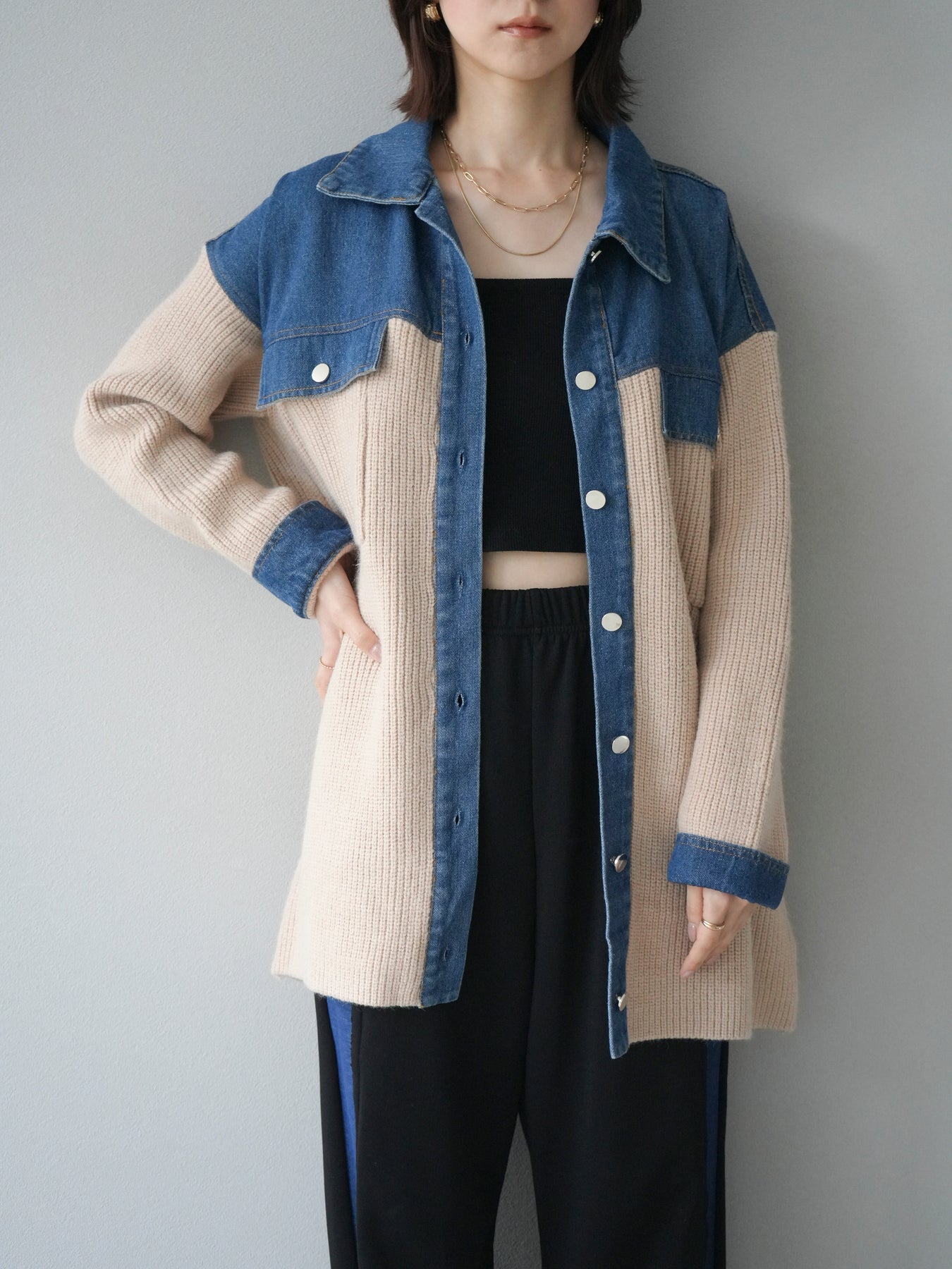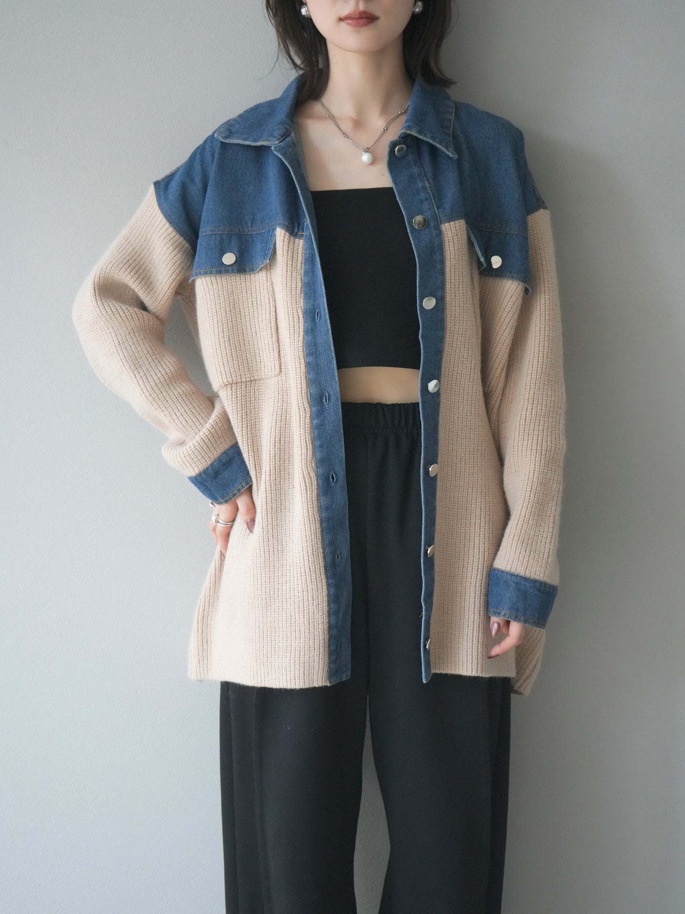デニムとニットを組み合わせた異素材デザインが目を惹く襟付きシャツジャケット。 デニムのカジュアルさとニットの柔らかさが絶妙にマッチし、抜け感のあるスタイリングを演出します。 ゆったりとしたシルエットで重ね着もしやすく、季節の変わり目のライトアウターとしても活躍。 襟元やカフス部分のデニム切り替えがアクセントとなり、一枚でトレンド感のある印象に仕上がります。 パンツにもスカートにも合わせやすく、デイリーに取り入れやすい万能アイテムです。 ※ボトムス、キャミソール(インナー)以外の商品は一律でインナーは付属していません。