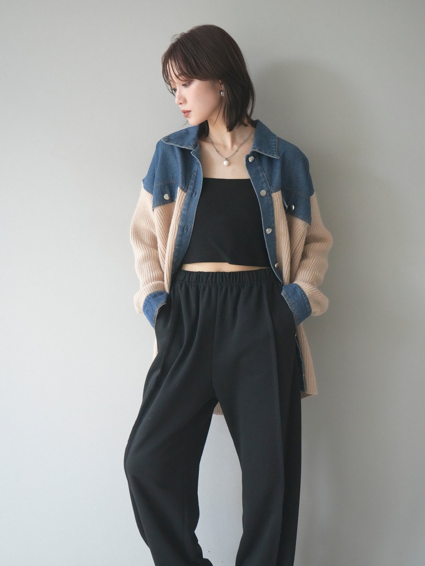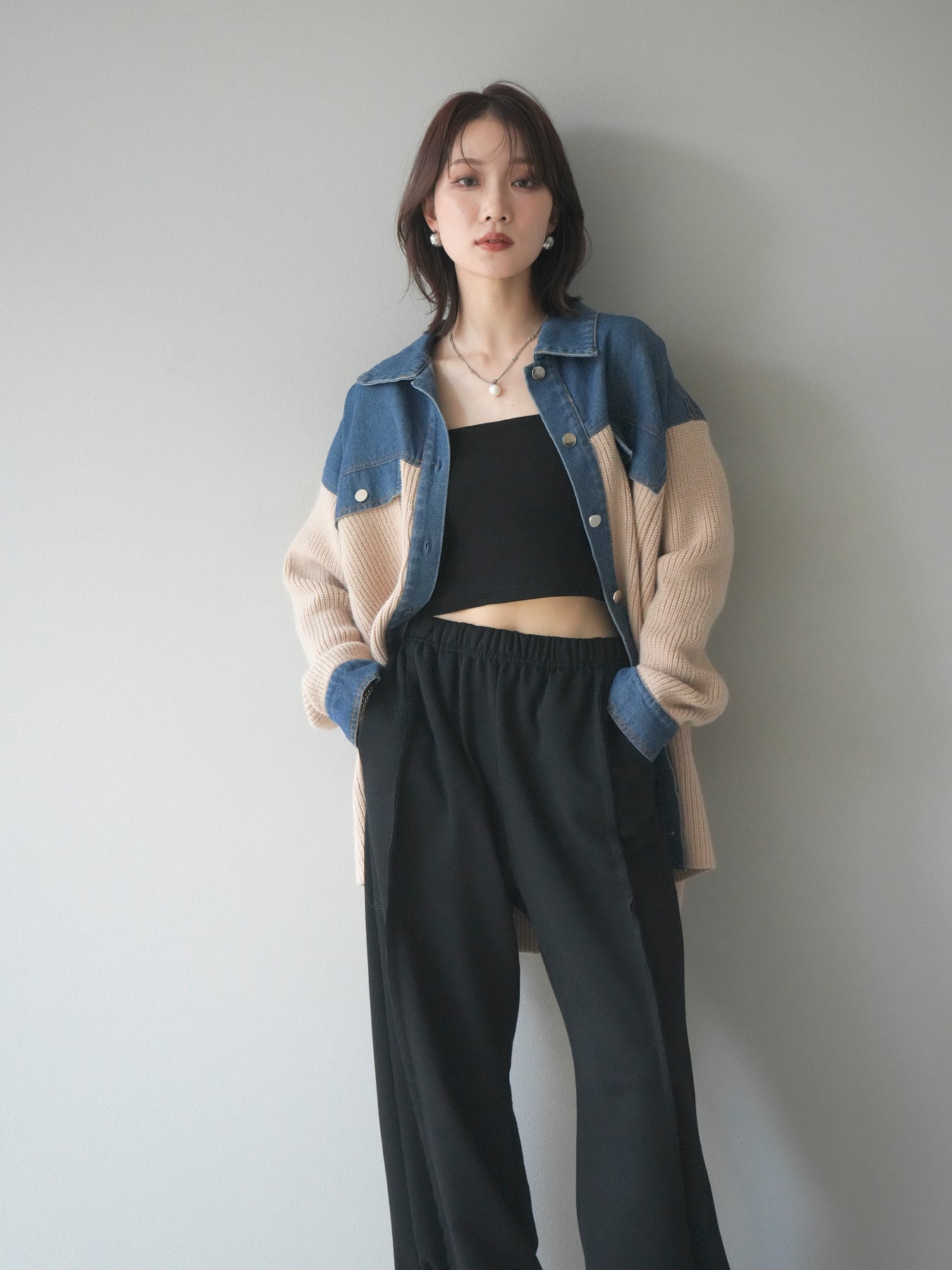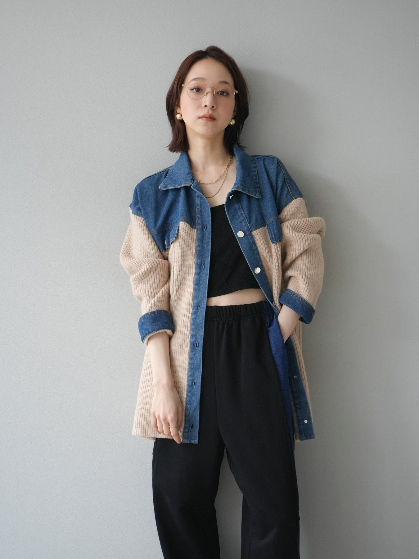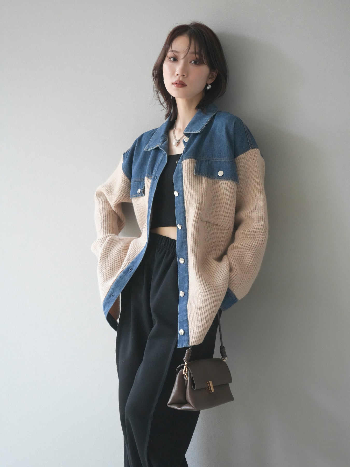 デニムとニットを組み合わせた異素材デザインが目を惹く襟付きシャツジャケット。 デニムのカジュアルさとニットの柔らかさが絶妙にマッチし、抜け感のあるスタイリングを演出します。 ゆったりとしたシルエットで重ね着もしやすく、季節の変わり目のライトアウターとしても活躍。 襟元やカフス部分のデニム切り替えがアクセントとなり、一枚でトレンド感のある印象に仕上がります。 パンツにもスカートにも合わせやすく、デイリーに取り入れやすい万能アイテムです。 ※ボトムス、キャミソール(インナー)以外の商品は一律でインナーは付属していません。