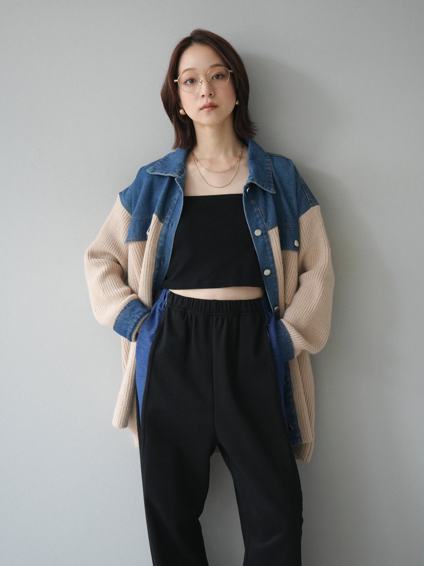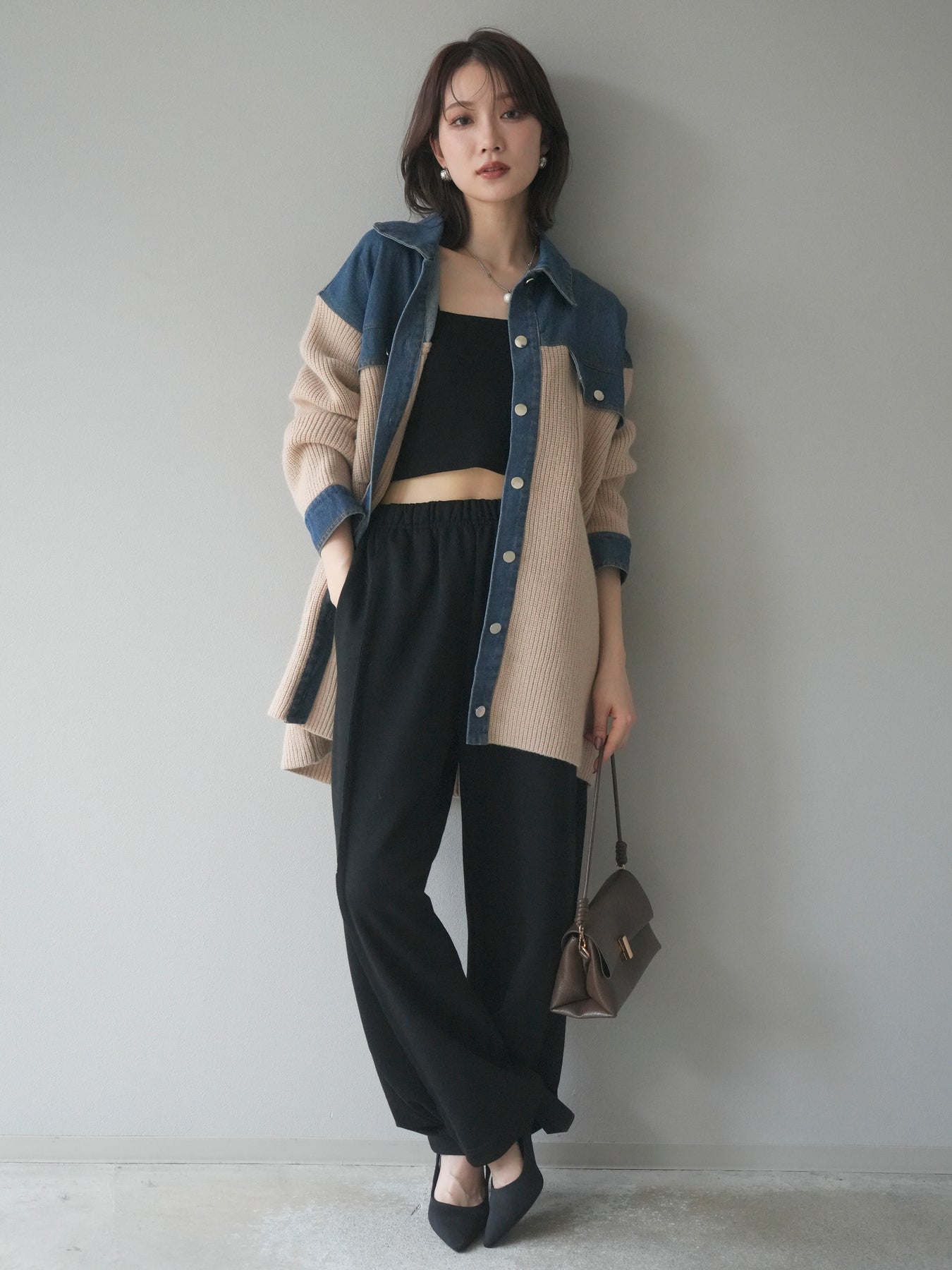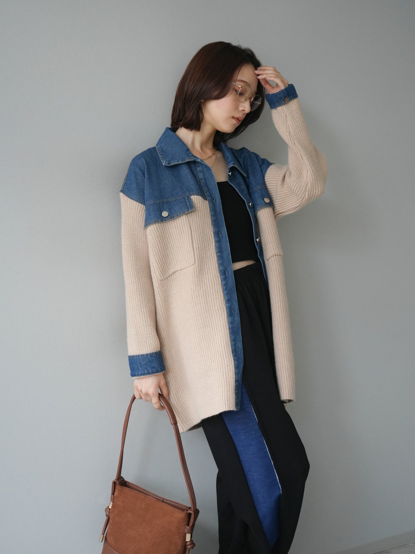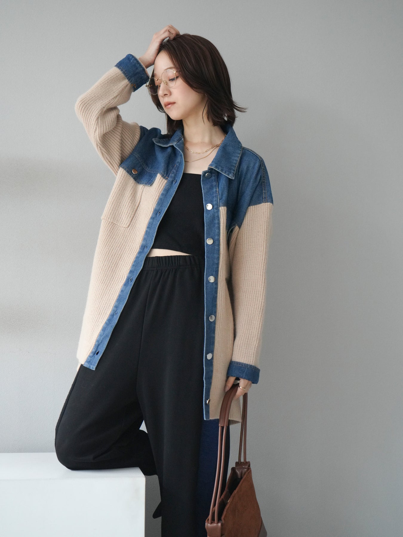 デニムとニットを組み合わせた異素材デザインが目を惹く襟付きシャツジャケット。 デニムのカジュアルさとニットの柔らかさが絶妙にマッチし、抜け感のあるスタイリングを演出します。 ゆったりとしたシルエットで重ね着もしやすく、季節の変わり目のライトアウターとしても活躍。 襟元やカフス部分のデニム切り替えがアクセントとなり、一枚でトレンド感のある印象に仕上がります。 パンツにもスカートにも合わせやすく、デイリーに取り入れやすい万能アイテムです。 ※ボトムス、キャミソール(インナー)以外の商品は一律でインナーは付属していません。