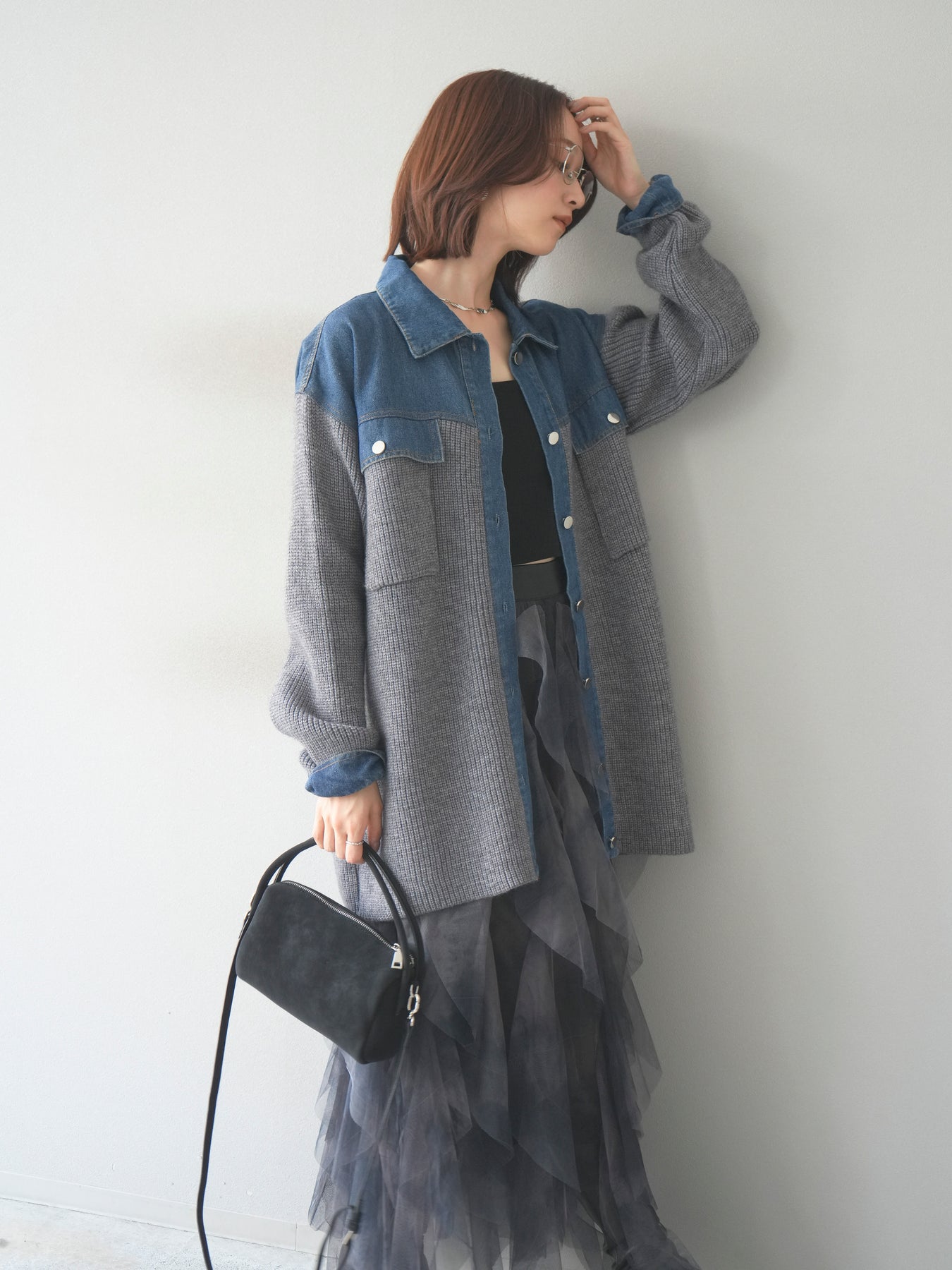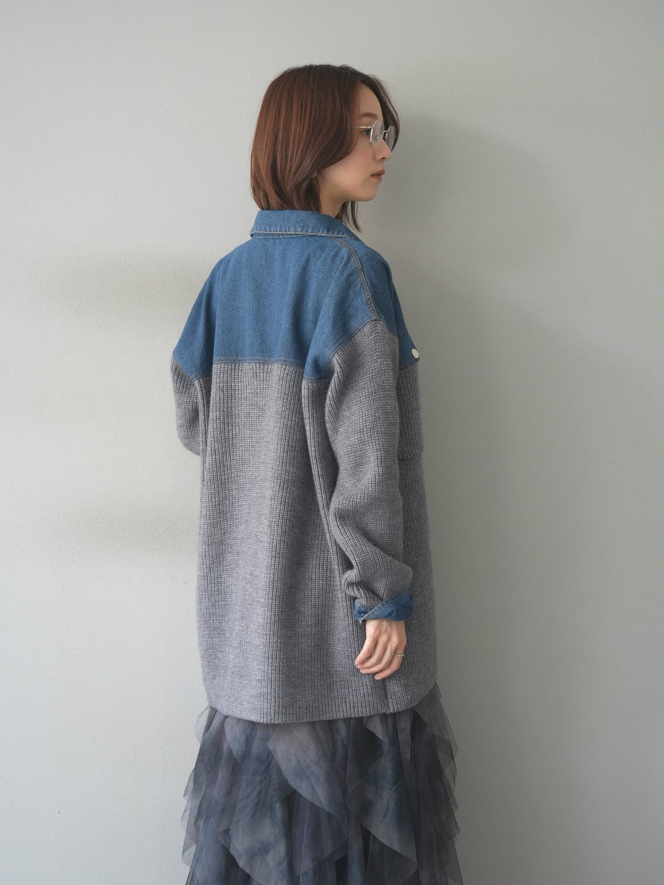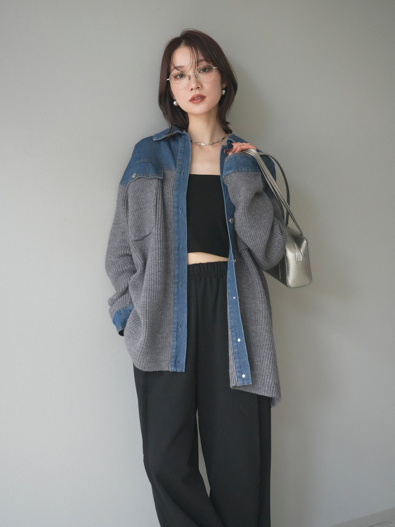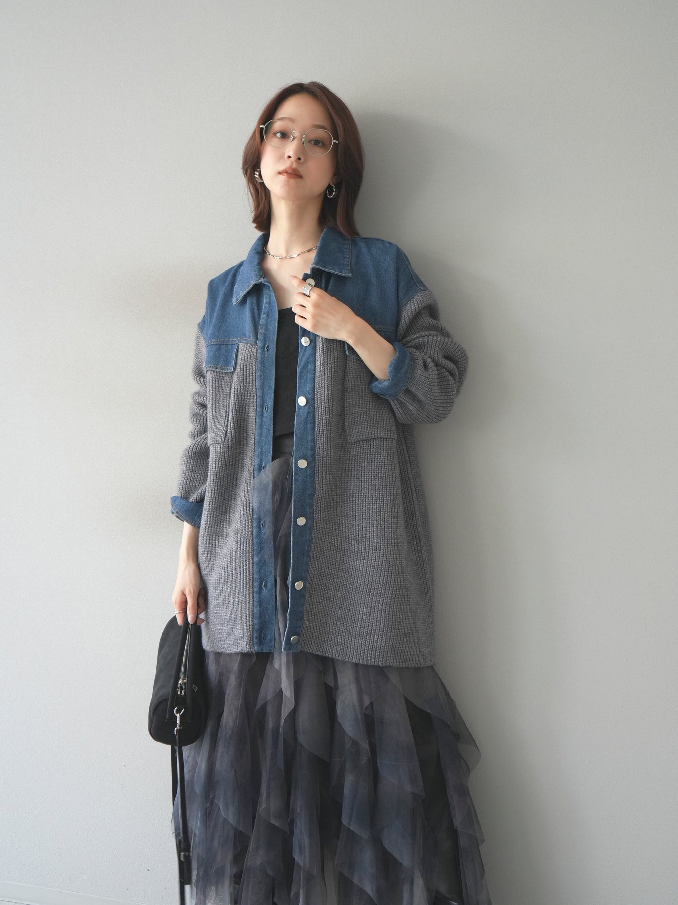 デニムとニットを組み合わせた異素材デザインが目を惹く襟付きシャツジャケット。 デニムのカジュアルさとニットの柔らかさが絶妙にマッチし、抜け感のあるスタイリングを演出します。 ゆったりとしたシルエットで重ね着もしやすく、季節の変わり目のライトアウターとしても活躍。 襟元やカフス部分のデニム切り替えがアクセントとなり、一枚でトレンド感のある印象に仕上がります。 パンツにもスカートにも合わせやすく、デイリーに取り入れやすい万能アイテムです。 ※ボトムス、キャミソール(インナー)以外の商品は一律でインナーは付属していません。