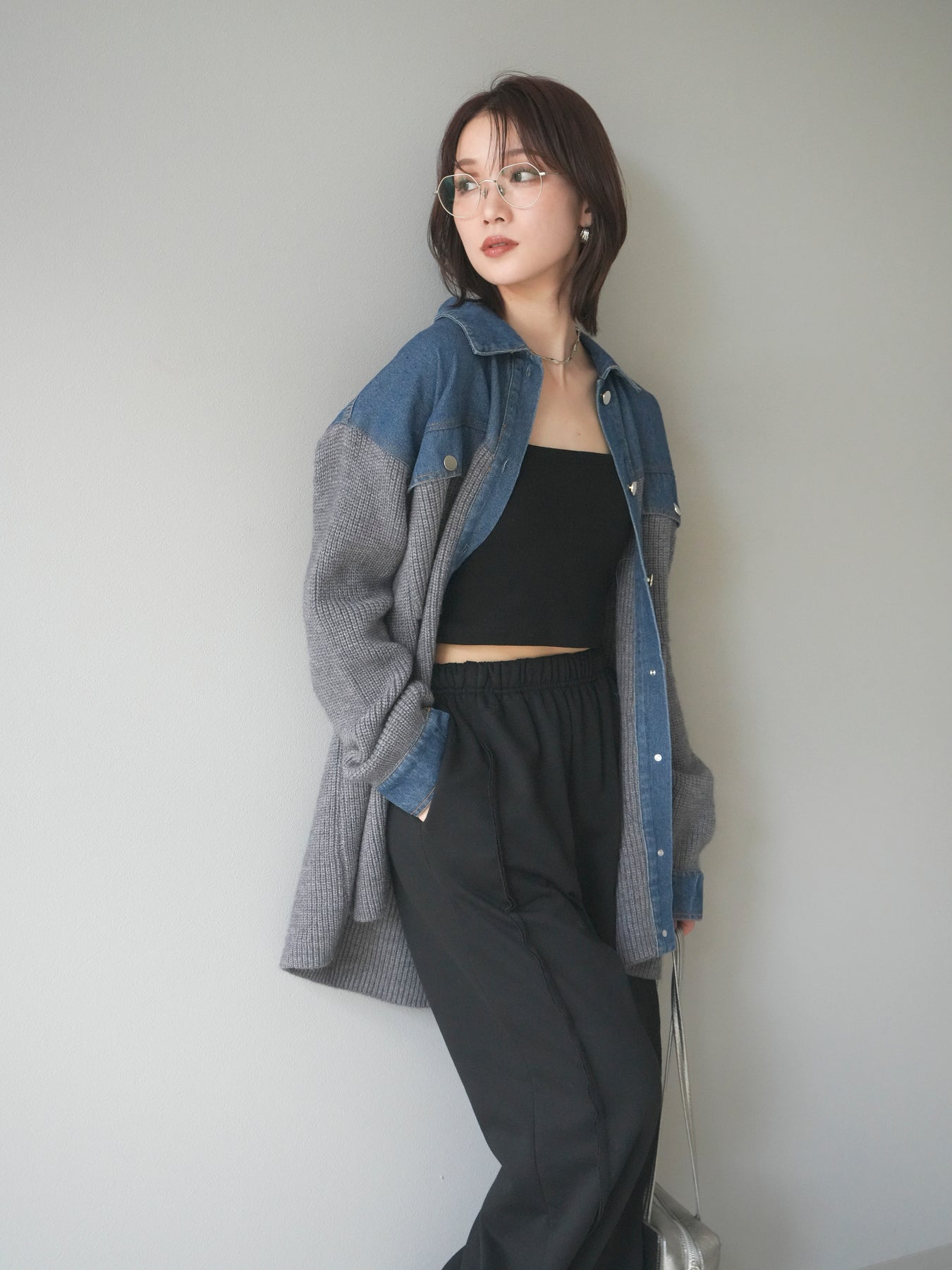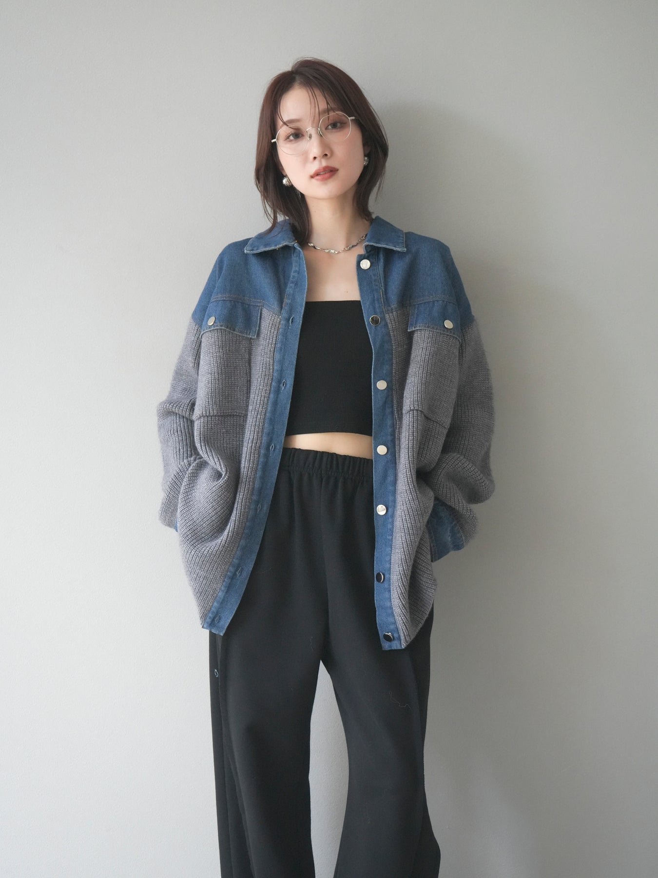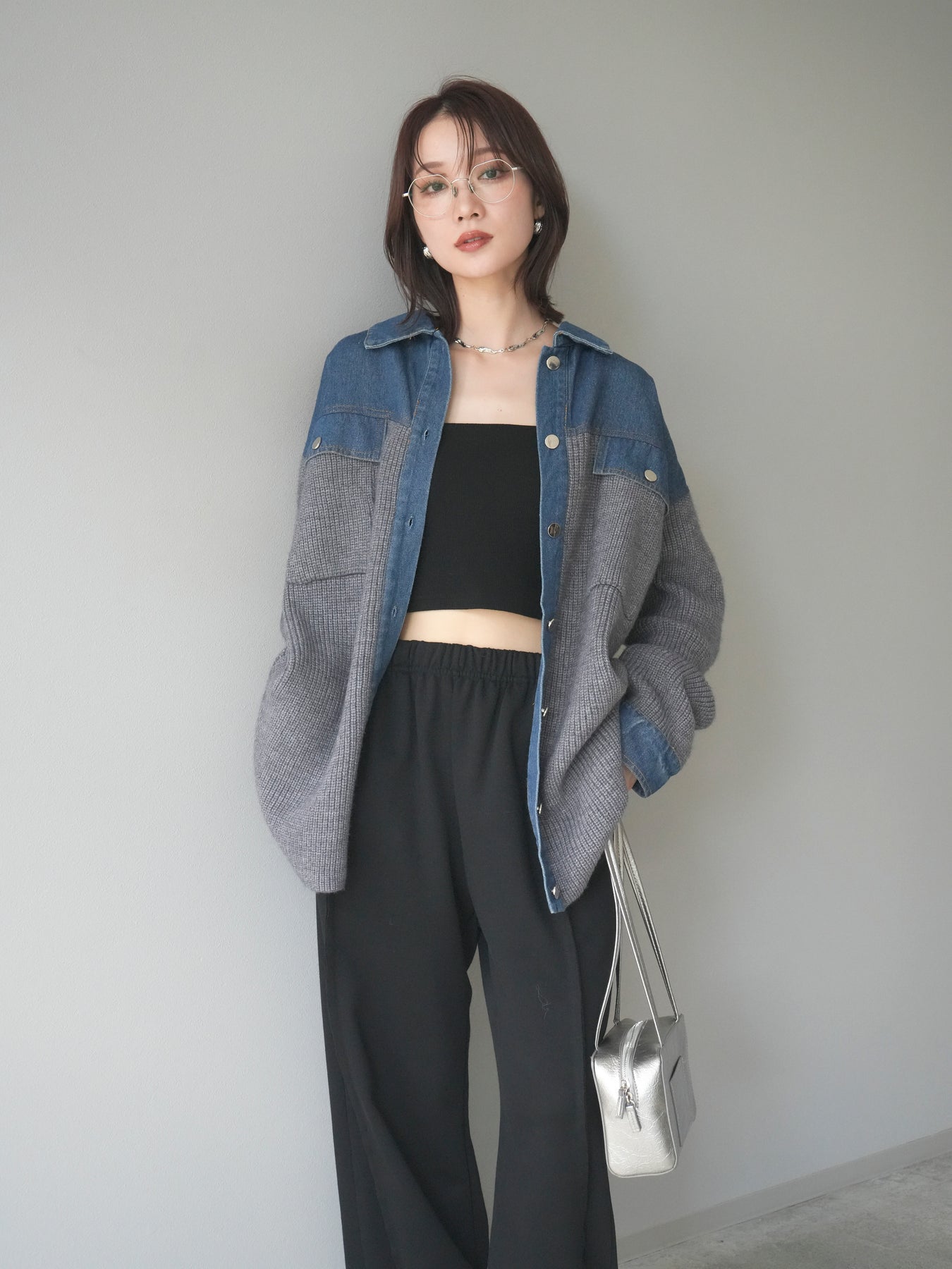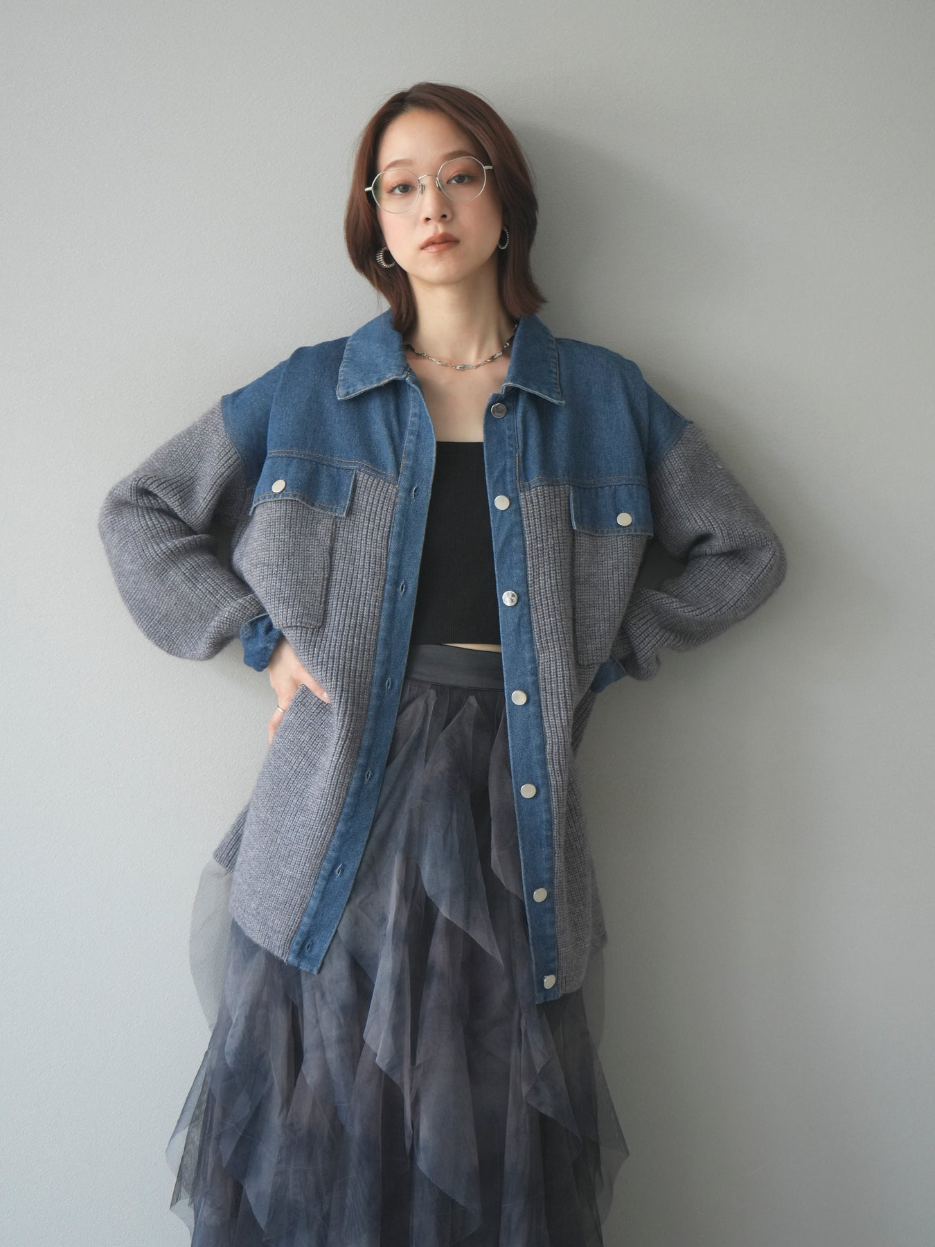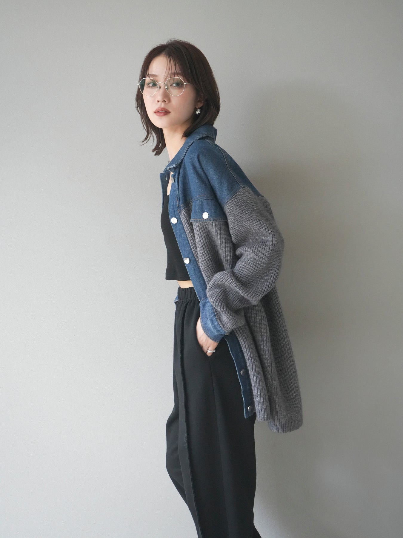 デニムとニットを組み合わせた異素材デザインが目を惹く襟付きシャツジャケット。 デニムのカジュアルさとニットの柔らかさが絶妙にマッチし、抜け感のあるスタイリングを演出します。 ゆったりとしたシルエットで重ね着もしやすく、季節の変わり目のライトアウターとしても活躍。 襟元やカフス部分のデニム切り替えがアクセントとなり、一枚でトレンド感のある印象に仕上がります。 パンツにもスカートにも合わせやすく、デイリーに取り入れやすい万能アイテムです。 ※ボトムス、キャミソール(インナー)以外の商品は一律でインナーは付属していません。