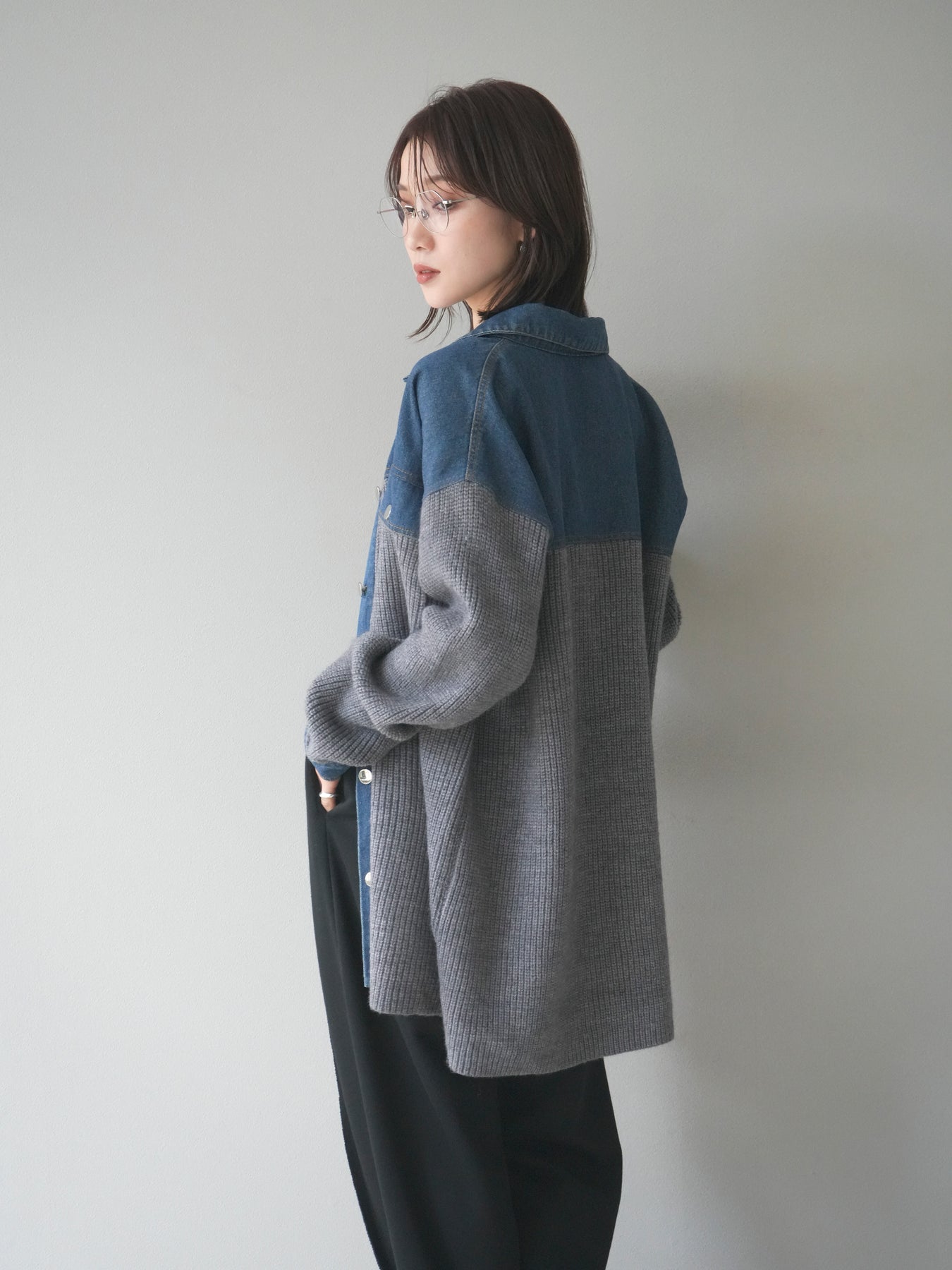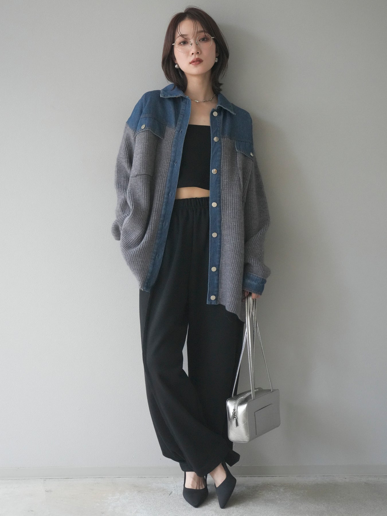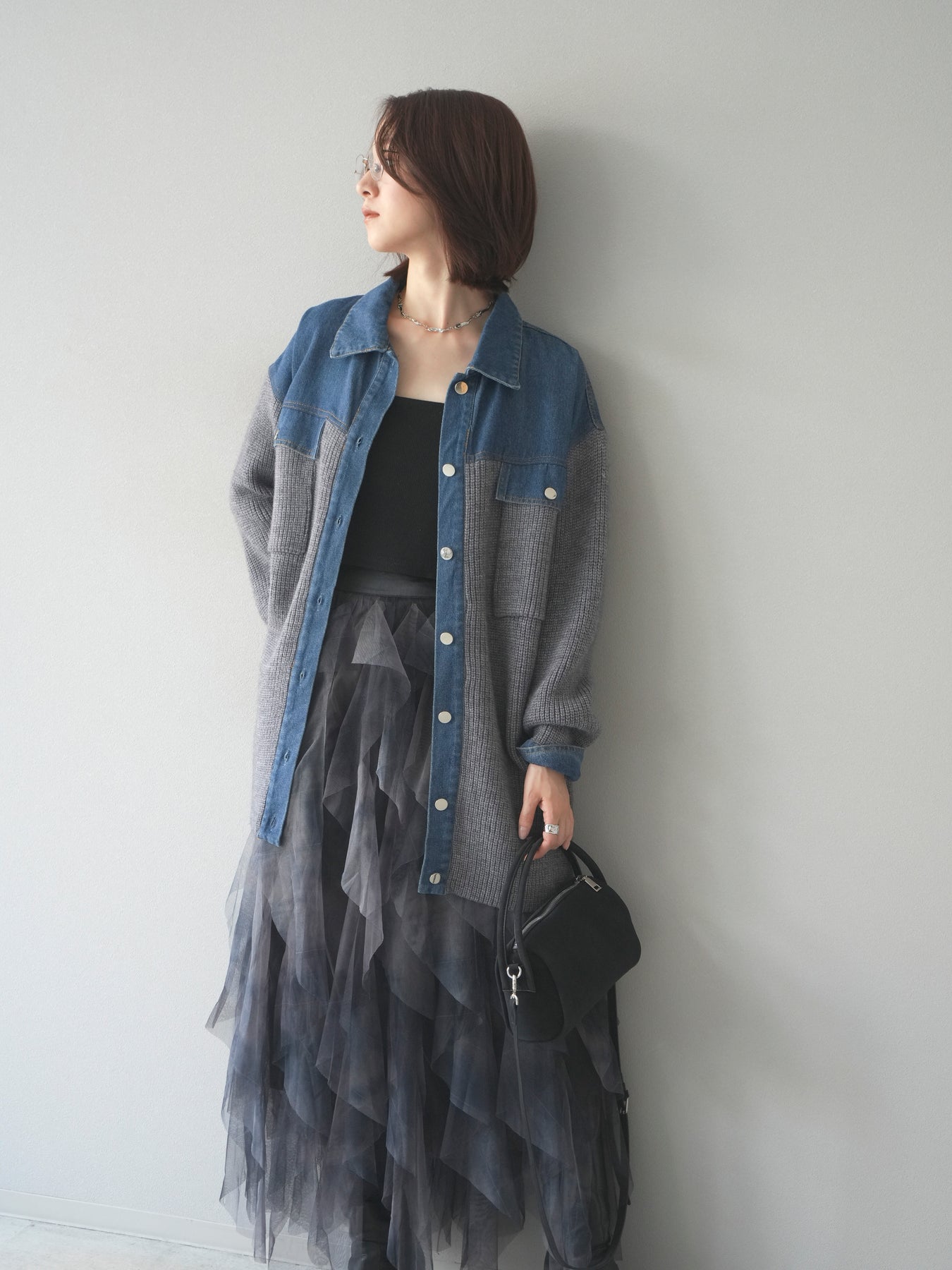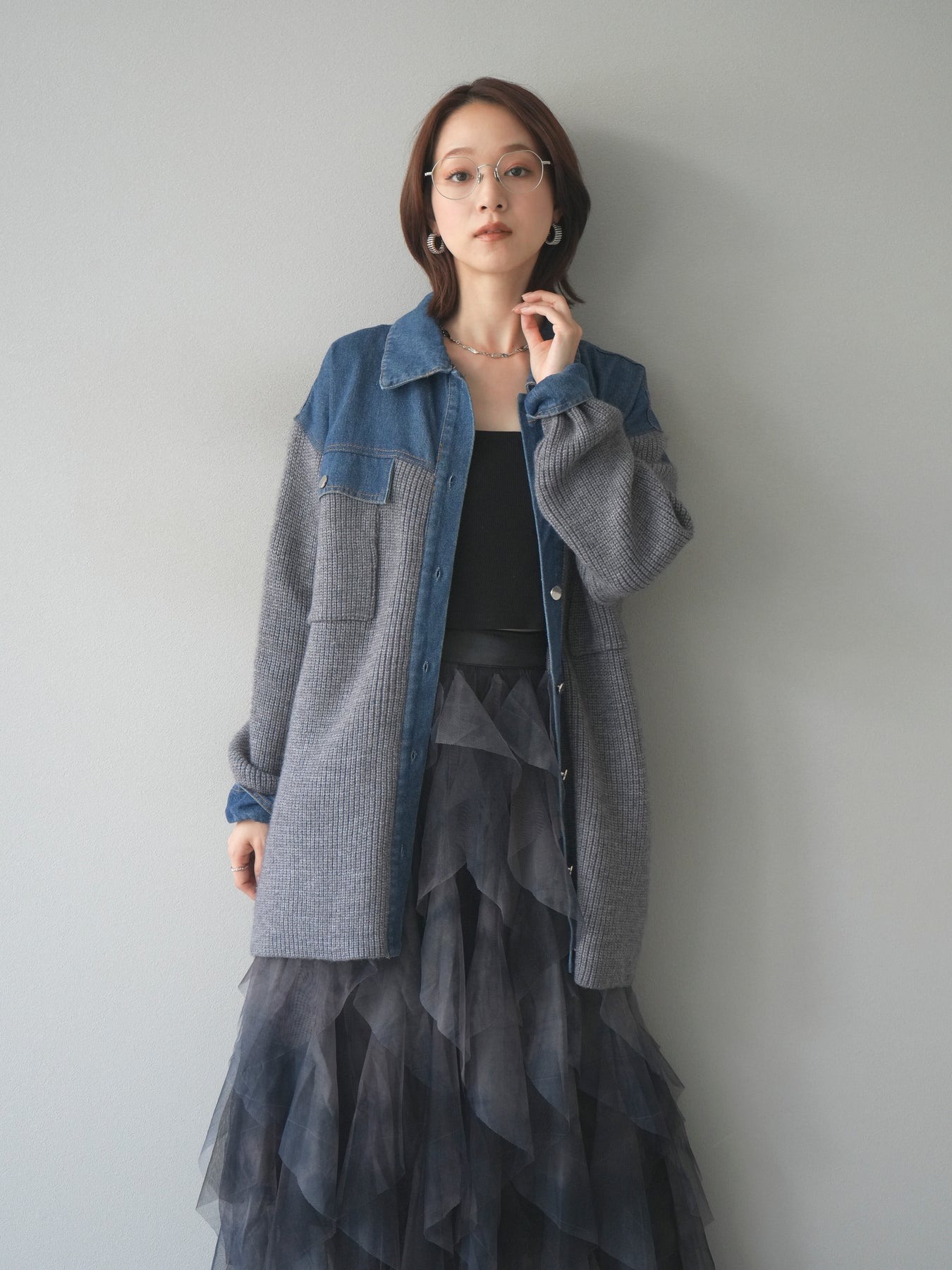 デニムとニットを組み合わせた異素材デザインが目を惹く襟付きシャツジャケット。 デニムのカジュアルさとニットの柔らかさが絶妙にマッチし、抜け感のあるスタイリングを演出します。 ゆったりとしたシルエットで重ね着もしやすく、季節の変わり目のライトアウターとしても活躍。 襟元やカフス部分のデニム切り替えがアクセントとなり、一枚でトレンド感のある印象に仕上がります。 パンツにもスカートにも合わせやすく、デイリーに取り入れやすい万能アイテムです。 ※ボトムス、キャミソール(インナー)以外の商品は一律でインナーは付属していません。