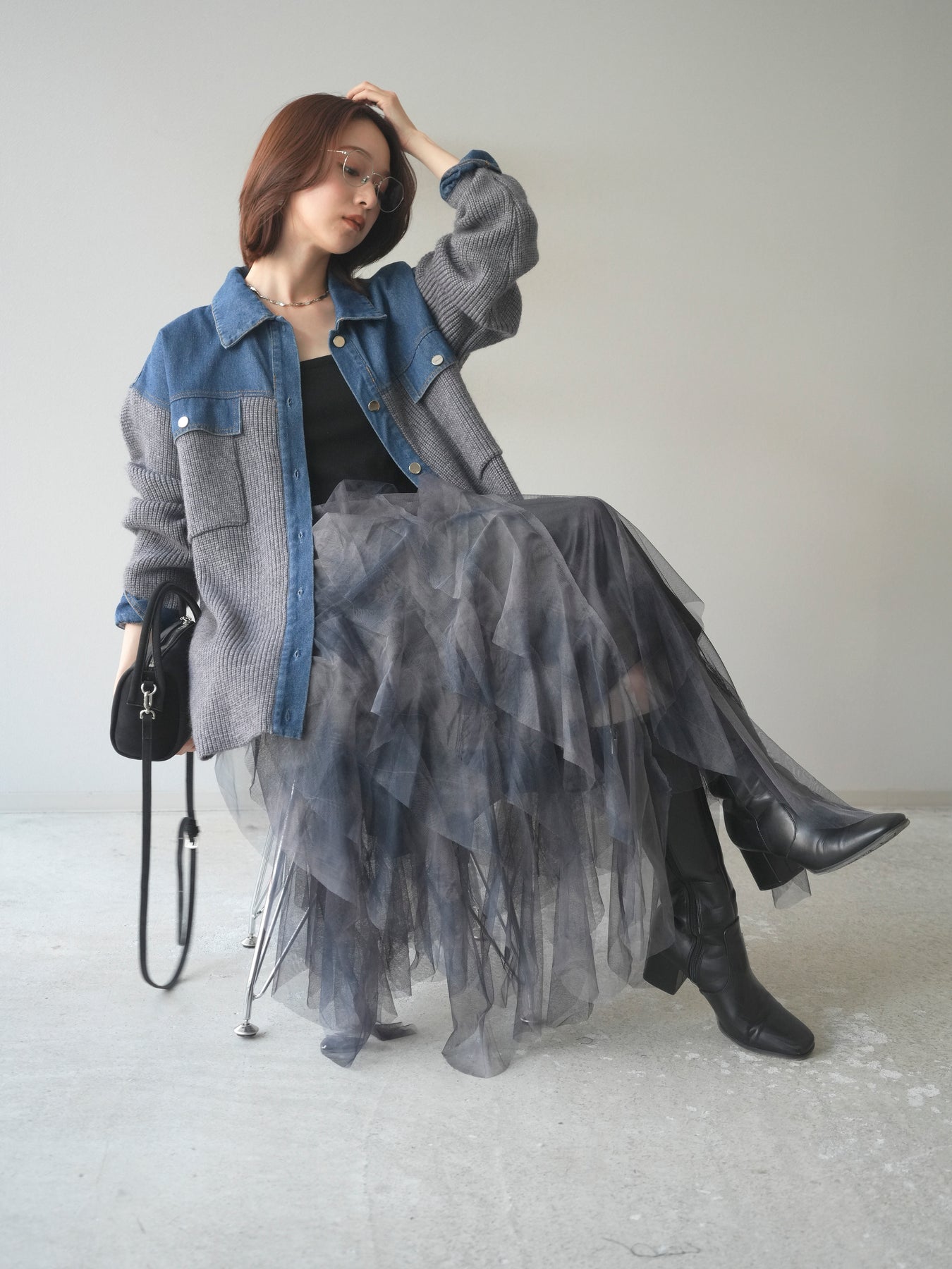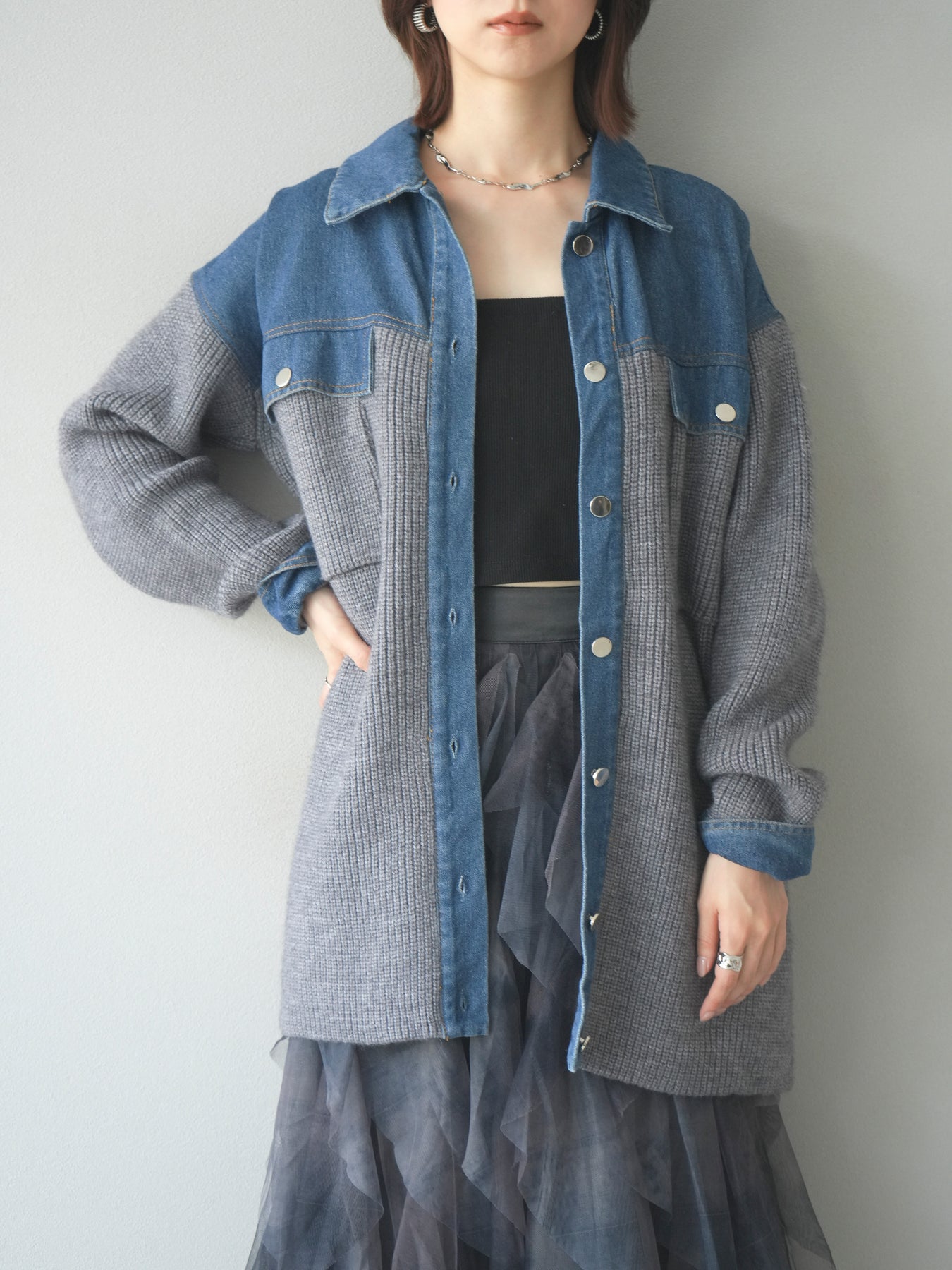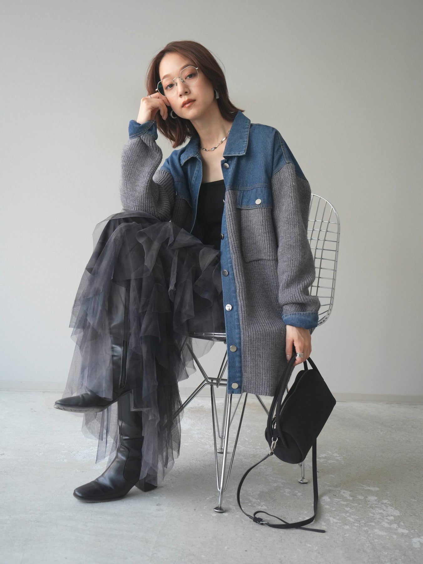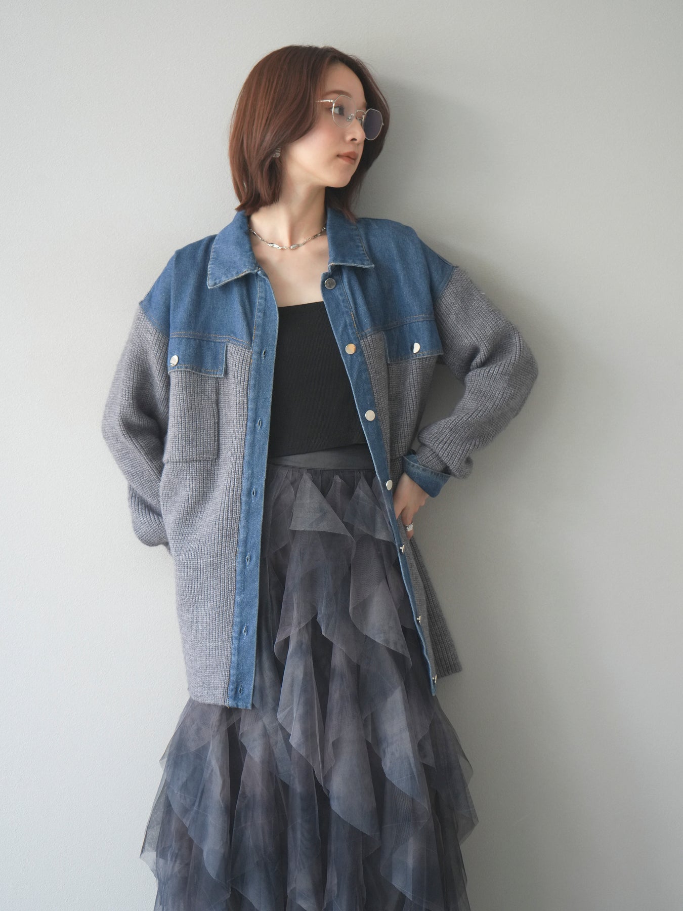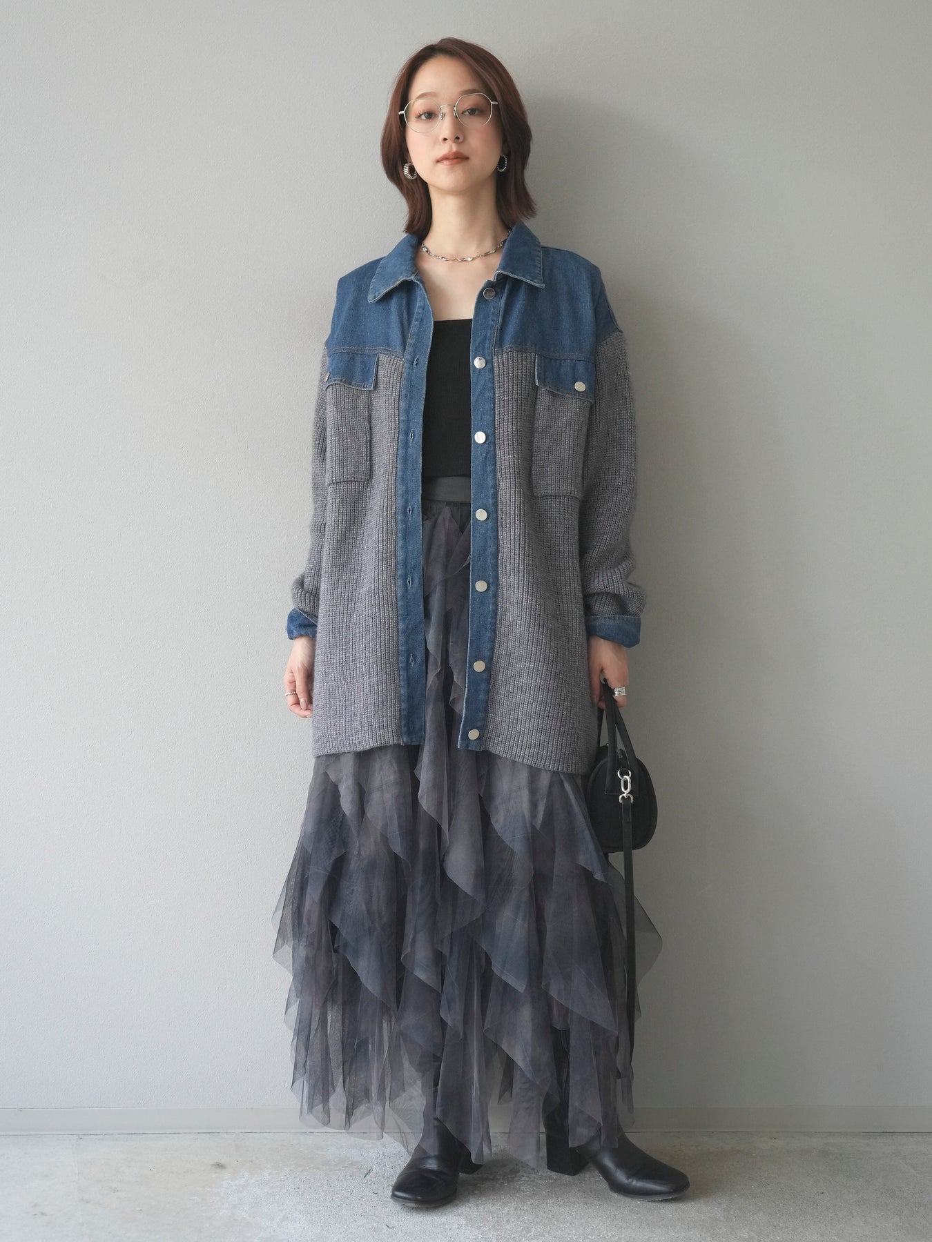デニムとニットを組み合わせた異素材デザインが目を惹く襟付きシャツジャケット。 デニムのカジュアルさとニットの柔らかさが絶妙にマッチし、抜け感のあるスタイリングを演出します。 ゆったりとしたシルエットで重ね着もしやすく、季節の変わり目のライトアウターとしても活躍。 襟元やカフス部分のデニム切り替えがアクセントとなり、一枚でトレンド感のある印象に仕上がります。 パンツにもスカートにも合わせやすく、デイリーに取り入れやすい万能アイテムです。 ※ボトムス、キャミソール(インナー)以外の商品は一律でインナーは付属していません。