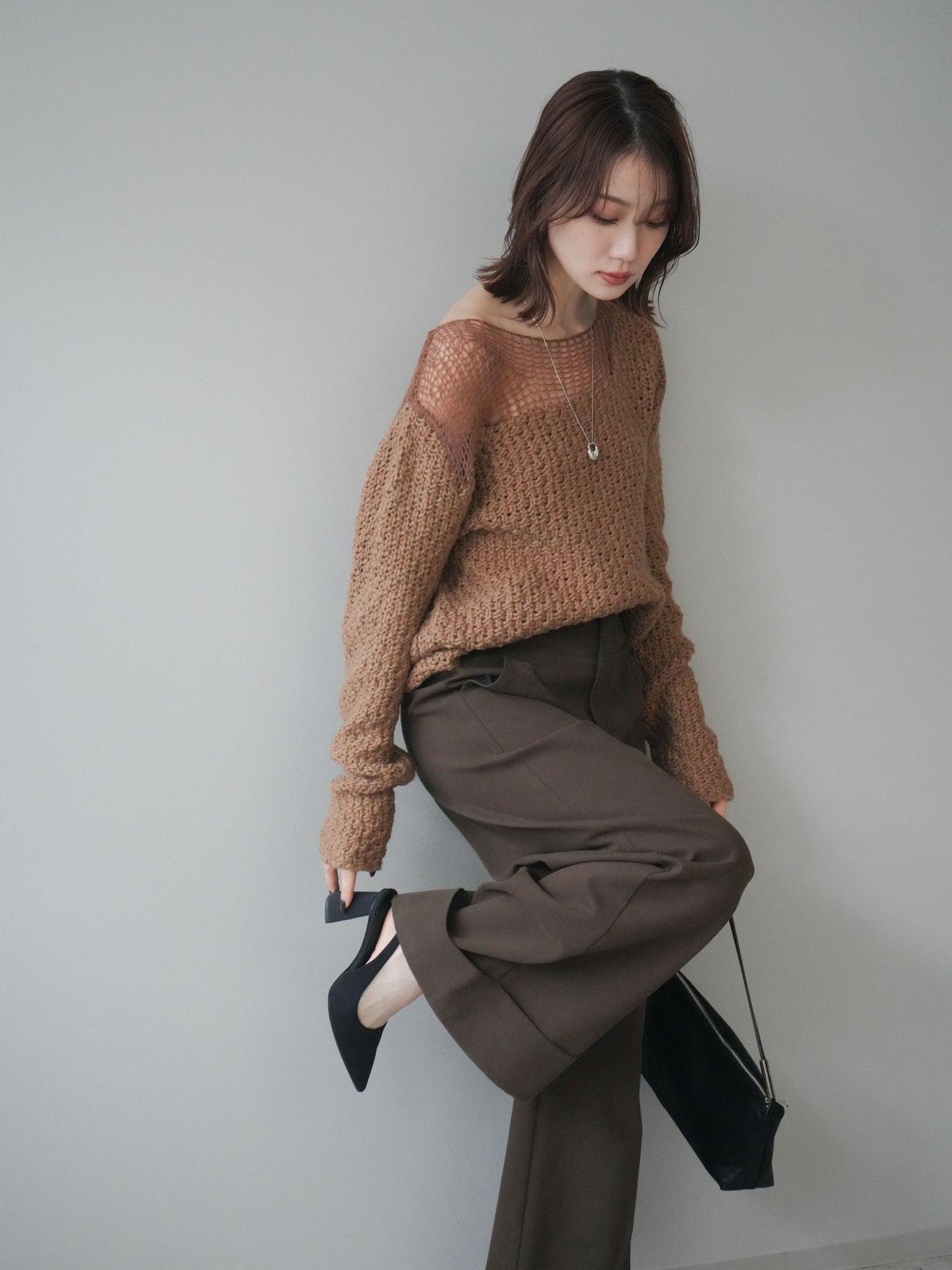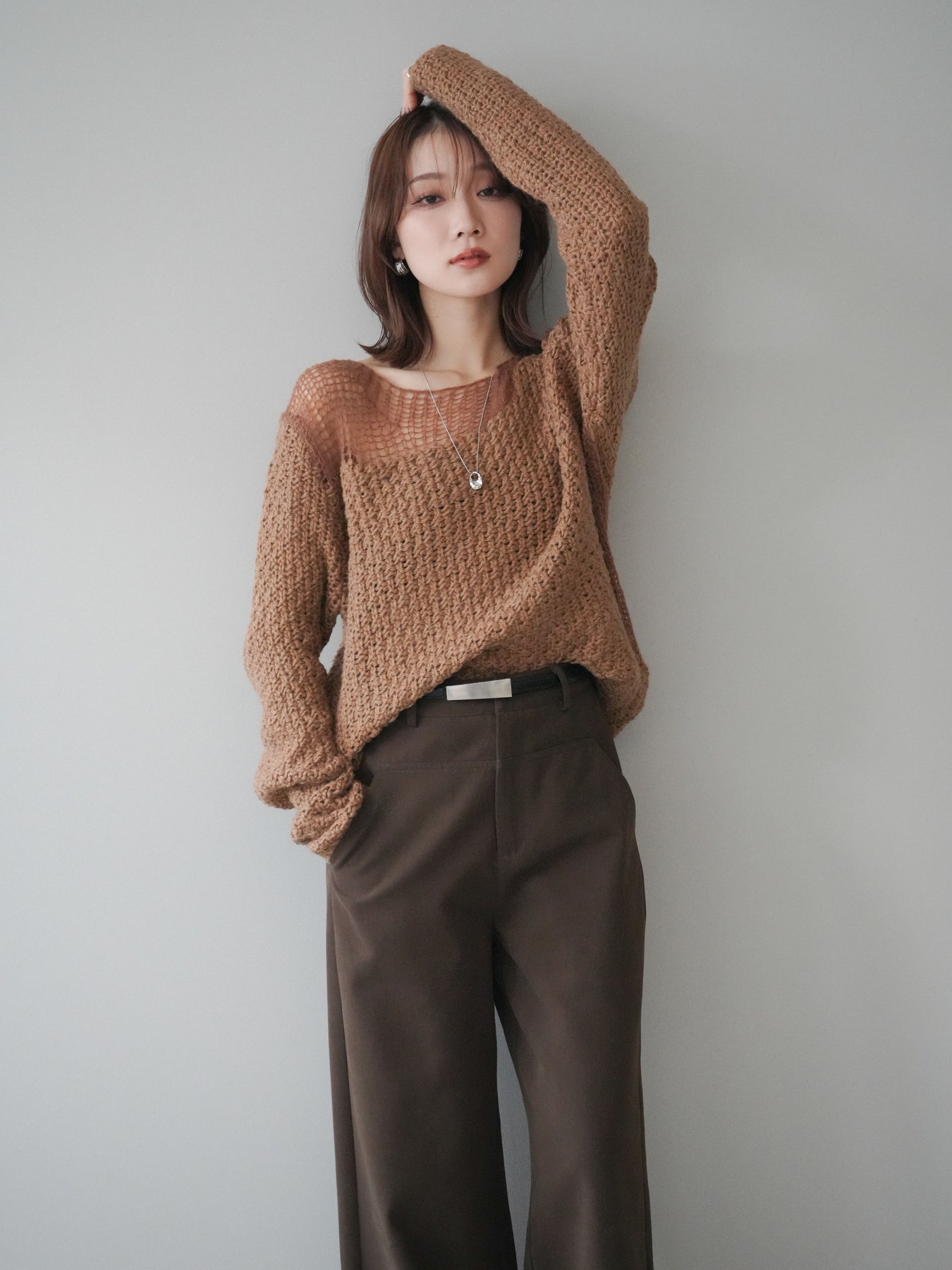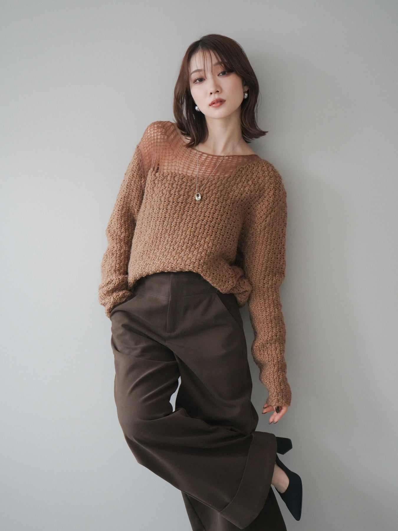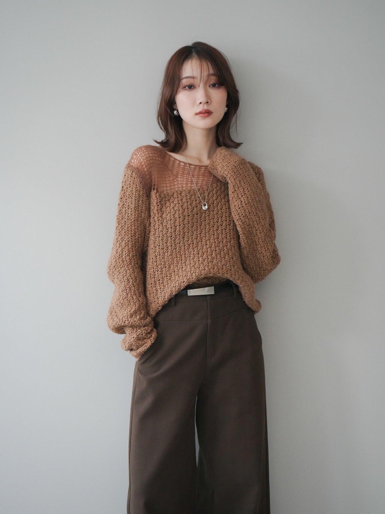 ざっくりとした編地と程よいダメージ加工がこなれ感を演出するニットプルオーバー。 ラフな表情の中にも女性らしさを感じさせる絶妙なデザインで、1枚でスタイリングが完成します。 柔らかなニット素材が優しく体を包み込み、リラックス感のある着心地に。 デニムやスカートなど、さまざまなアイテムと相性が良く、カジュアルにもモードにも着回せる万能アイテムです。 トレンドを取り入れつつ、抜け感のある大人のスタイルを楽しめる一枚です。 ※ボトムス、キャミソール(インナー)以外の商品は一律でインナーは付属していません。