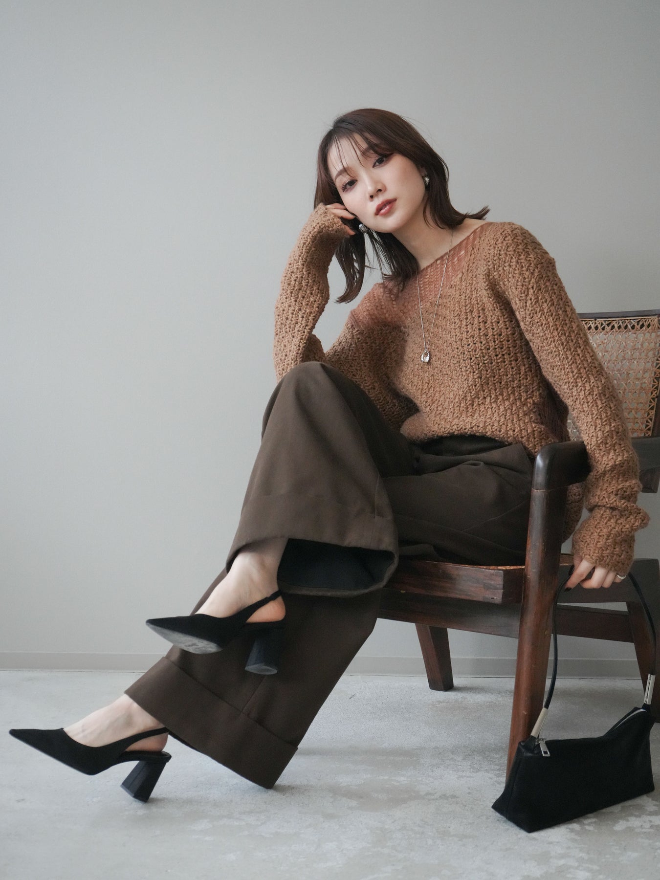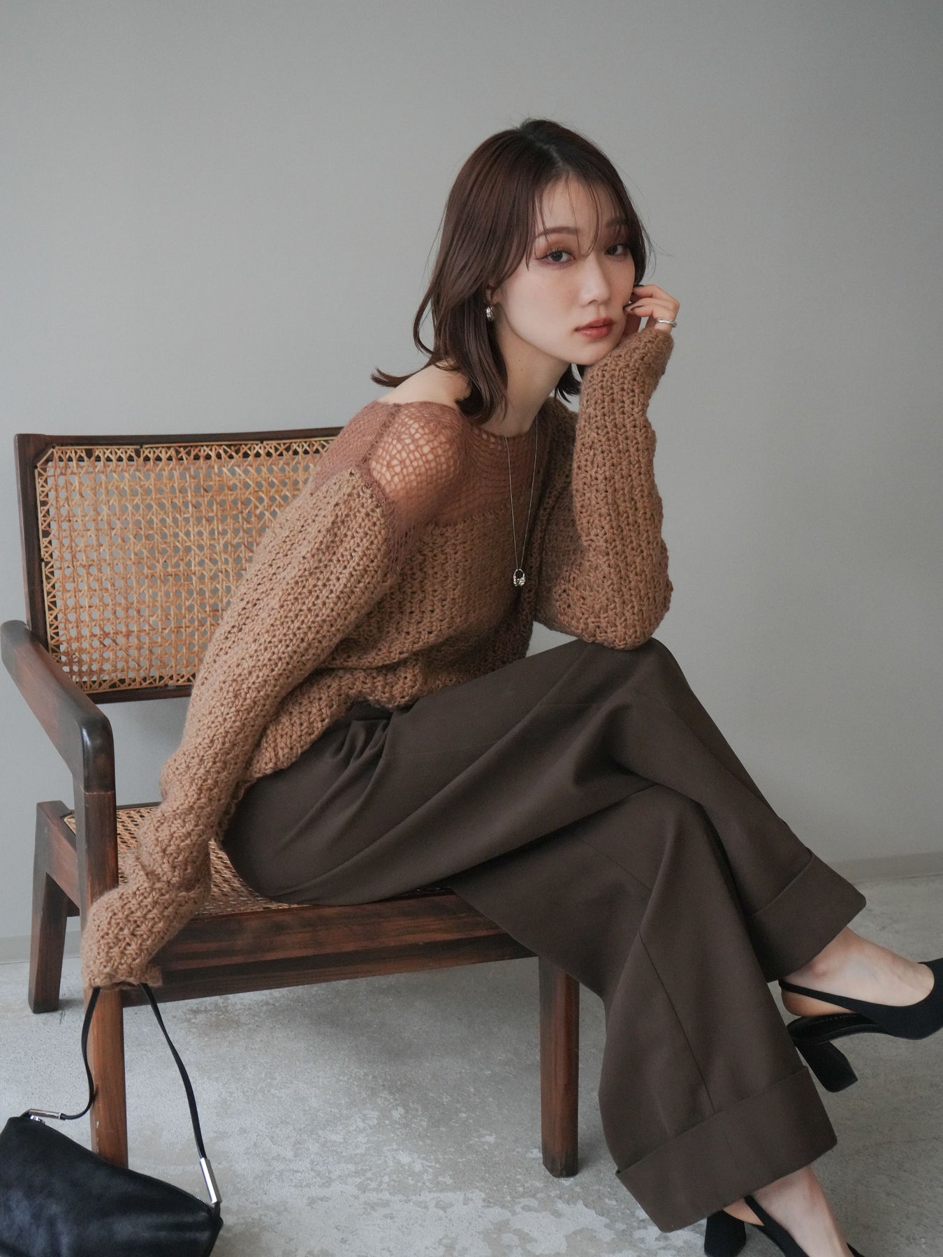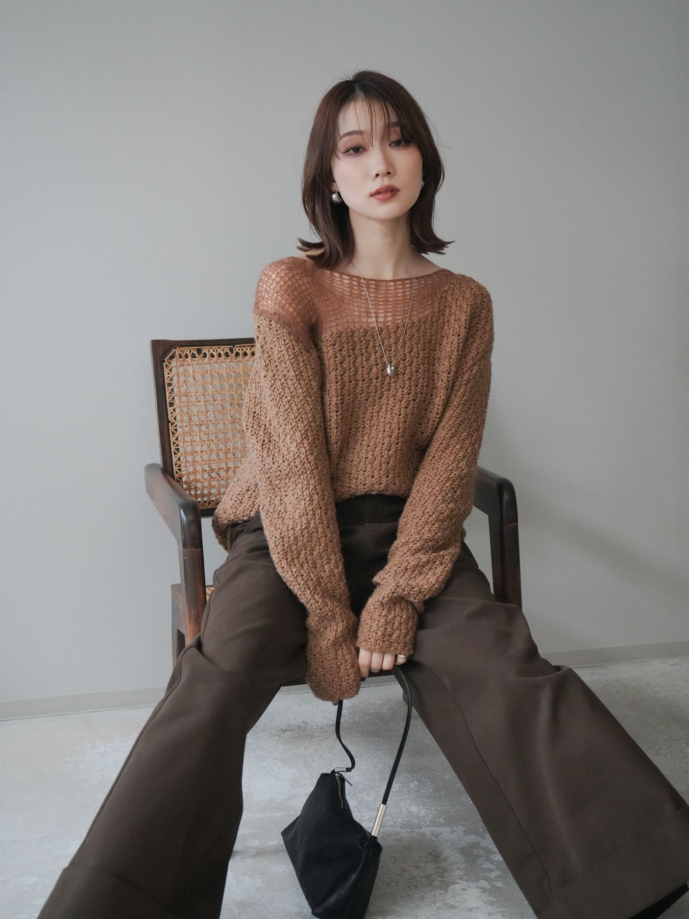 ざっくりとした編地と程よいダメージ加工がこなれ感を演出するニットプルオーバー。 ラフな表情の中にも女性らしさを感じさせる絶妙なデザインで、1枚でスタイリングが完成します。 柔らかなニット素材が優しく体を包み込み、リラックス感のある着心地に。 デニムやスカートなど、さまざまなアイテムと相性が良く、カジュアルにもモードにも着回せる万能アイテムです。 トレンドを取り入れつつ、抜け感のある大人のスタイルを楽しめる一枚です。 ※ボトムス、キャミソール(インナー)以外の商品は一律でインナーは付属していません。