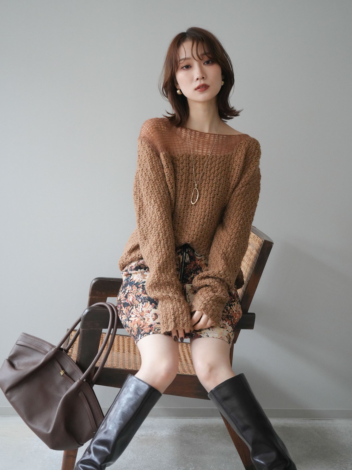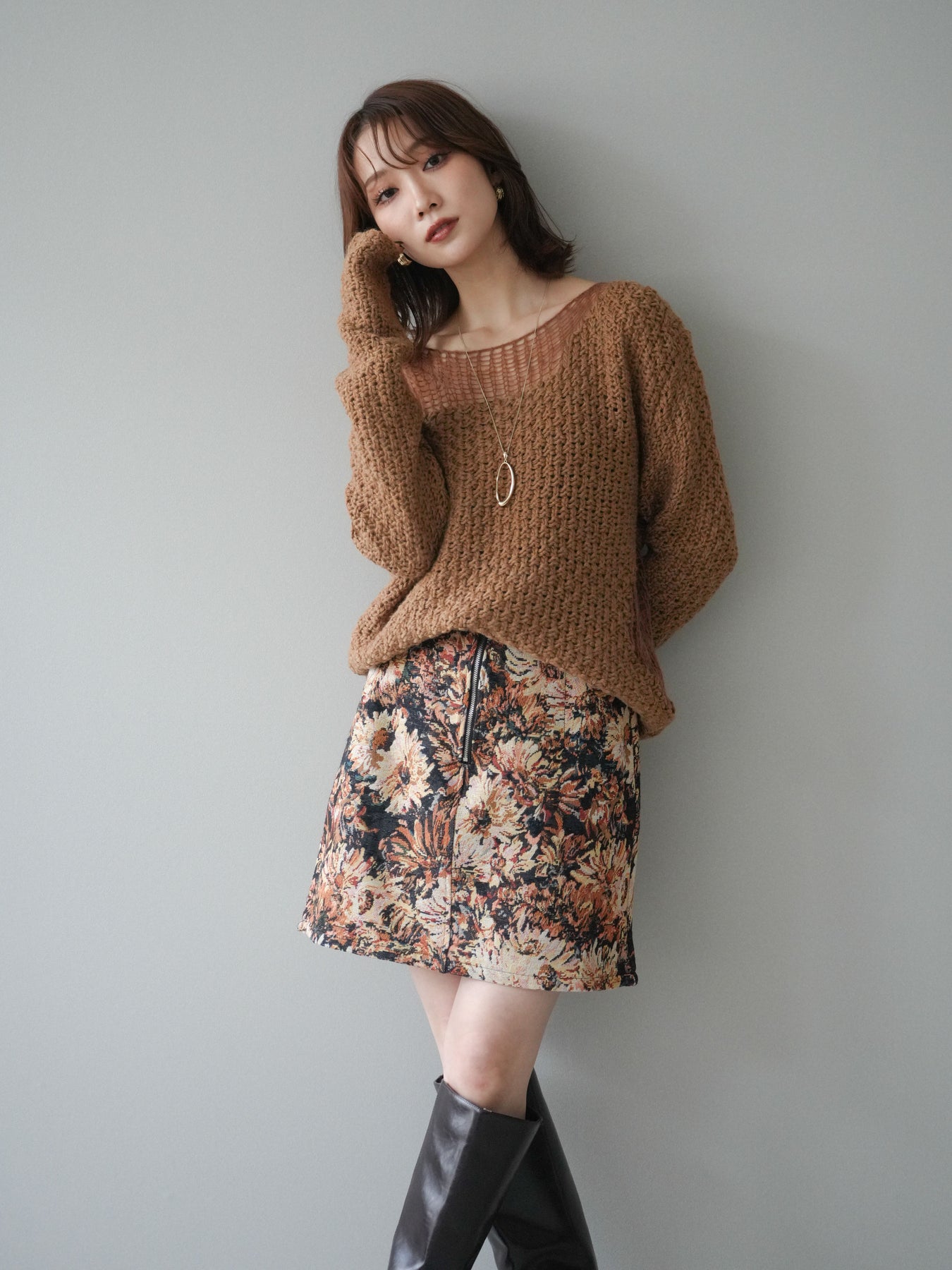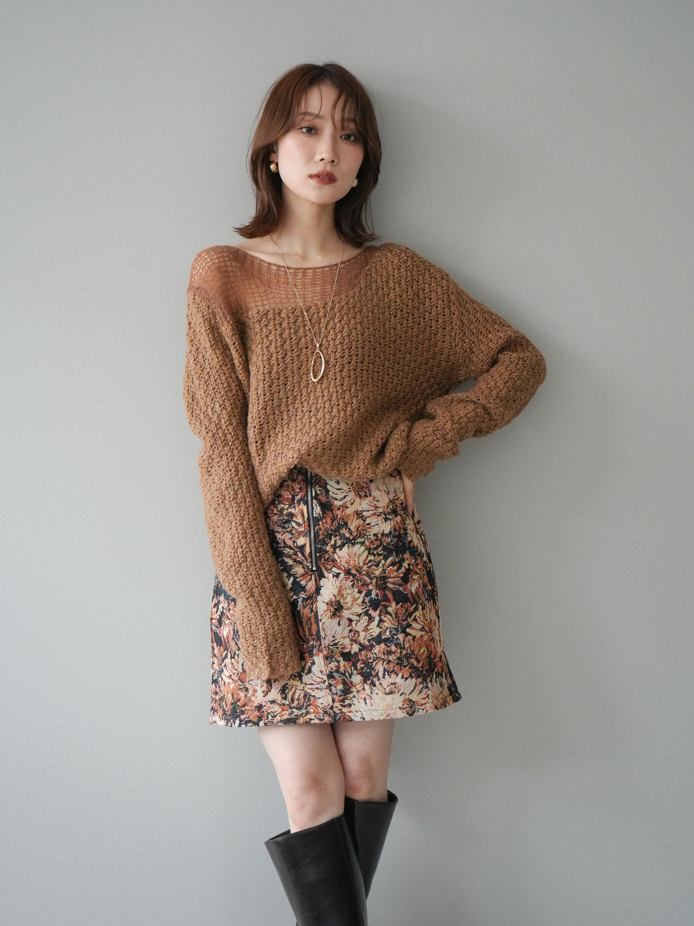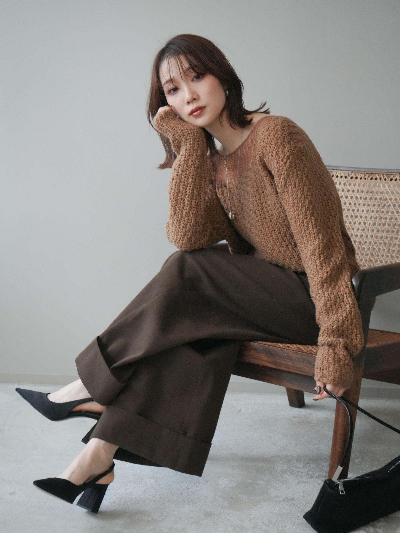 ざっくりとした編地と程よいダメージ加工がこなれ感を演出するニットプルオーバー。 ラフな表情の中にも女性らしさを感じさせる絶妙なデザインで、1枚でスタイリングが完成します。 柔らかなニット素材が優しく体を包み込み、リラックス感のある着心地に。 デニムやスカートなど、さまざまなアイテムと相性が良く、カジュアルにもモードにも着回せる万能アイテムです。 トレンドを取り入れつつ、抜け感のある大人のスタイルを楽しめる一枚です。 ※ボトムス、キャミソール(インナー)以外の商品は一律でインナーは付属していません。