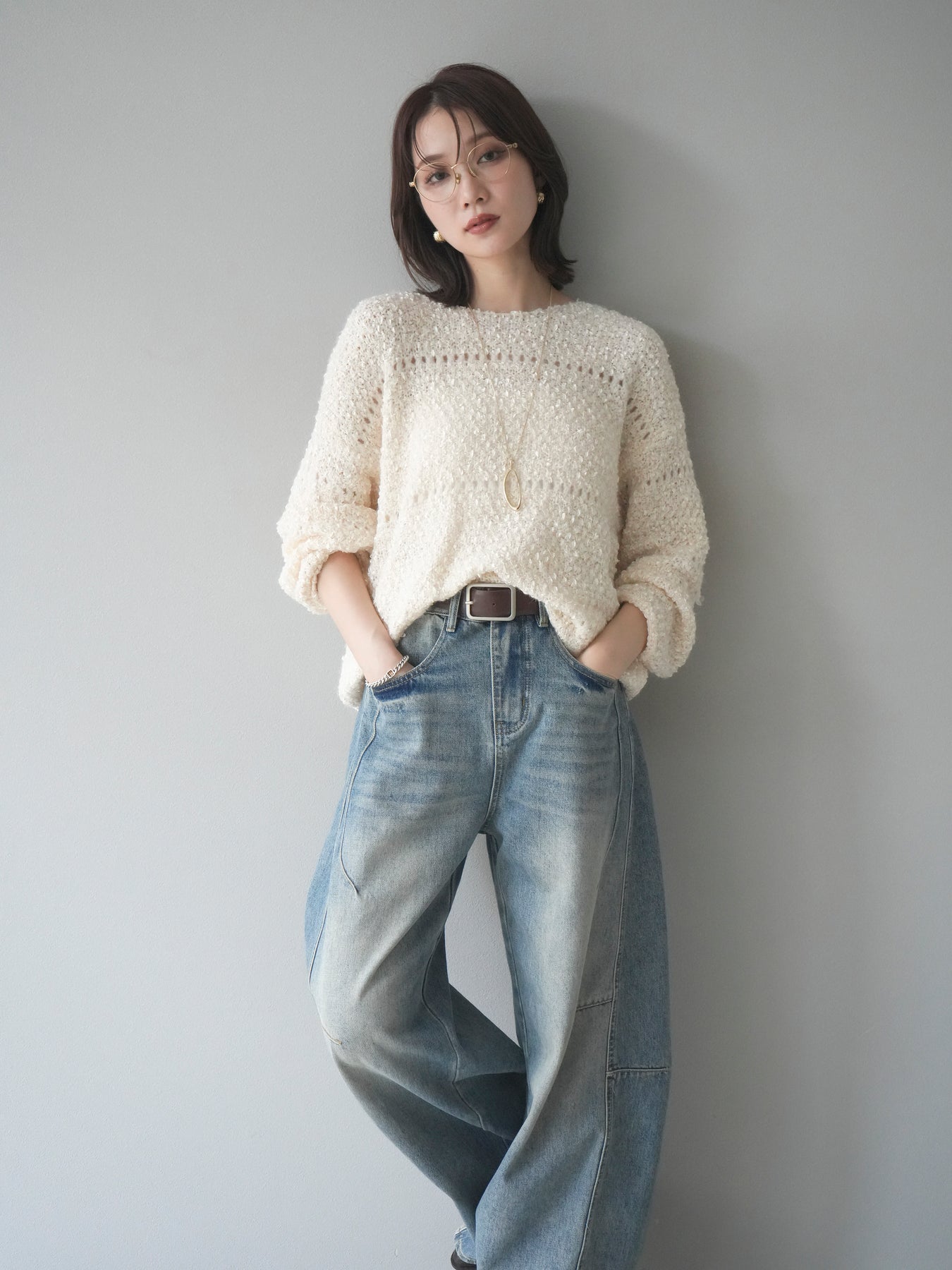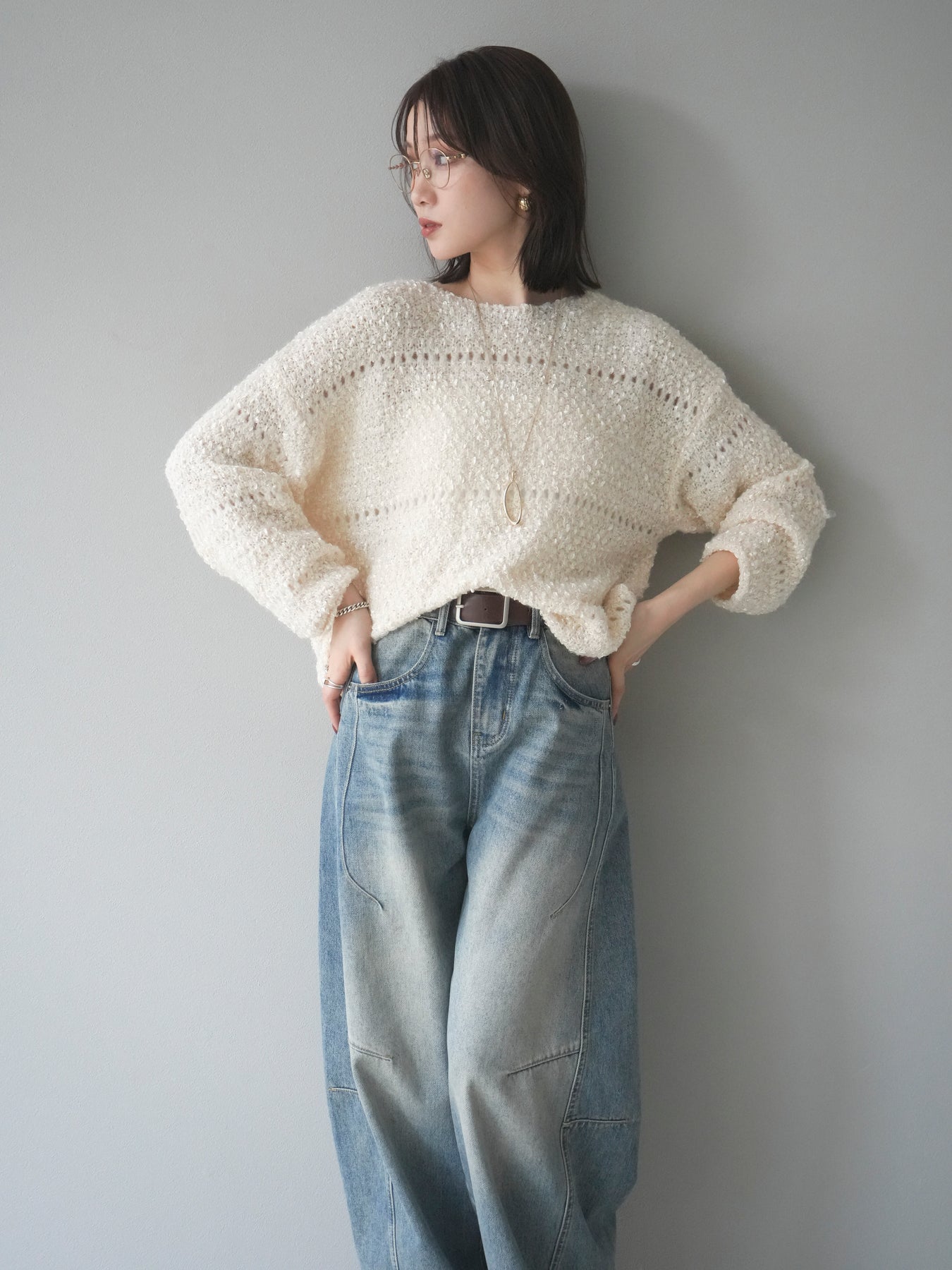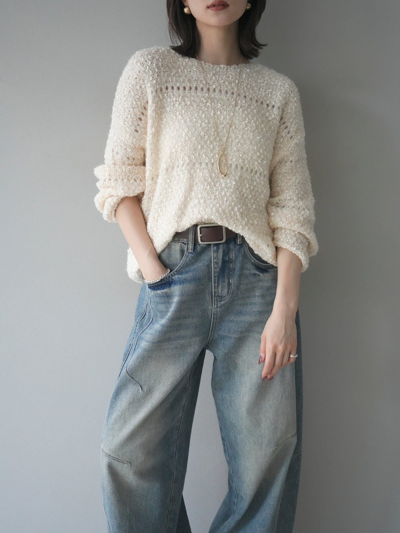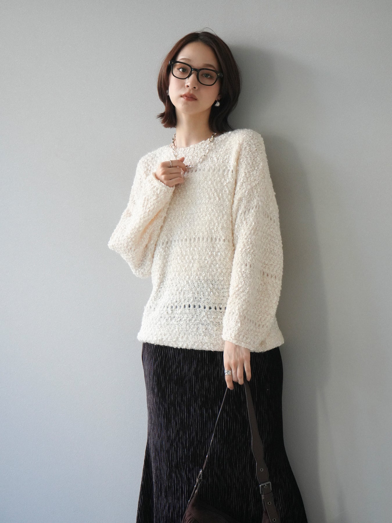 ラメ糸を織り交ぜたループヤーン素材が魅力のニットプルオーバー。 ふんわりとした立体感のある編地に、さりげない光沢が加わり、女性らしい華やかさを演出します。 軽やかで柔らかな着心地ながら、程よくボリュームがあり、一枚で存在感のあるデザイン。 ゆったりとしたシルエットでリラックス感があり、デイリー使いにもぴったりです。 シンプルなボトムに合わせるだけで、コーディネートに季節感を添えるアイテムです。 ※ボトムス、キャミソール(インナー)以外の商品は一律でインナーは付属していません。
