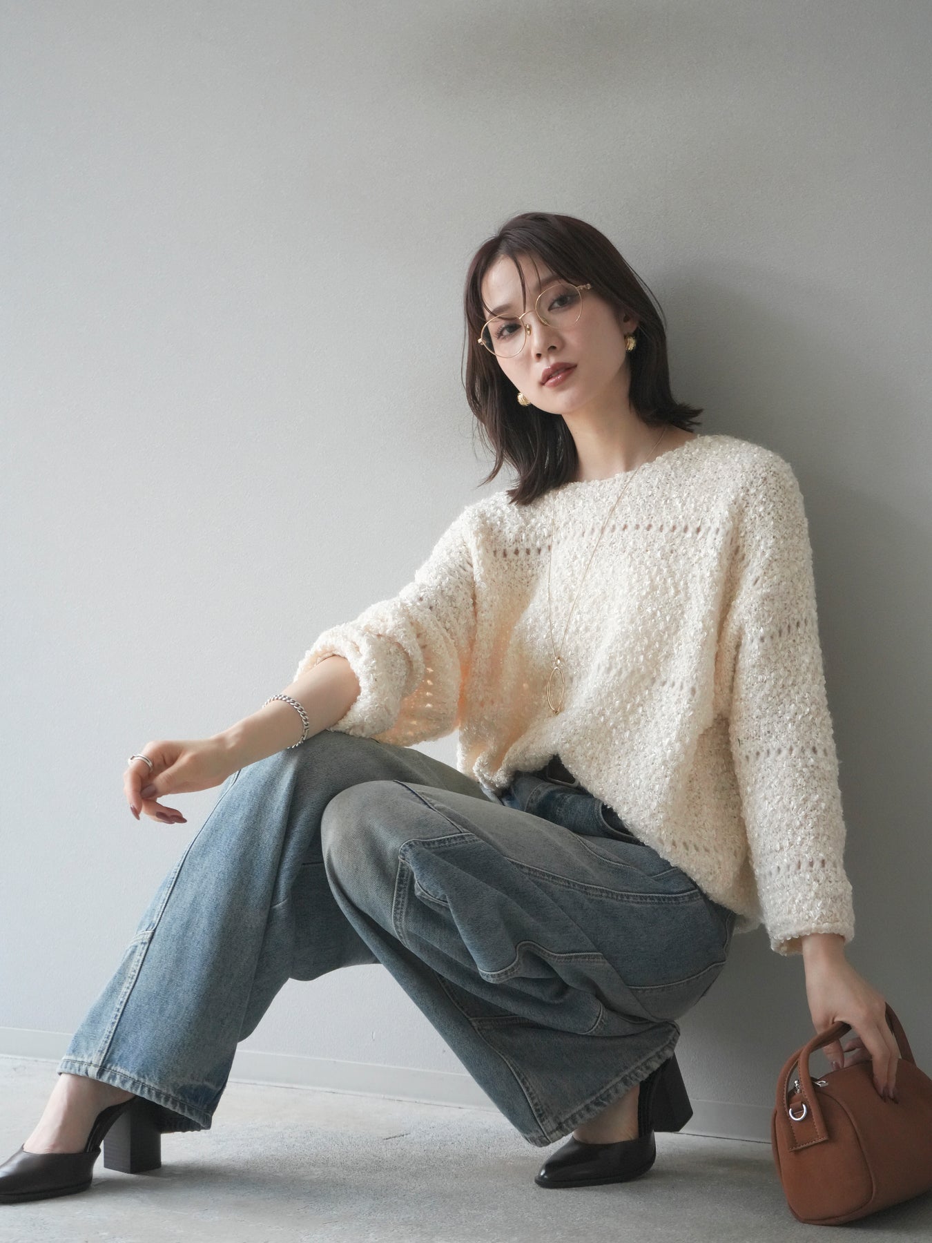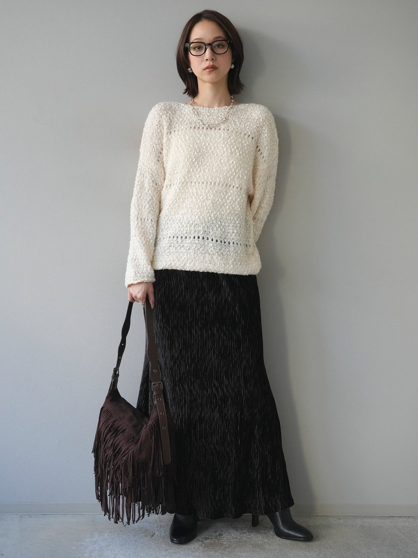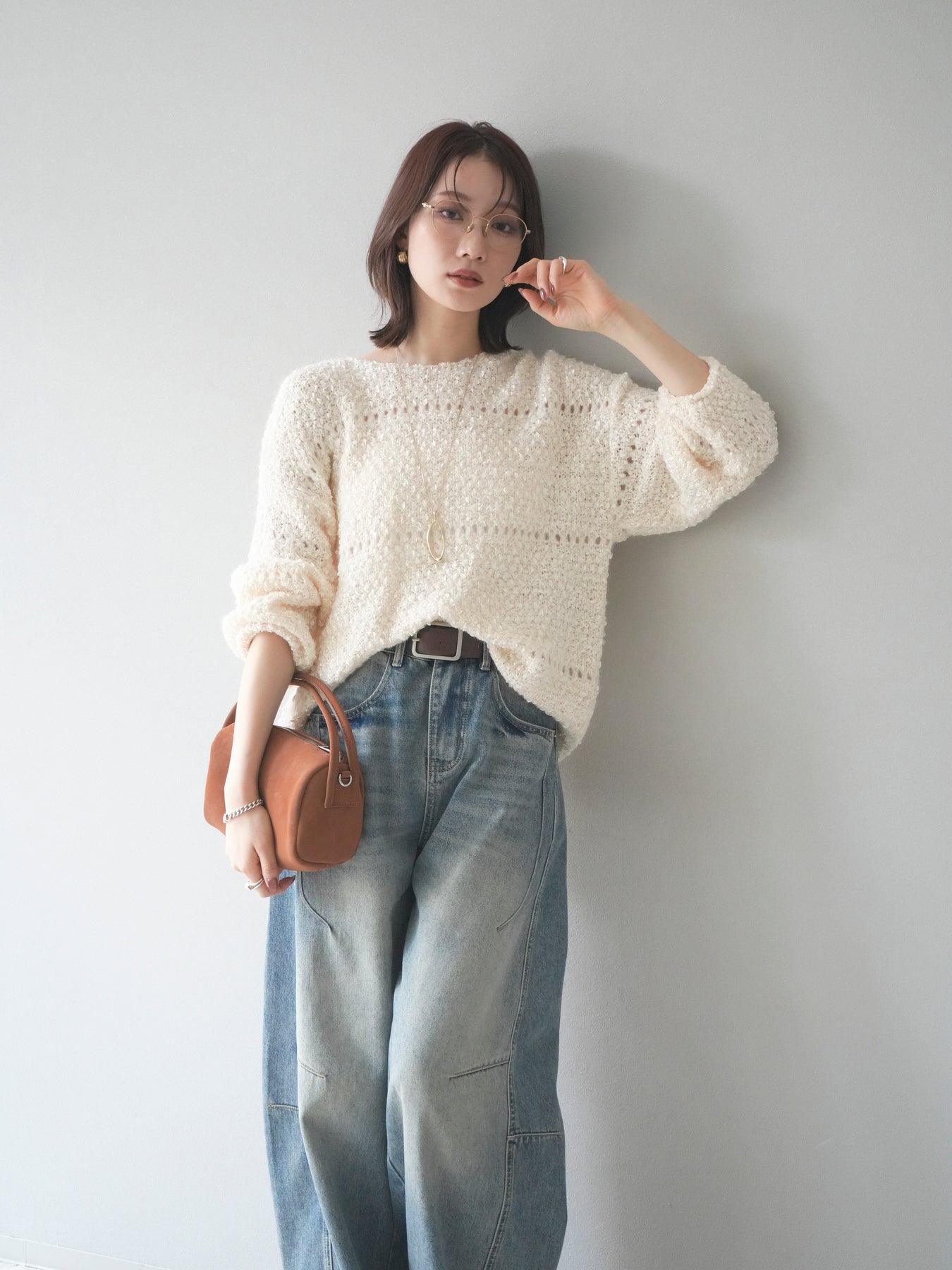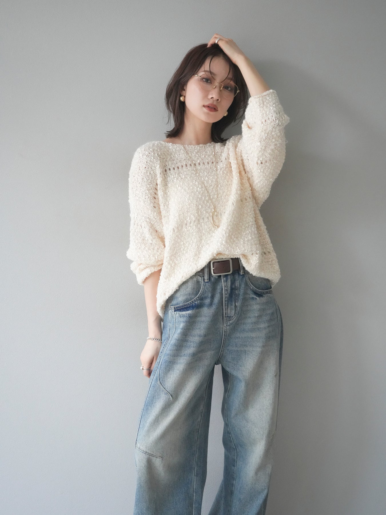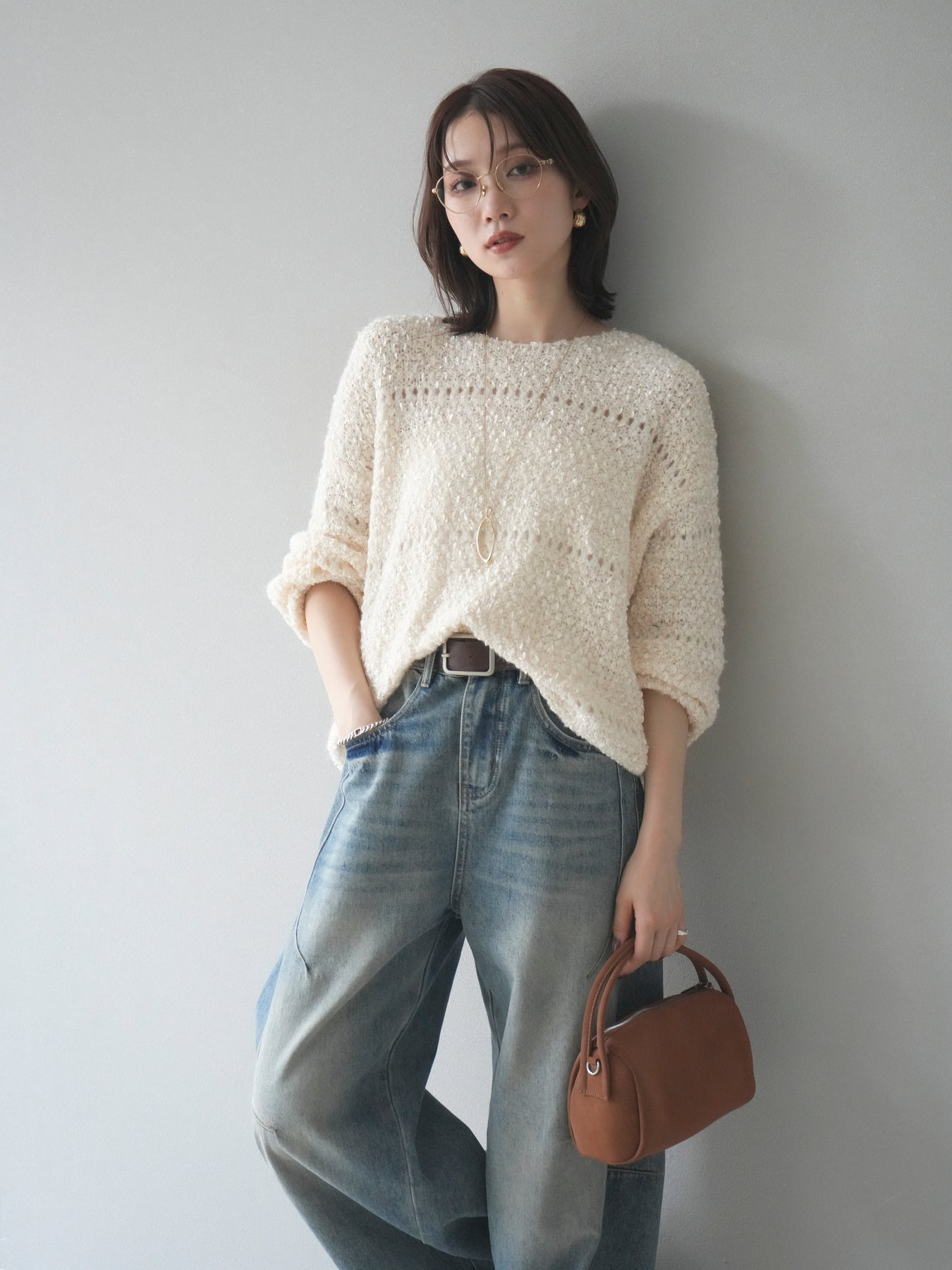 ラメ糸を織り交ぜたループヤーン素材が魅力のニットプルオーバー。 ふんわりとした立体感のある編地に、さりげない光沢が加わり、女性らしい華やかさを演出します。 軽やかで柔らかな着心地ながら、程よくボリュームがあり、一枚で存在感のあるデザイン。 ゆったりとしたシルエットでリラックス感があり、デイリー使いにもぴったりです。 シンプルなボトムに合わせるだけで、コーディネートに季節感を添えるアイテムです。 ※ボトムス、キャミソール(インナー)以外の商品は一律でインナーは付属していません。