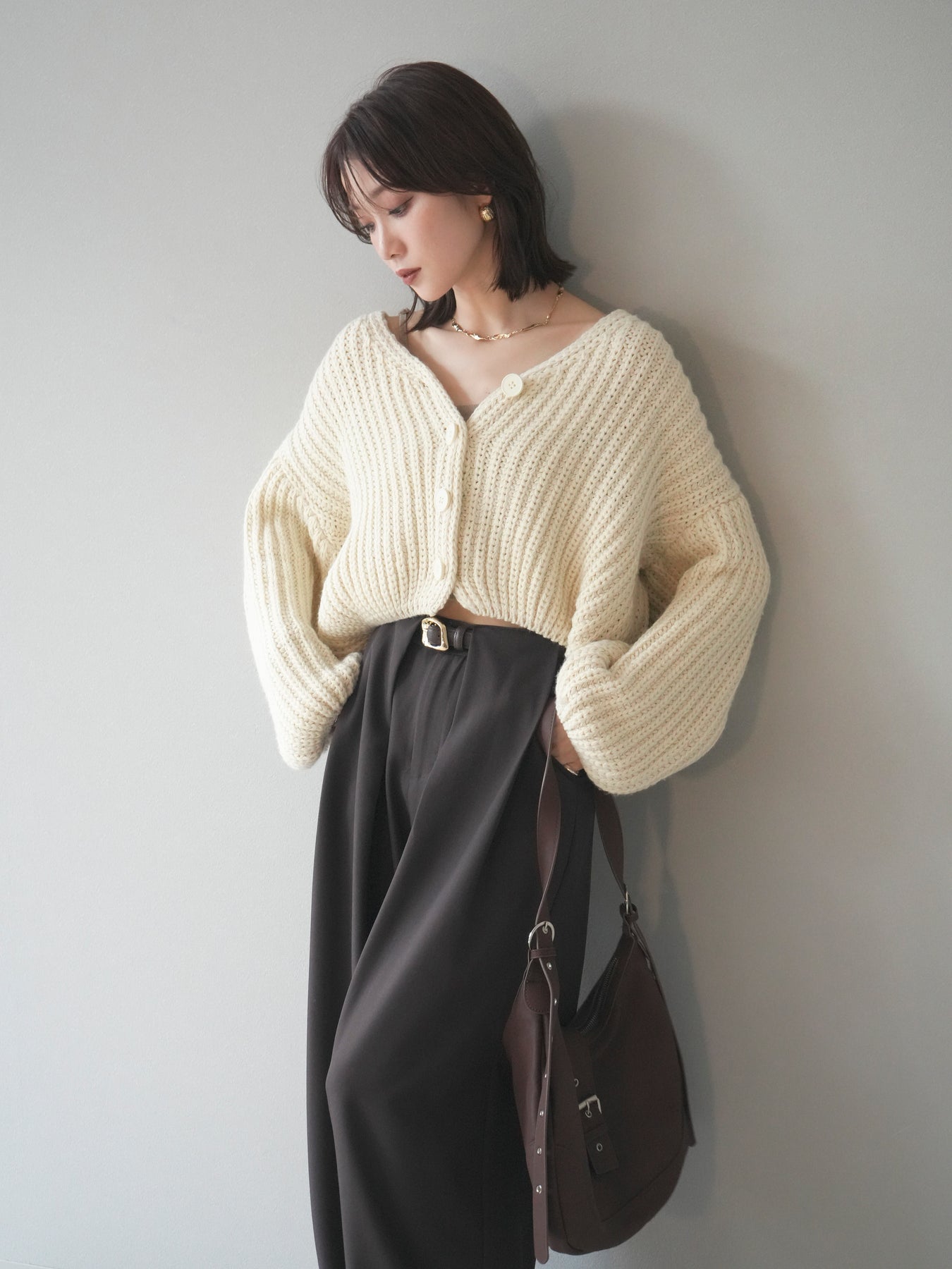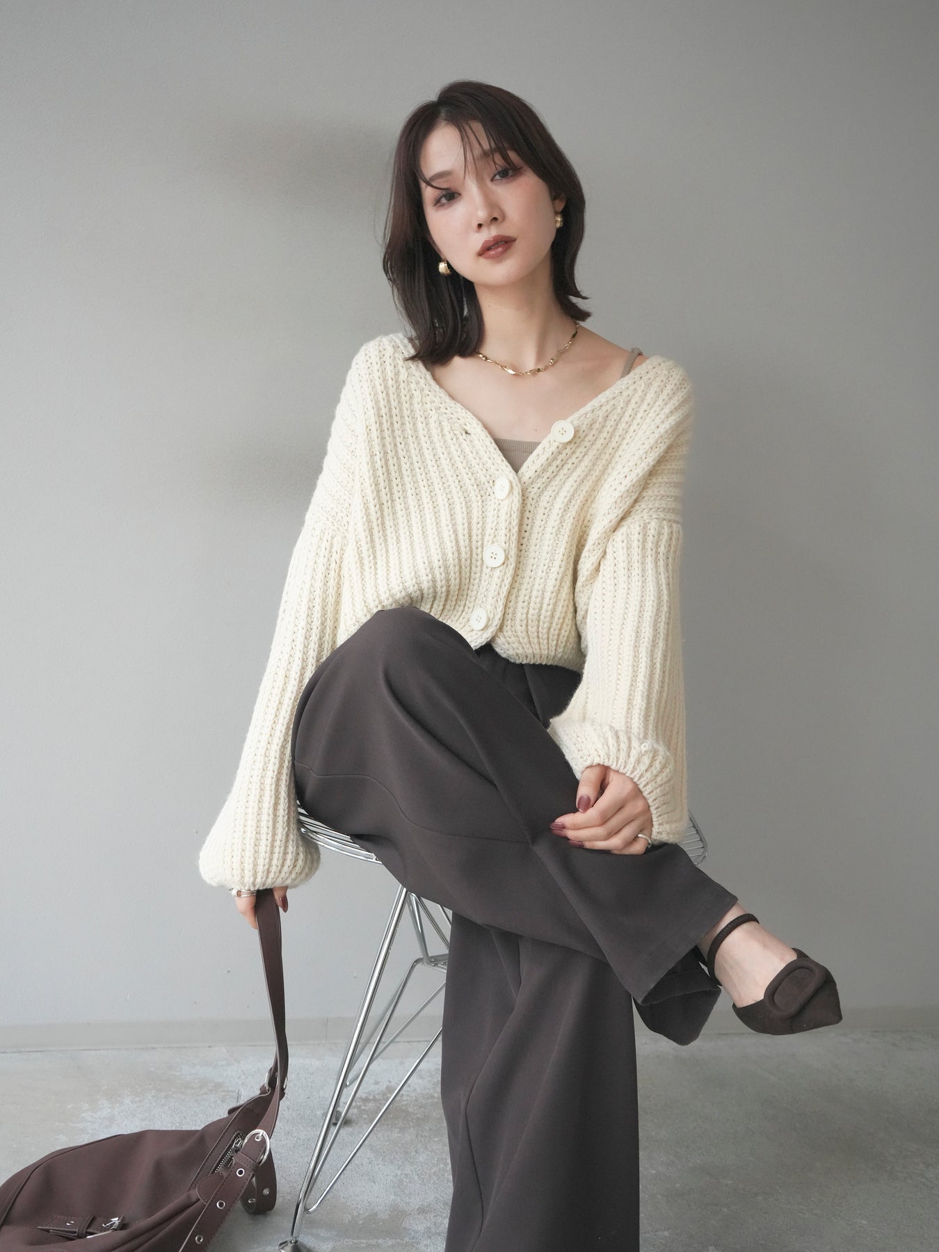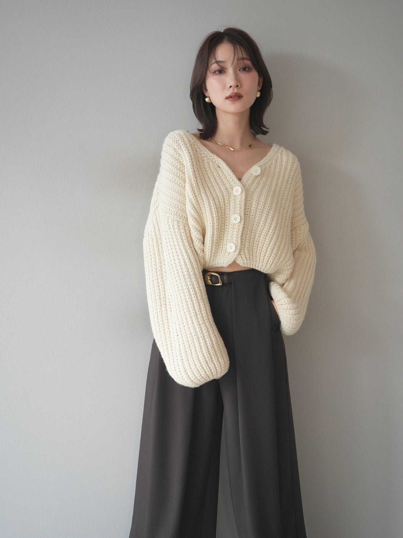 立体感のあるケーブル編みが魅力のニットカーディガン。 ふっくらとした編地が柔らかな印象を与え、シンプルながらも存在感のある一枚です。 ゆったりとしたシルエットと程よい丈感で、ボトムスを選ばず着回しやすいデザイン。 フロントのボタンを閉じてトップス風にも、開けて羽織りとしても使える万能アイテムです。 デイリーはもちろん、リラックス感のあるお出かけスタイルにもぴったりの一着。 ※ボトムス、キャミソール(インナー)以外の商品は一律でインナーは付属していません。