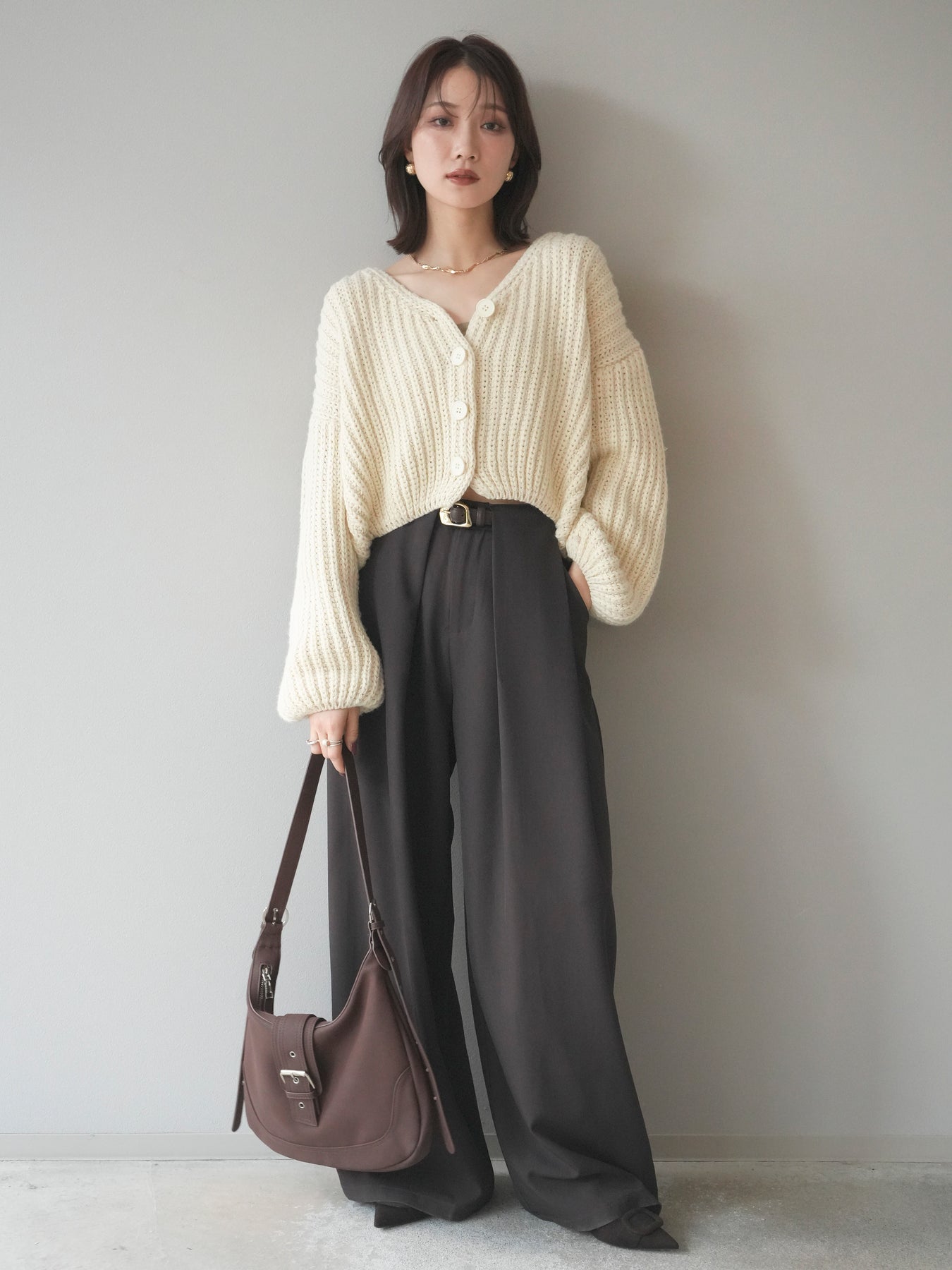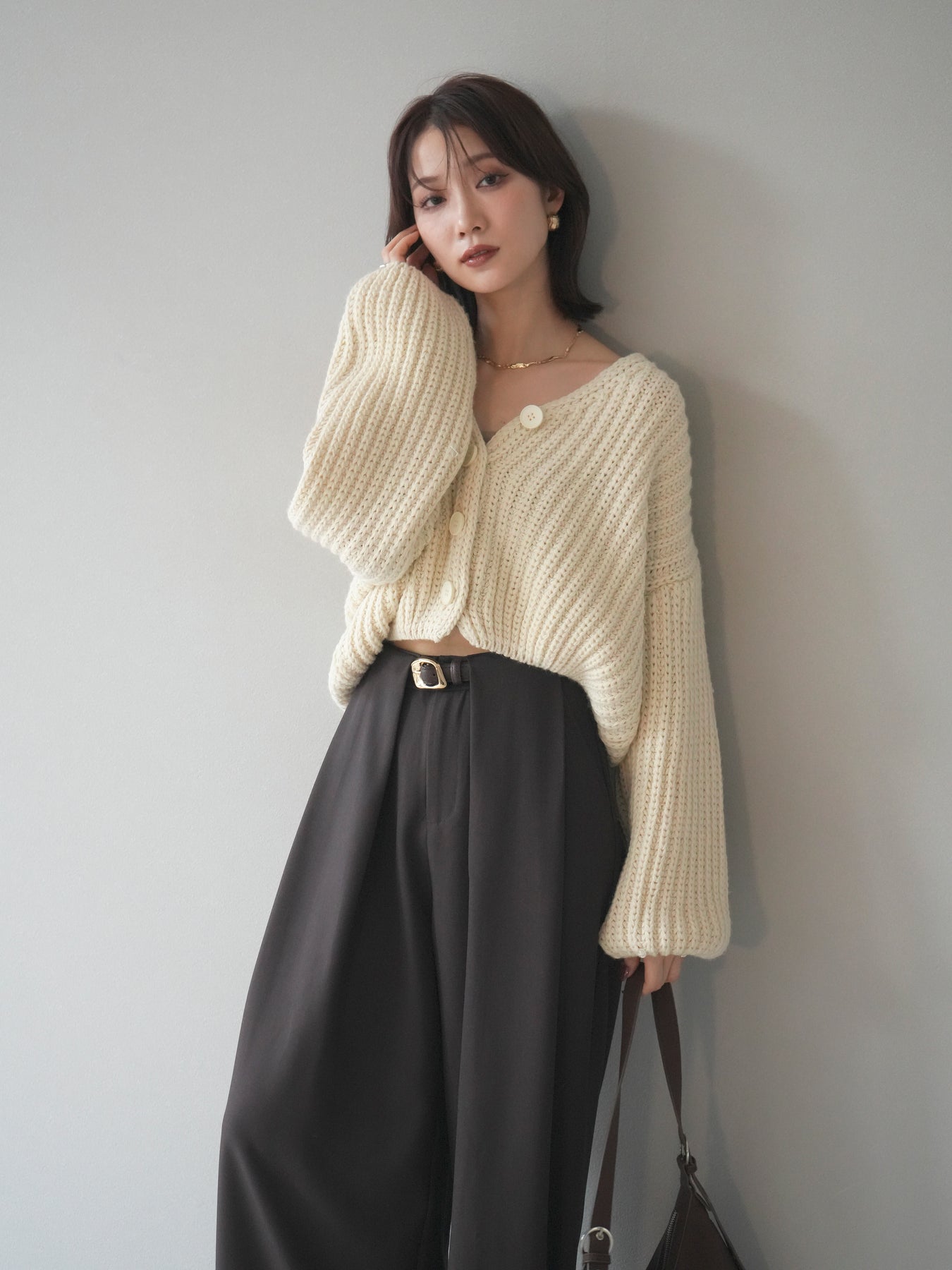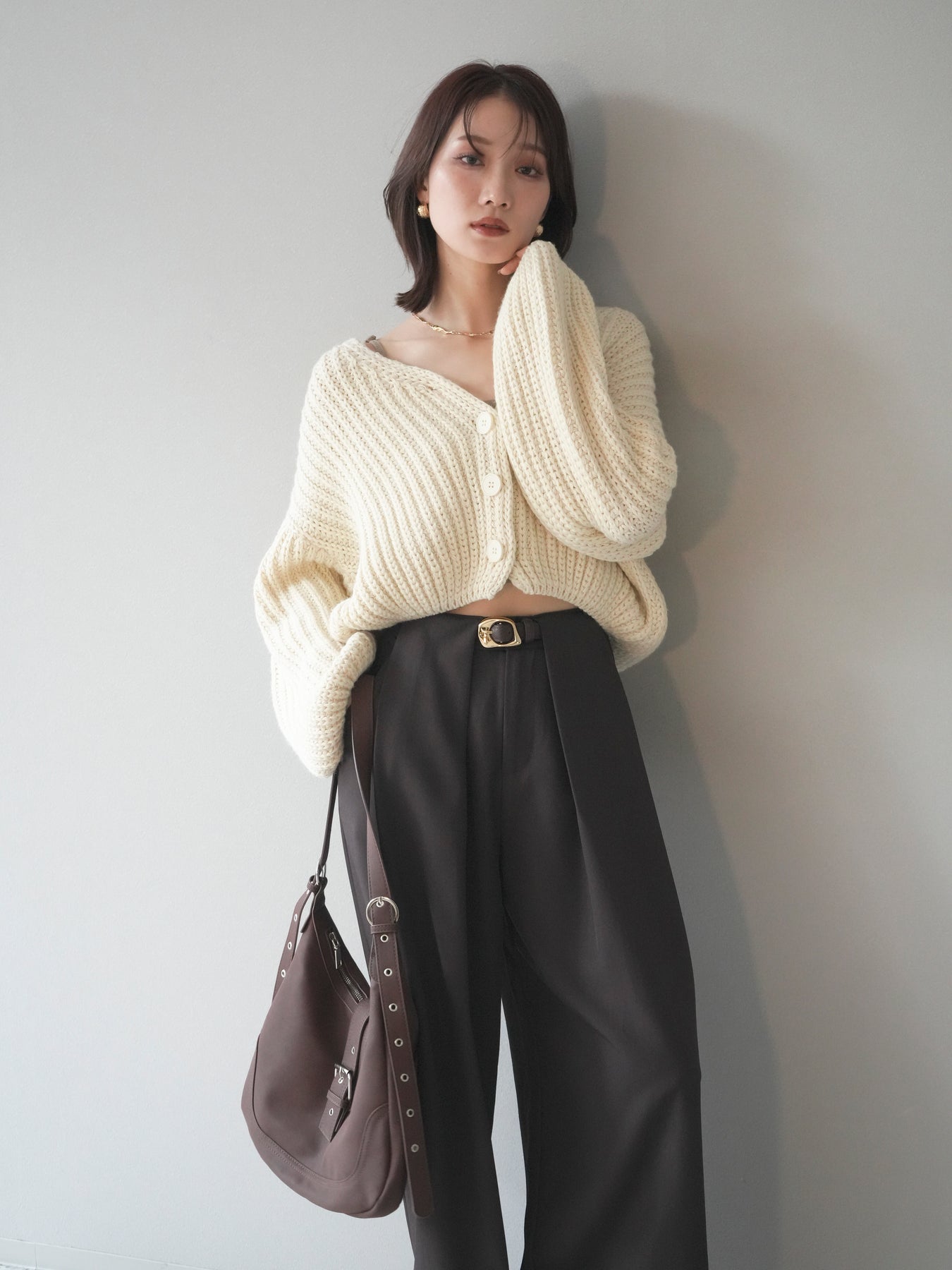 立体感のあるケーブル編みが魅力のニットカーディガン。 ふっくらとした編地が柔らかな印象を与え、シンプルながらも存在感のある一枚です。 ゆったりとしたシルエットと程よい丈感で、ボトムスを選ばず着回しやすいデザイン。 フロントのボタンを閉じてトップス風にも、開けて羽織りとしても使える万能アイテムです。 デイリーはもちろん、リラックス感のあるお出かけスタイルにもぴったりの一着。 ※ボトムス、キャミソール(インナー)以外の商品は一律でインナーは付属していません。