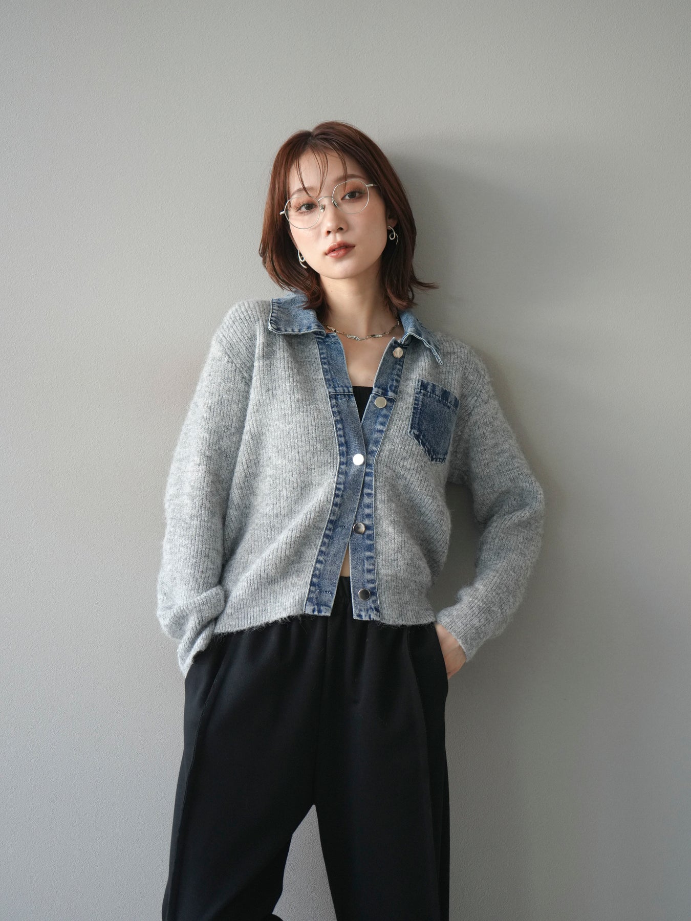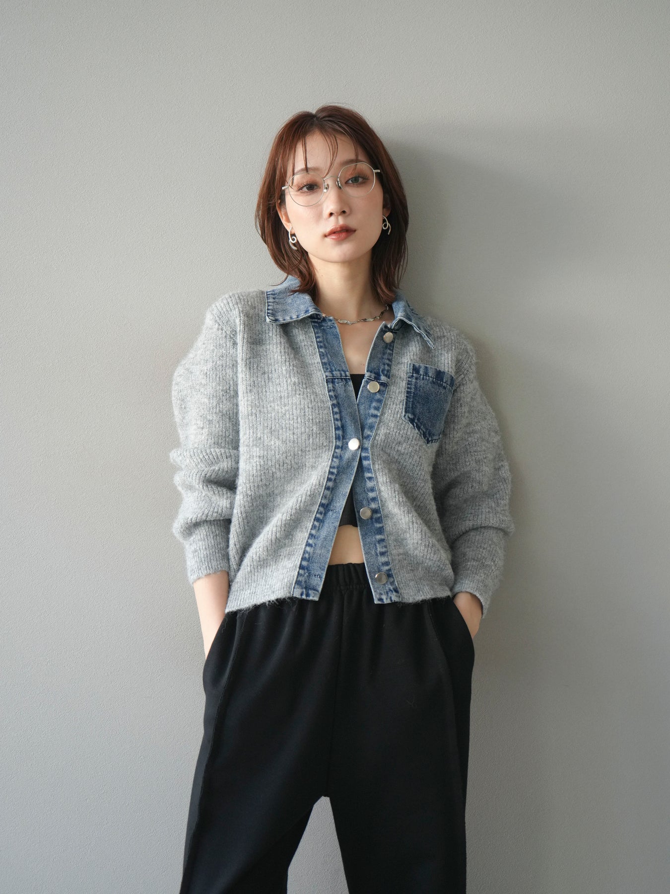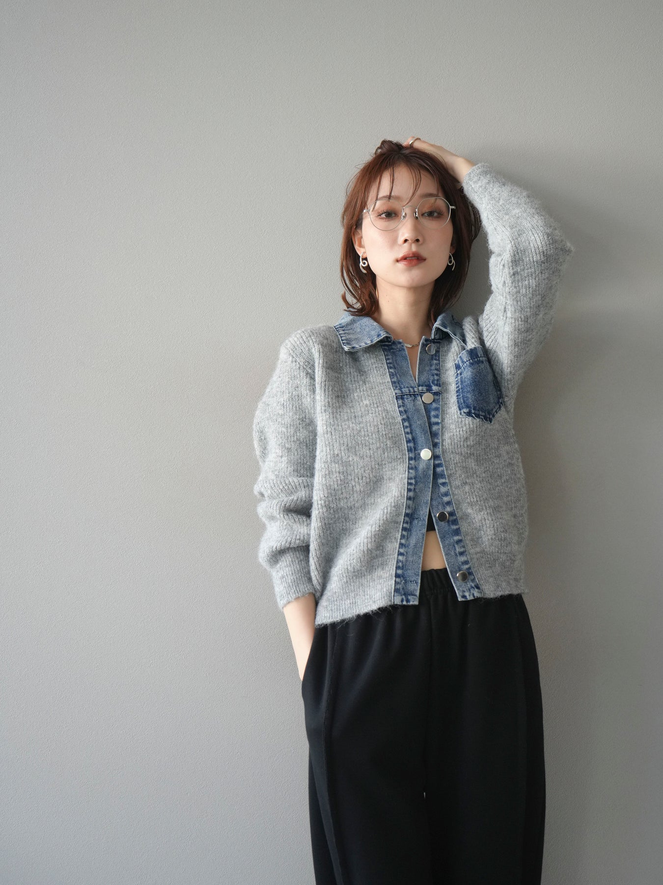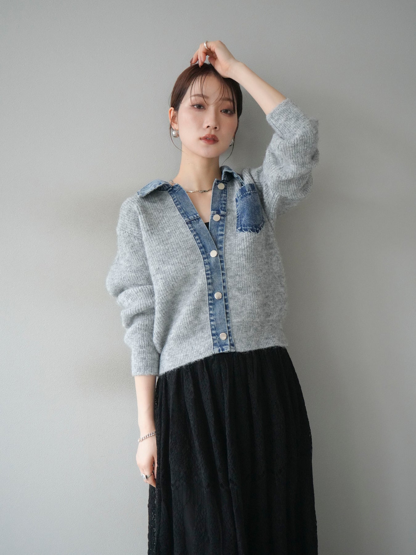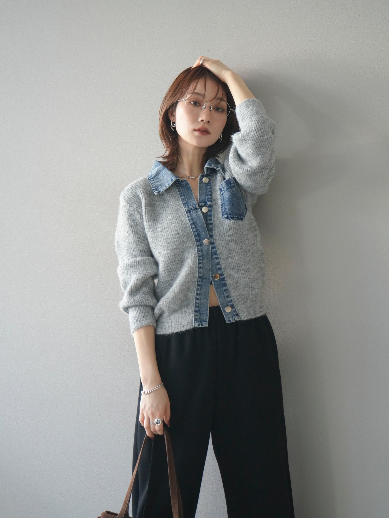 ふんわりとしたニットの優しい風合いに、デニム素材を組み合わせた異素材デザインカーディガン。 襟・前立て・ポケット部分に施されたデニムが、柔らかさの中に程よいカジュアルさをプラスします。 ゆとりのあるシルエットと長めの袖が抜け感を演出し、羽織るだけでスタイリングを今っぽく仕上げてくれる一枚。 シンプルなインナーやスカート・パンツなど、さまざまなボトムとも相性抜群で、デイリー使いにもおすすめです。 軽やかな着心地で、季節の変わり目にも活躍してくれる万能アイテムです。 ※ボトムス、キャミソール(インナー)以外の商品は一律でインナーは付属していません。