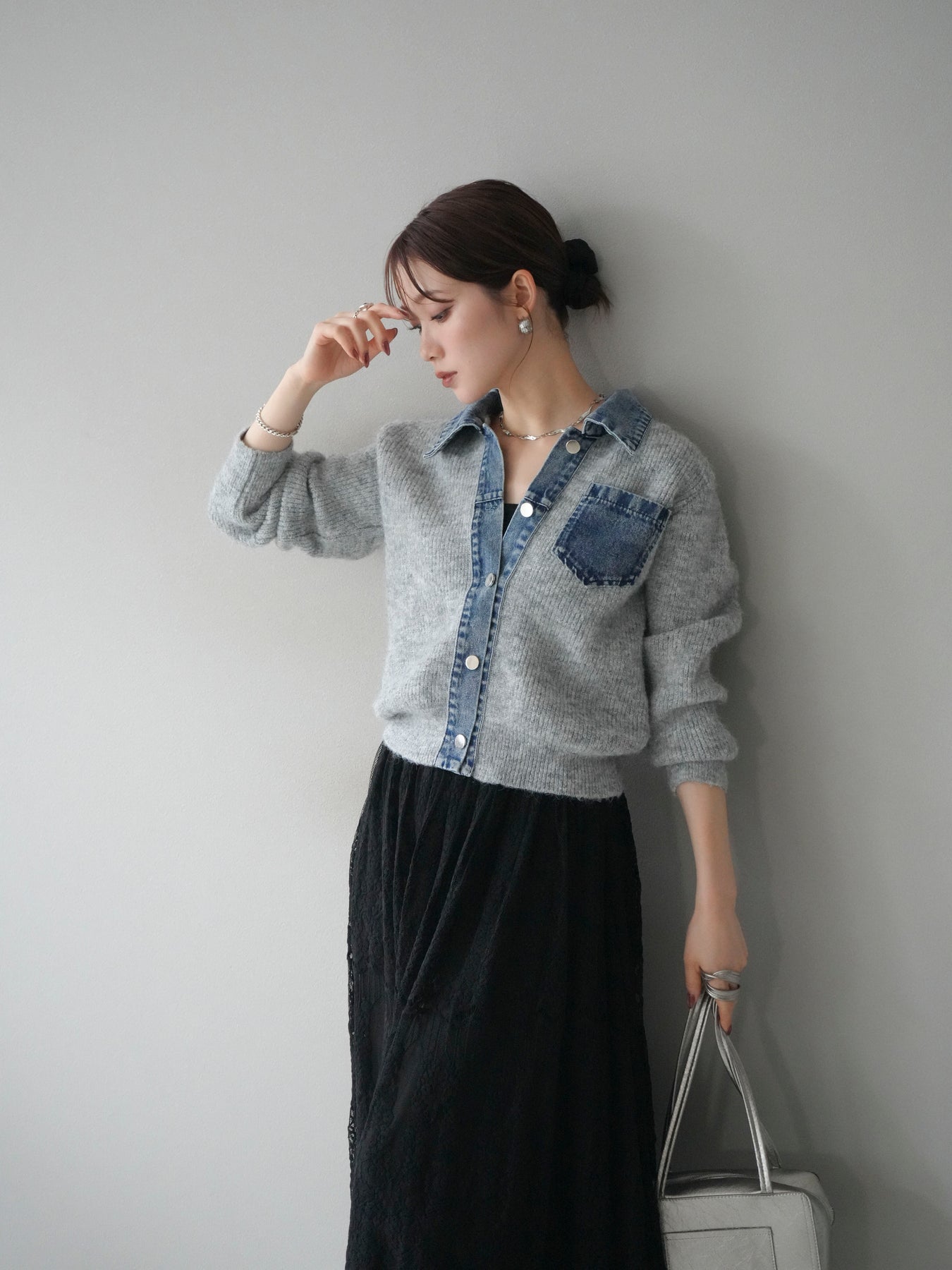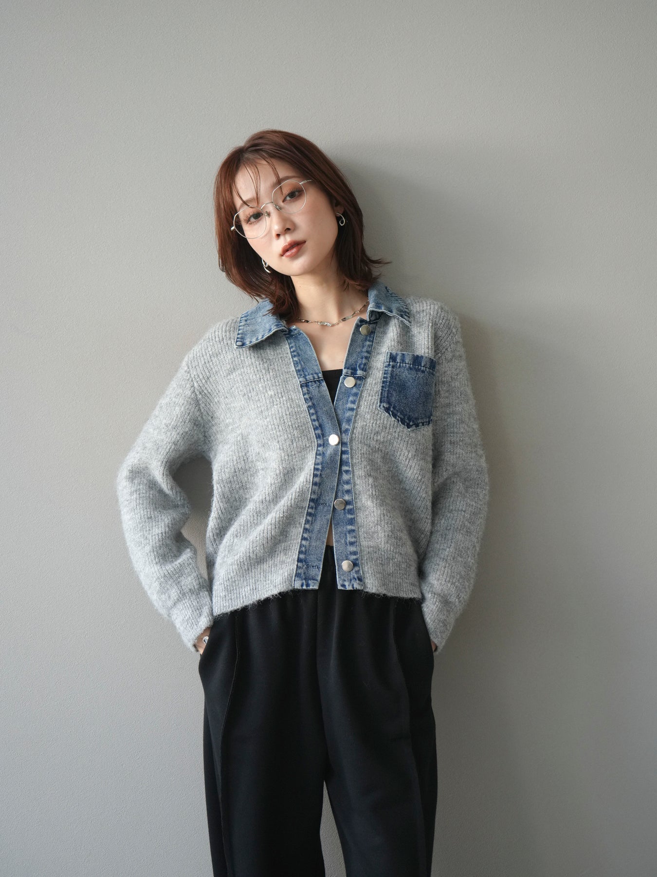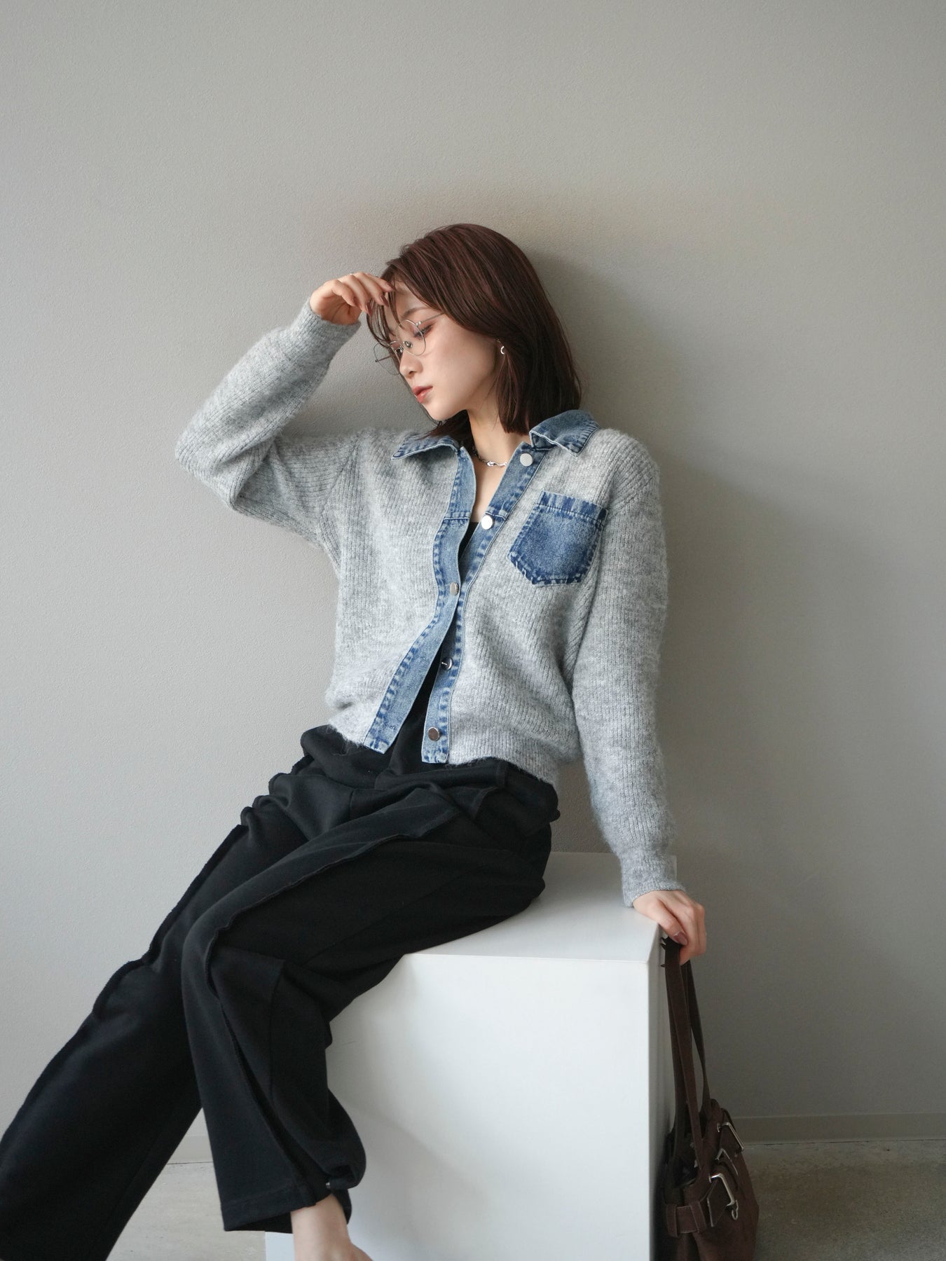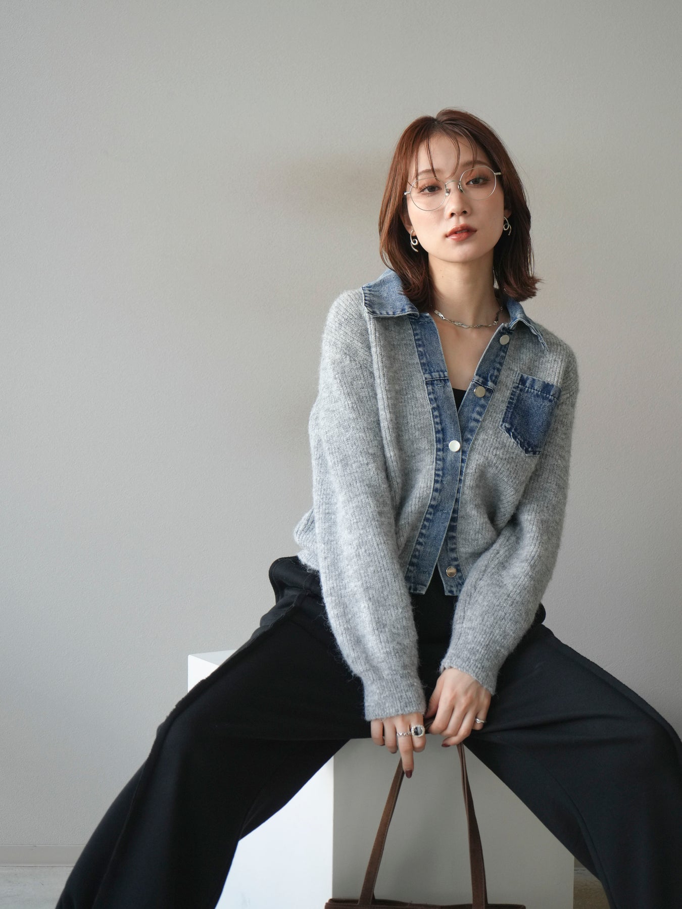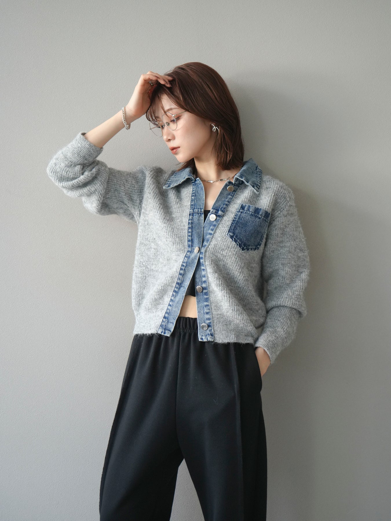 ふんわりとしたニットの優しい風合いに、デニム素材を組み合わせた異素材デザインカーディガン。 襟・前立て・ポケット部分に施されたデニムが、柔らかさの中に程よいカジュアルさをプラスします。 ゆとりのあるシルエットと長めの袖が抜け感を演出し、羽織るだけでスタイリングを今っぽく仕上げてくれる一枚。 シンプルなインナーやスカート・パンツなど、さまざまなボトムとも相性抜群で、デイリー使いにもおすすめです。 軽やかな着心地で、季節の変わり目にも活躍してくれる万能アイテムです。 ※ボトムス、キャミソール(インナー)以外の商品は一律でインナーは付属していません。