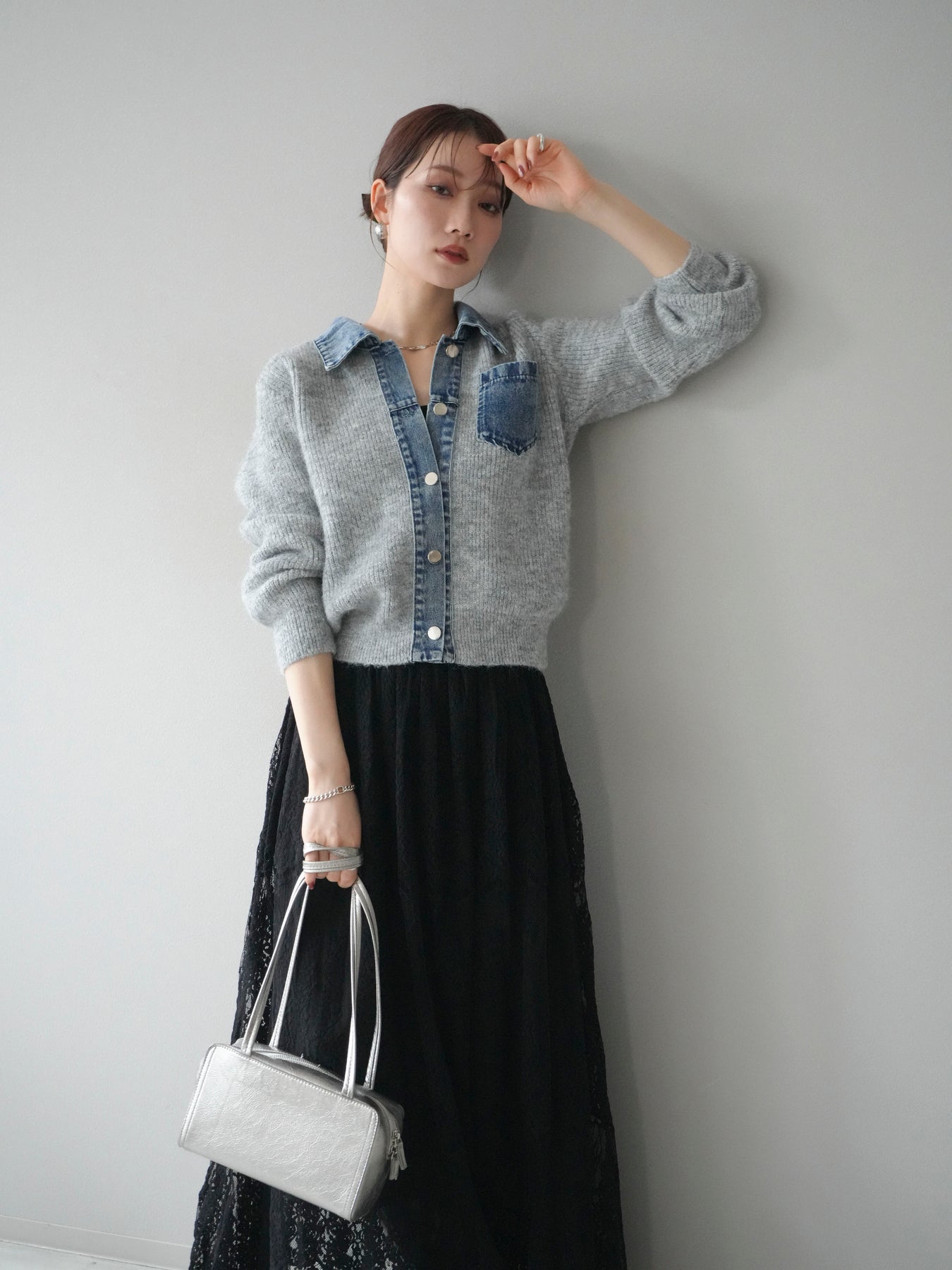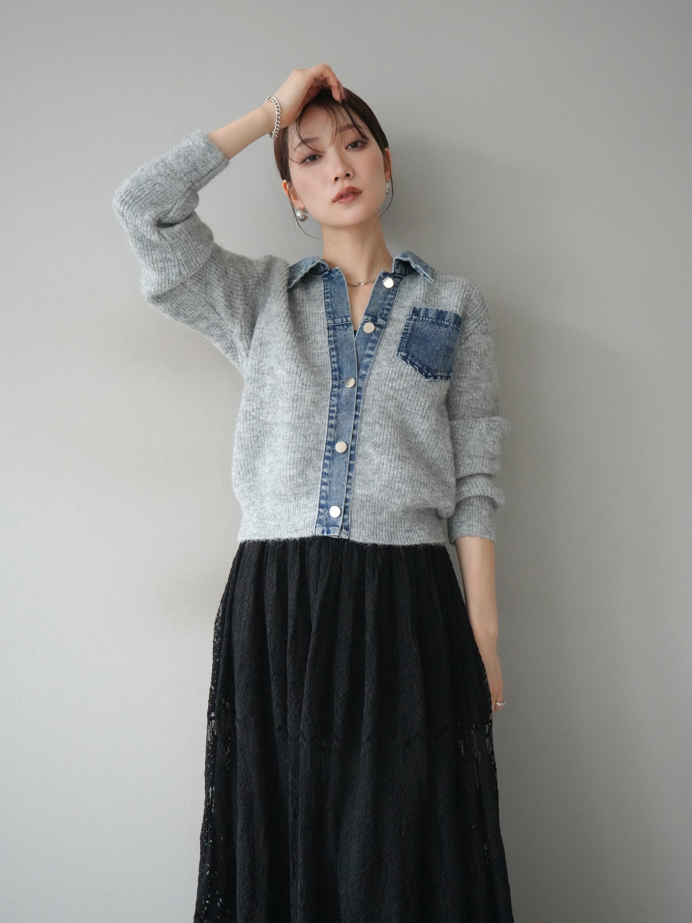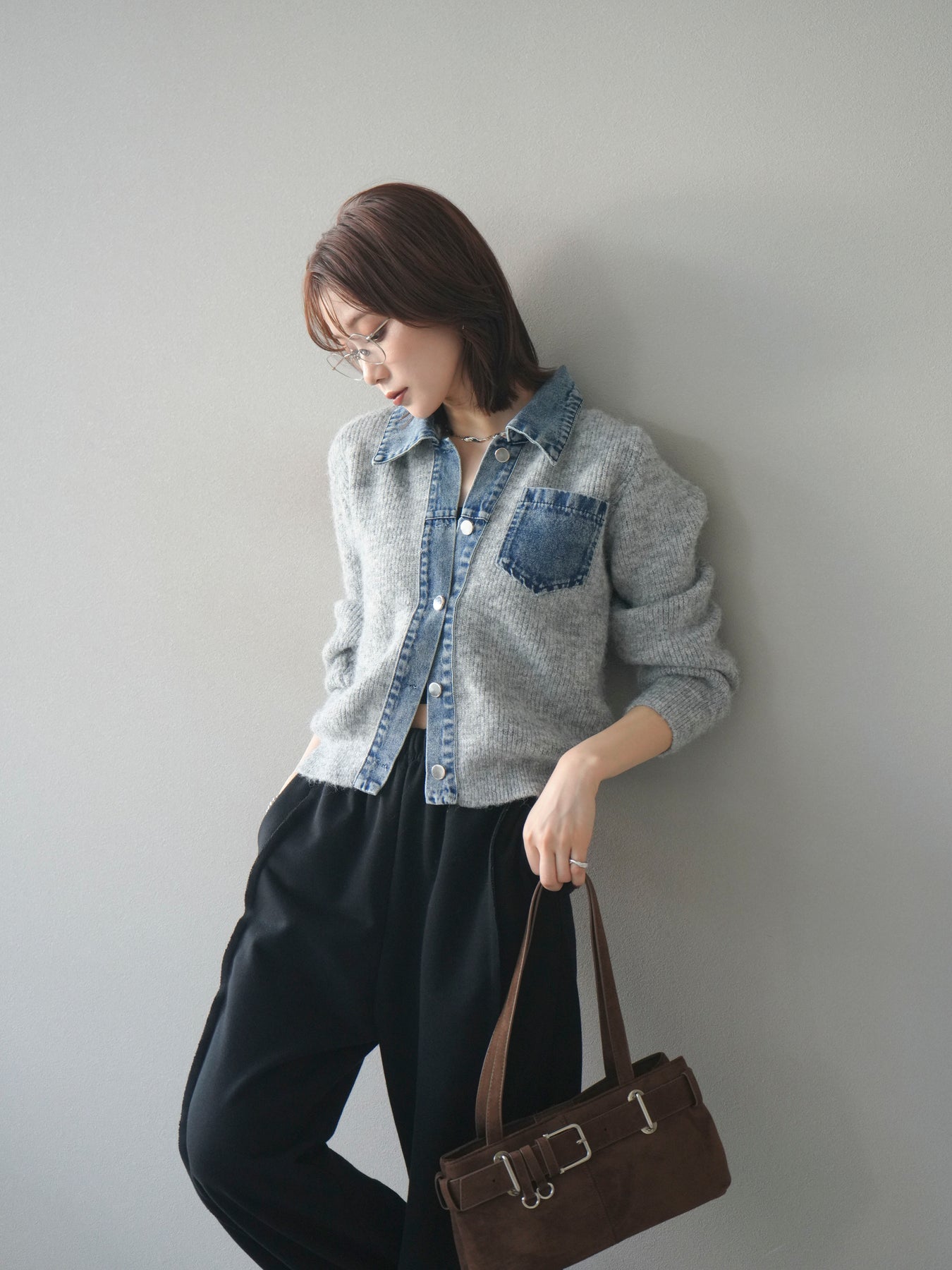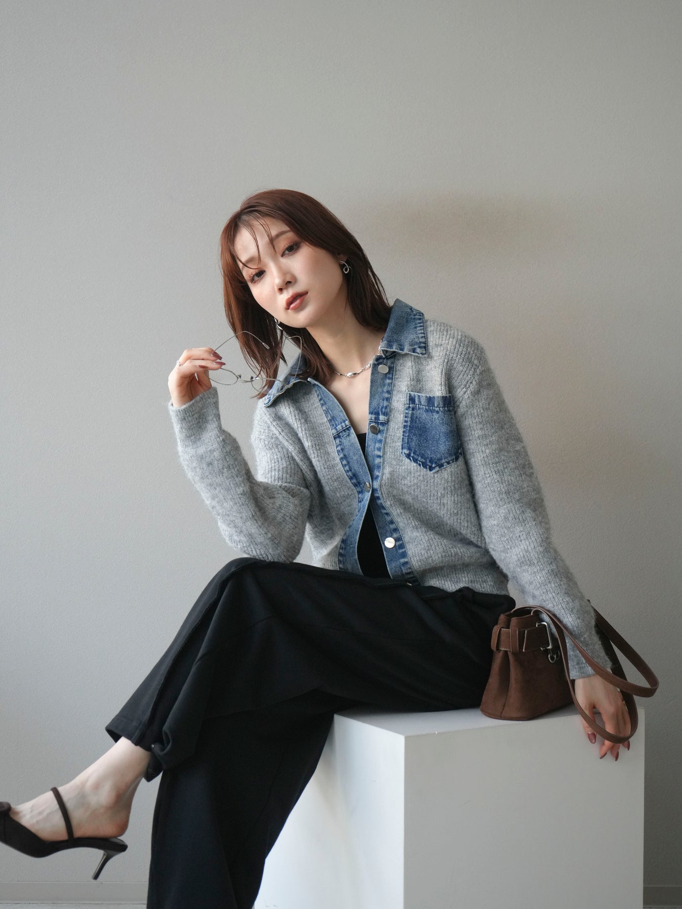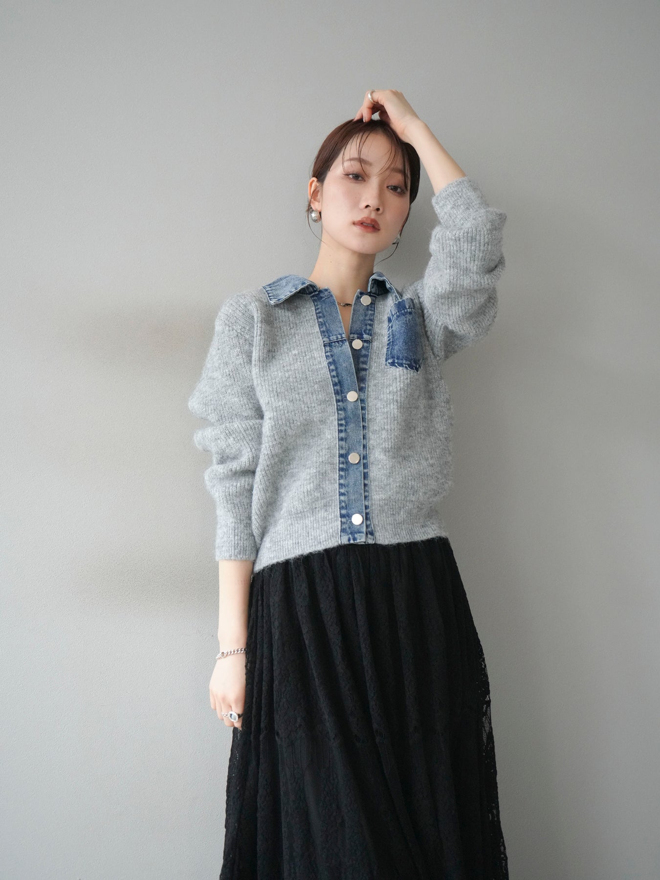 ふんわりとしたニットの優しい風合いに、デニム素材を組み合わせた異素材デザインカーディガン。 襟・前立て・ポケット部分に施されたデニムが、柔らかさの中に程よいカジュアルさをプラスします。 ゆとりのあるシルエットと長めの袖が抜け感を演出し、羽織るだけでスタイリングを今っぽく仕上げてくれる一枚。 シンプルなインナーやスカート・パンツなど、さまざまなボトムとも相性抜群で、デイリー使いにもおすすめです。 軽やかな着心地で、季節の変わり目にも活躍してくれる万能アイテムです。 ※ボトムス、キャミソール(インナー)以外の商品は一律でインナーは付属していません。