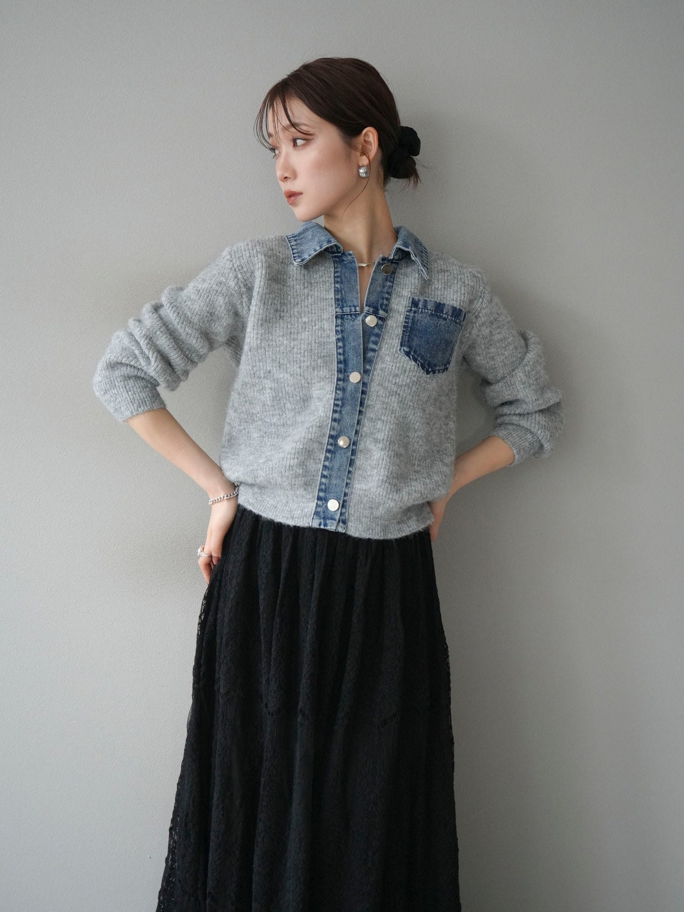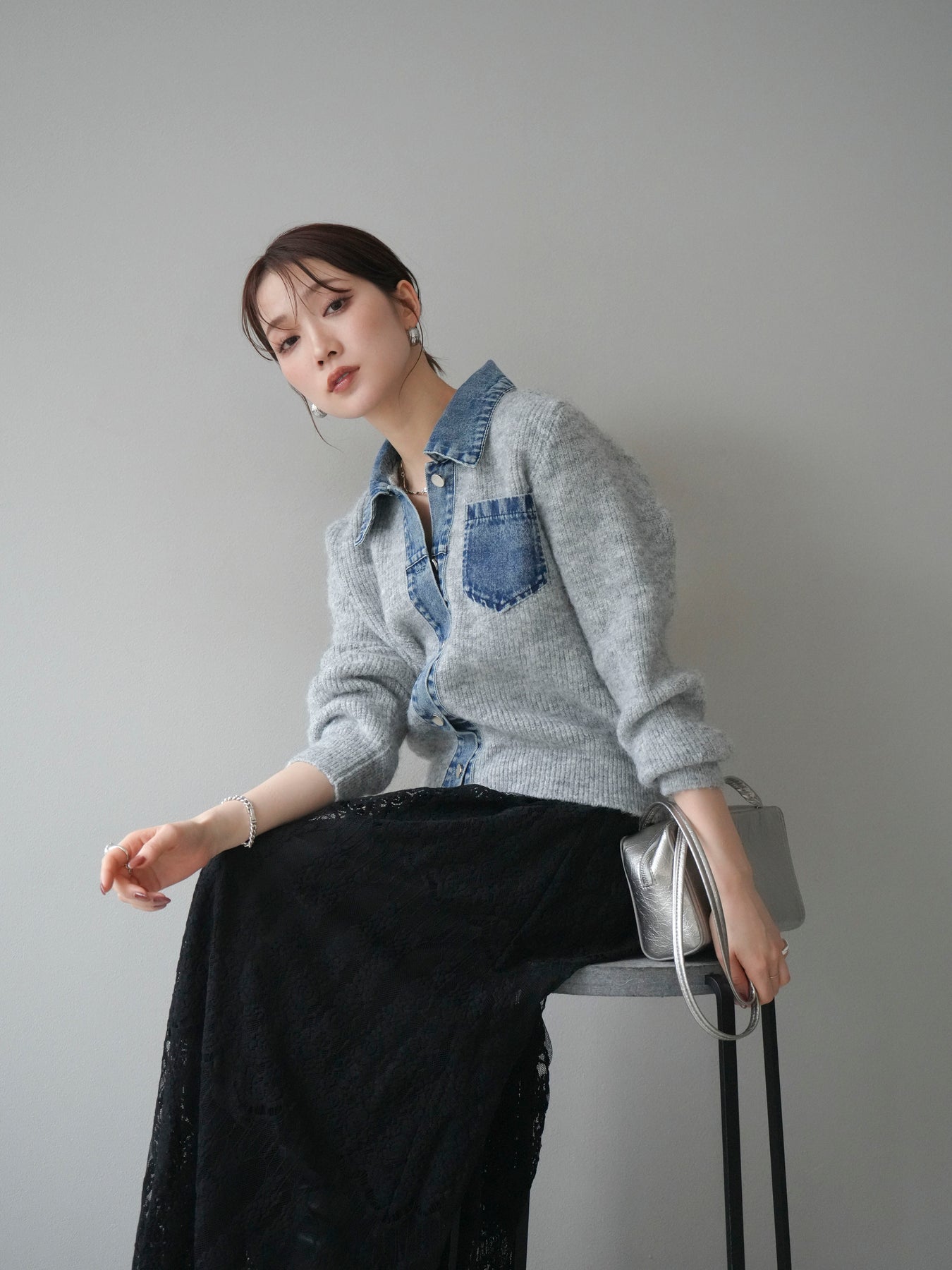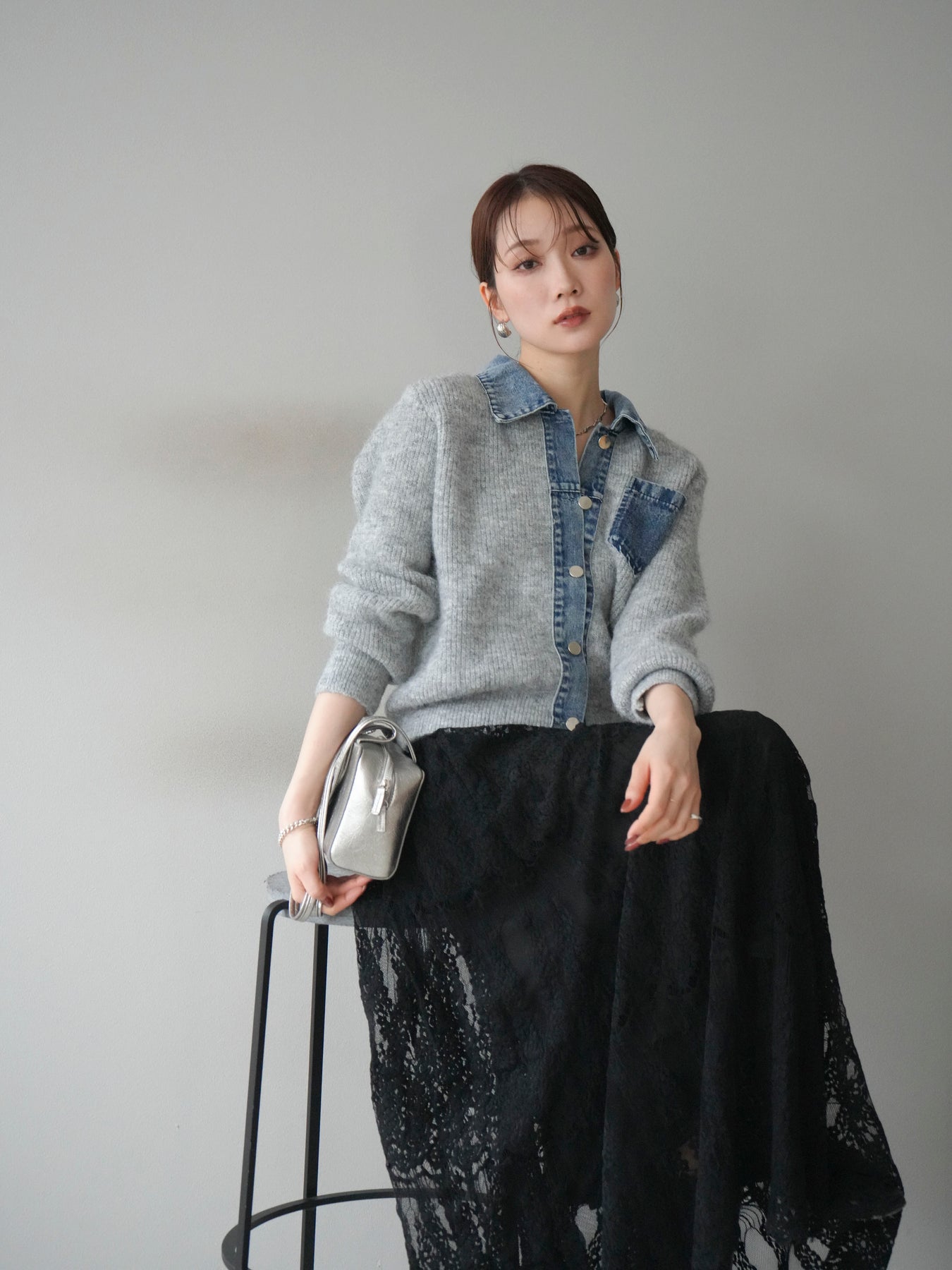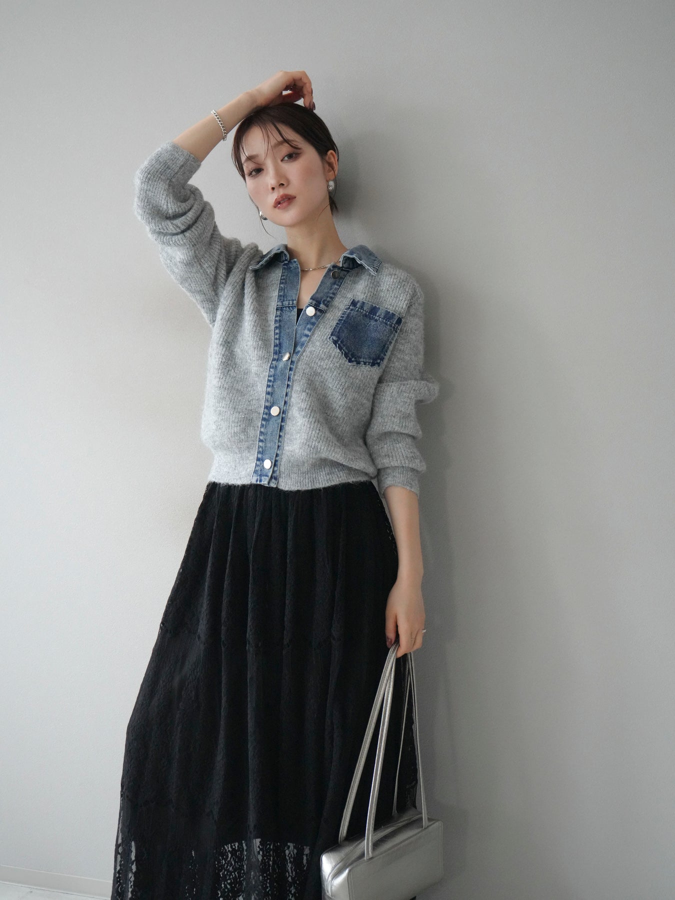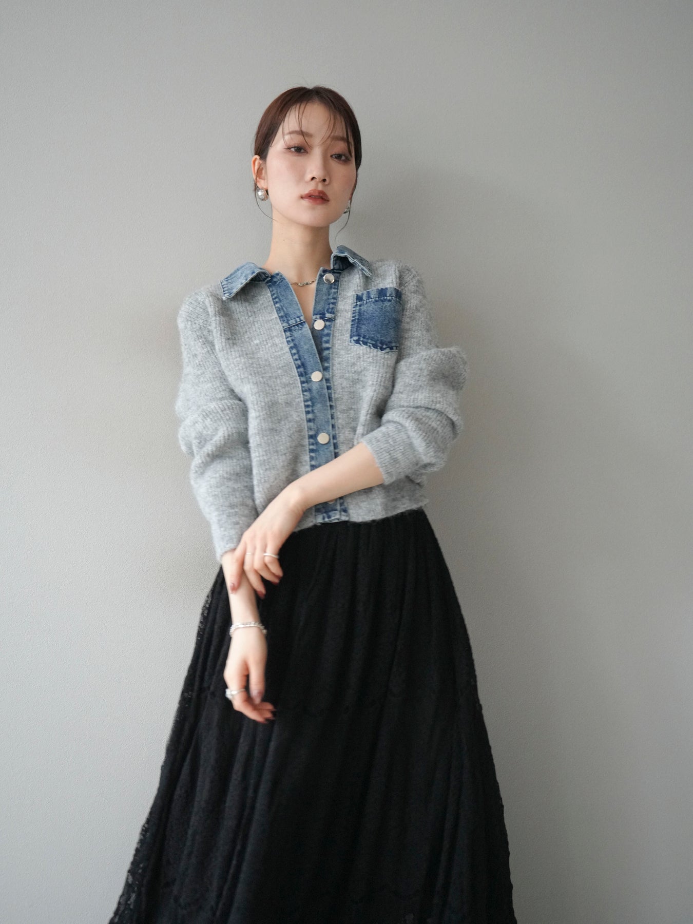 ふんわりとしたニットの優しい風合いに、デニム素材を組み合わせた異素材デザインカーディガン。 襟・前立て・ポケット部分に施されたデニムが、柔らかさの中に程よいカジュアルさをプラスします。 ゆとりのあるシルエットと長めの袖が抜け感を演出し、羽織るだけでスタイリングを今っぽく仕上げてくれる一枚。 シンプルなインナーやスカート・パンツなど、さまざまなボトムとも相性抜群で、デイリー使いにもおすすめです。 軽やかな着心地で、季節の変わり目にも活躍してくれる万能アイテムです。 ※ボトムス、キャミソール(インナー)以外の商品は一律でインナーは付属していません。