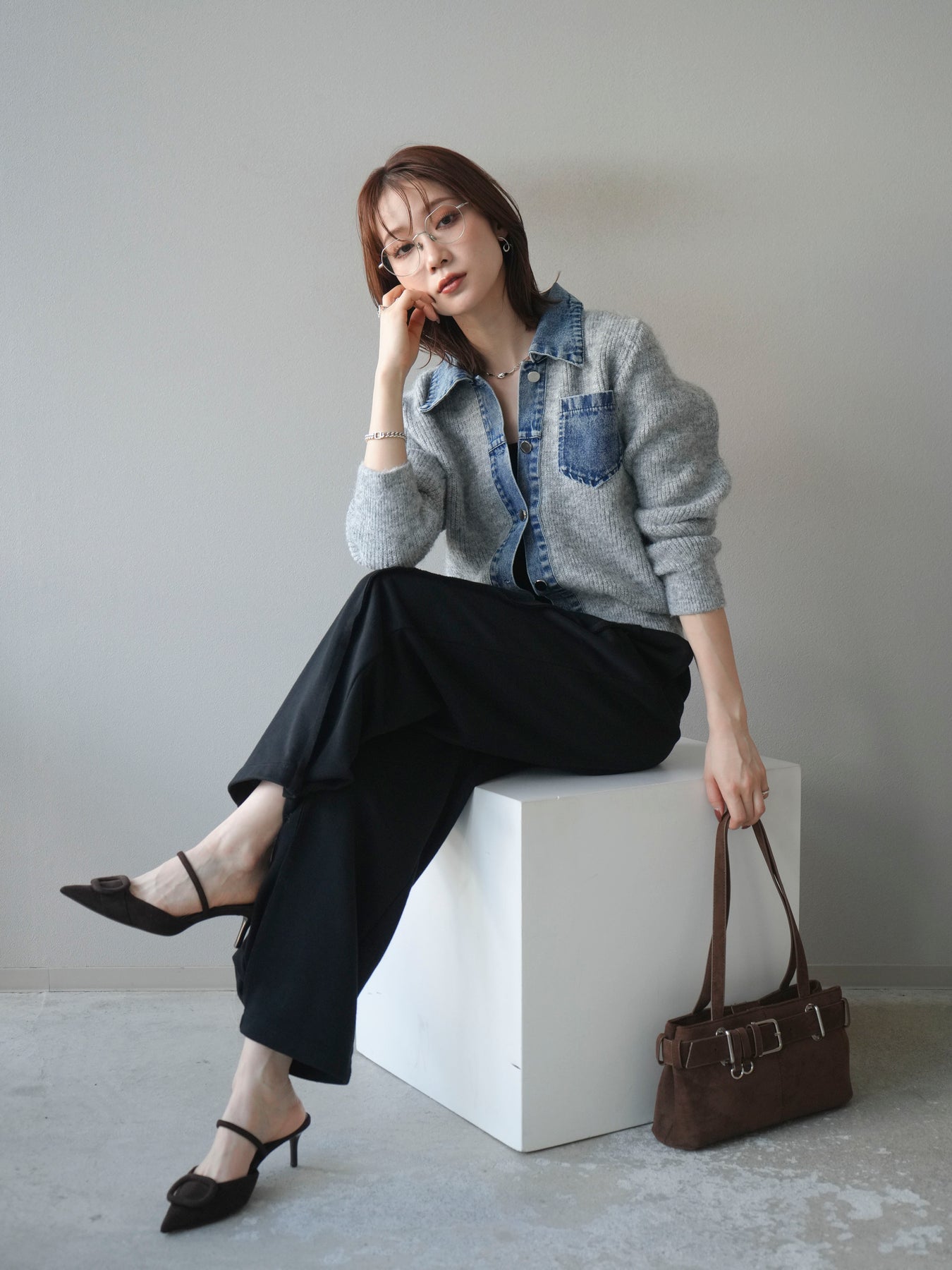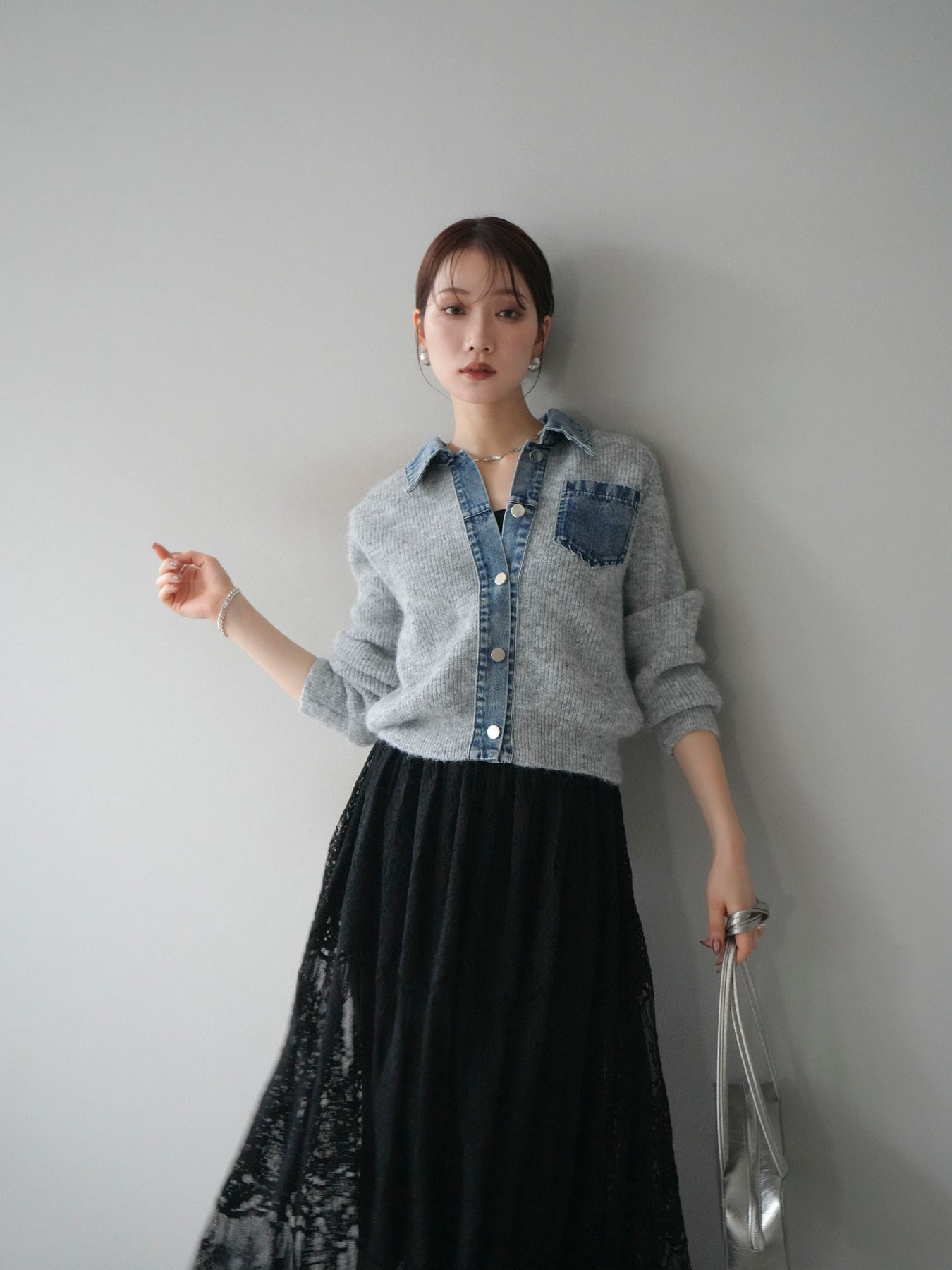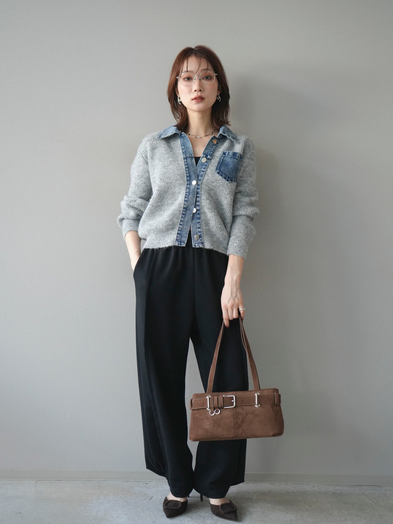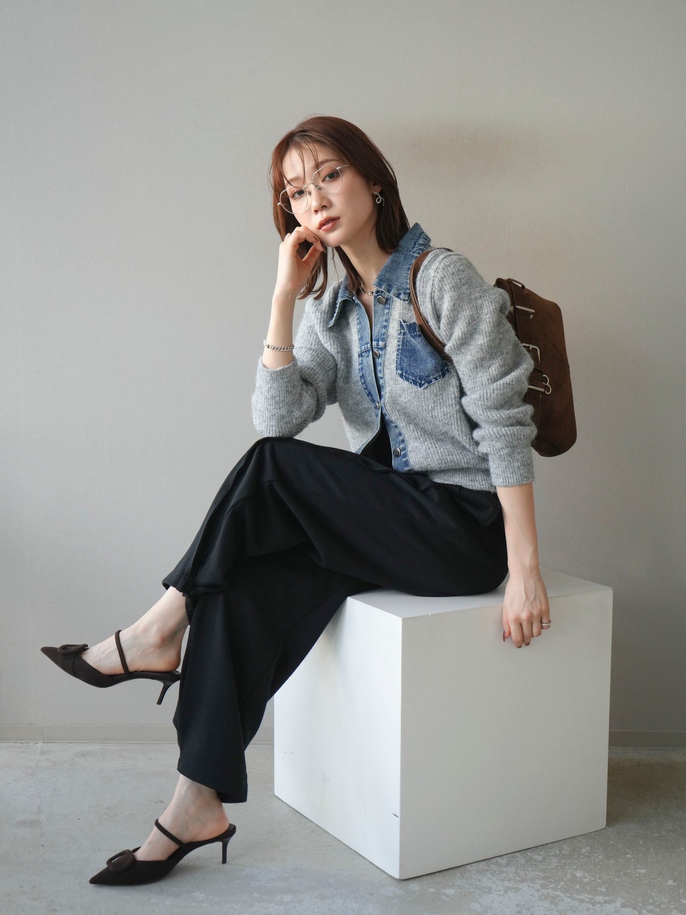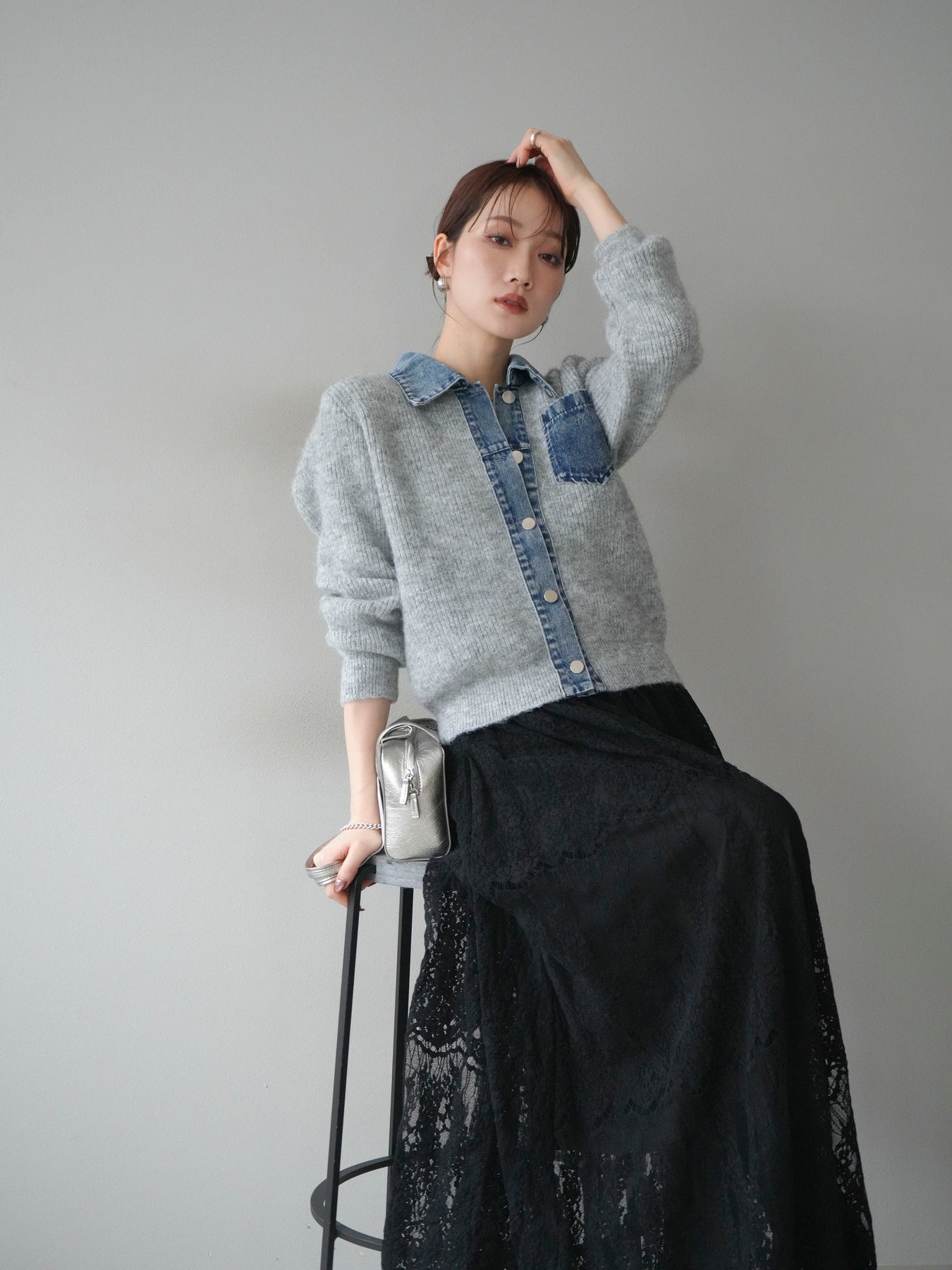 ふんわりとしたニットの優しい風合いに、デニム素材を組み合わせた異素材デザインカーディガン。 襟・前立て・ポケット部分に施されたデニムが、柔らかさの中に程よいカジュアルさをプラスします。 ゆとりのあるシルエットと長めの袖が抜け感を演出し、羽織るだけでスタイリングを今っぽく仕上げてくれる一枚。 シンプルなインナーやスカート・パンツなど、さまざまなボトムとも相性抜群で、デイリー使いにもおすすめです。 軽やかな着心地で、季節の変わり目にも活躍してくれる万能アイテムです。 ※ボトムス、キャミソール(インナー)以外の商品は一律でインナーは付属していません。