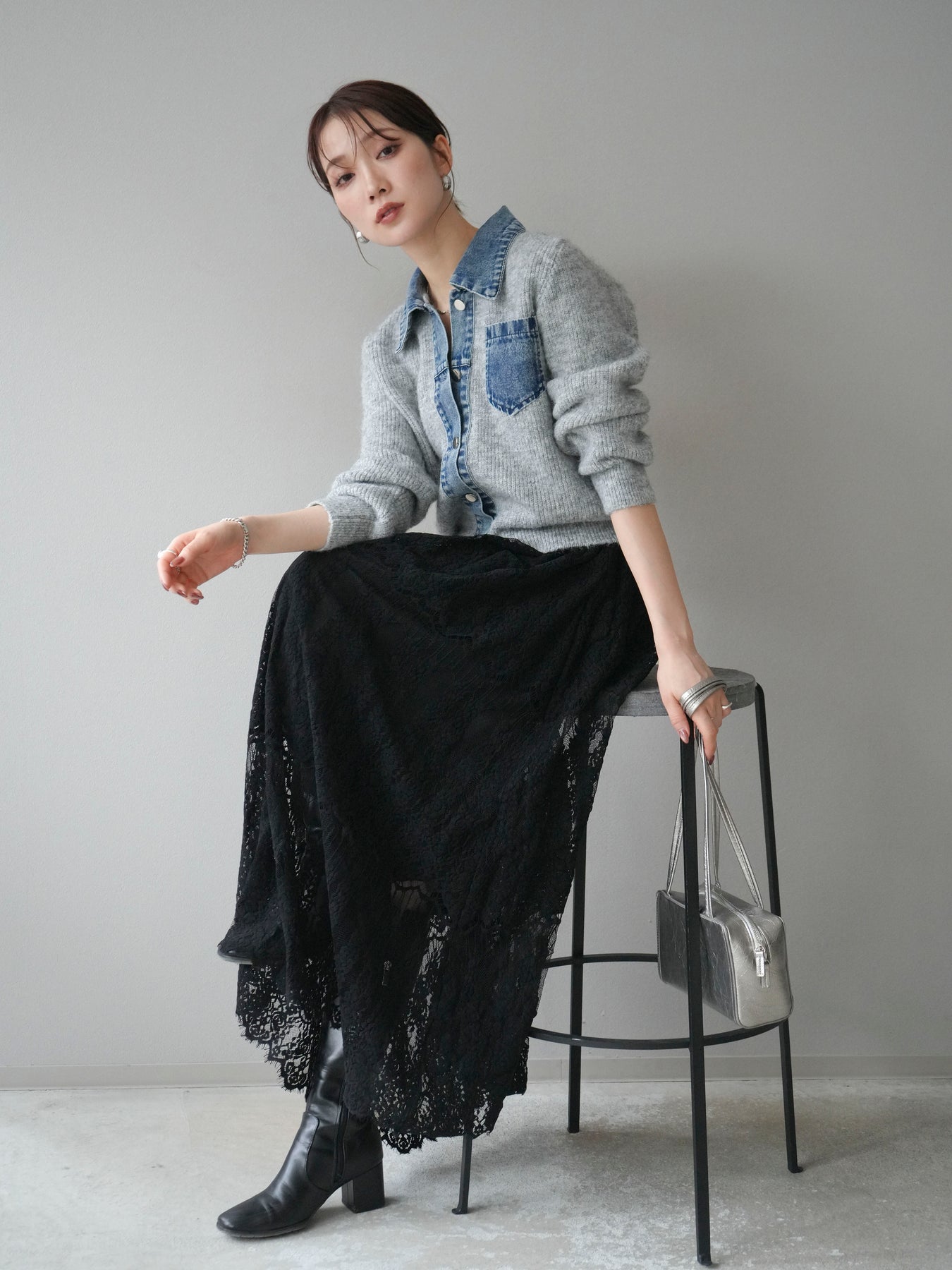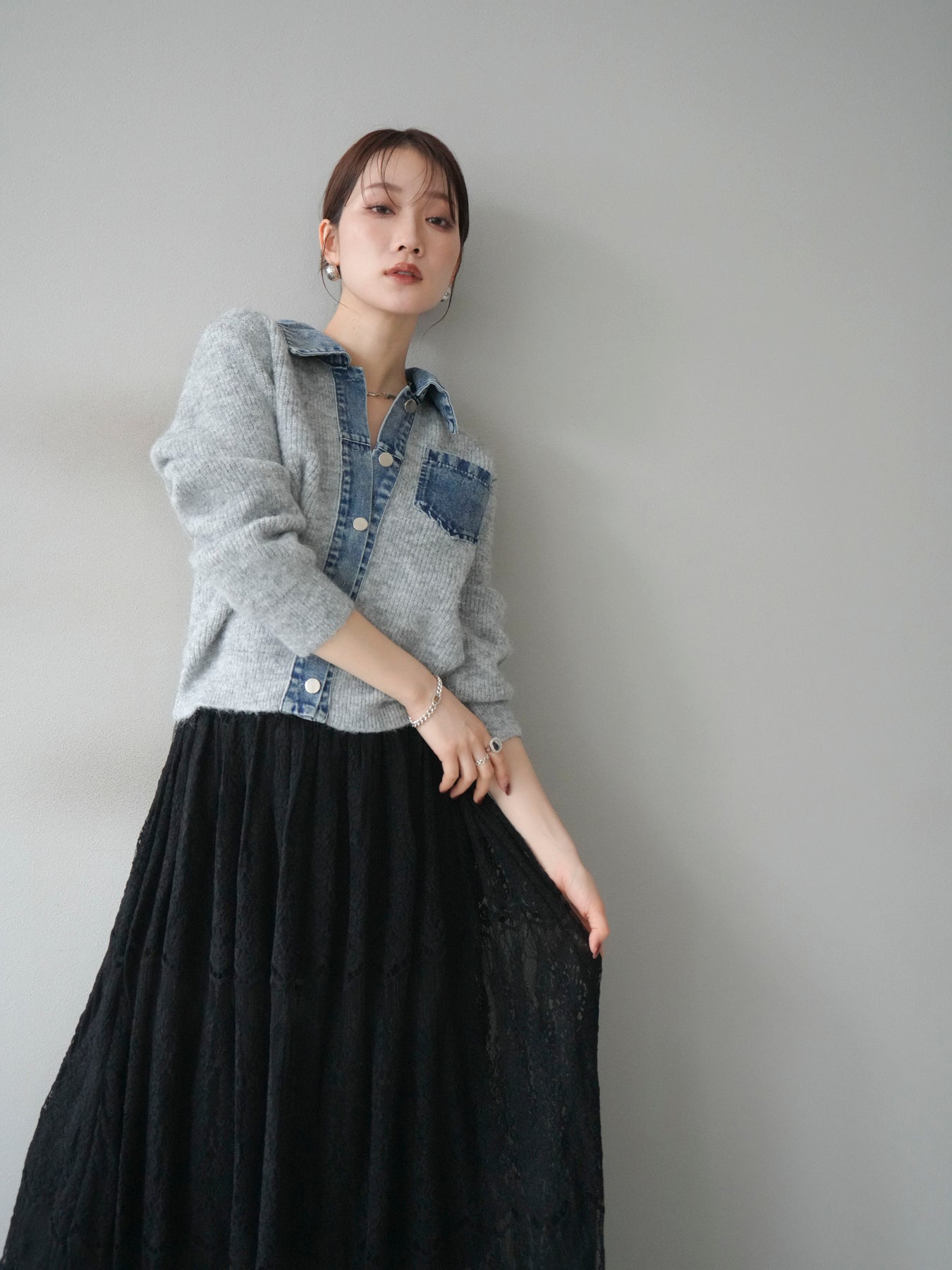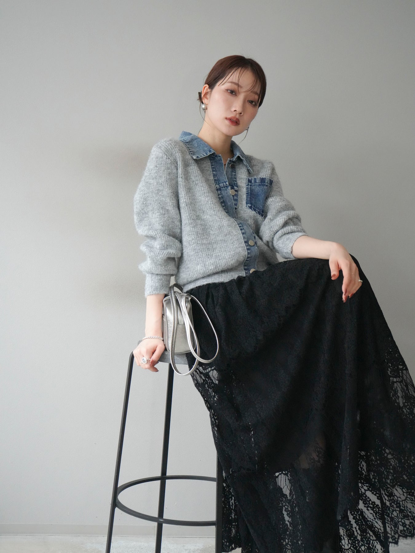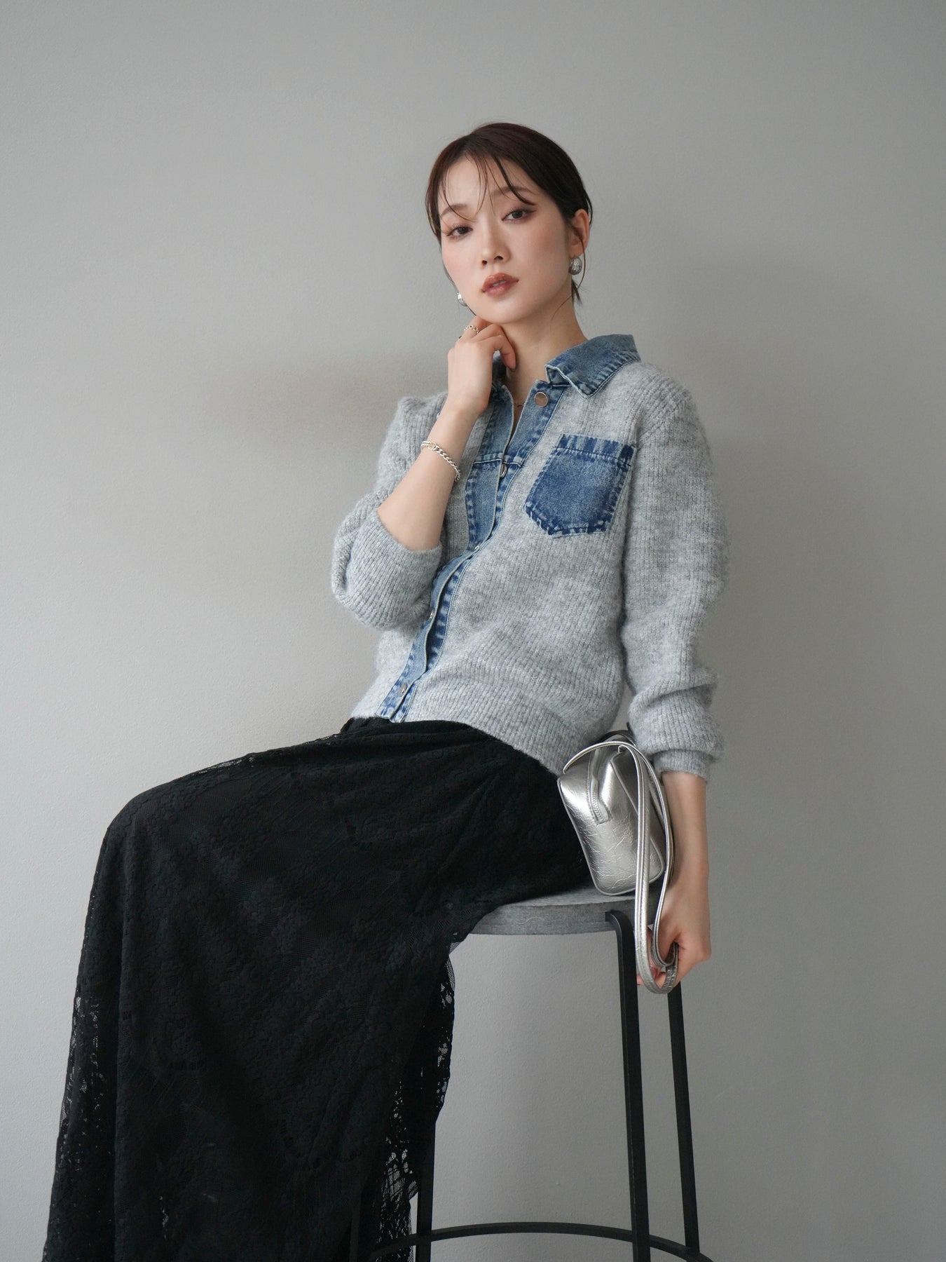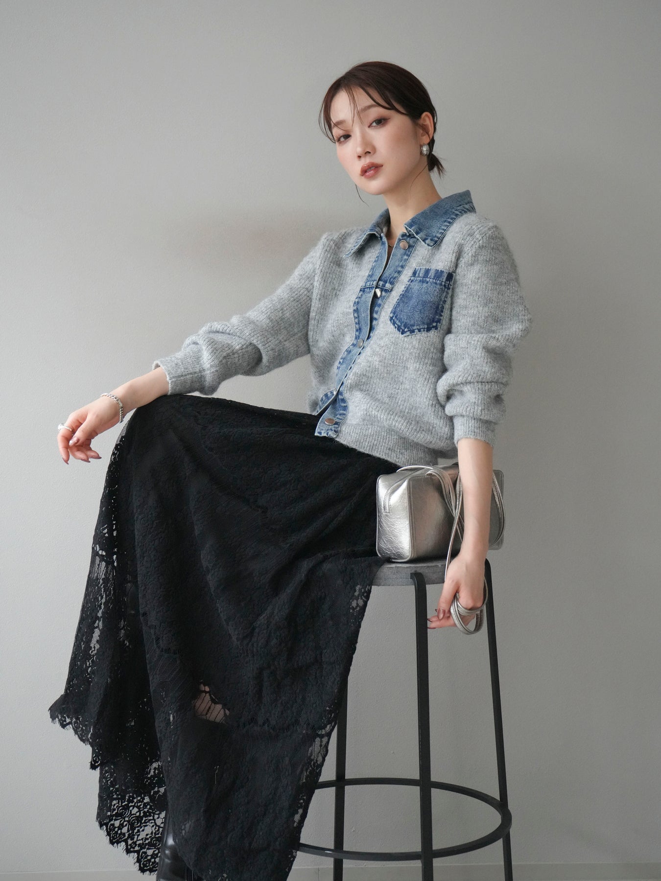 ふんわりとしたニットの優しい風合いに、デニム素材を組み合わせた異素材デザインカーディガン。 襟・前立て・ポケット部分に施されたデニムが、柔らかさの中に程よいカジュアルさをプラスします。 ゆとりのあるシルエットと長めの袖が抜け感を演出し、羽織るだけでスタイリングを今っぽく仕上げてくれる一枚。 シンプルなインナーやスカート・パンツなど、さまざまなボトムとも相性抜群で、デイリー使いにもおすすめです。 軽やかな着心地で、季節の変わり目にも活躍してくれる万能アイテムです。 ※ボトムス、キャミソール(インナー)以外の商品は一律でインナーは付属していません。