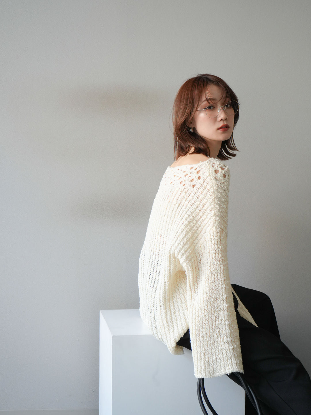 [予約]ボートネック透かし編みニットプルオーバー/white