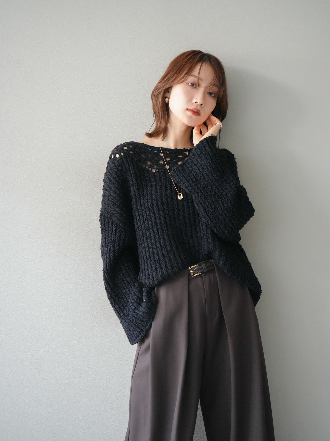 [予約]ボートネック透かし編みニットプルオーバー/navy