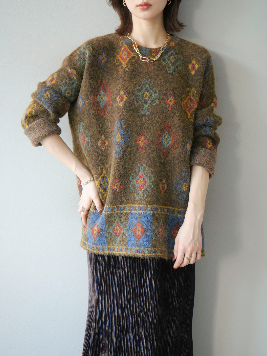 [予約]ヴィンテージ柄オーバーニットプルオーバー/ブラウン