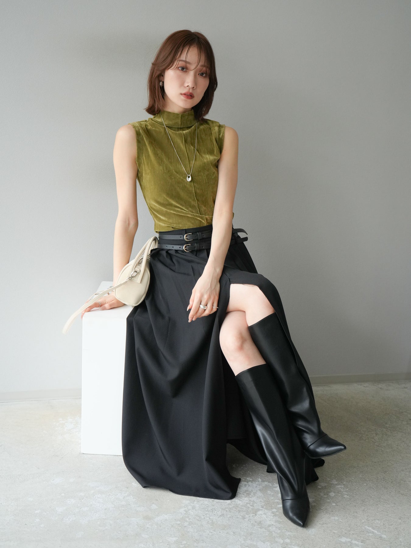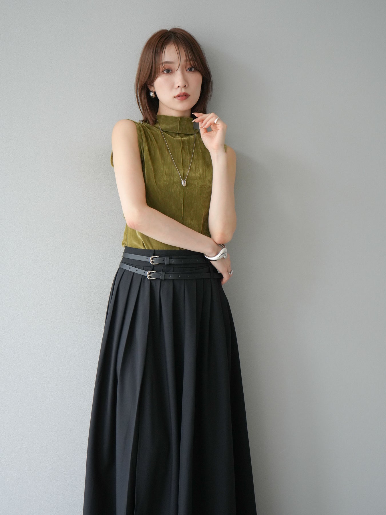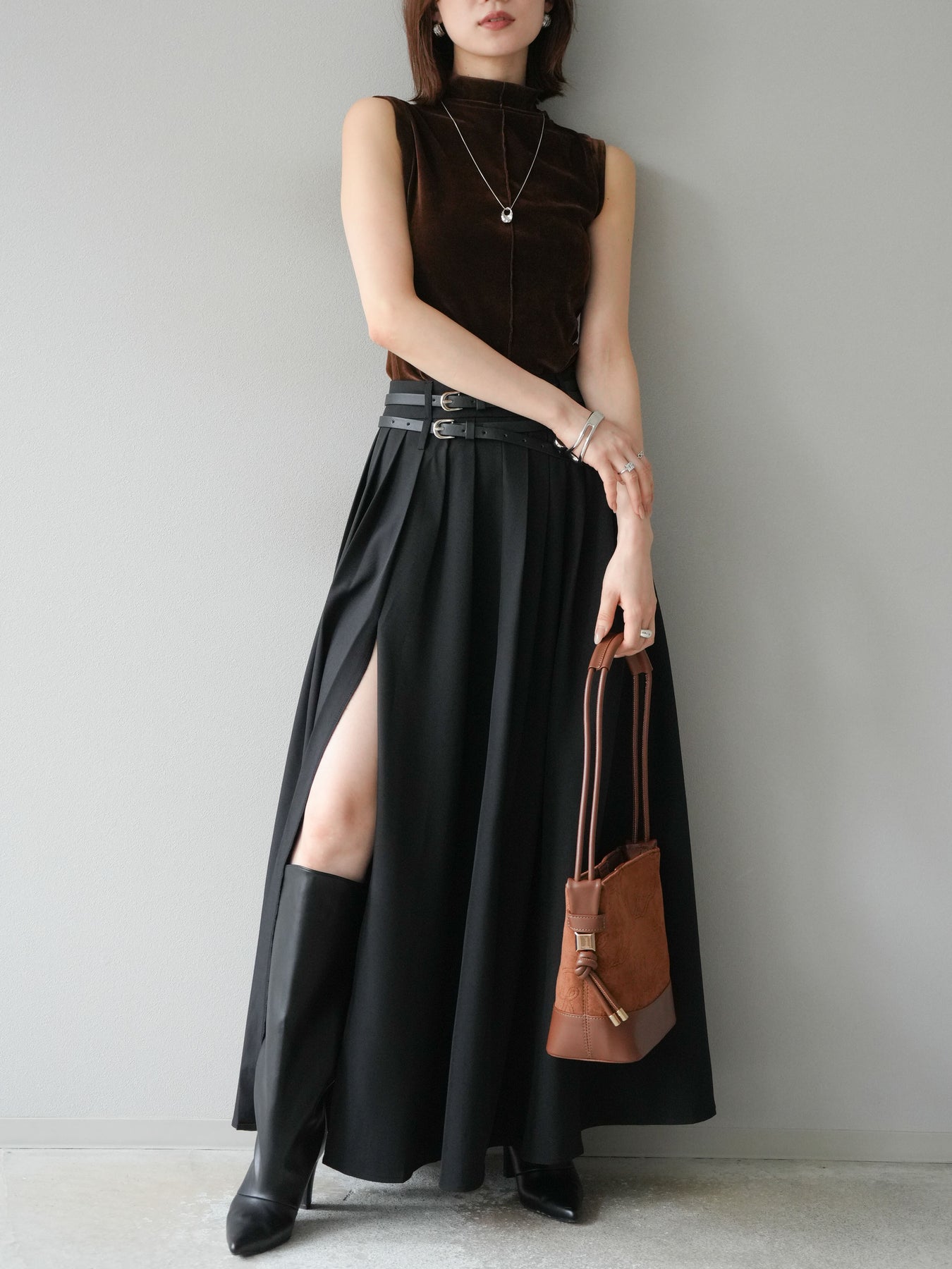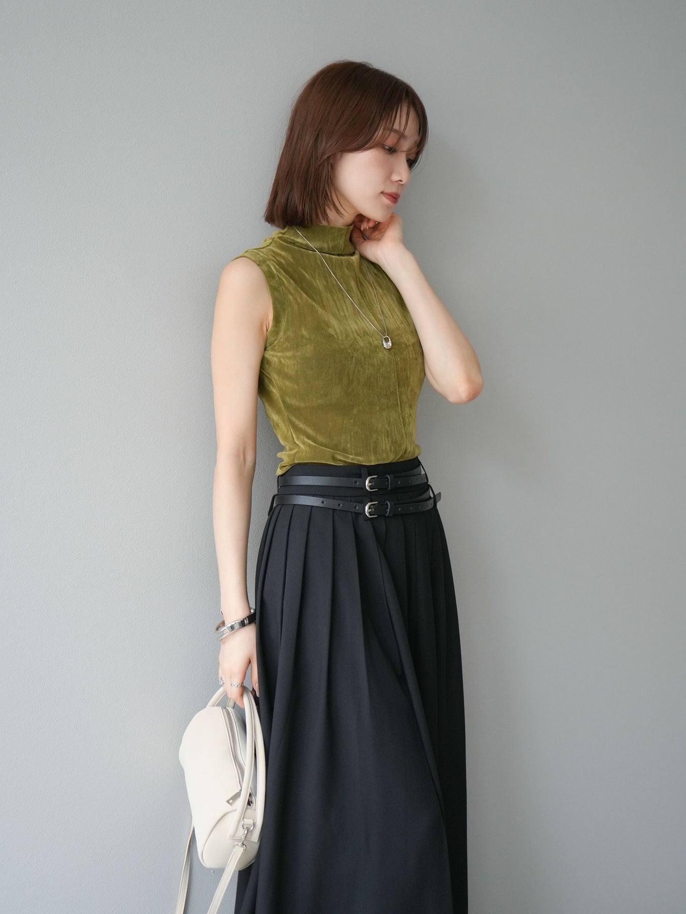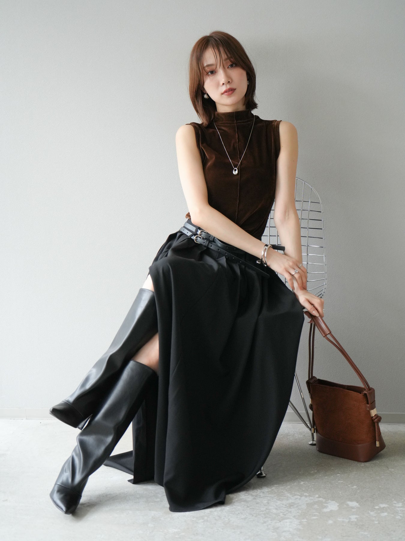 [SET]シアーベロアプチネックノースリーブトップス+エステルプリーツスリットスカート(2set)