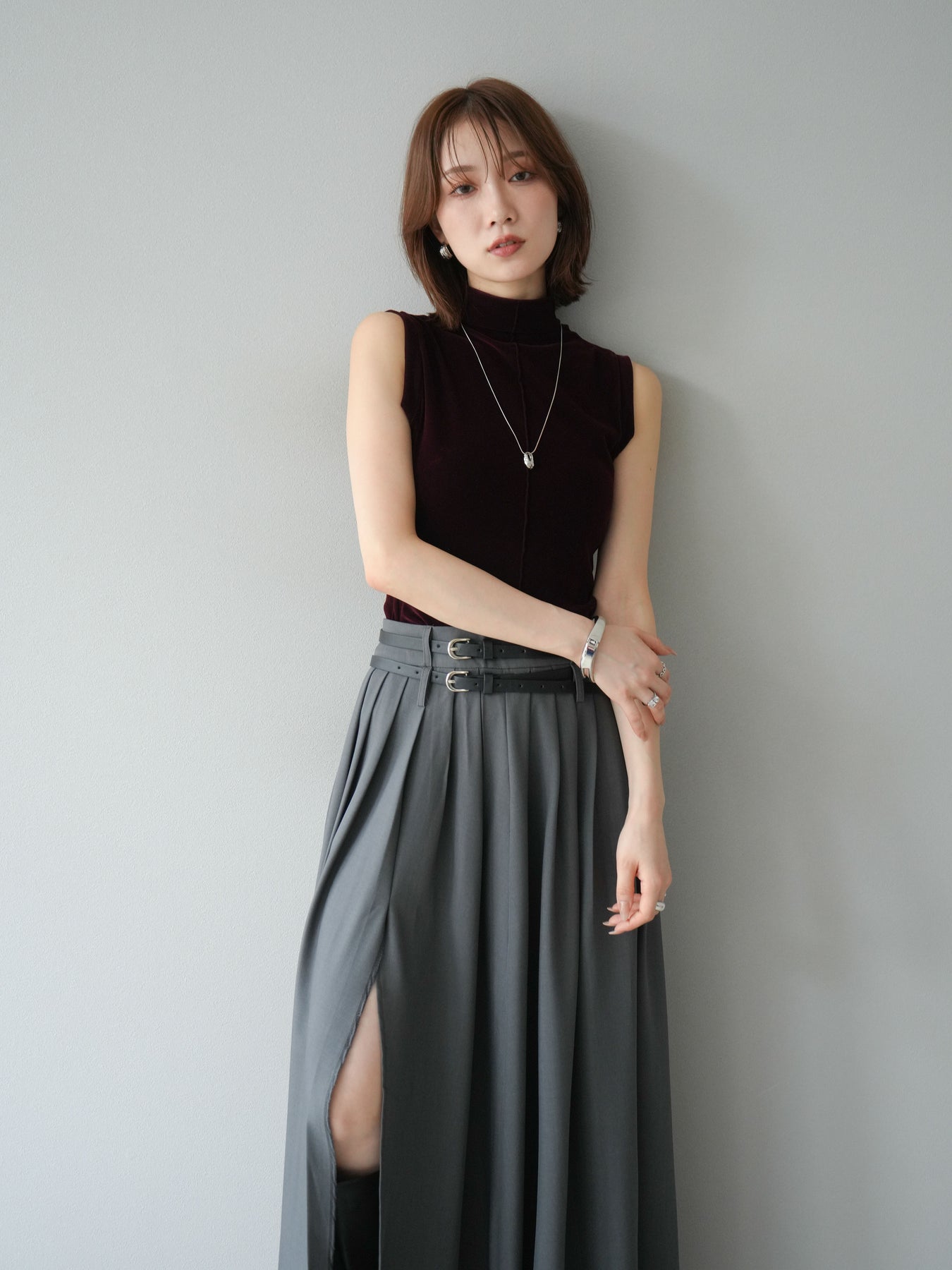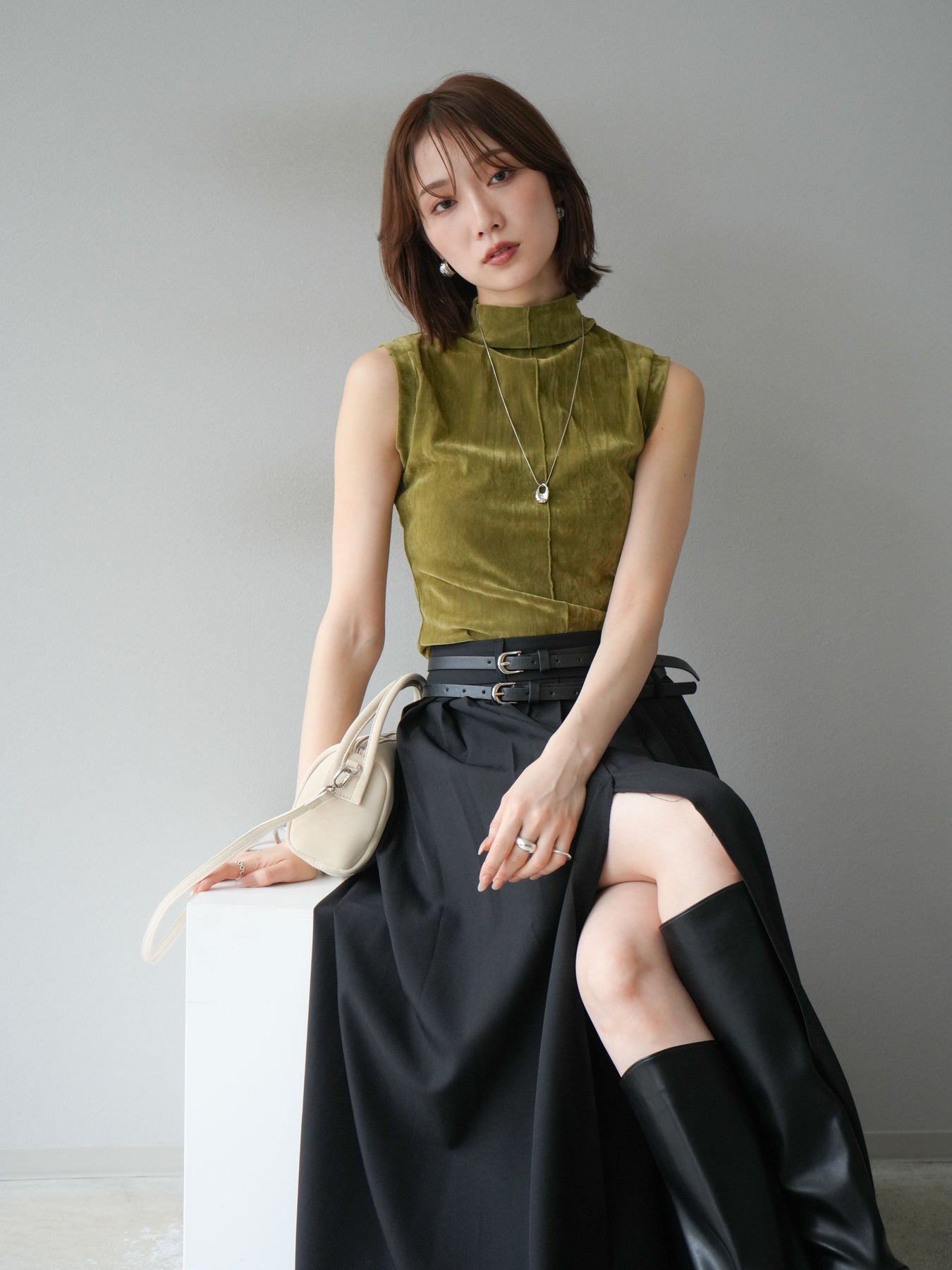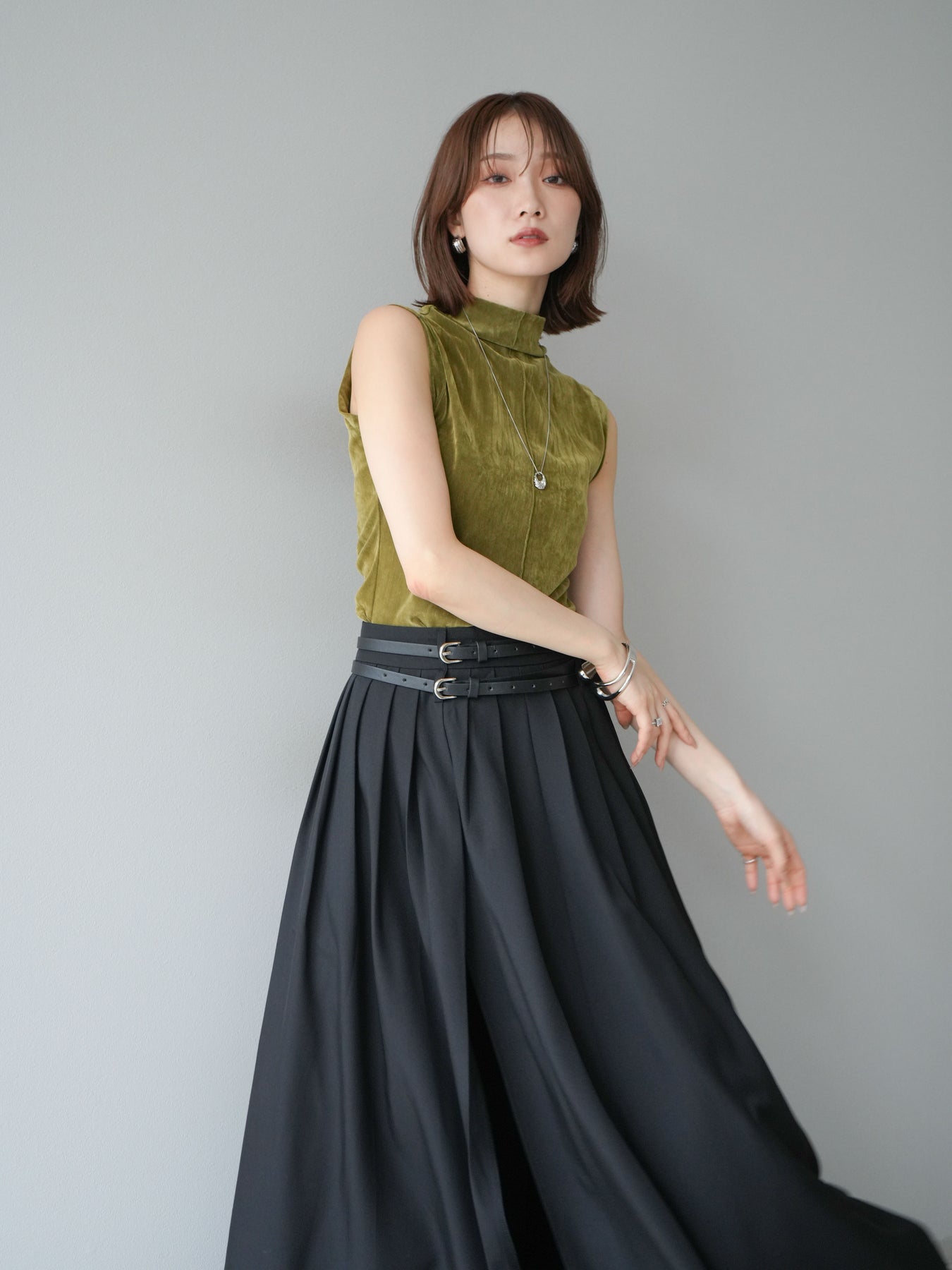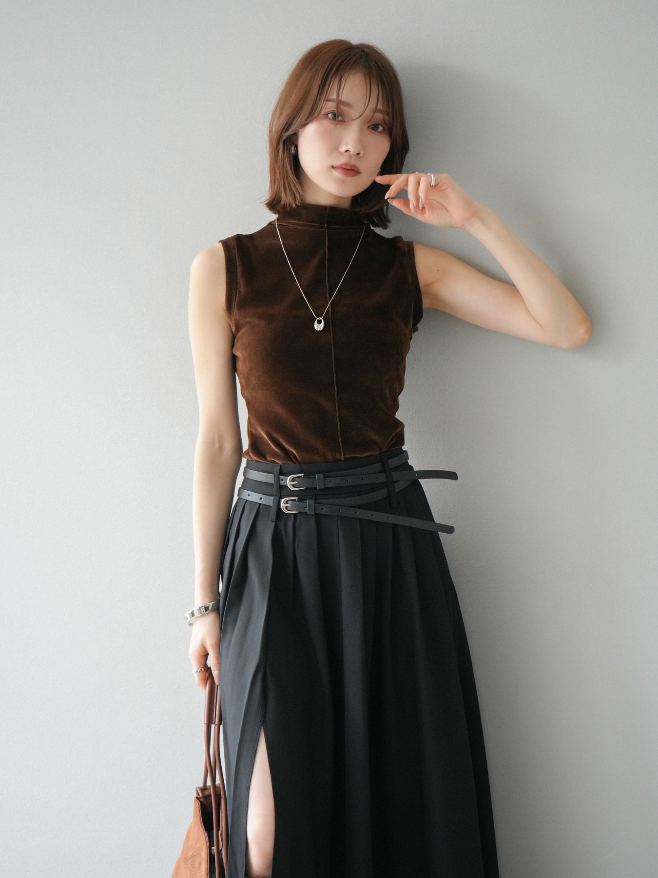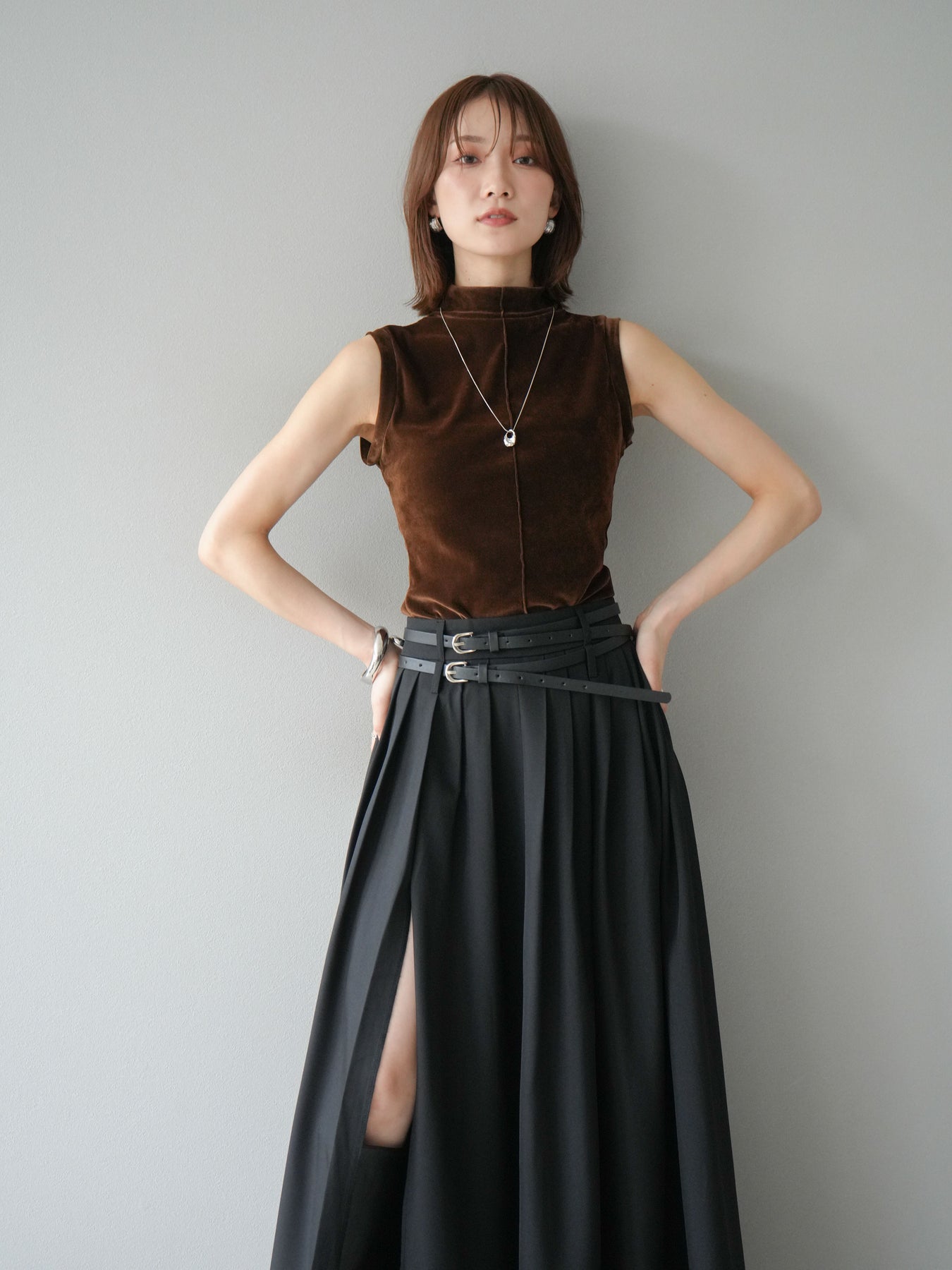 [SET]シアーベロアプチネックノースリーブトップス+エステルプリーツスリットスカート(2set)