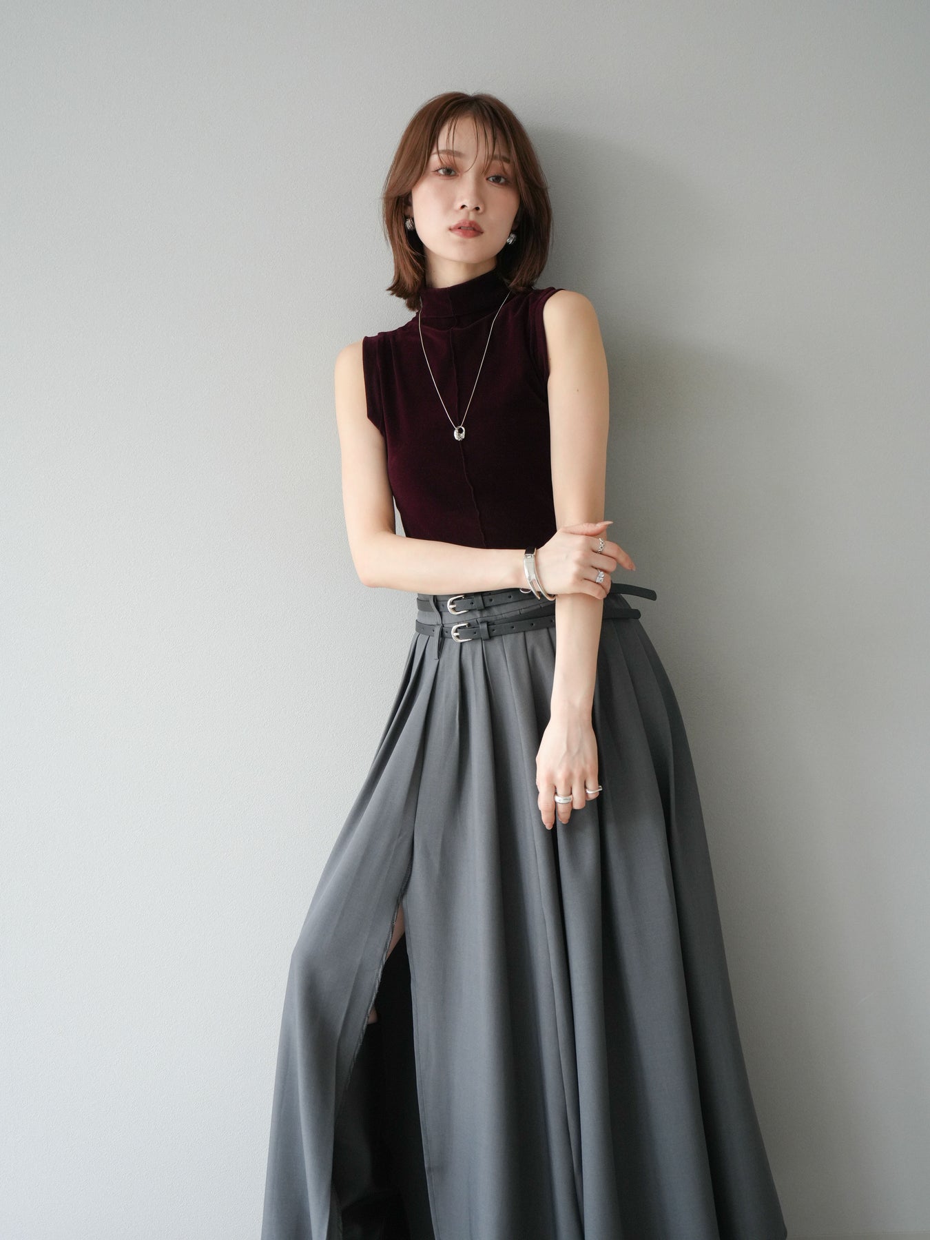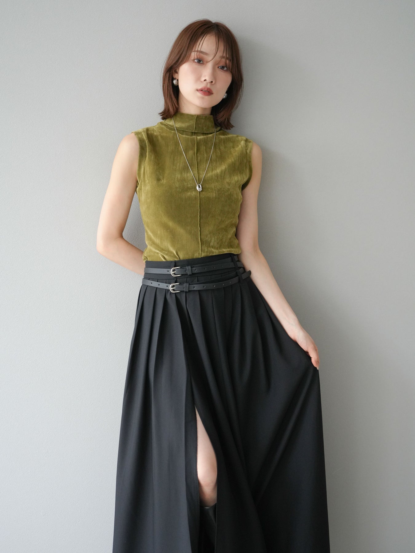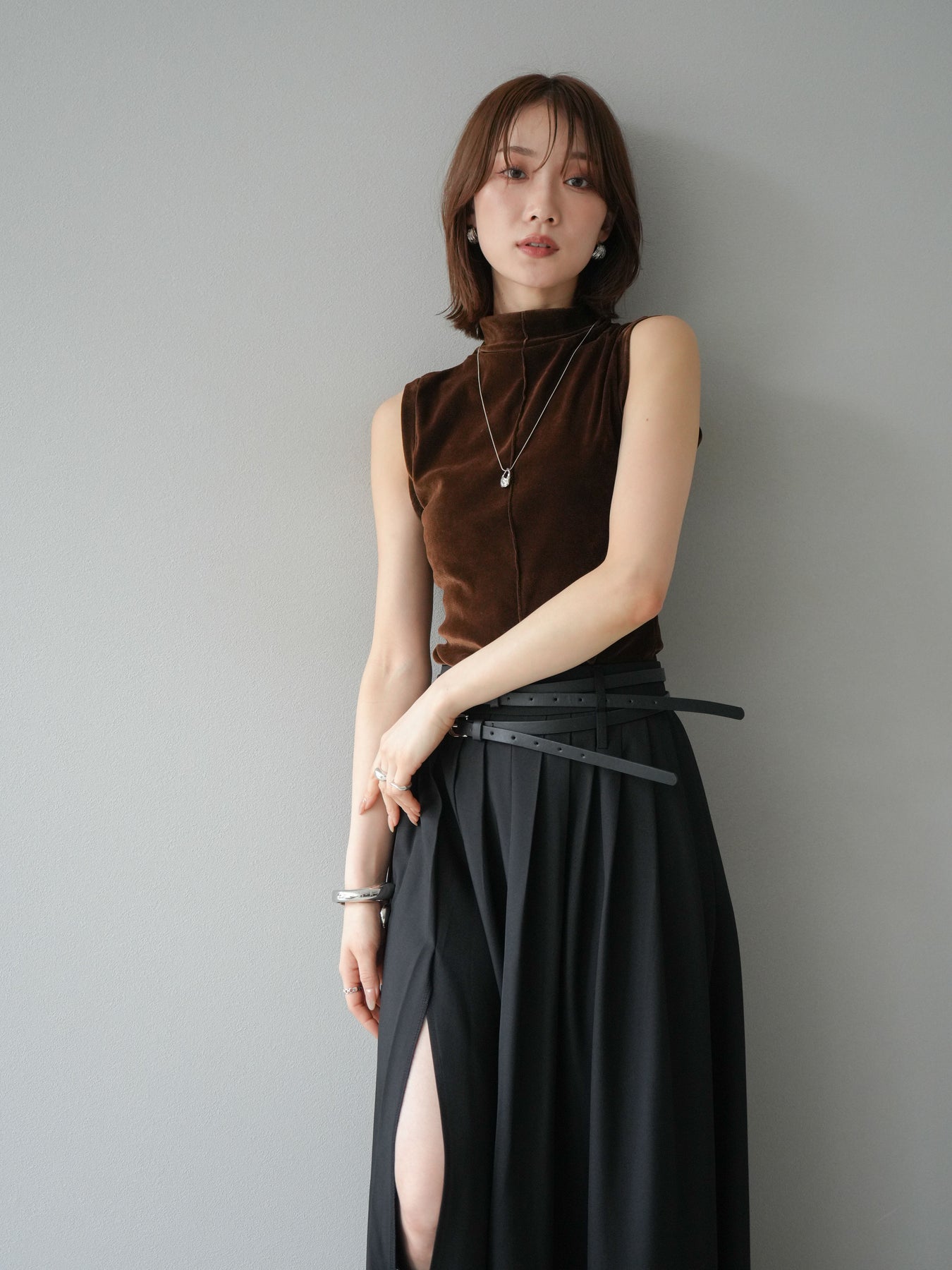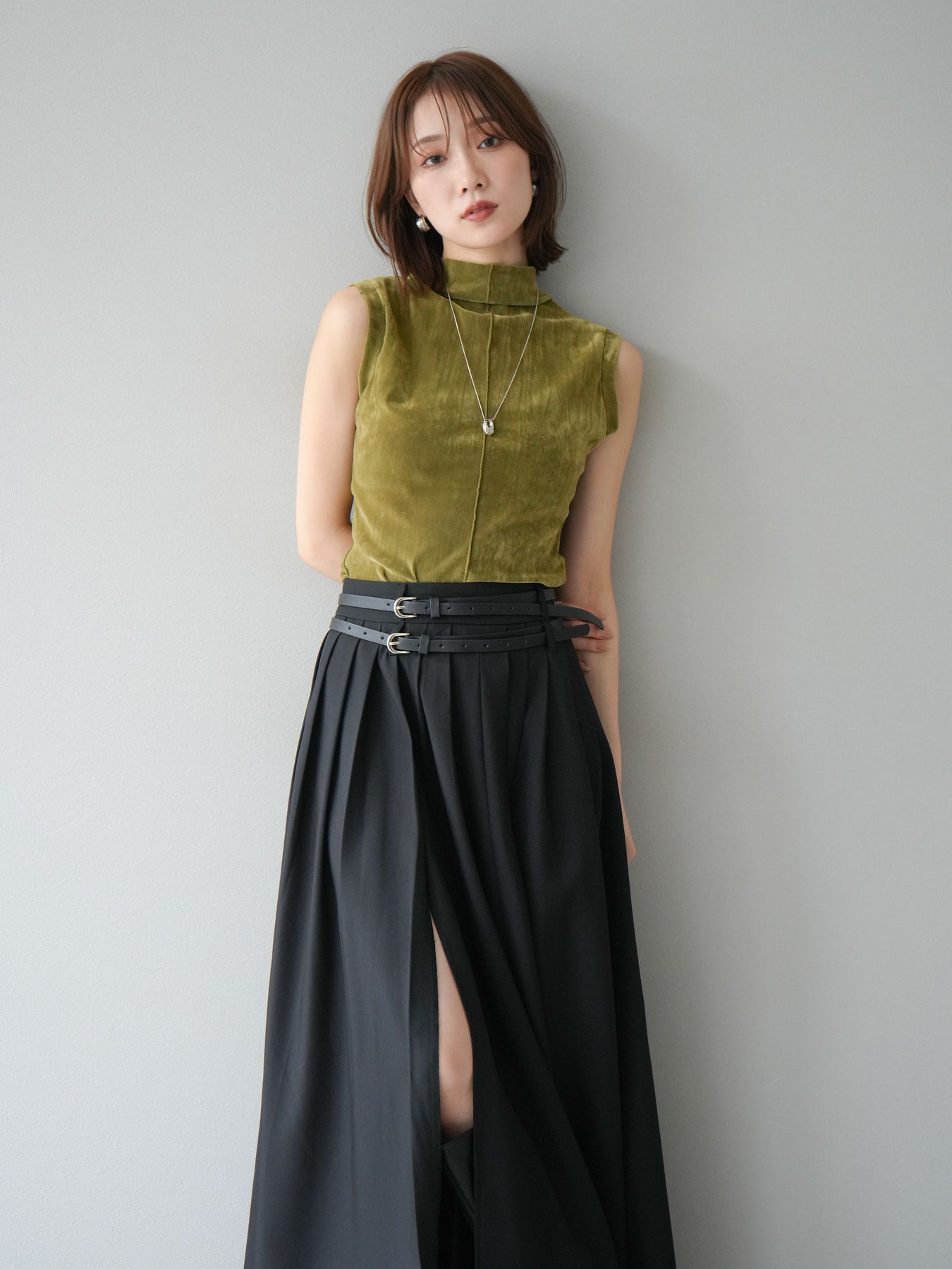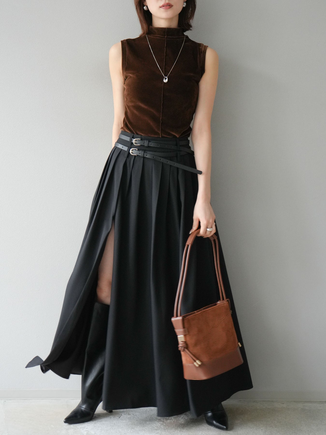[SET]シアーベロアプチネックノースリーブトップス+エステルプリーツスリットスカート(2set)