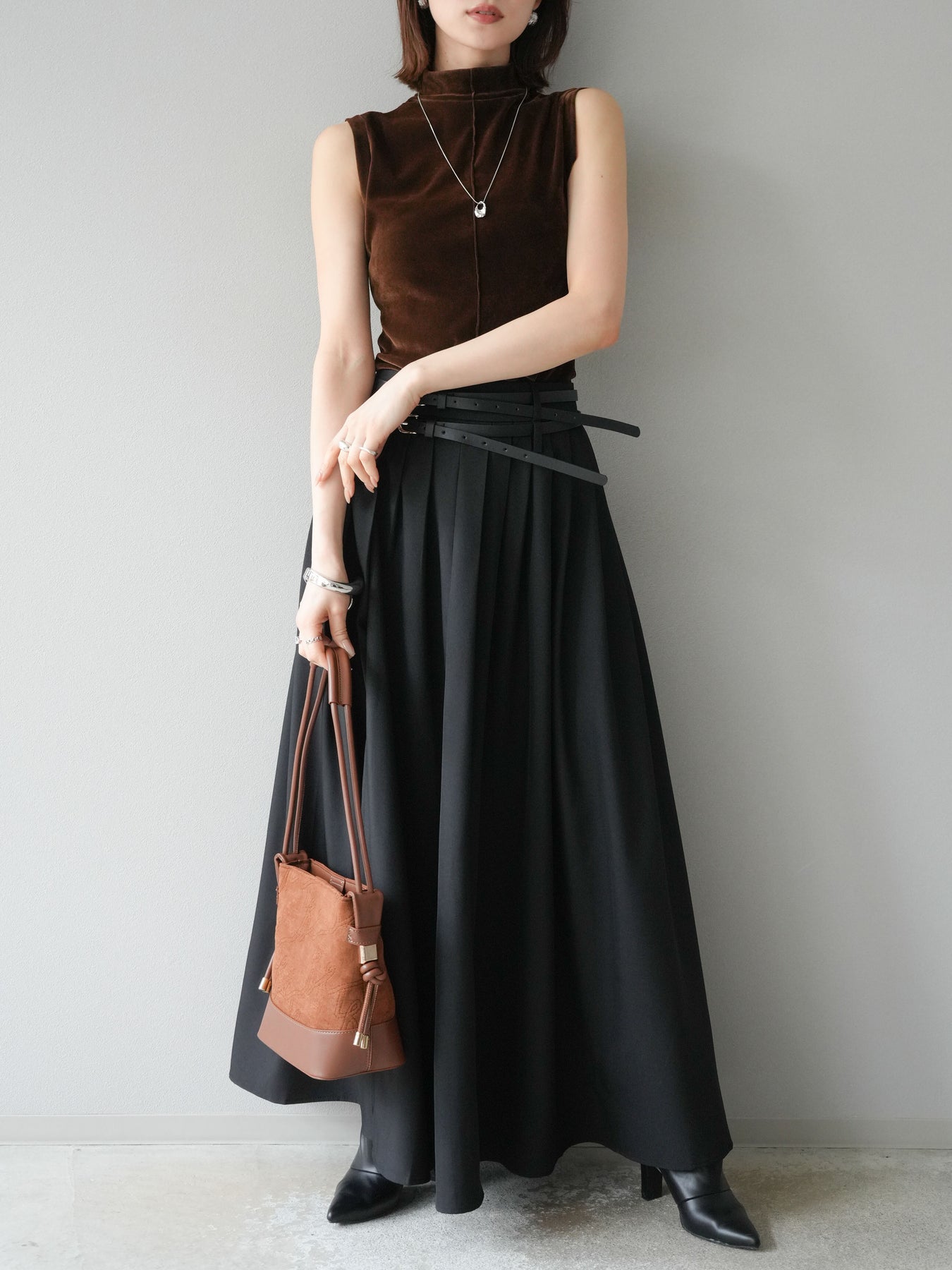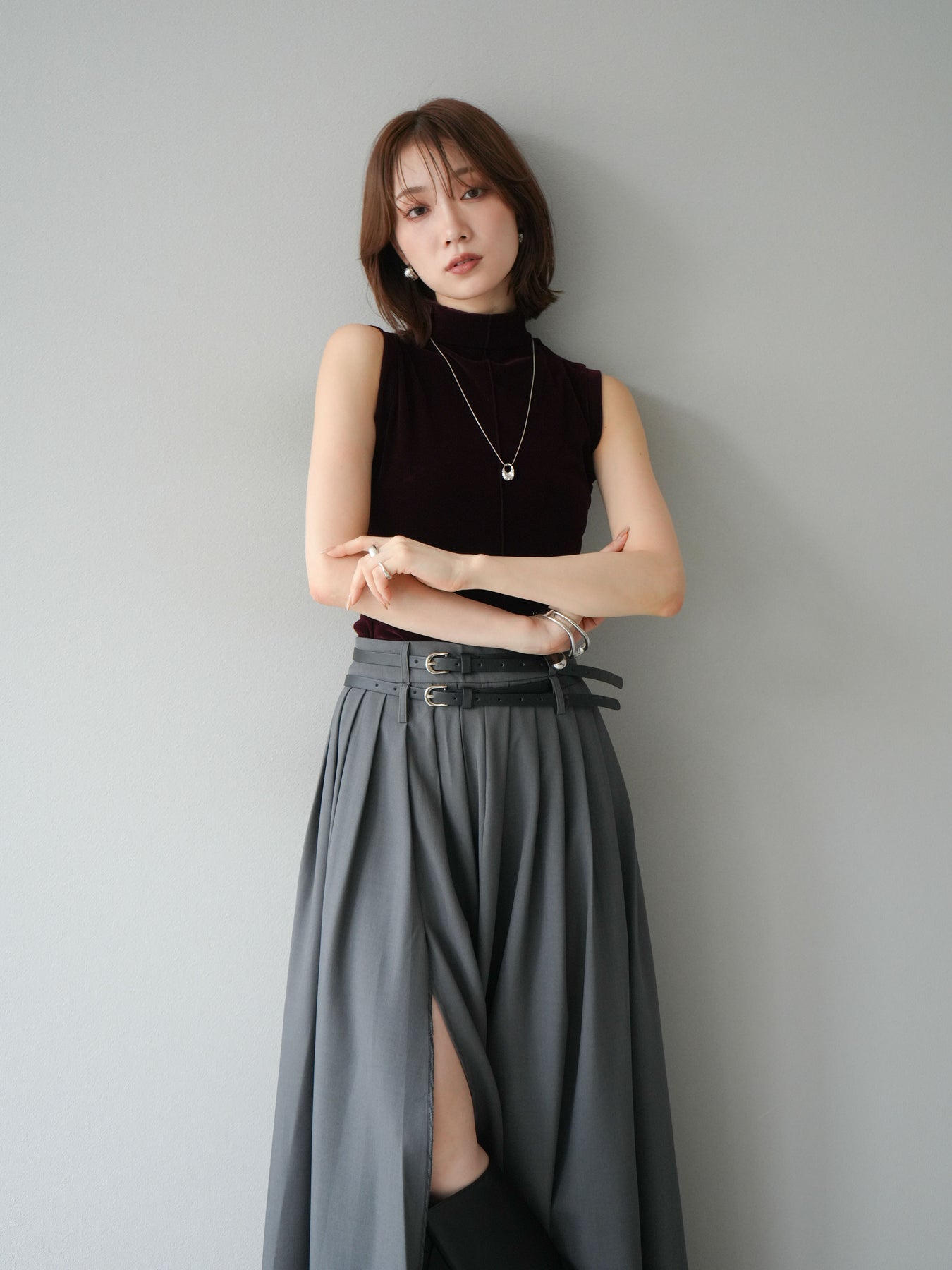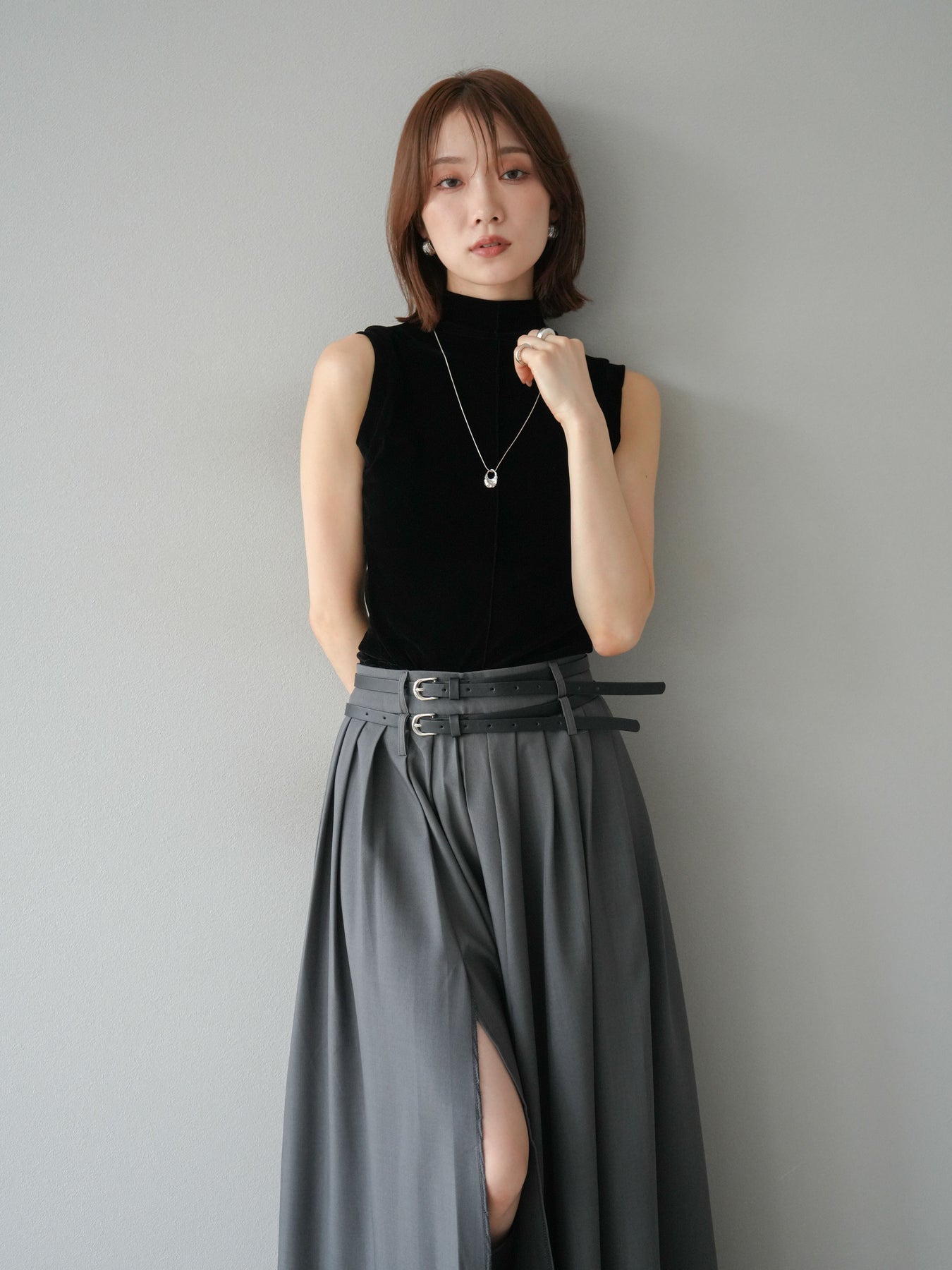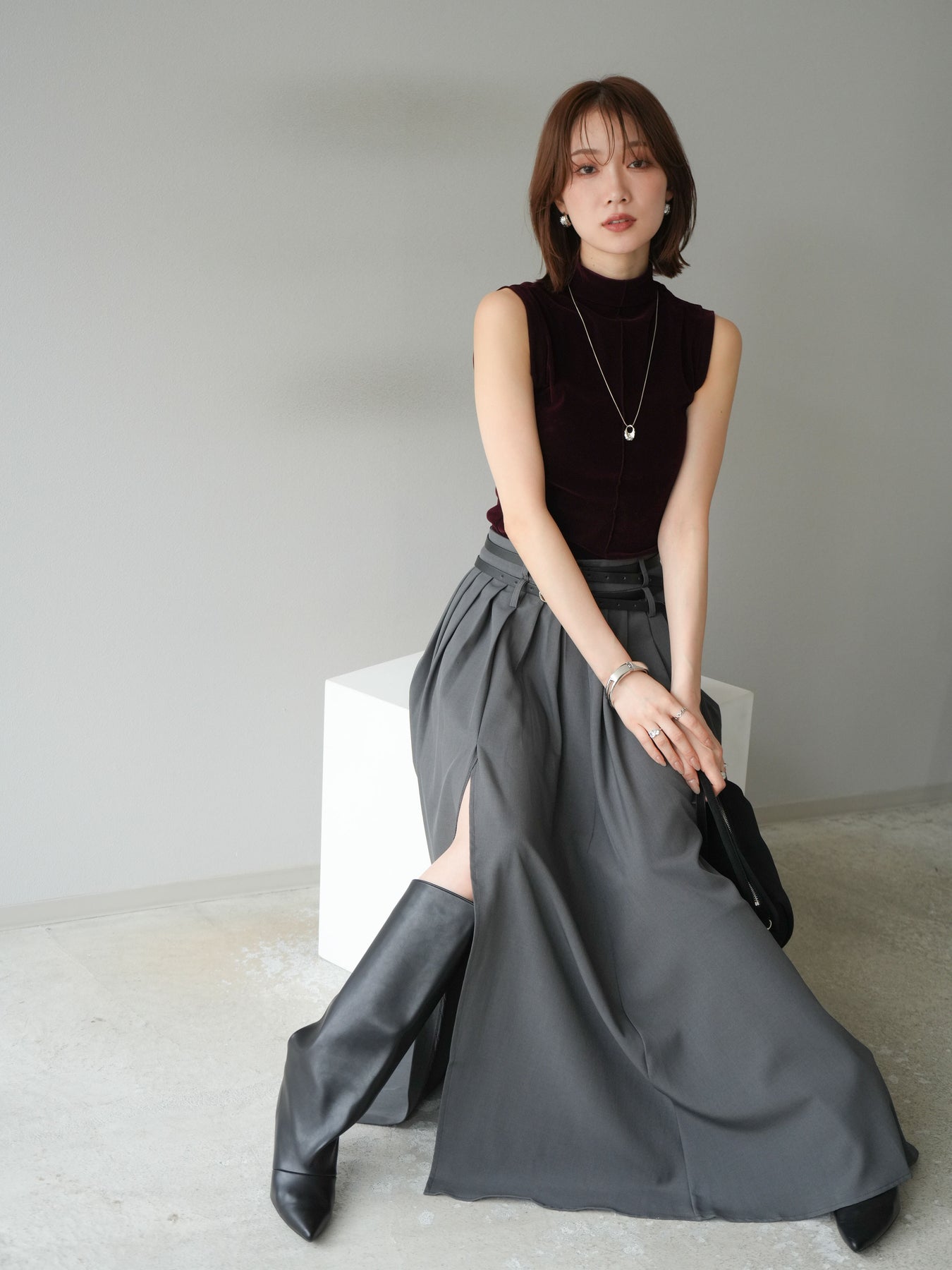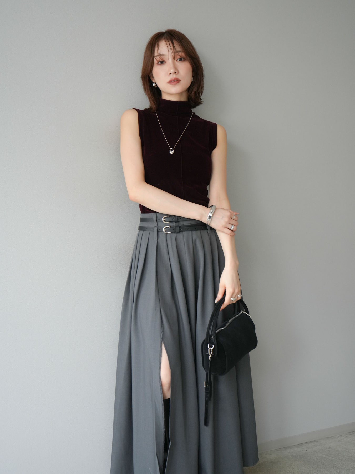 [SET]シアーベロアプチネックノースリーブトップス+エステルプリーツスリットスカート(2set)