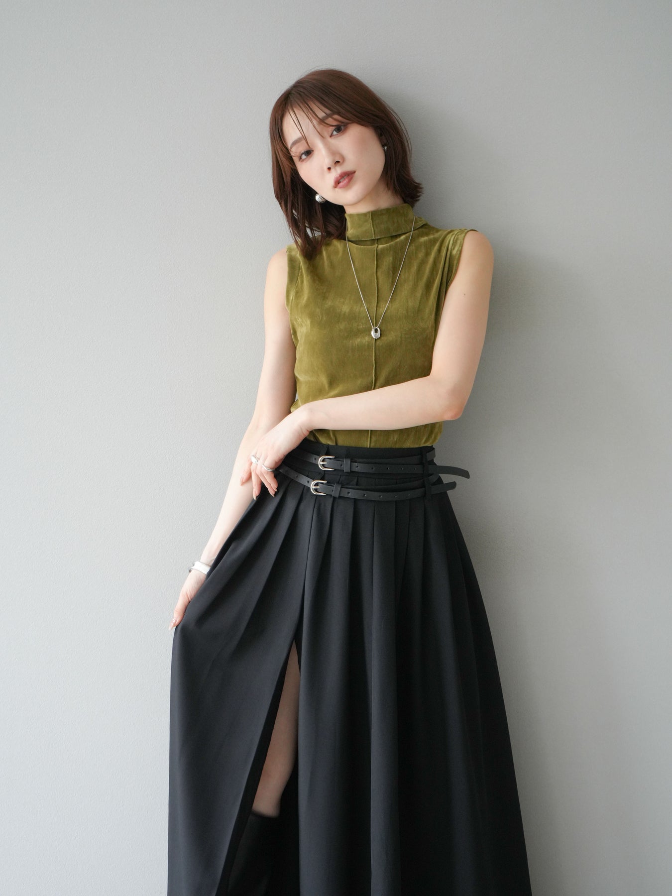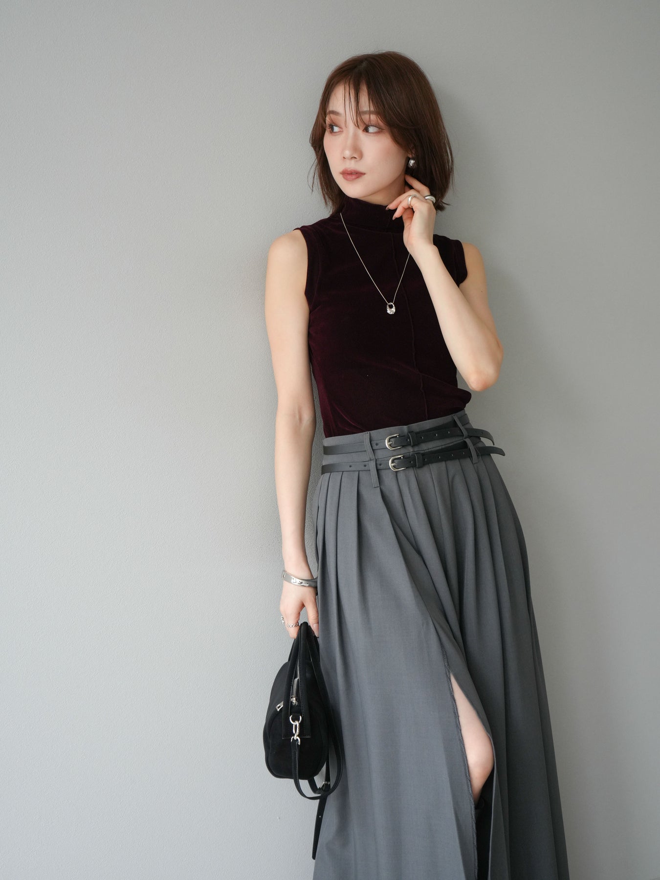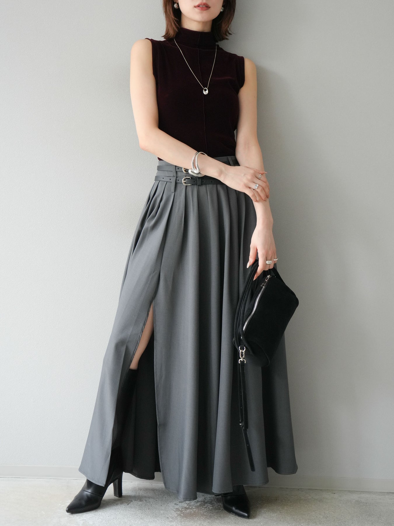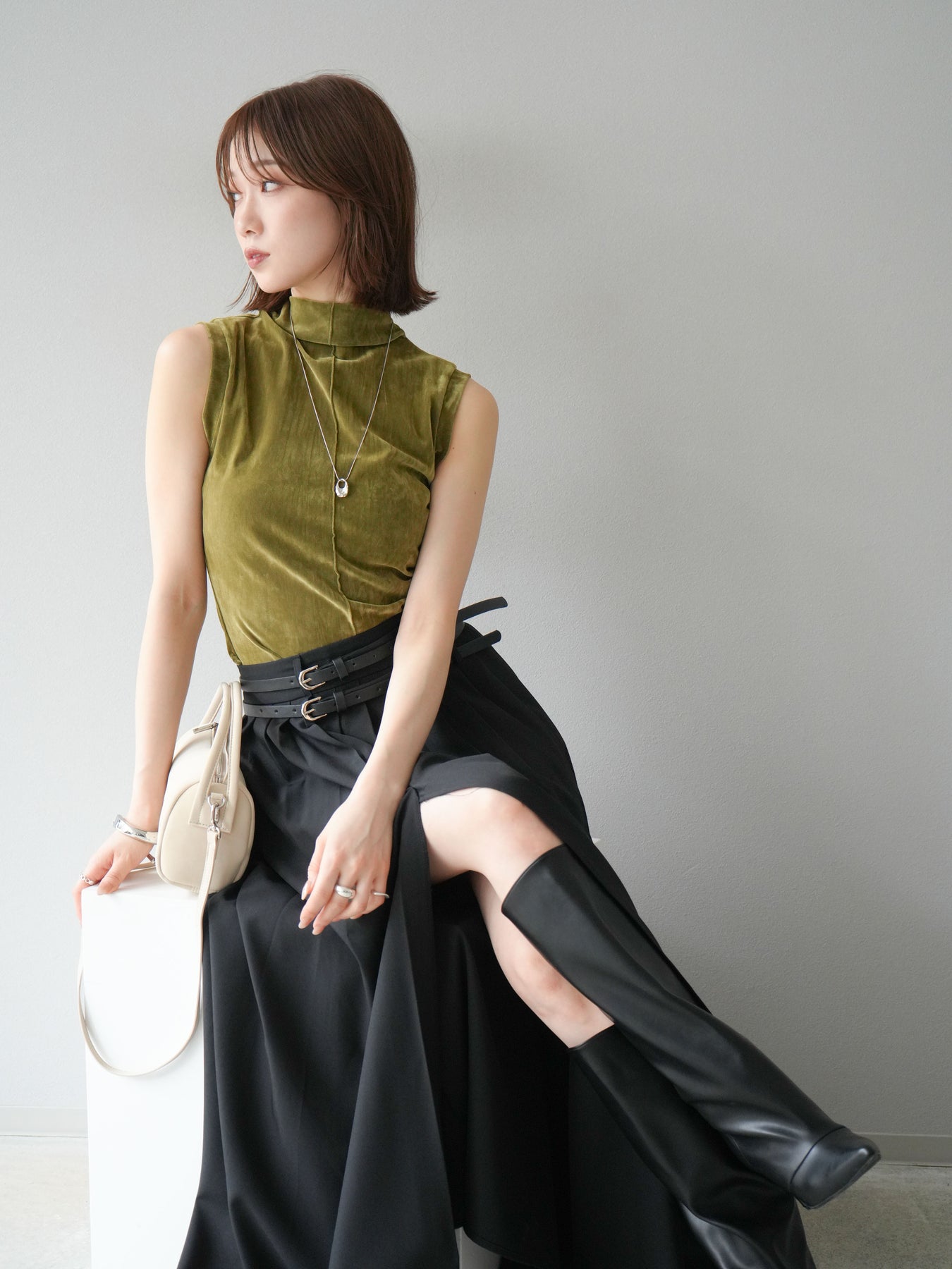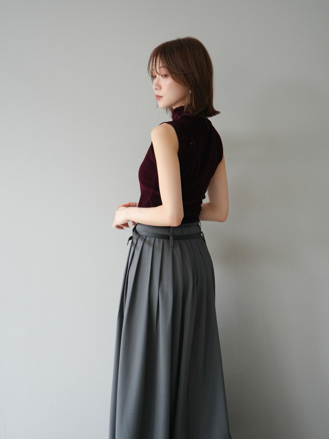 [SET]シアーベロアプチネックノースリーブトップス+エステルプリーツスリットスカート(2set)