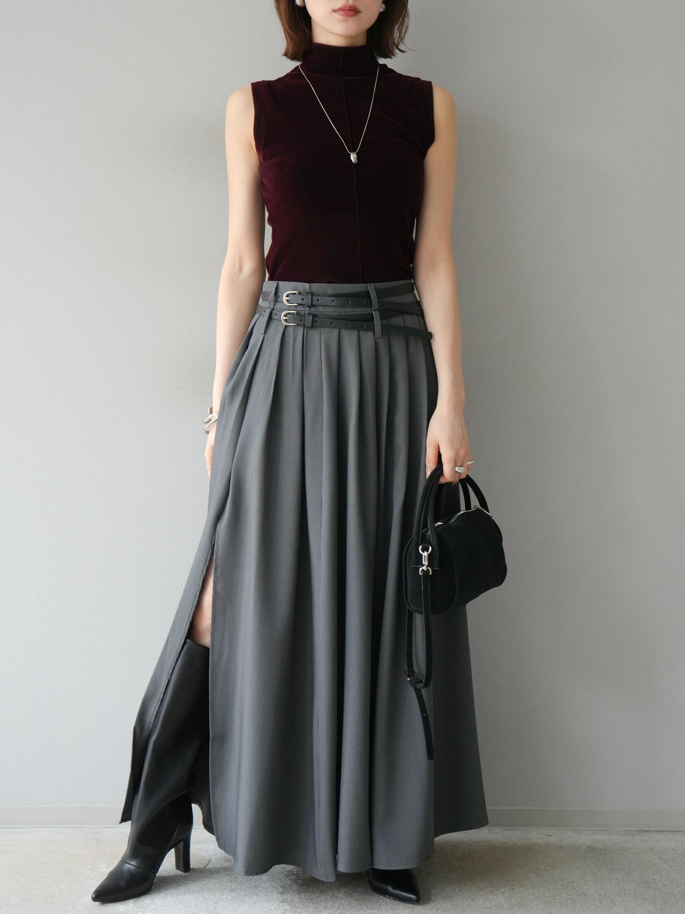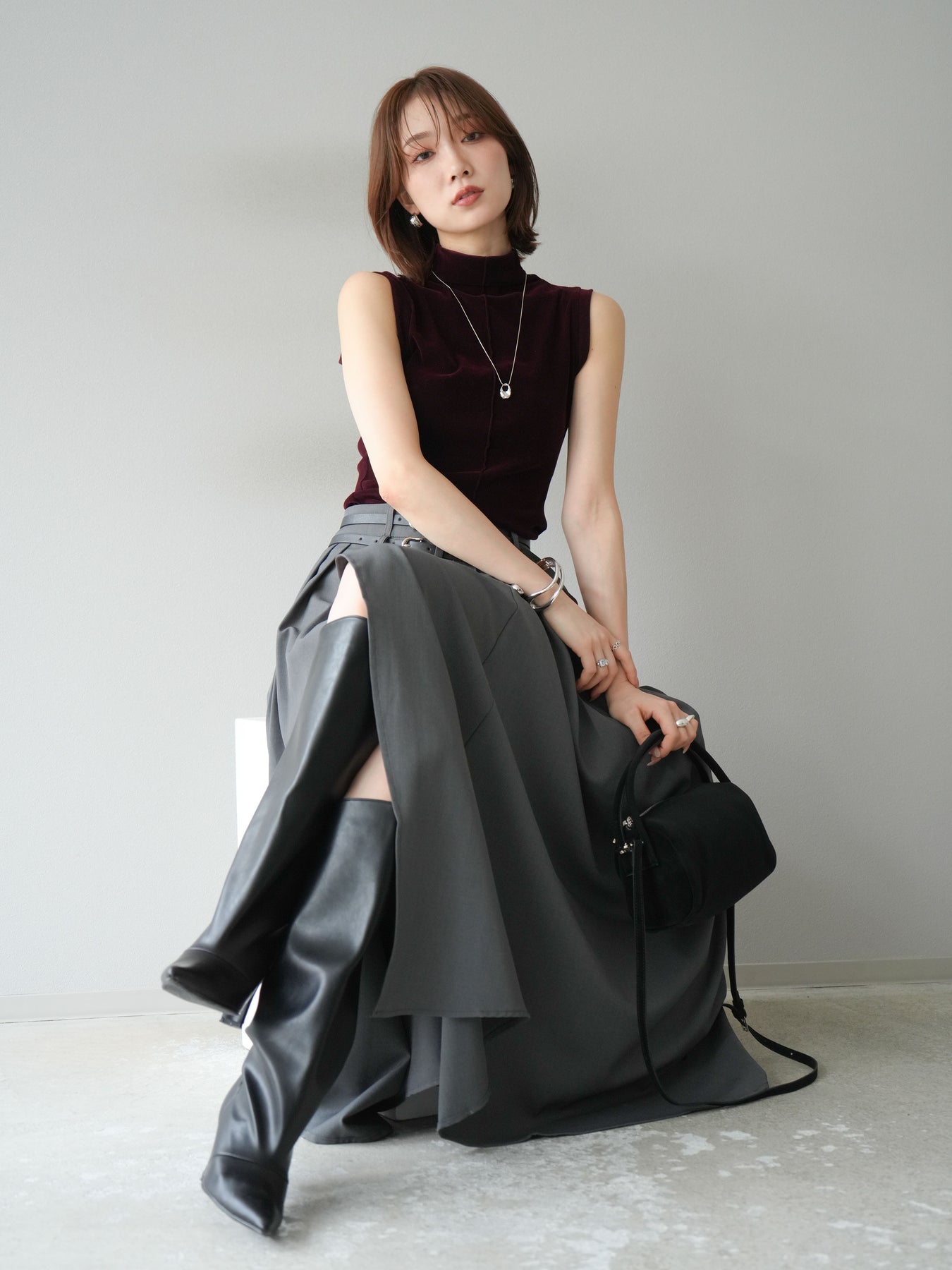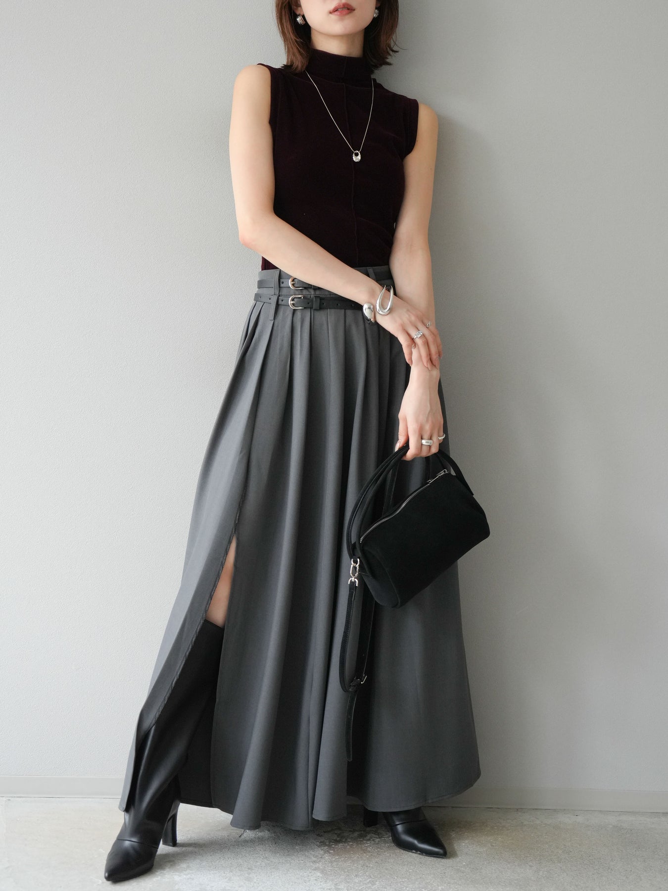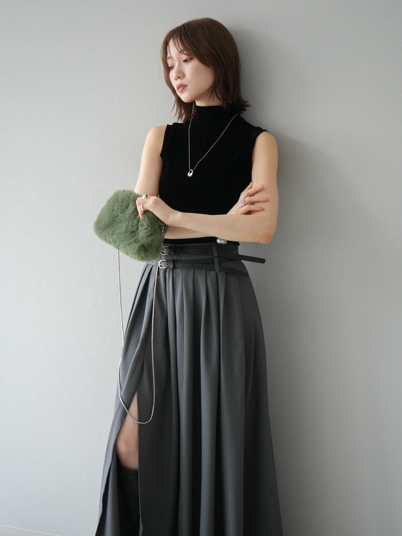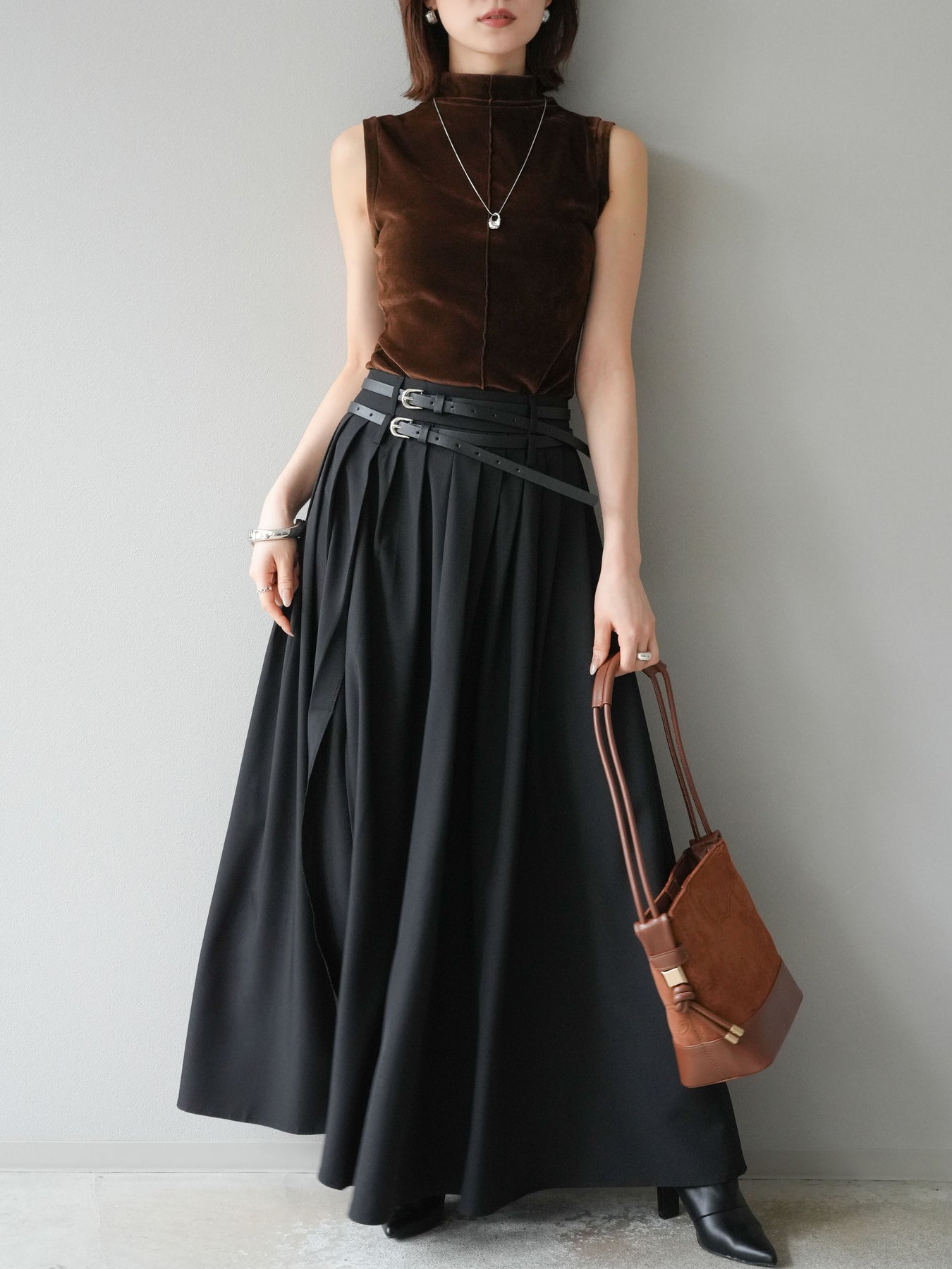 [SET]シアーベロアプチネックノースリーブトップス+エステルプリーツスリットスカート(2set)