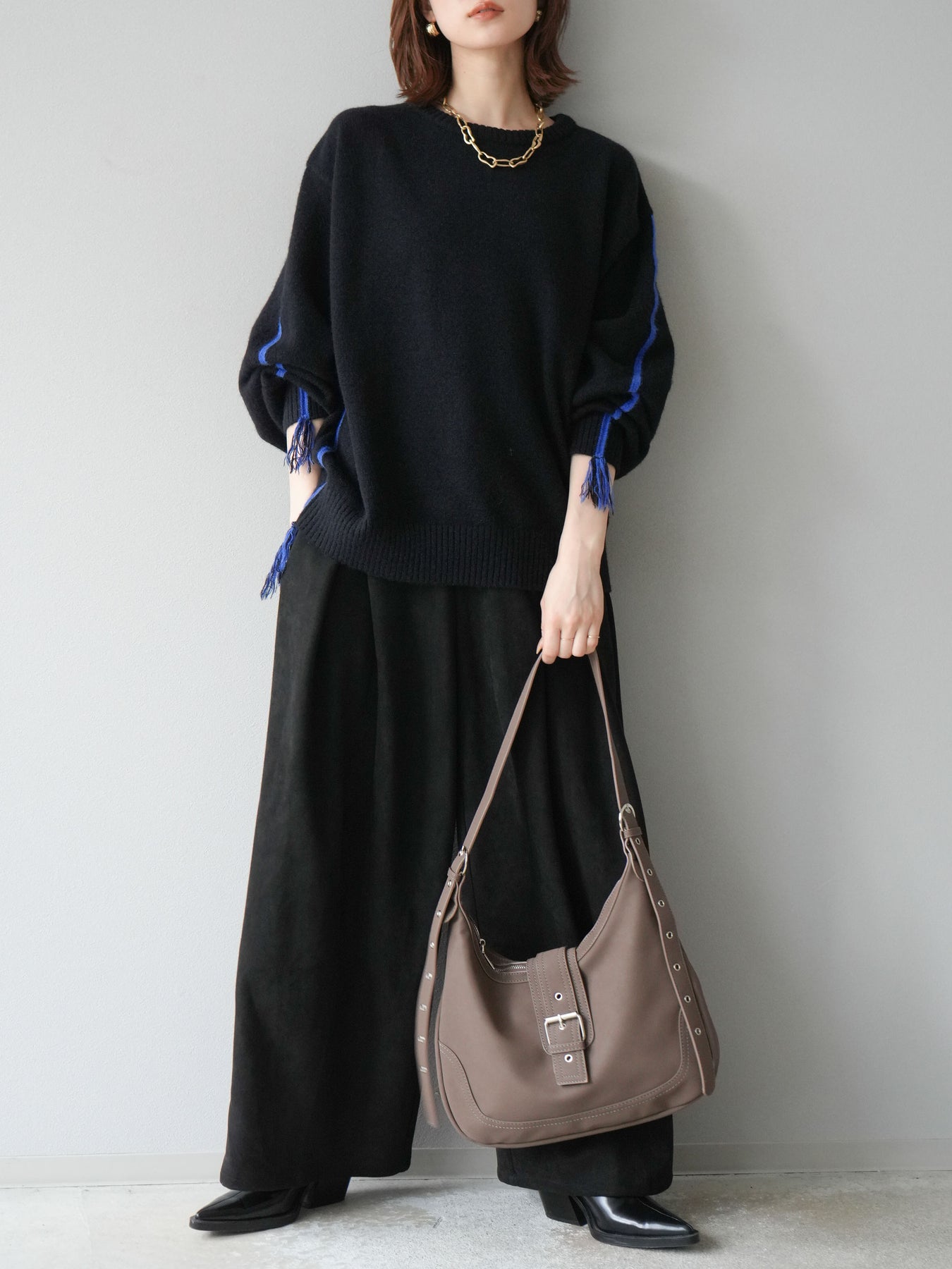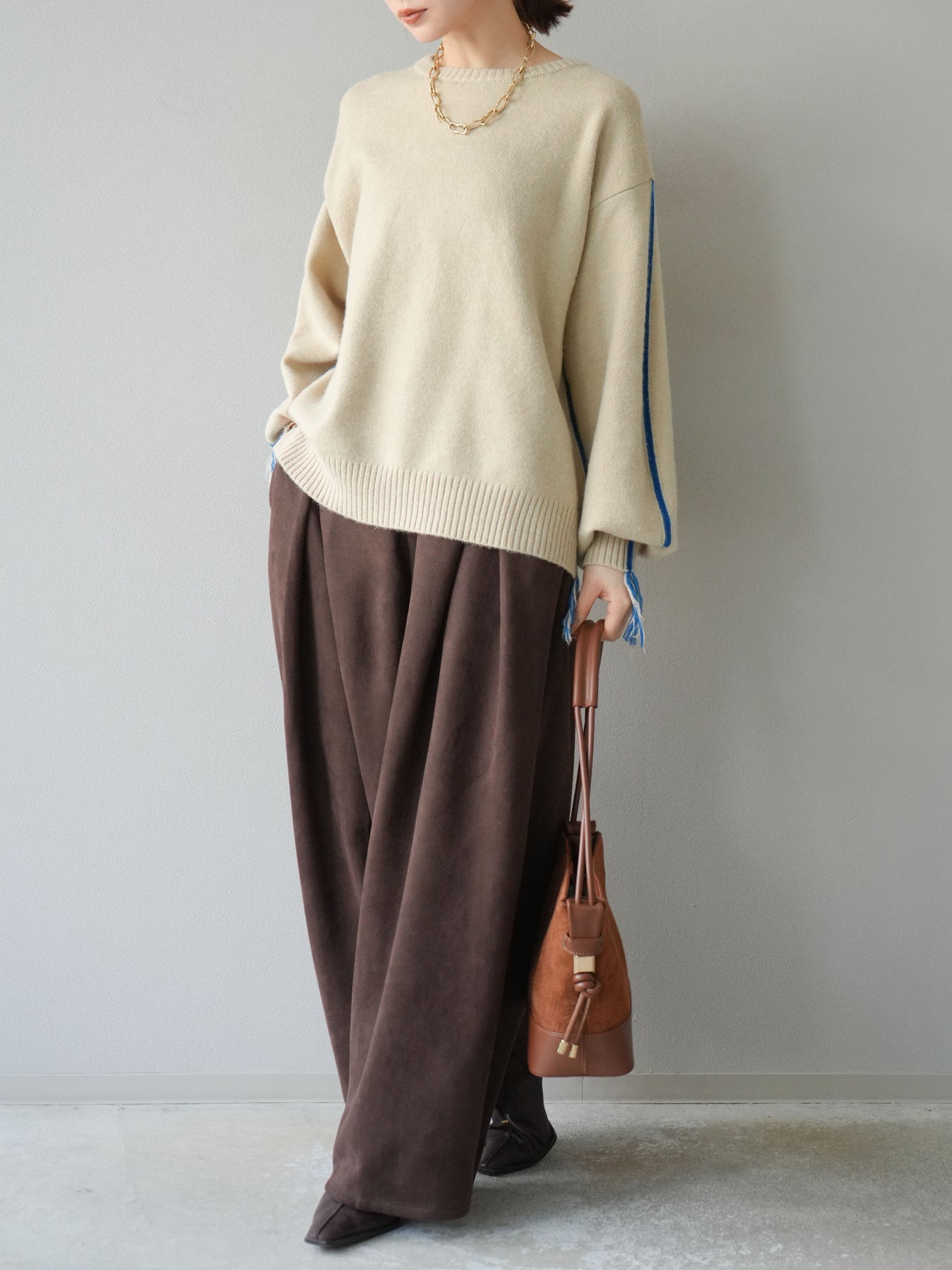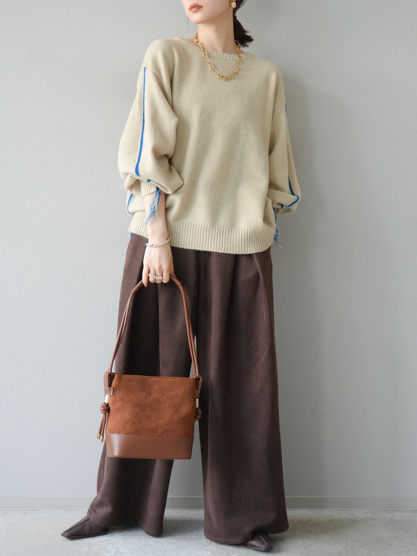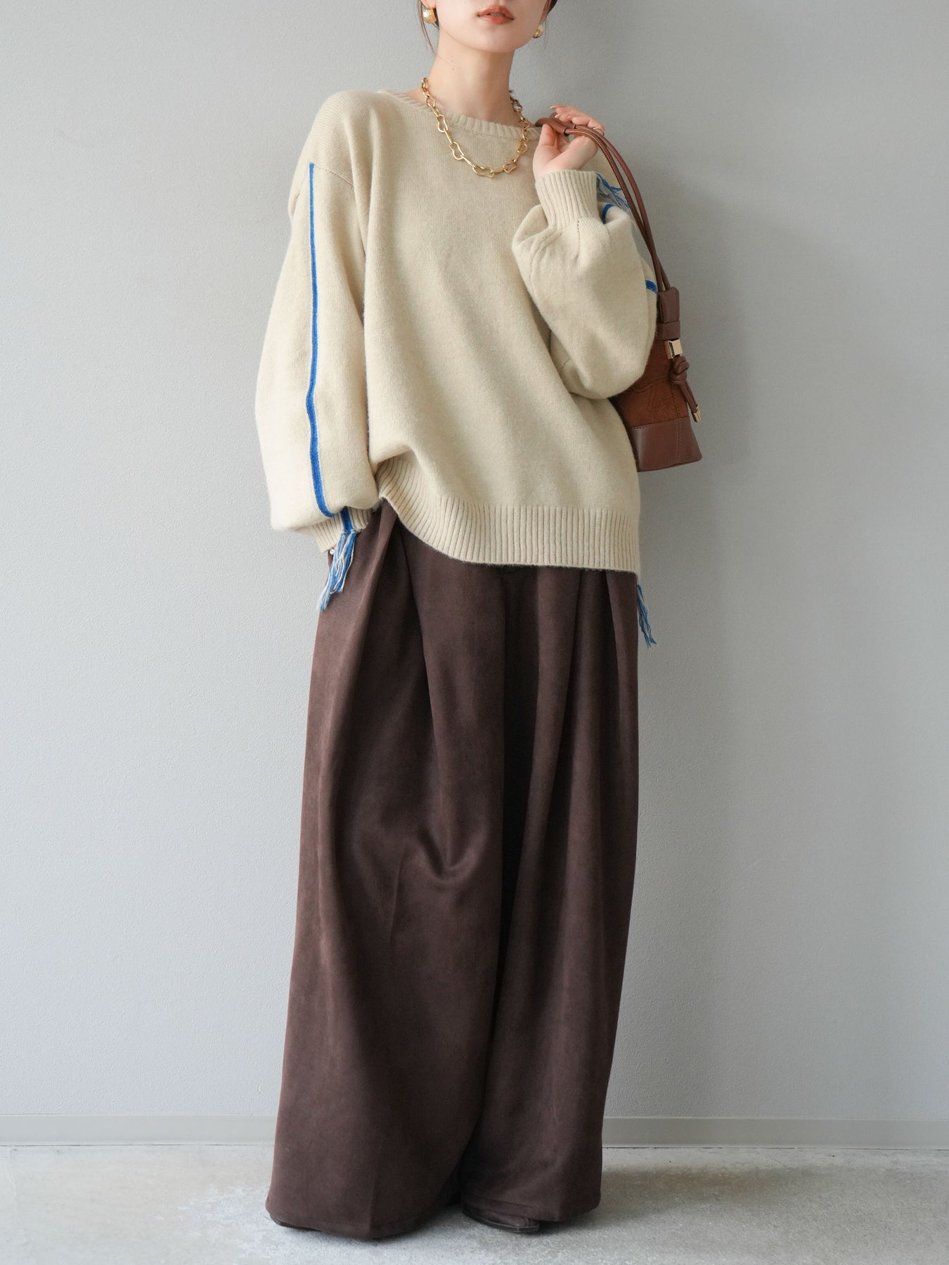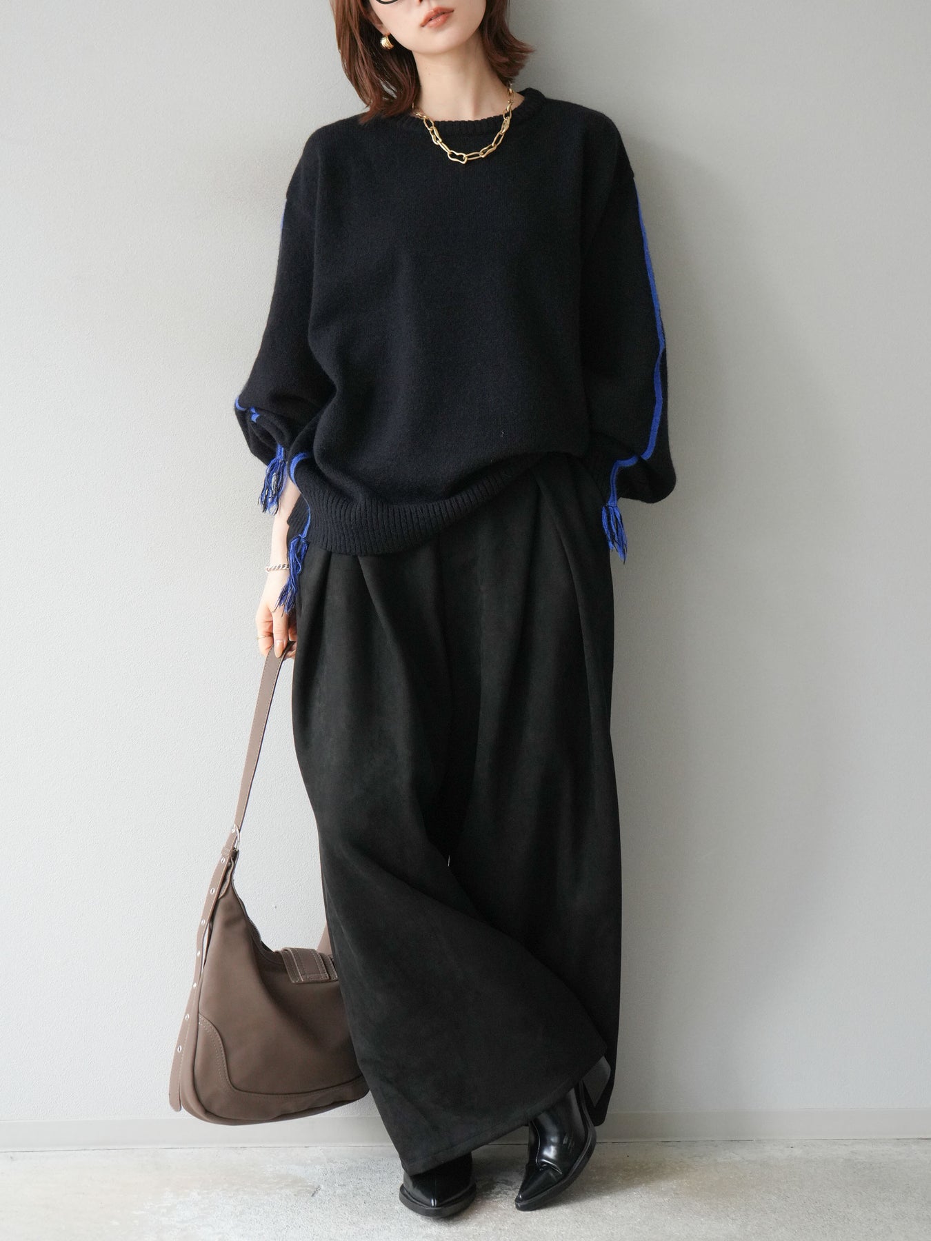 [SET]配色ステッチフリンジニットプルオーバー +スウェードタックワイドパンツ(2set)