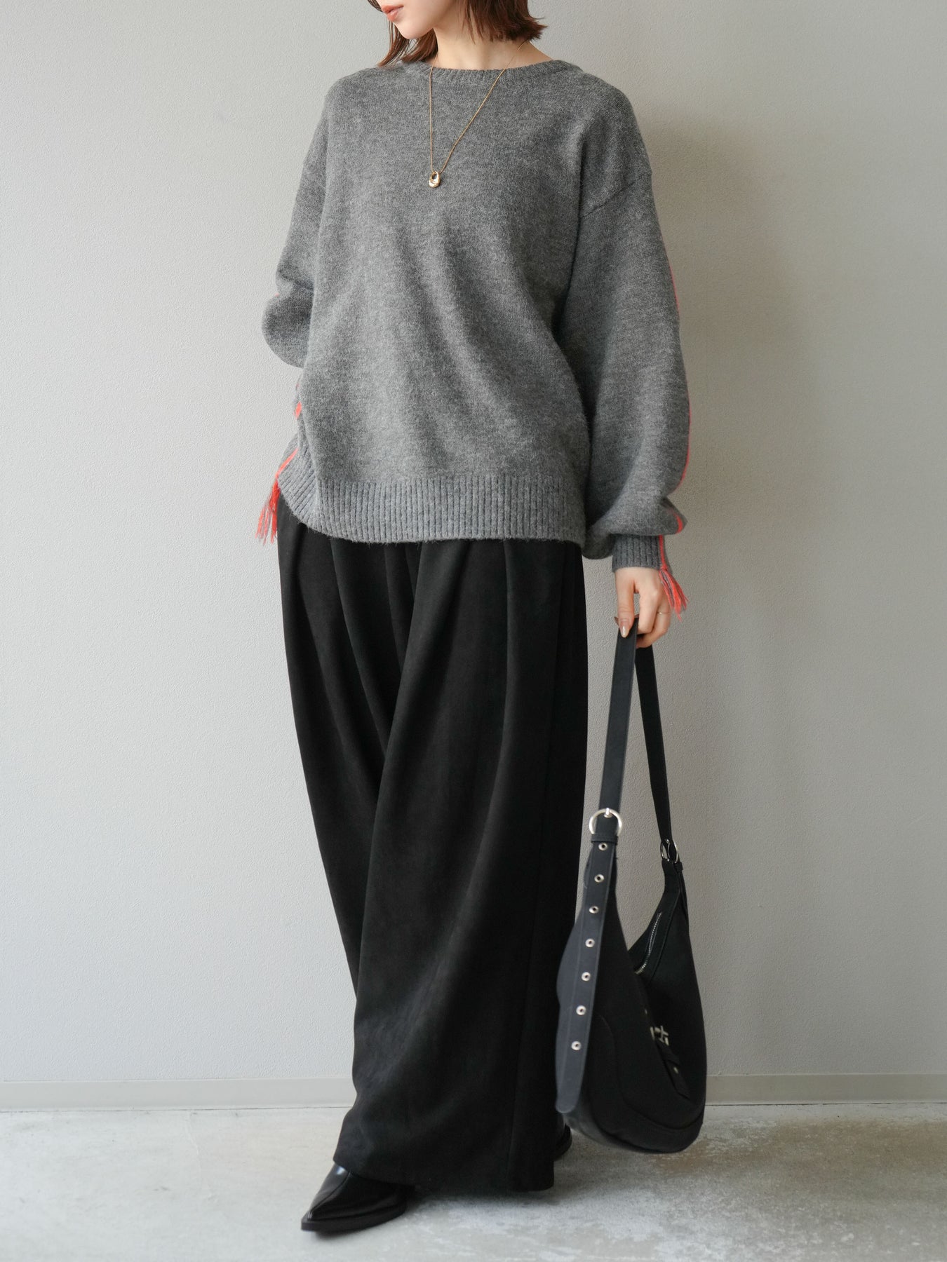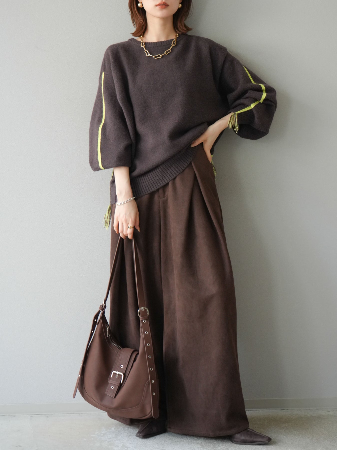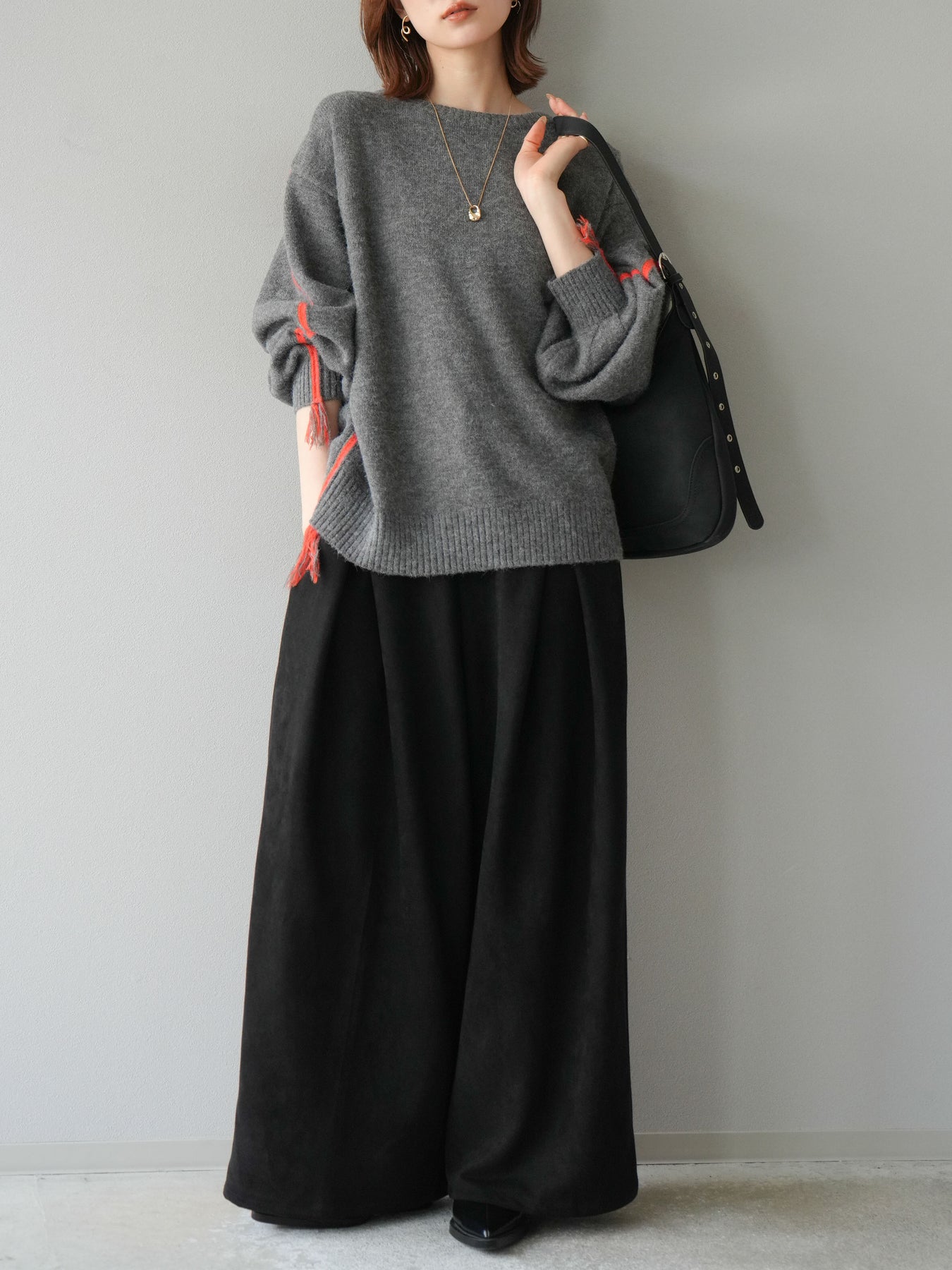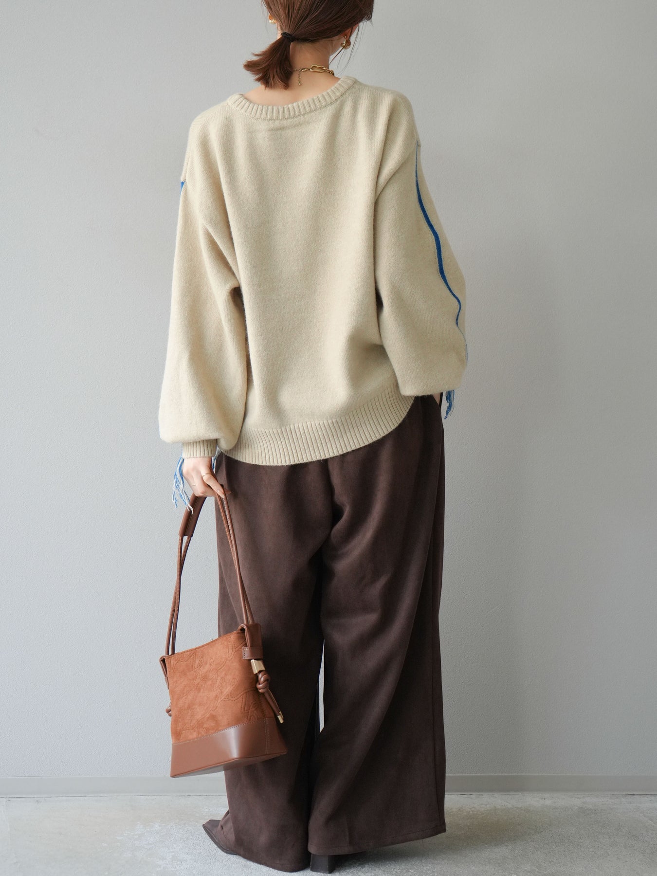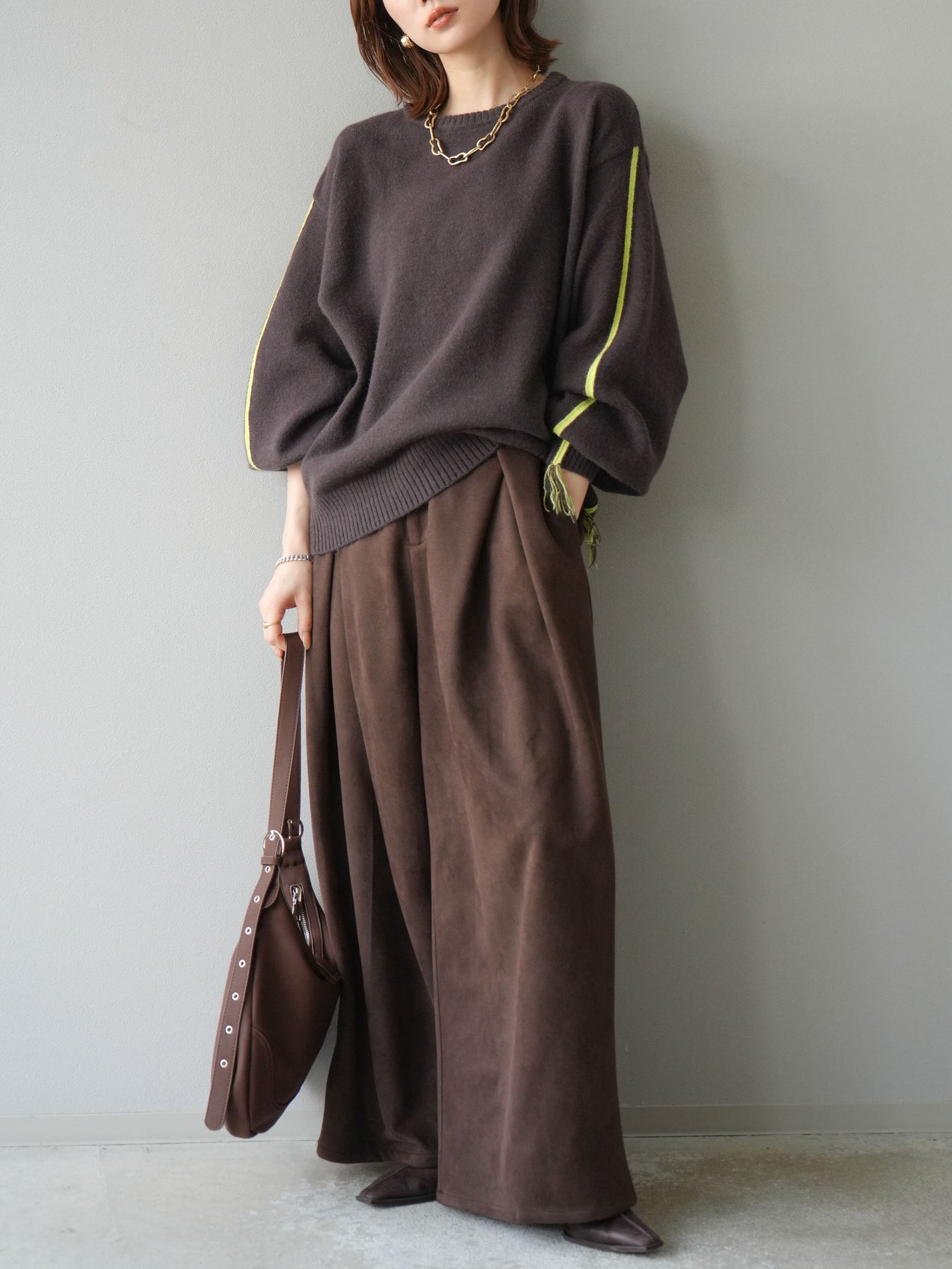 [SET]配色ステッチフリンジニットプルオーバー +スウェードタックワイドパンツ(2set)