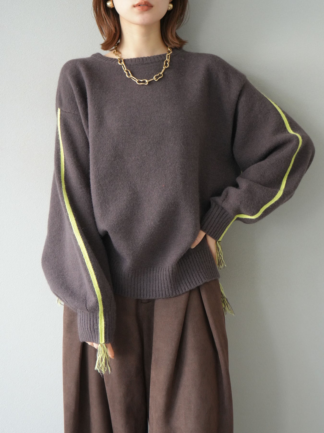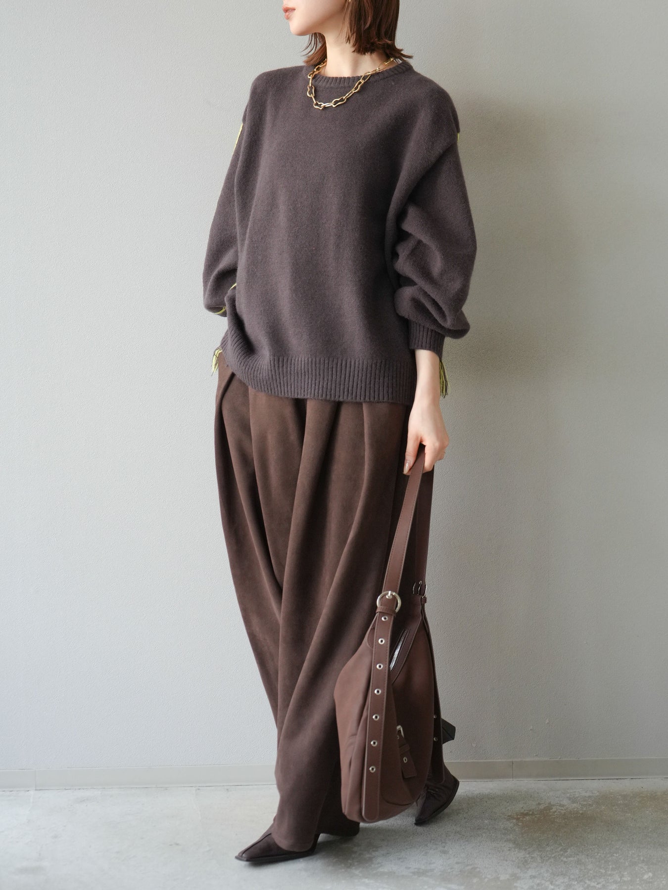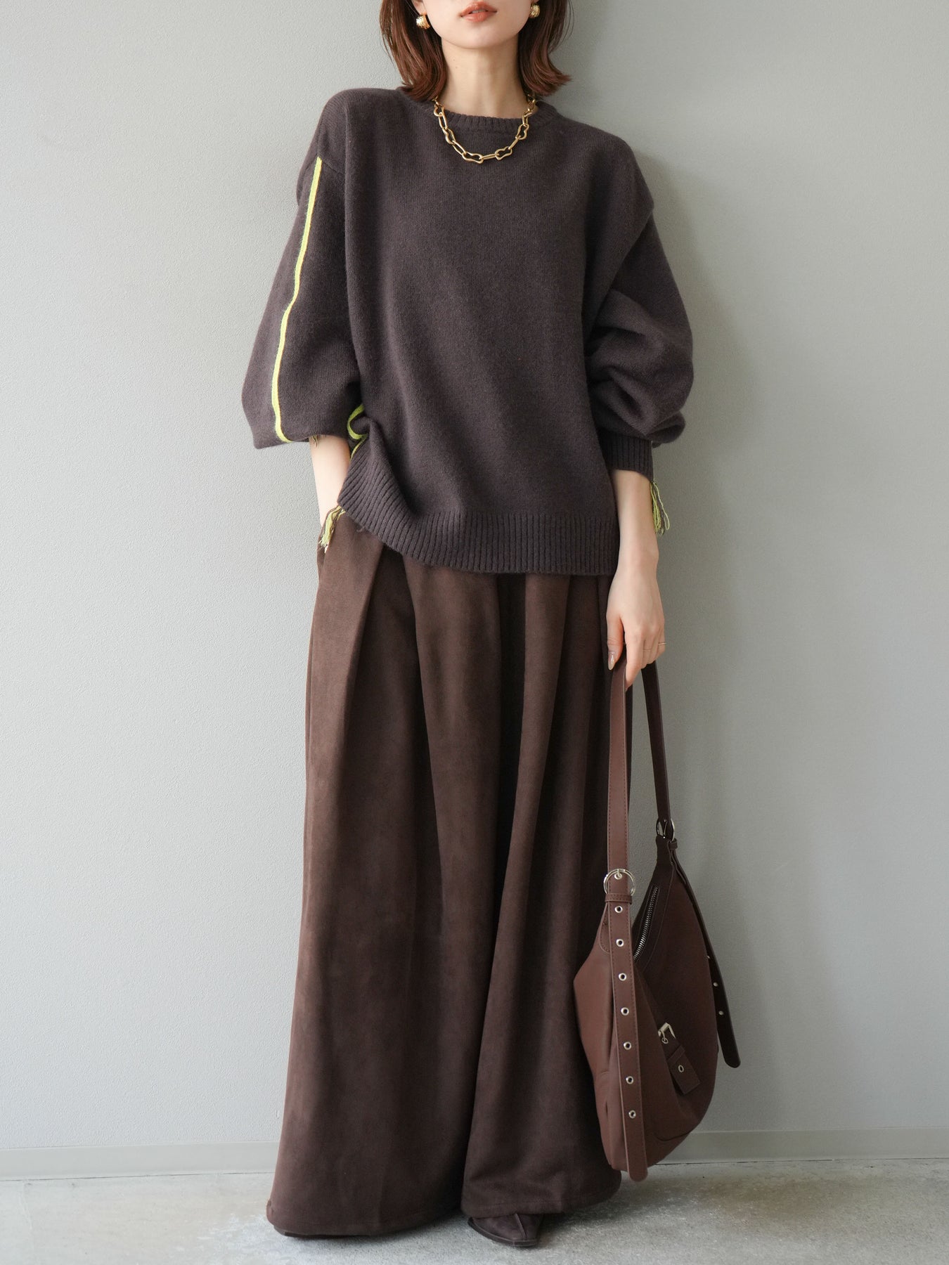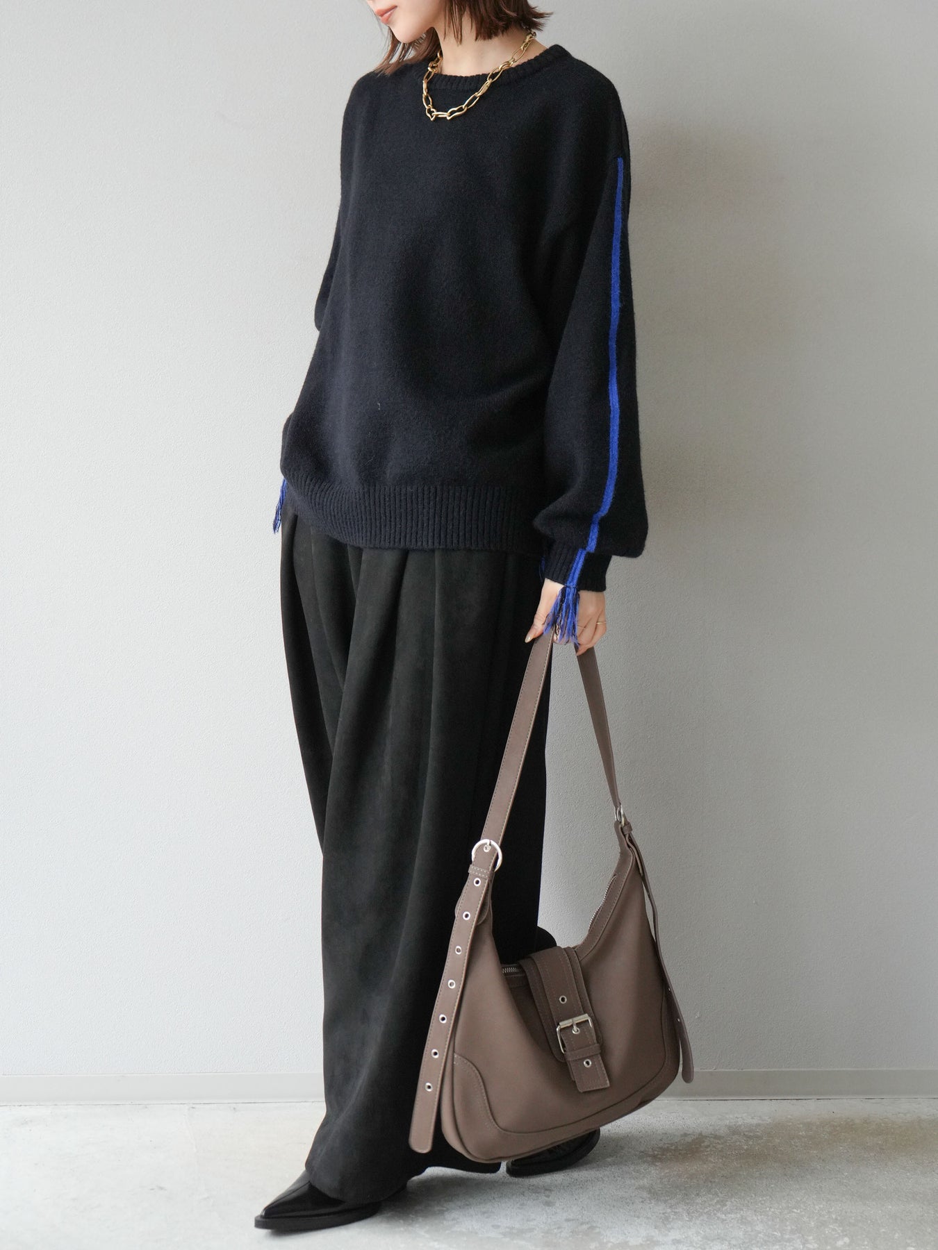 [SET]配色ステッチフリンジニットプルオーバー +スウェードタックワイドパンツ(2set)
