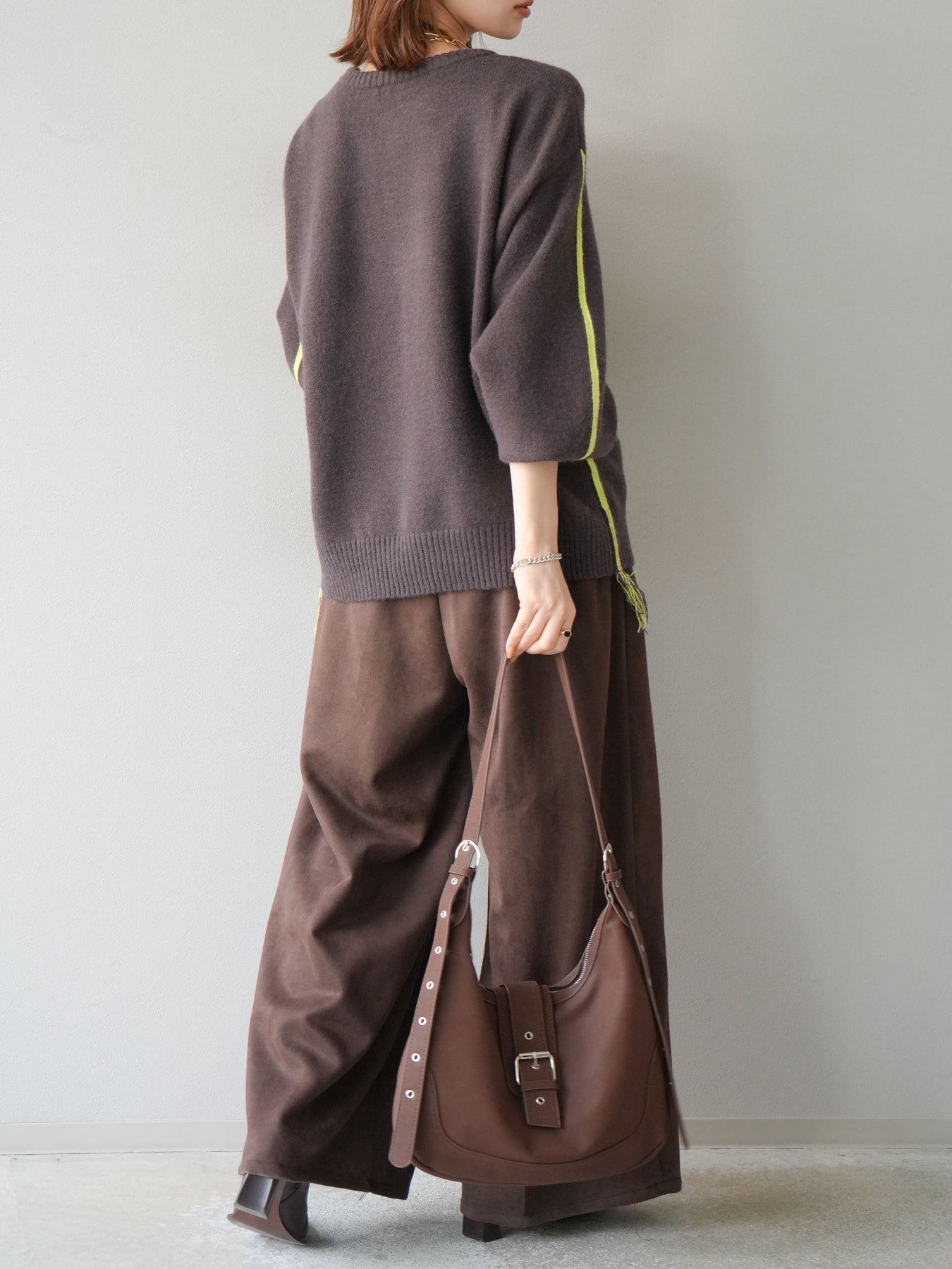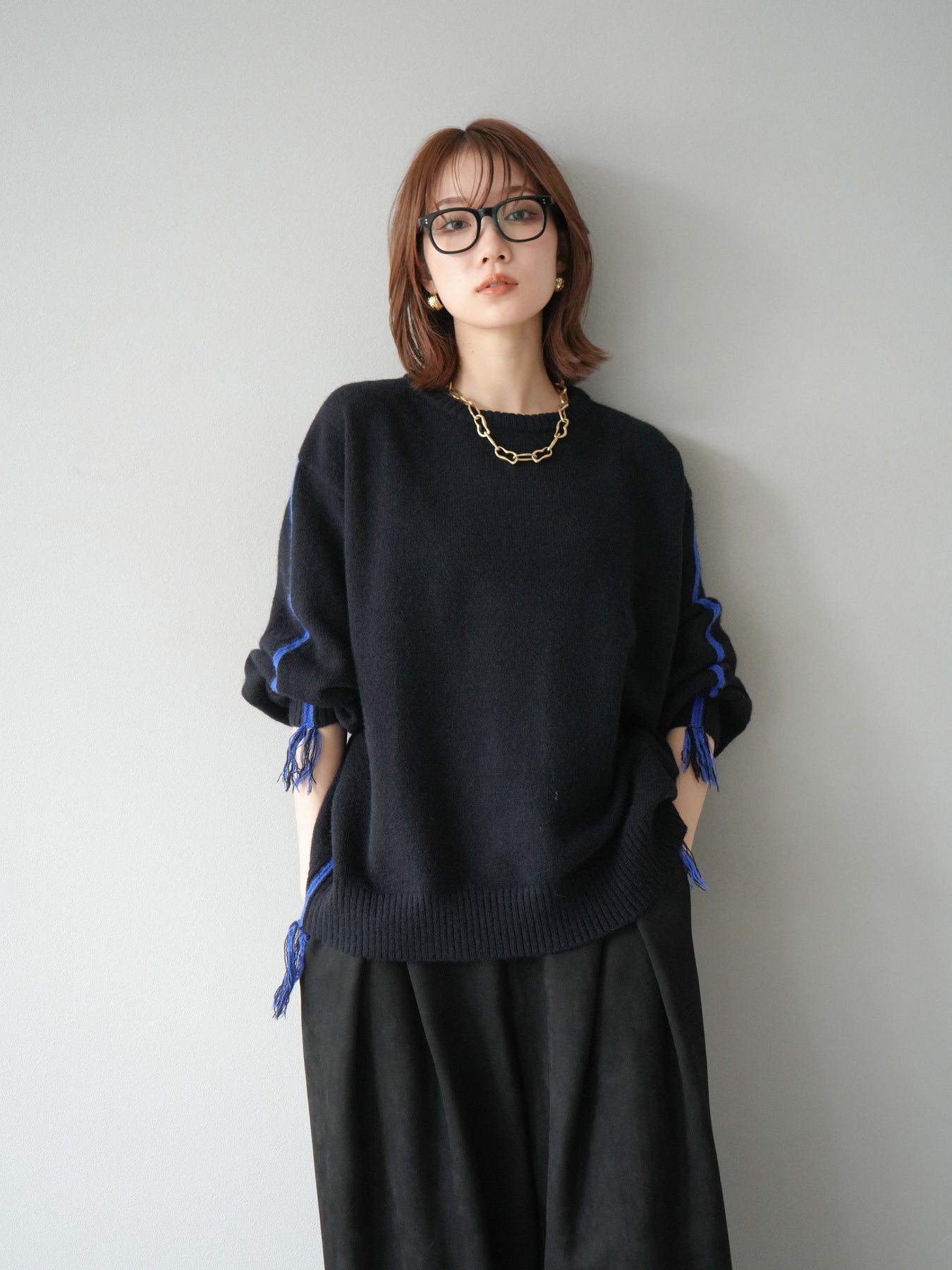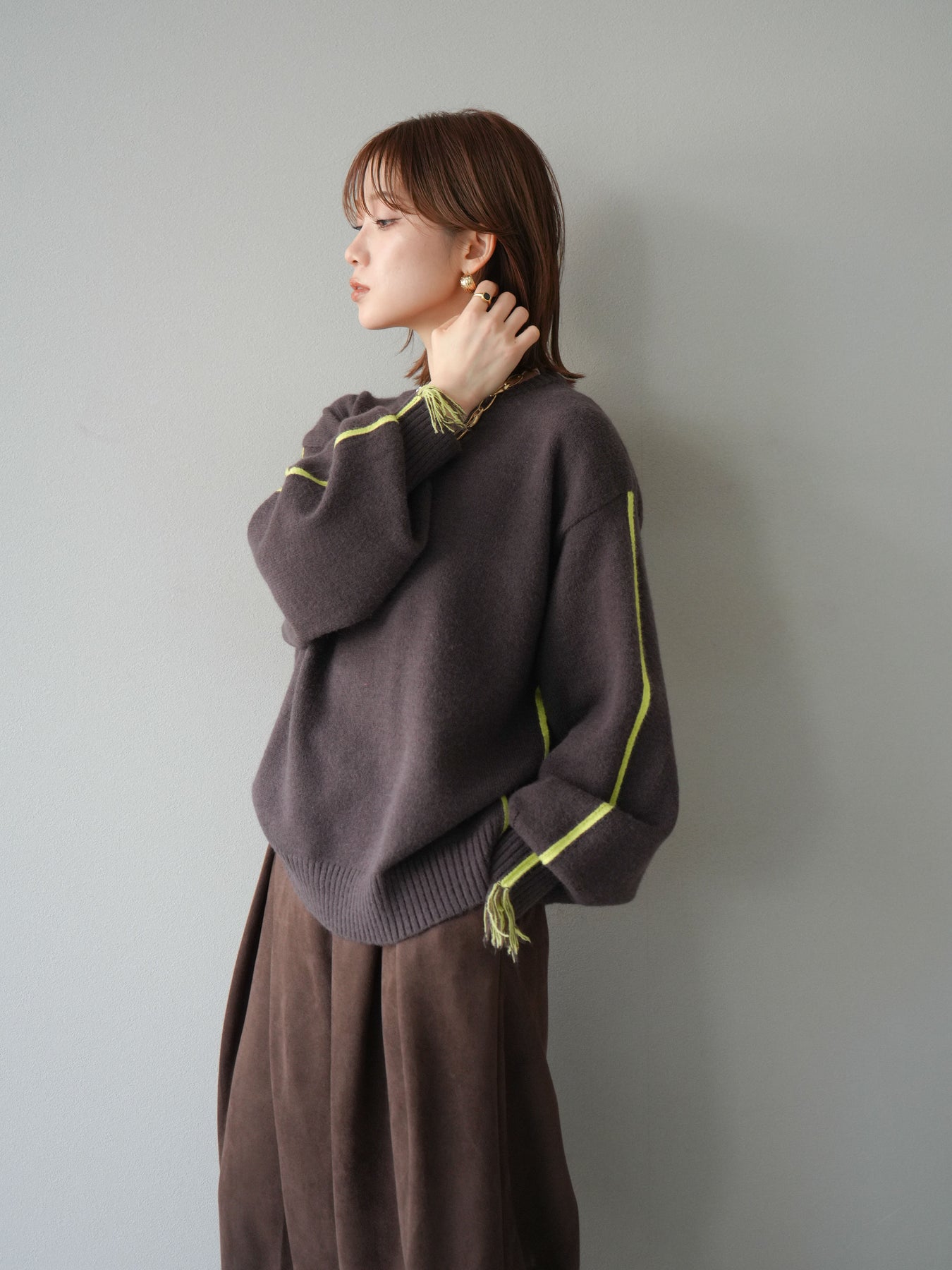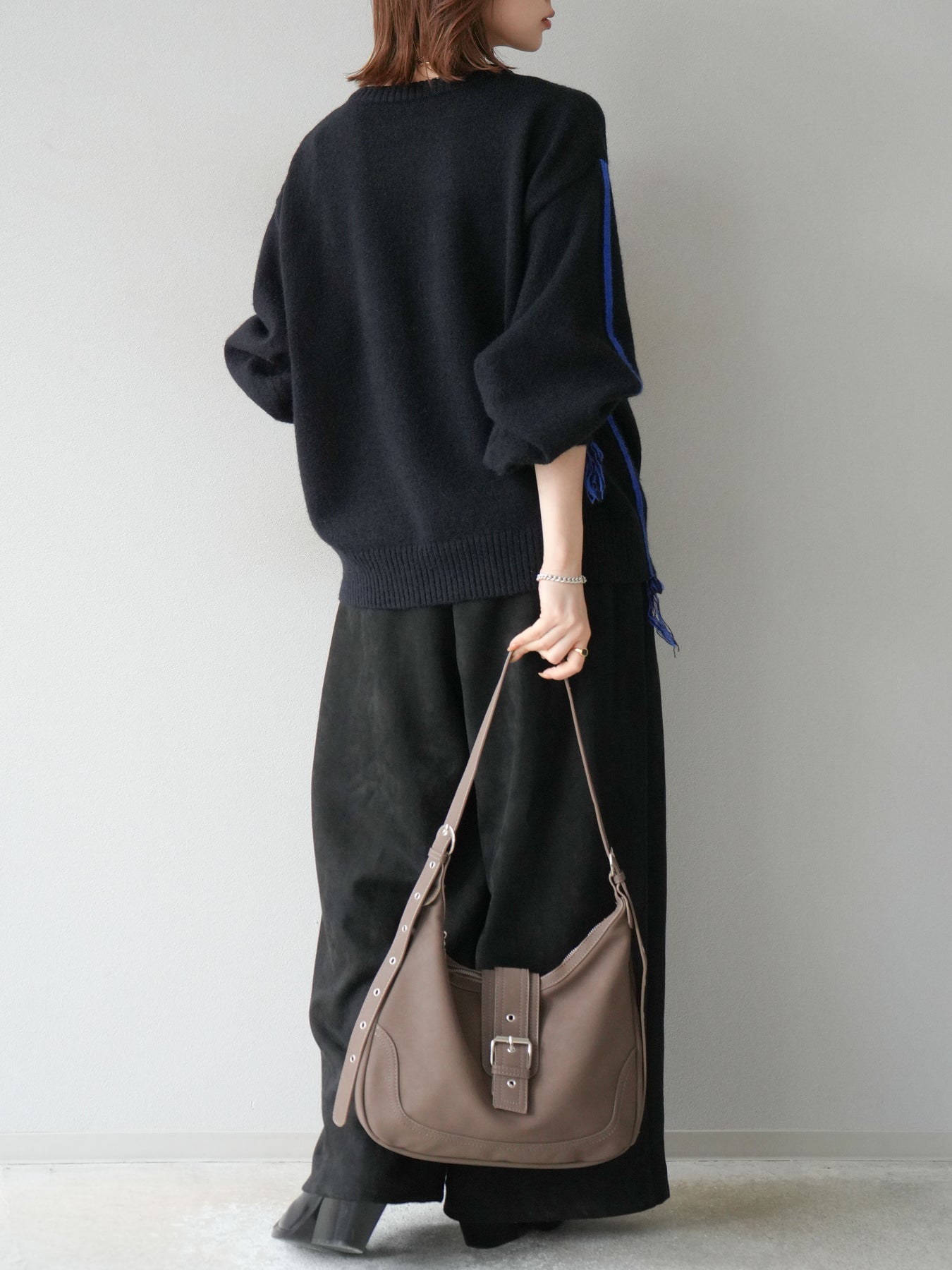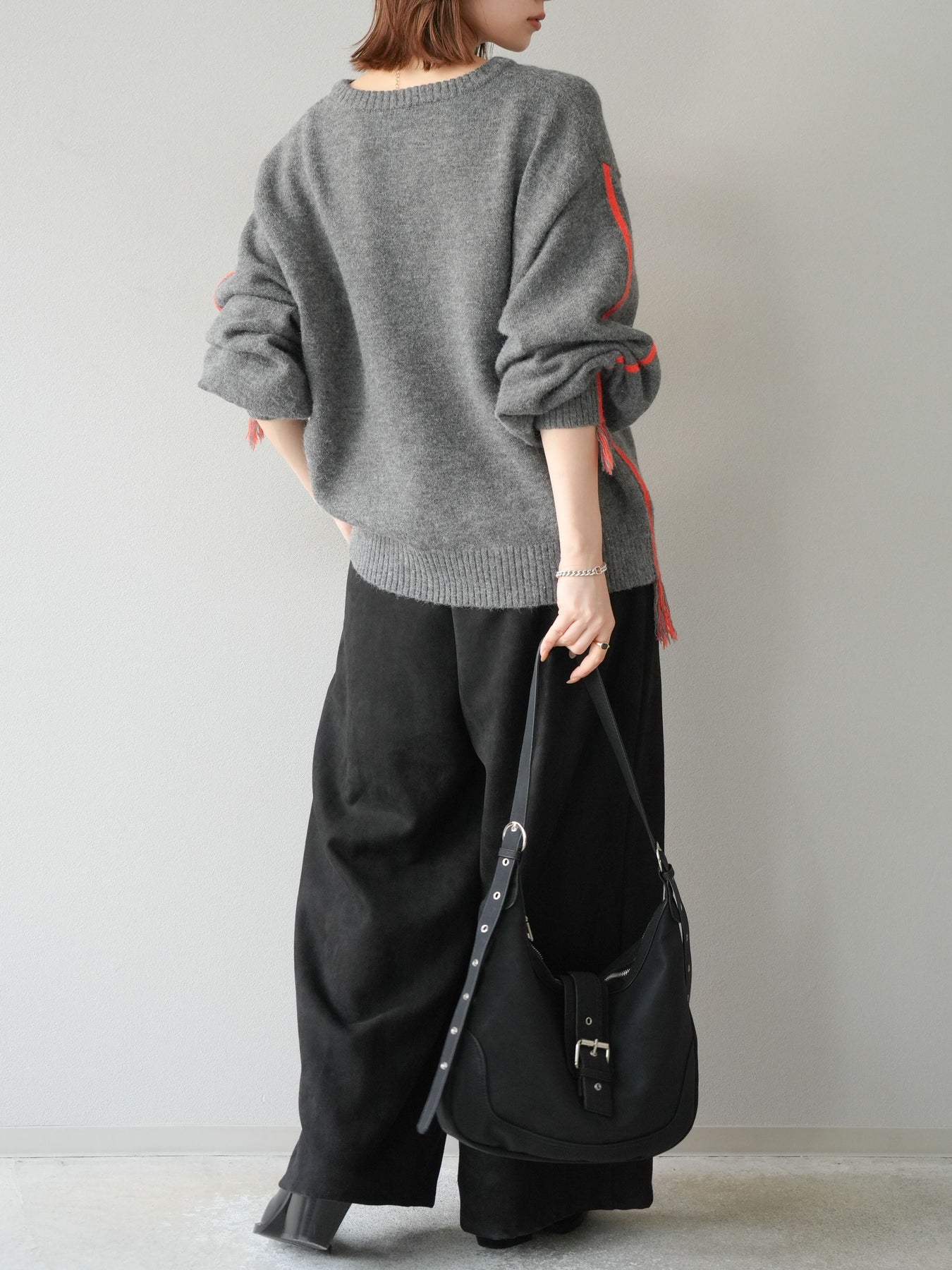 [SET]配色ステッチフリンジニットプルオーバー +スウェードタックワイドパンツ(2set)