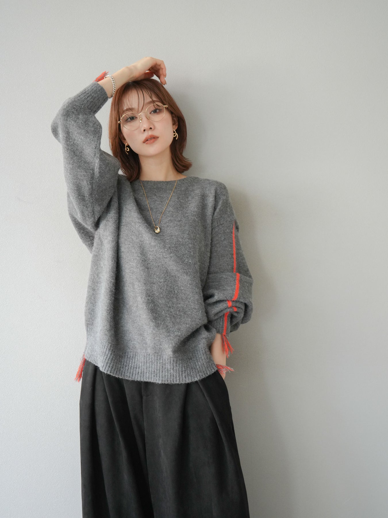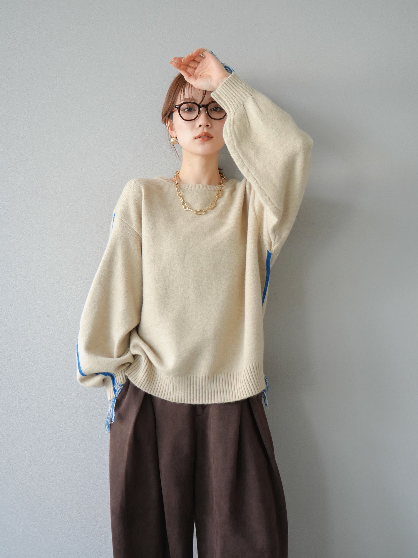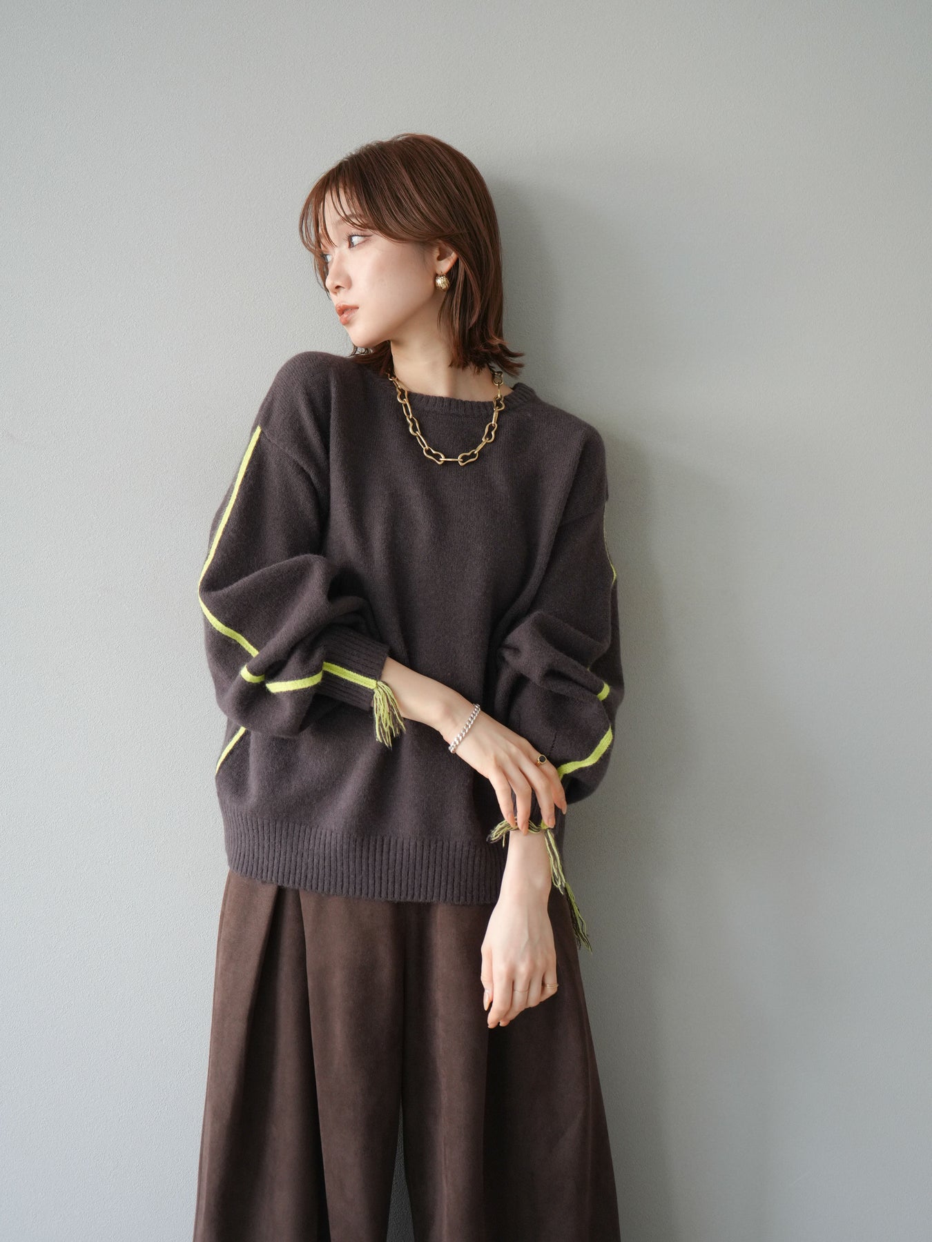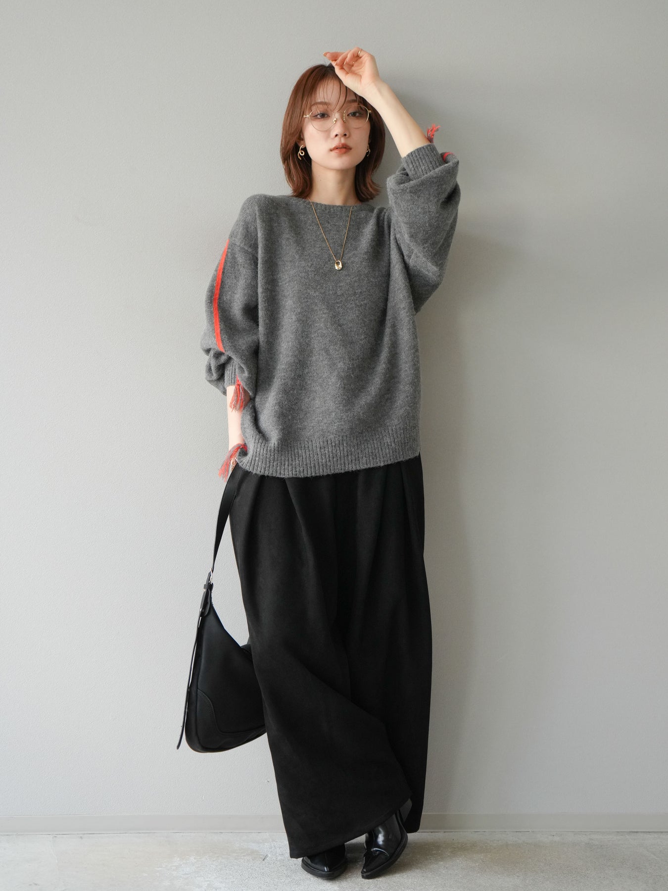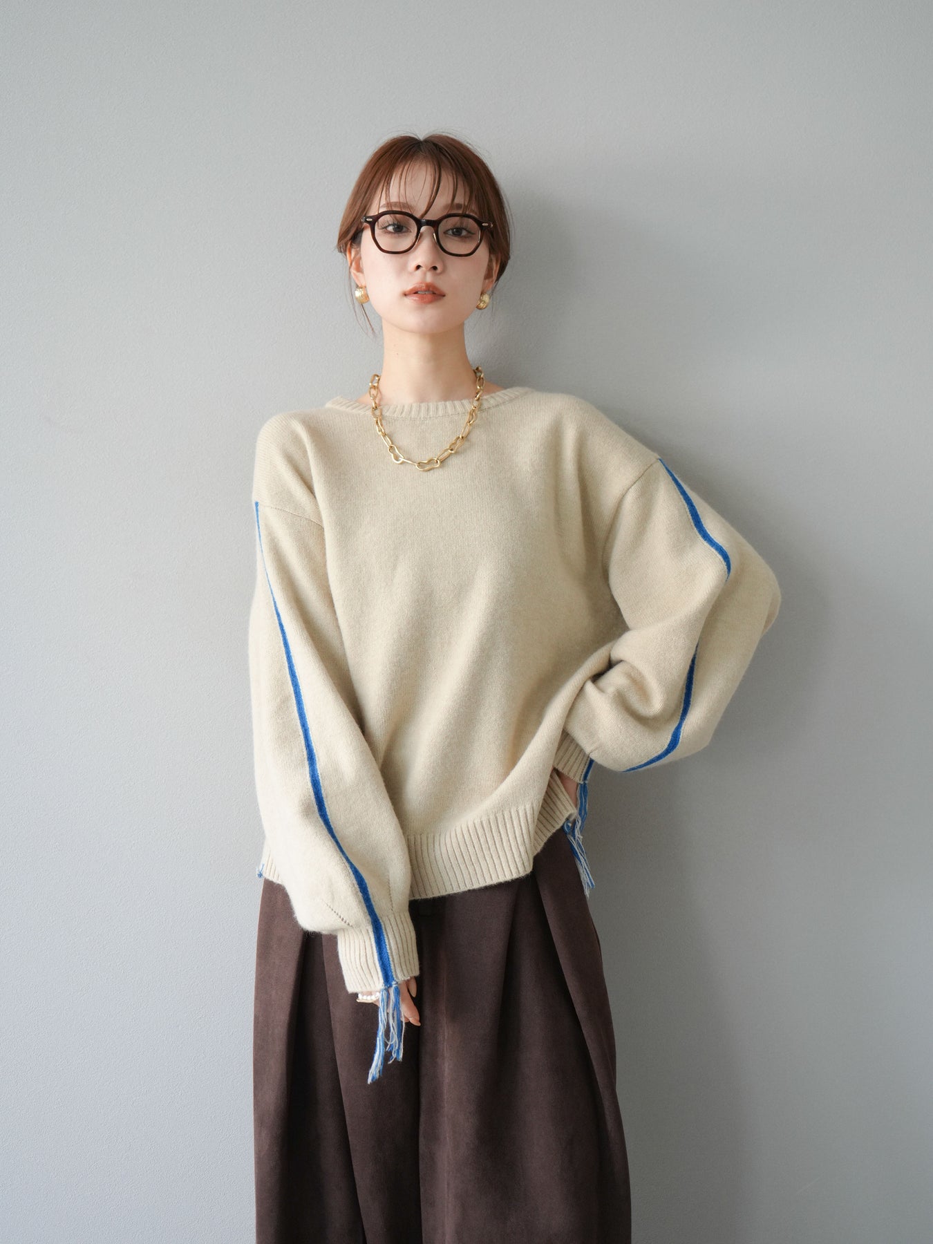 [SET]配色ステッチフリンジニットプルオーバー +スウェードタックワイドパンツ(2set)