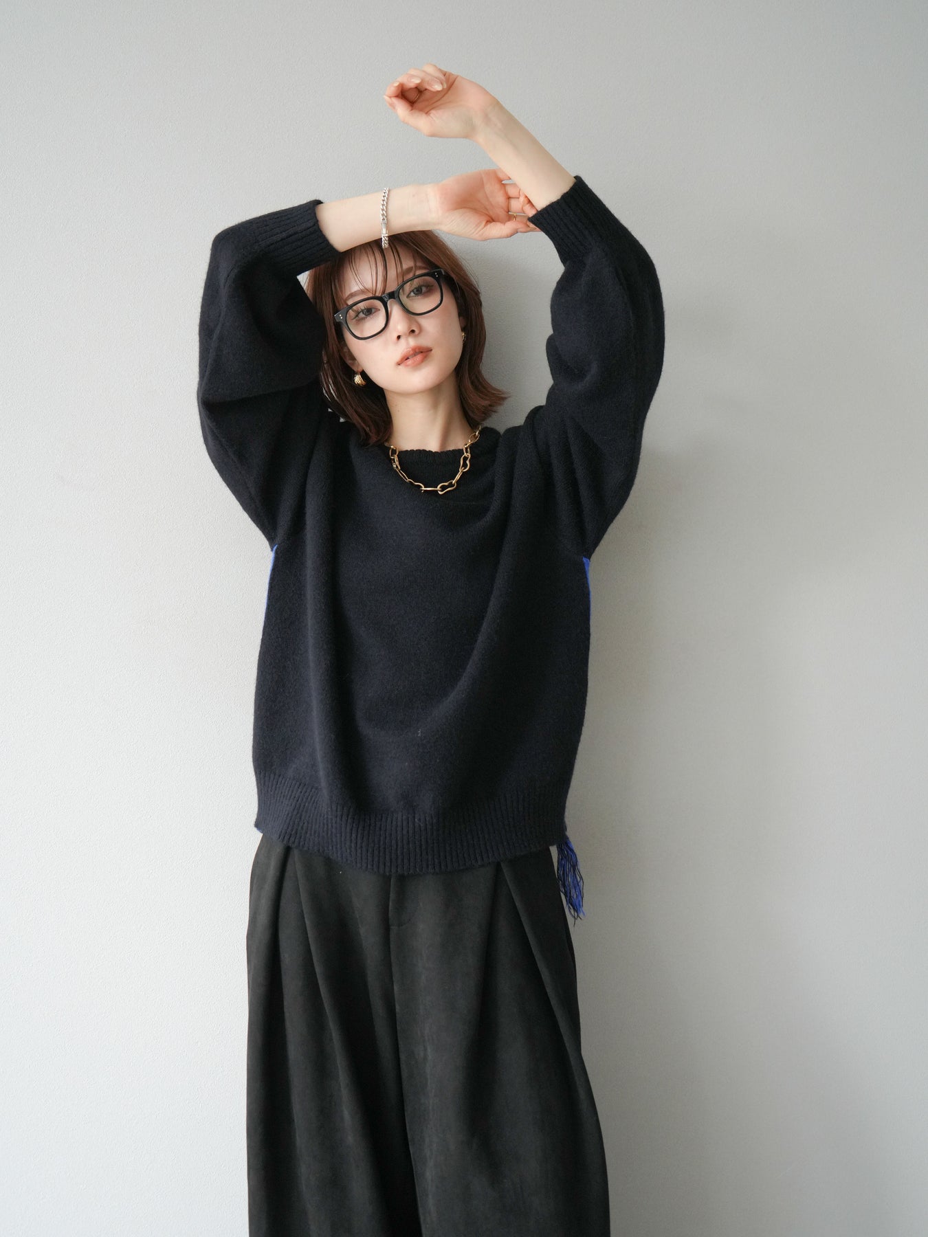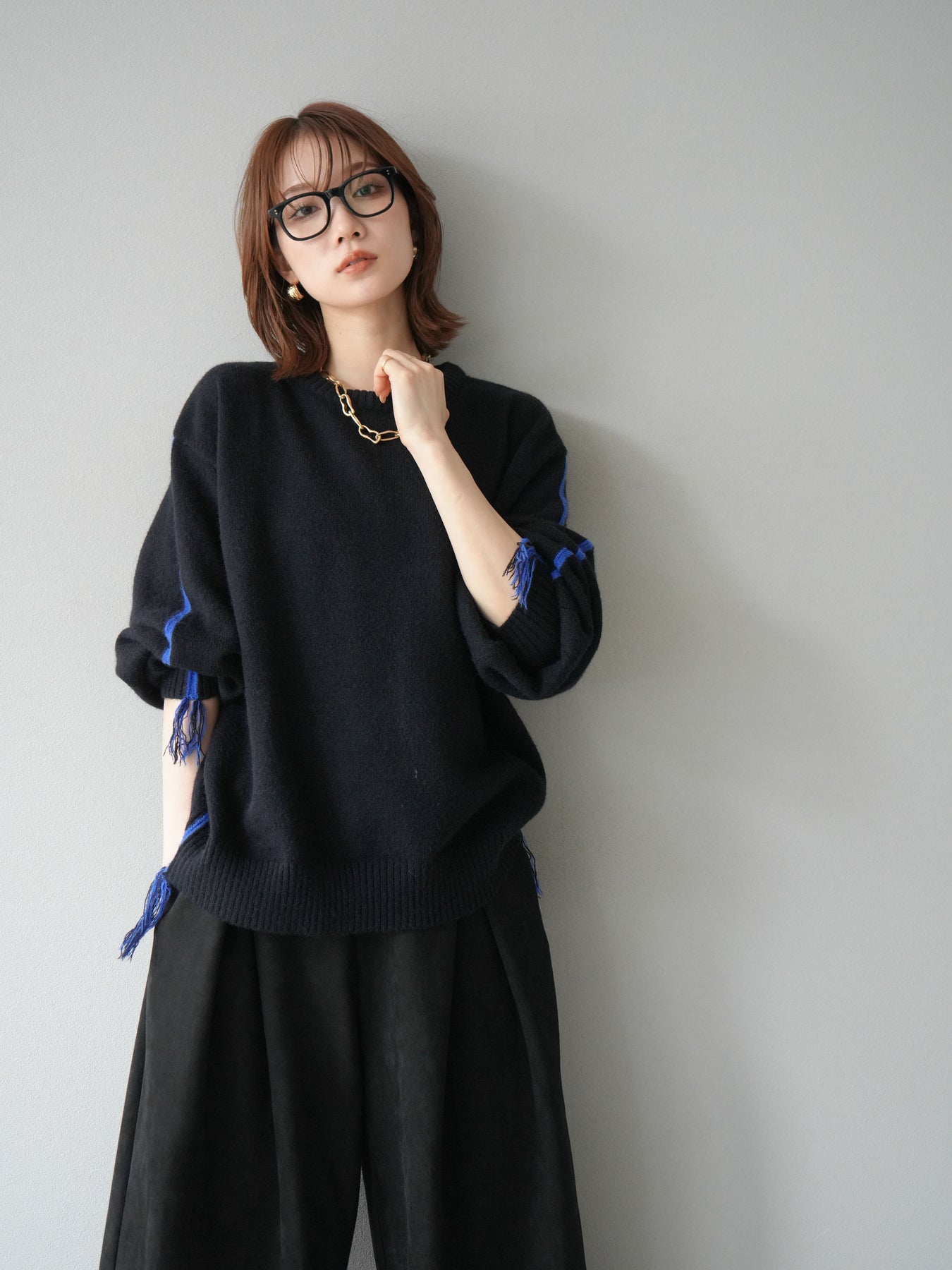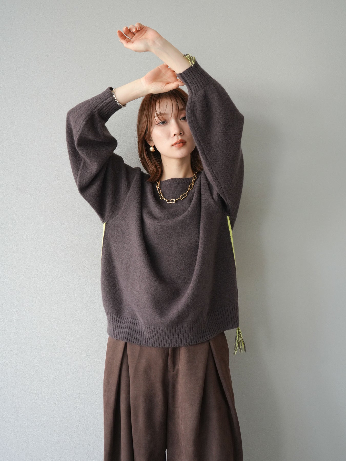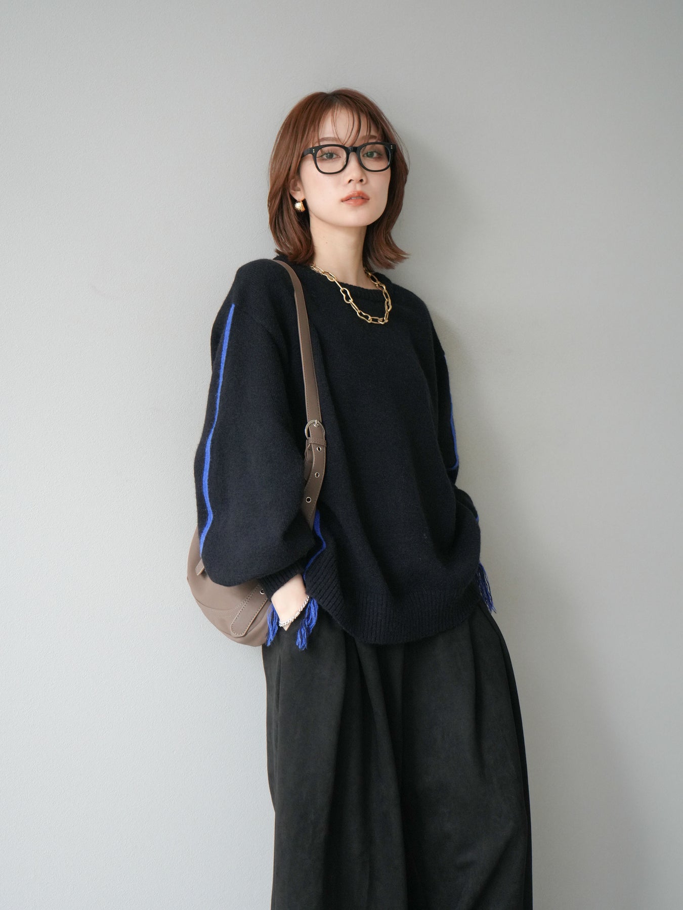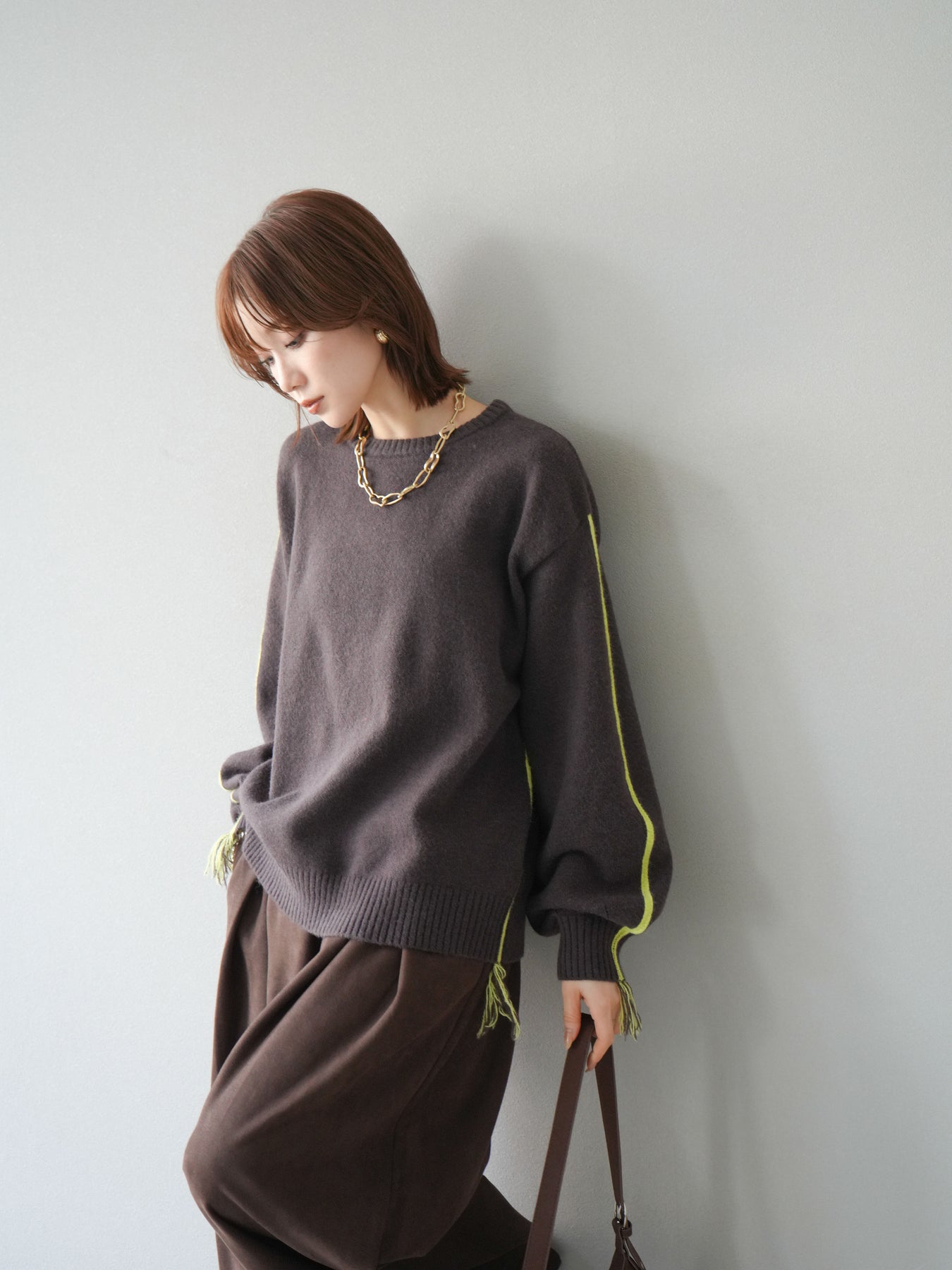 [SET]配色ステッチフリンジニットプルオーバー +スウェードタックワイドパンツ(2set)