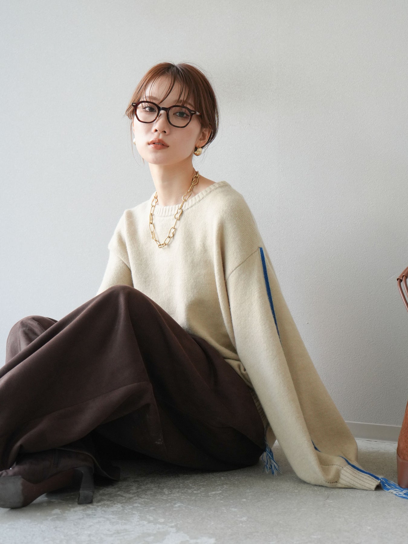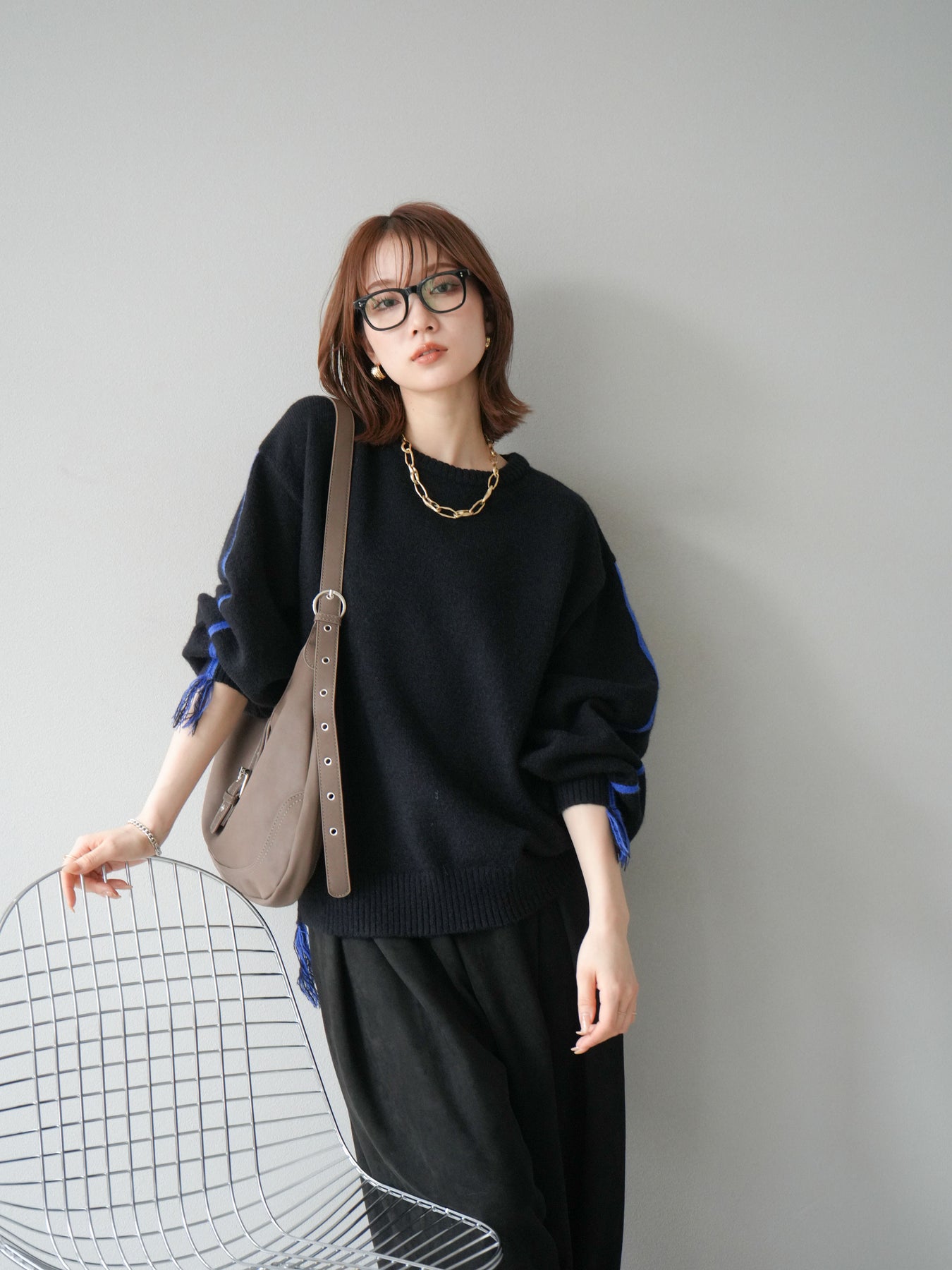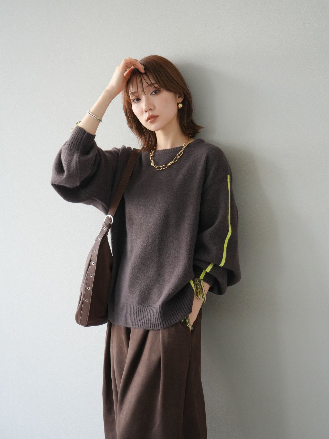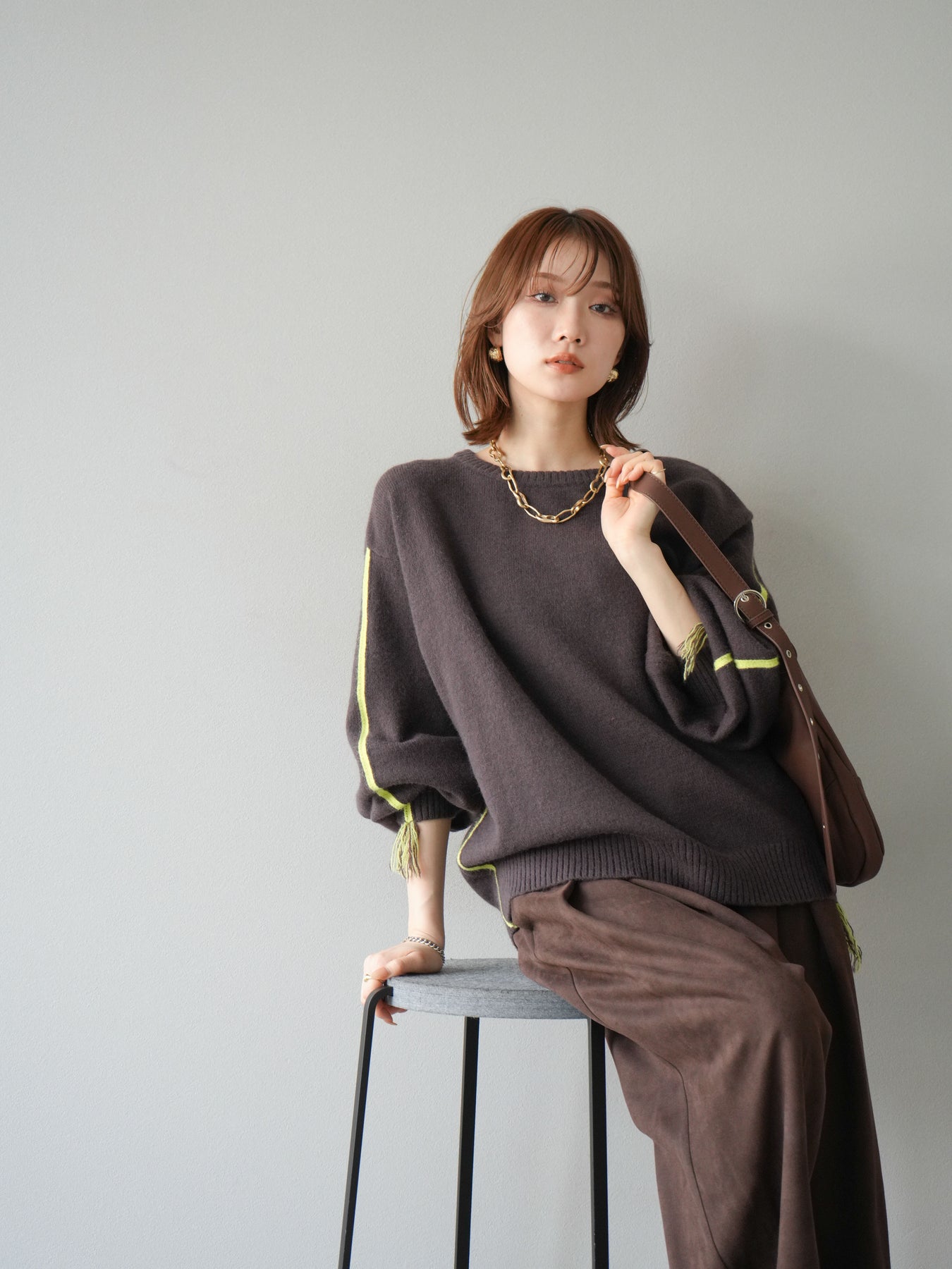 [SET]配色ステッチフリンジニットプルオーバー +スウェードタックワイドパンツ(2set)