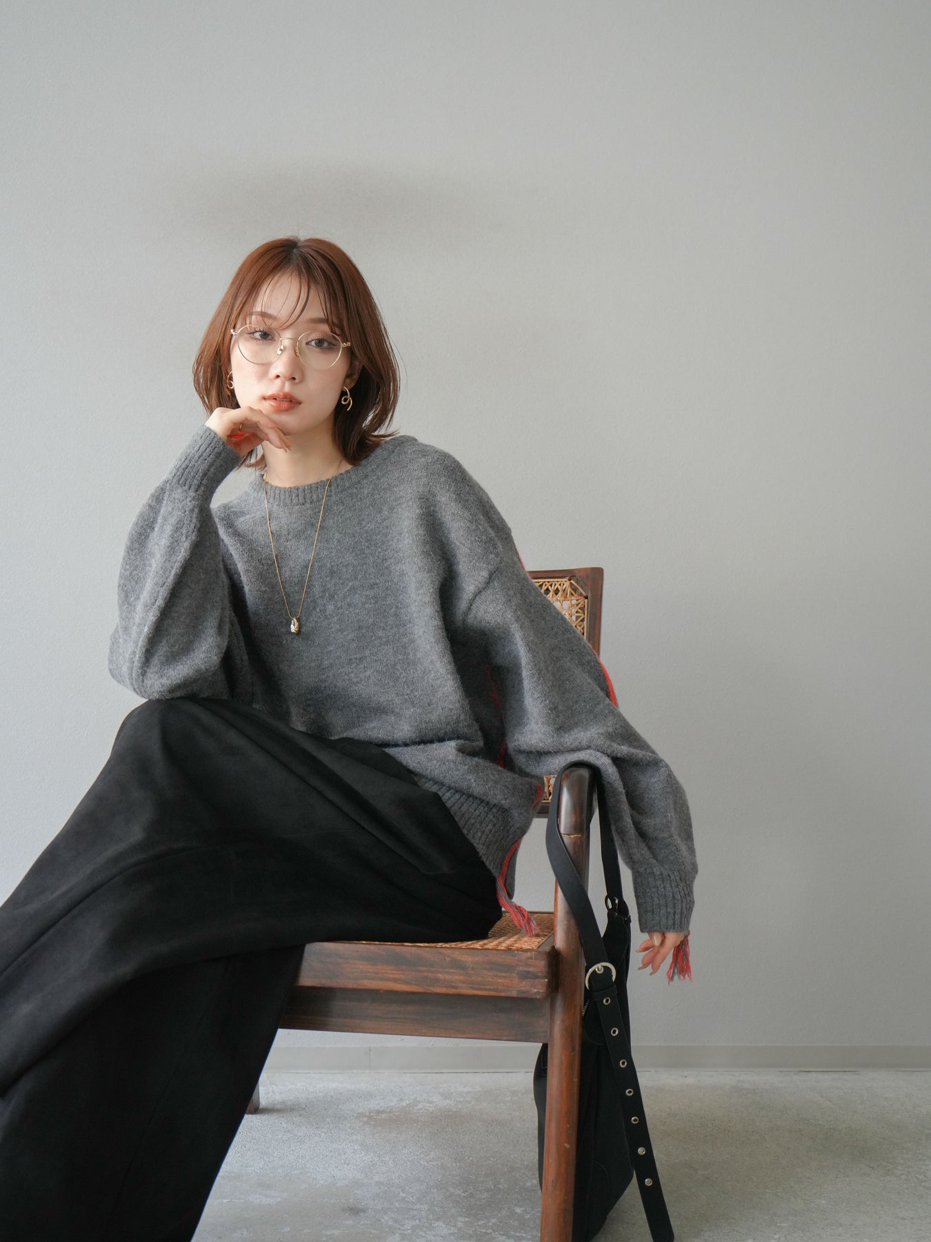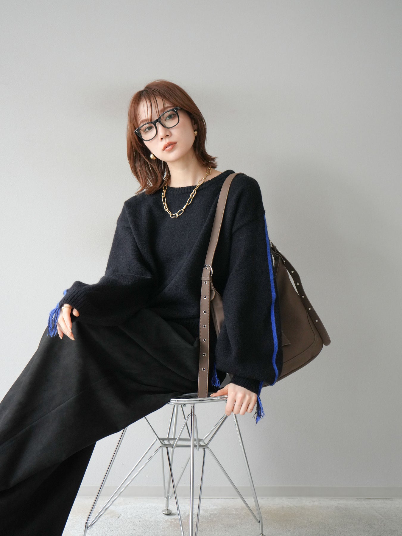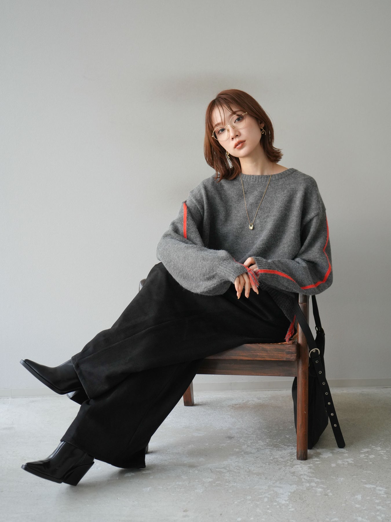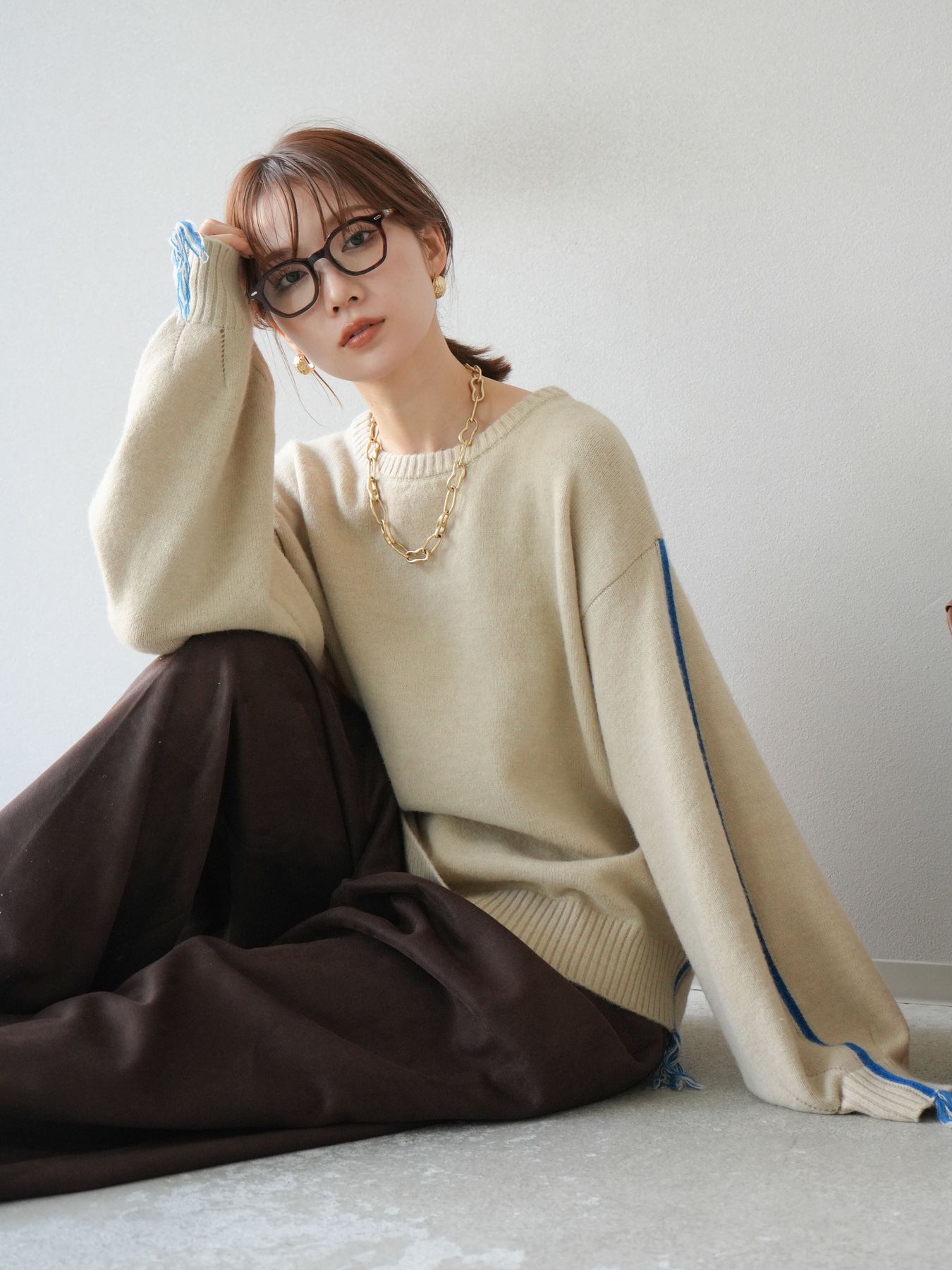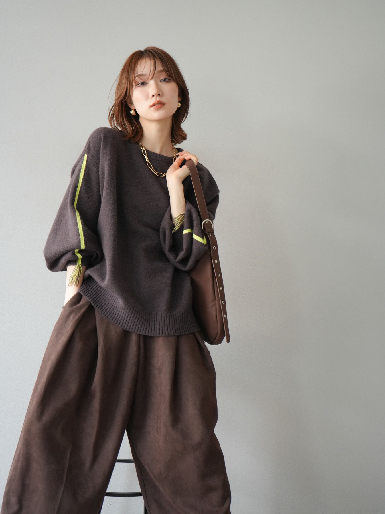 [SET]配色ステッチフリンジニットプルオーバー +スウェードタックワイドパンツ(2set)