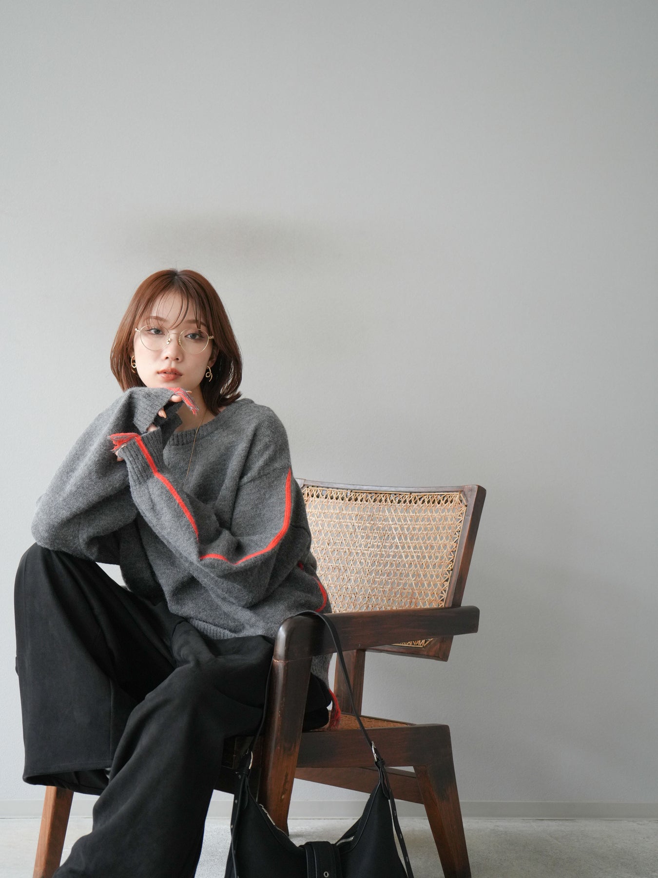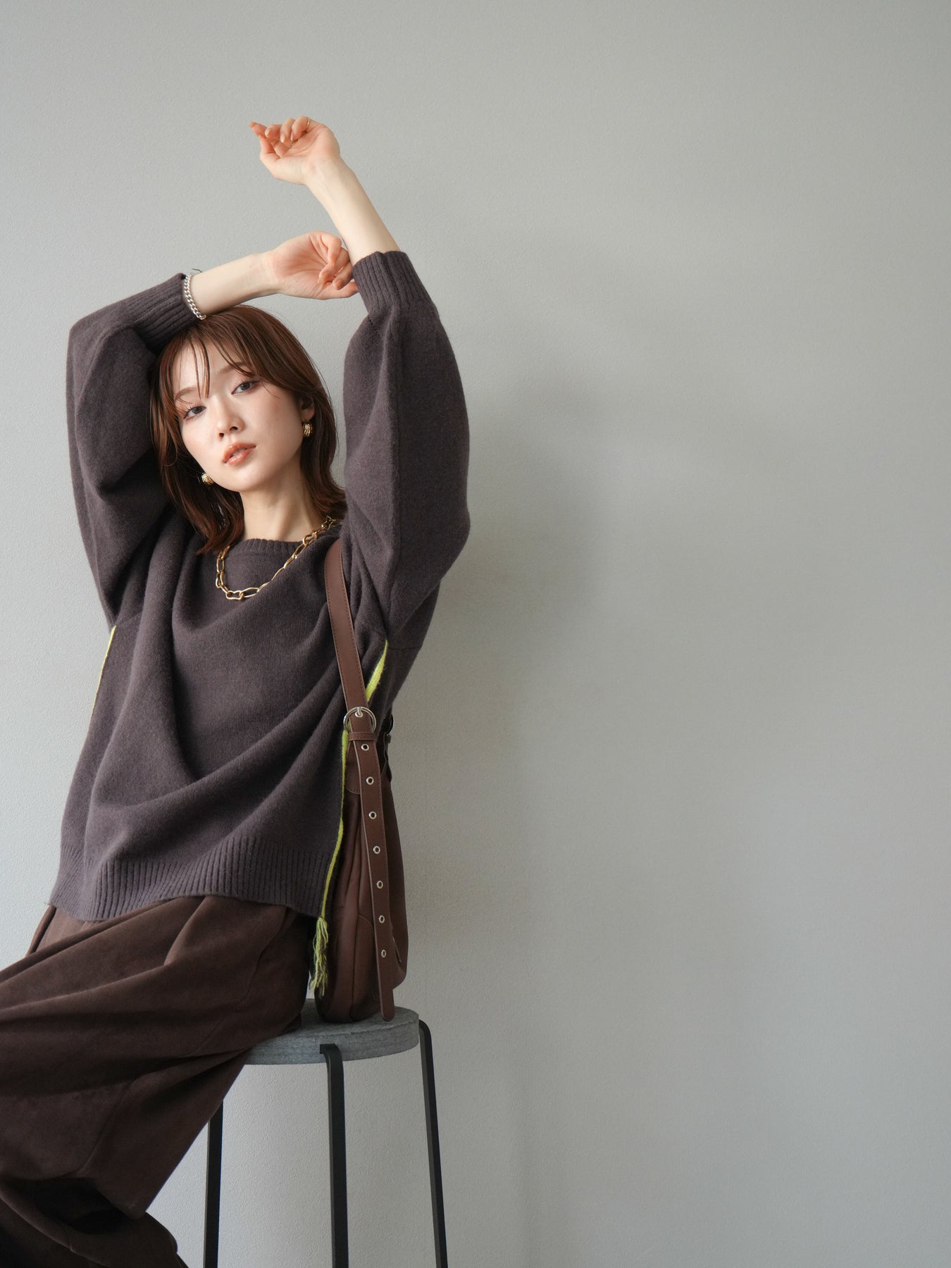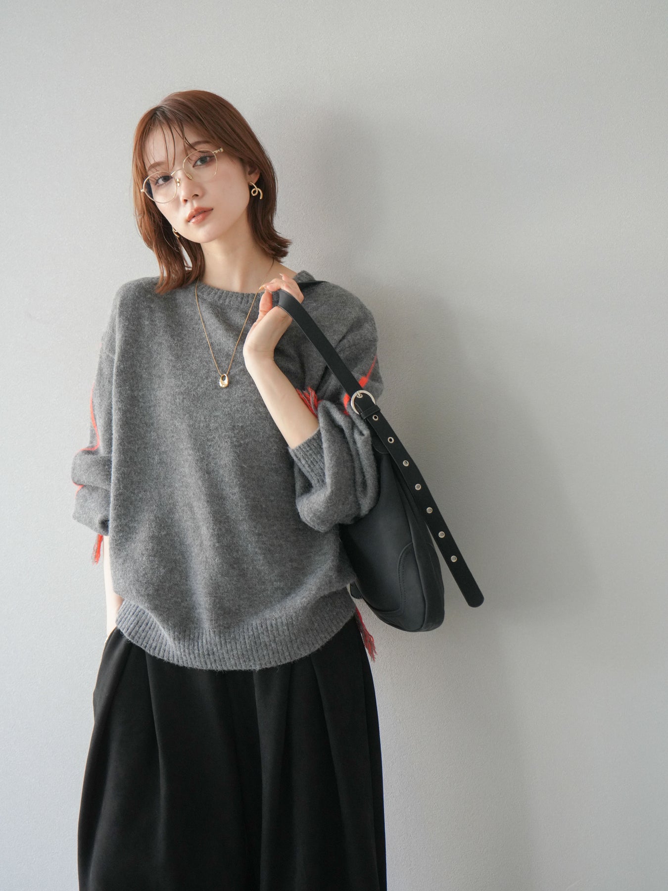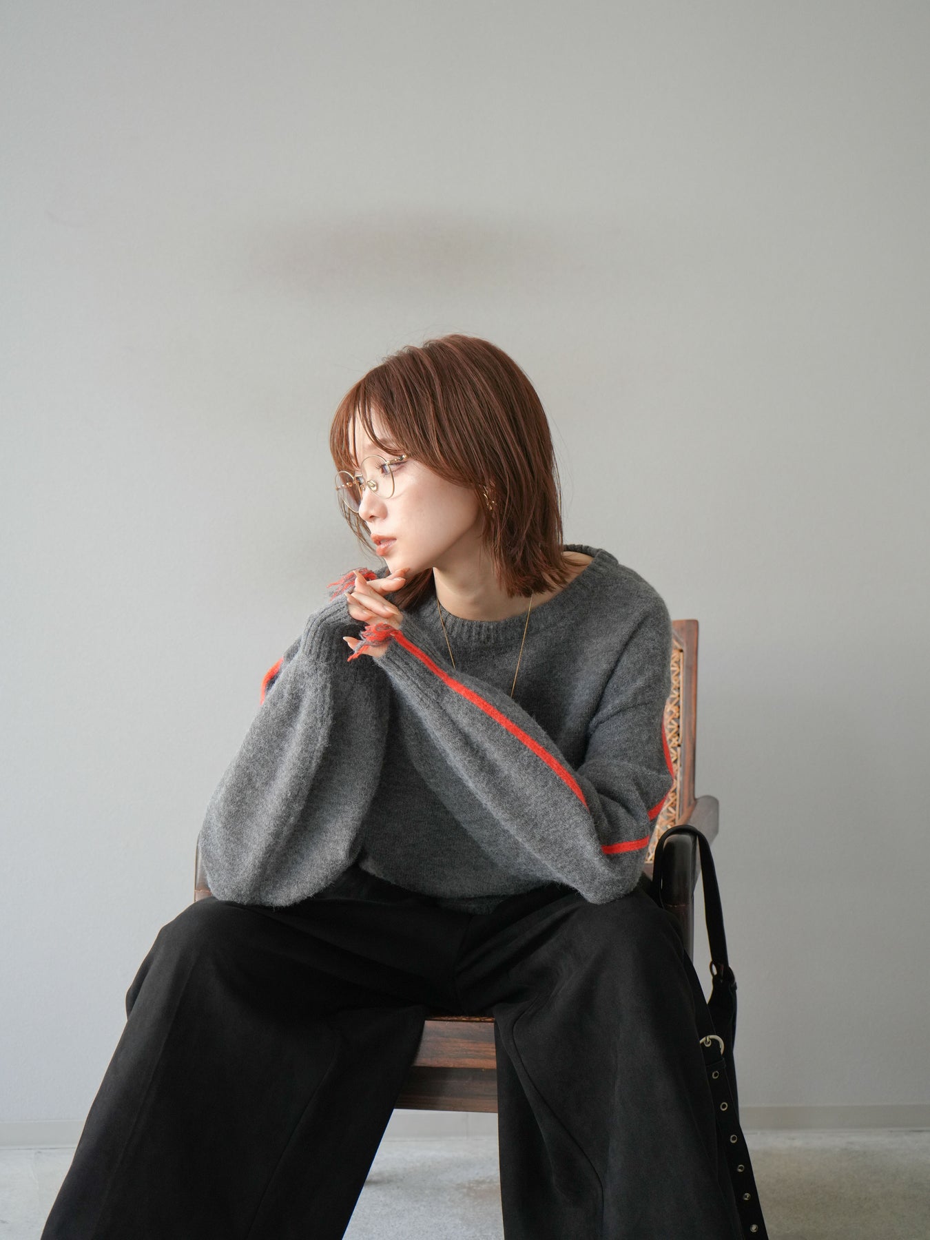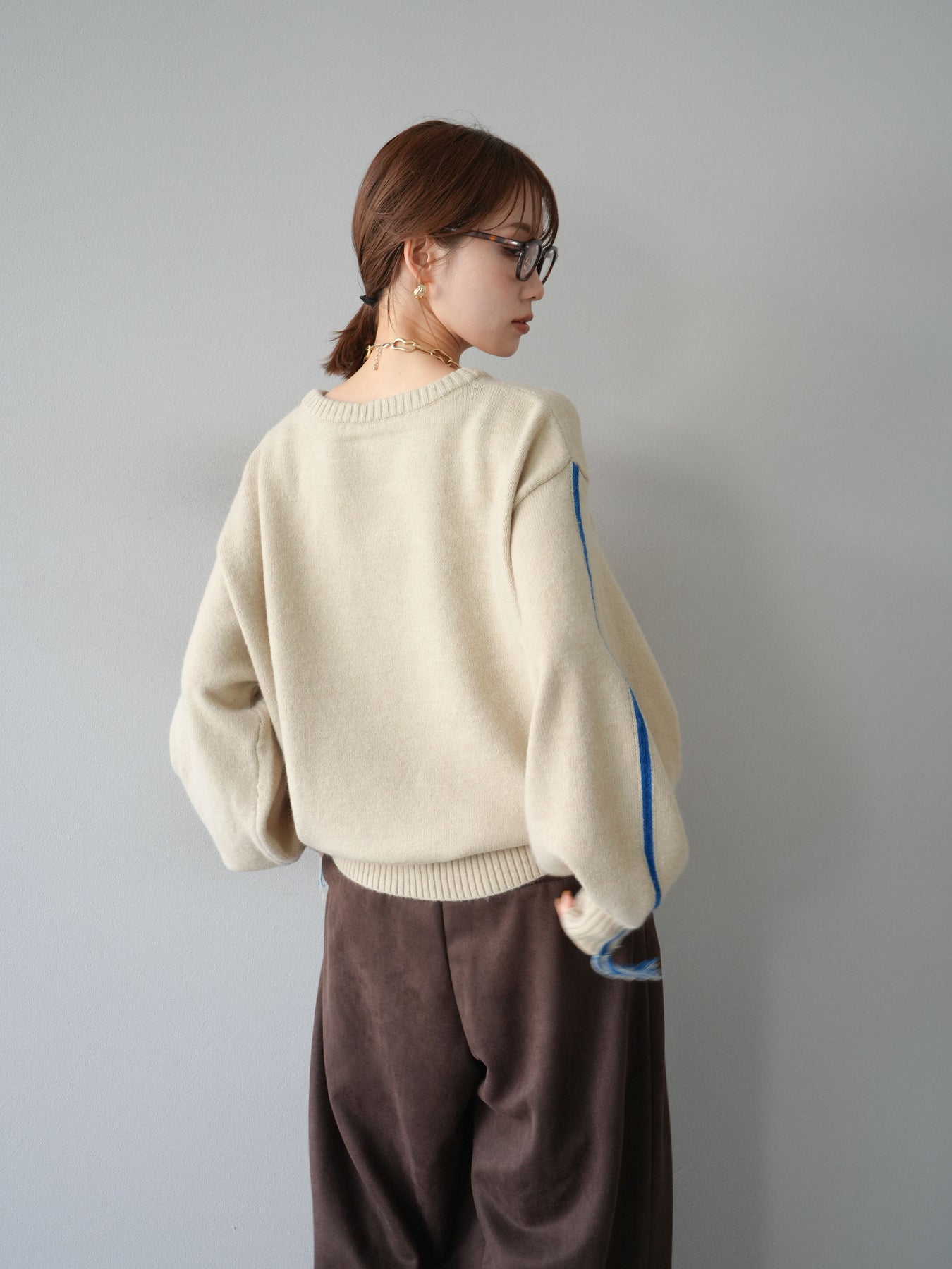 [SET]配色ステッチフリンジニットプルオーバー +スウェードタックワイドパンツ(2set)