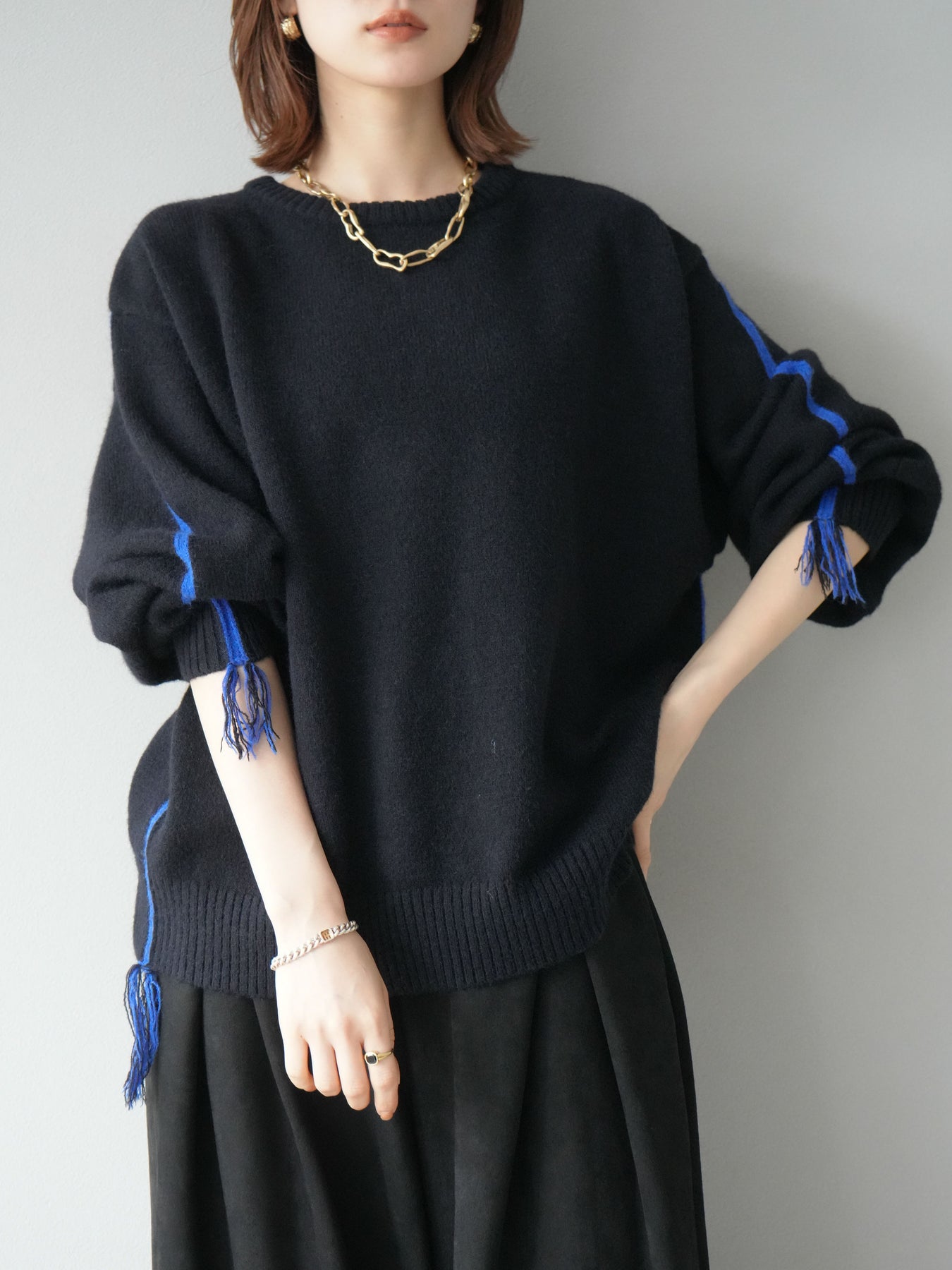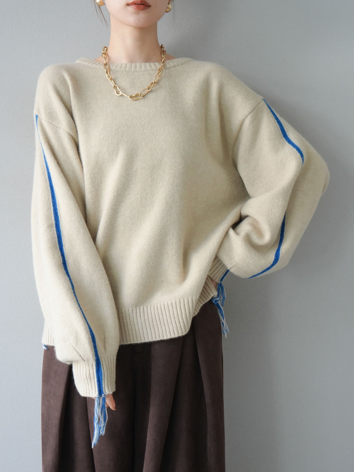 ◆ [予約]配色ステッチフリンジニットプルオーバー