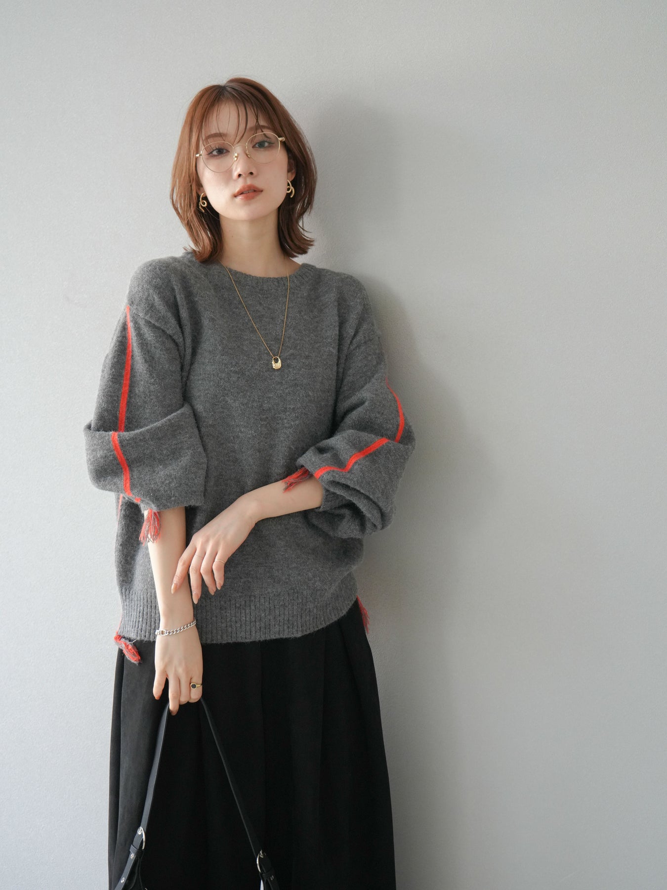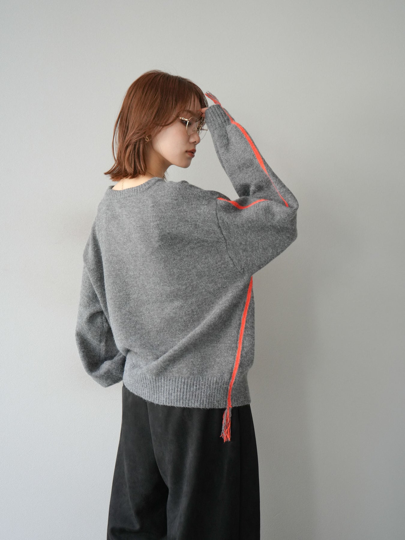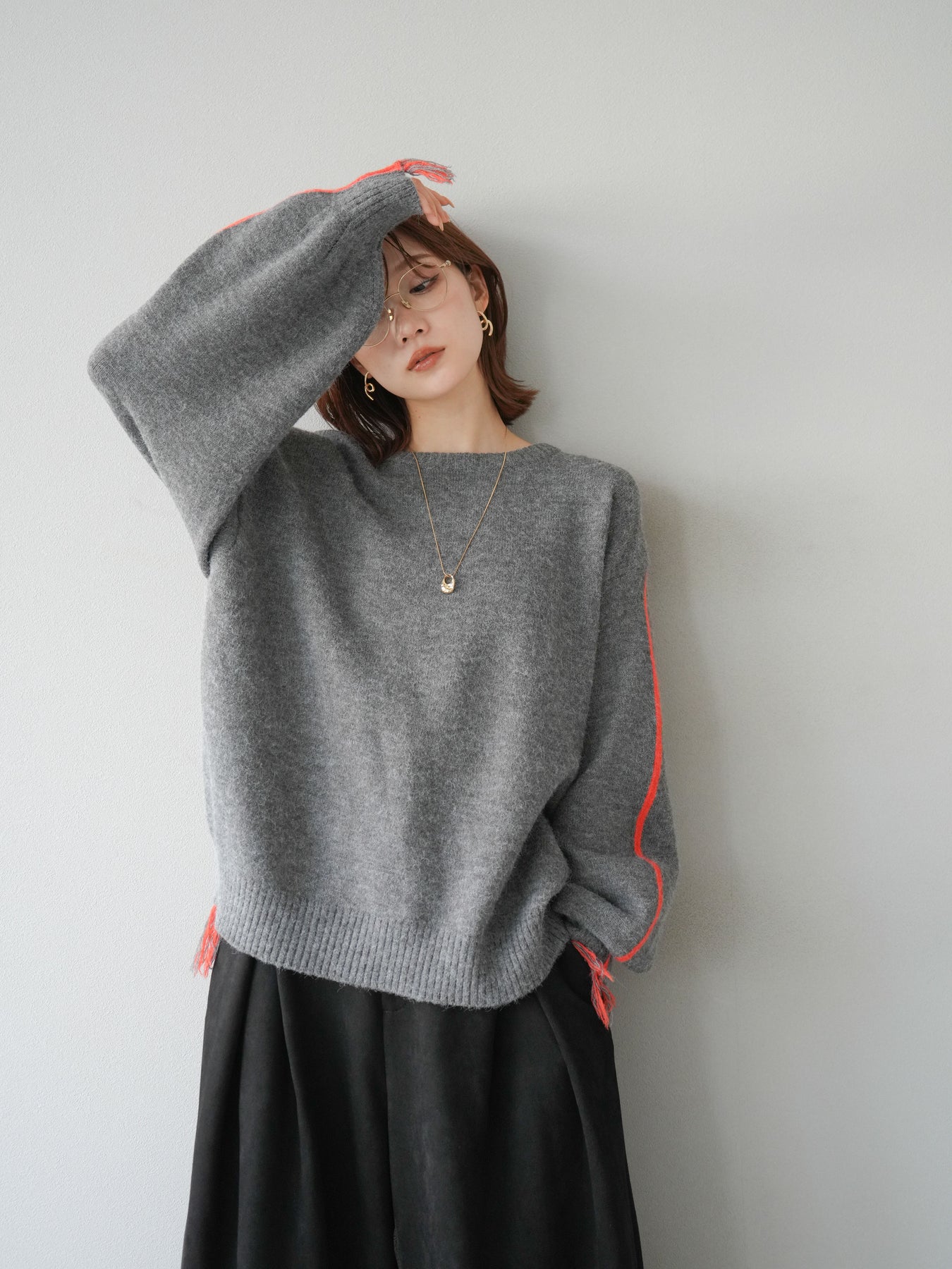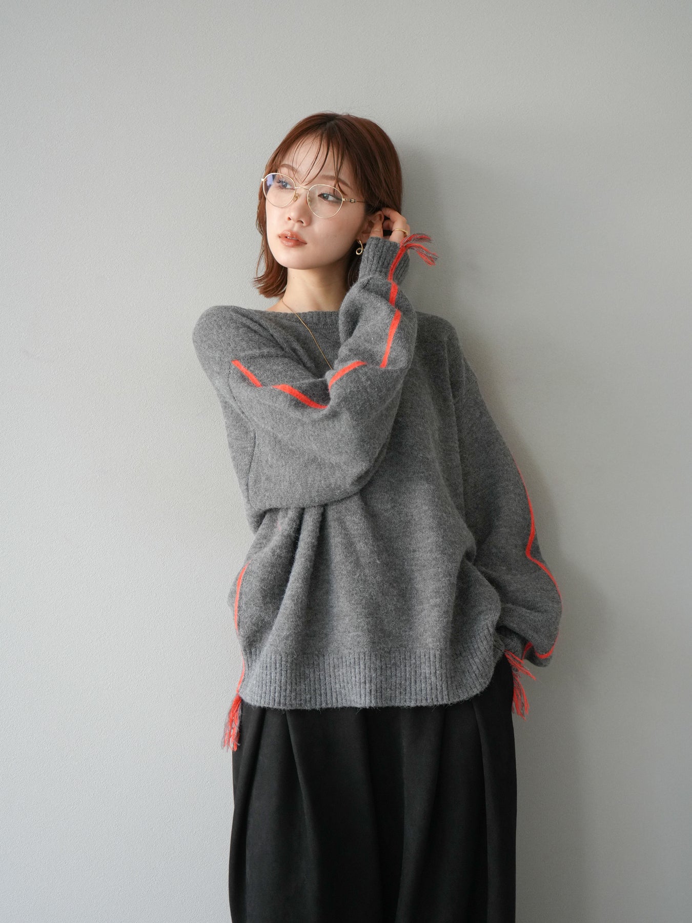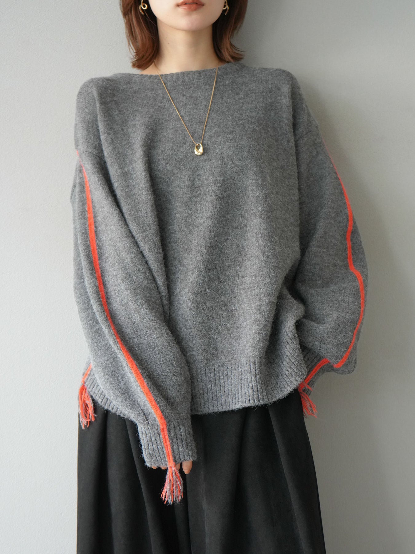 袖から裾にかけて施された配色ステッチとフリンジが、遊び心のあるアクセントになったニットプルオーバー。シンプルなシルエットながらもディテールで存在感を放ち、スタイリングに一枚取り入れるだけでこなれ感を演出します。柔らかな風合いで着心地も快適、デイリーにも取り入れやすいデザインです。デニムと合わせてカジュアルに、スカートと合わせて女性らしくと、幅広い着こなしが楽しめる万能アイテム。 ※ボトムス、キャミソール(インナー)以外の商品は一律でインナーは付属していません。