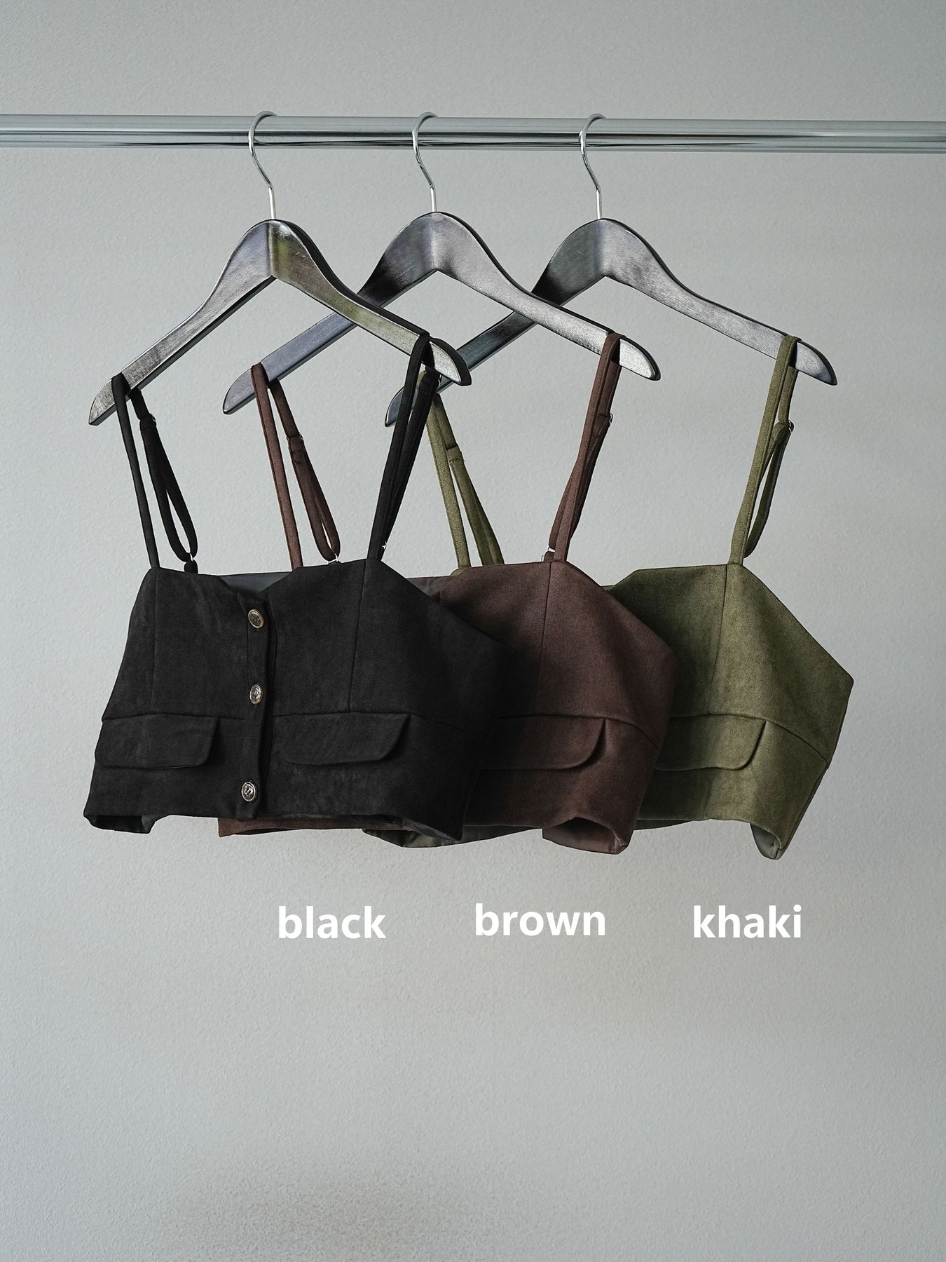 スウェード調素材を使用したビスチェは、シーズンムード漂う落ち着いた表情が魅力。コンパクトなシルエットながらも、フロントのボタンやポケットデザインがアクセントとなり、スタイリングに立体感をプラスしてくれます。シャツやカットソーに重ねればトレンド感のあるレイヤードスタイルに、ジャケットのインナーとして合わせればモードな印象に。ベーシックながらも存在感を放ち、コーディネートの幅を広げてくれるアイテムです。