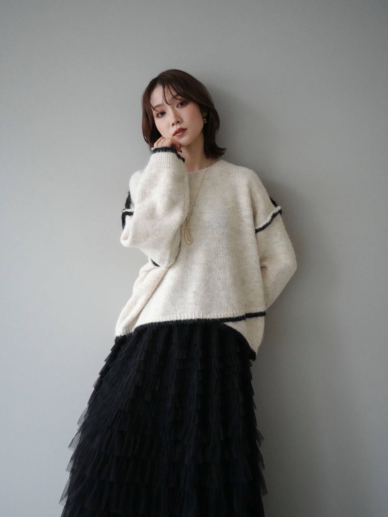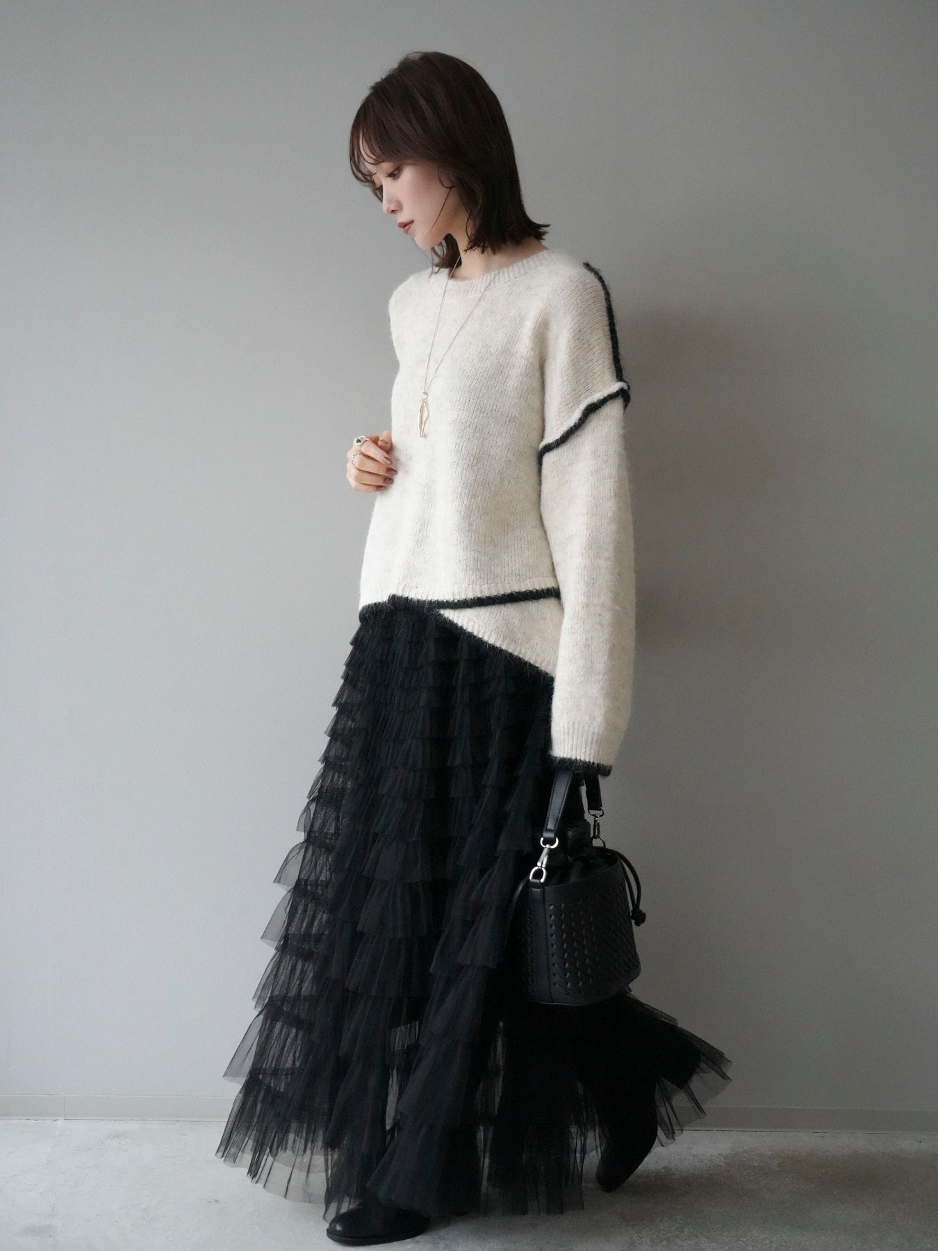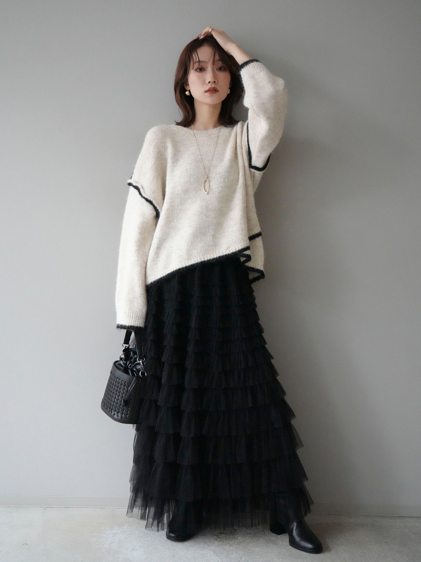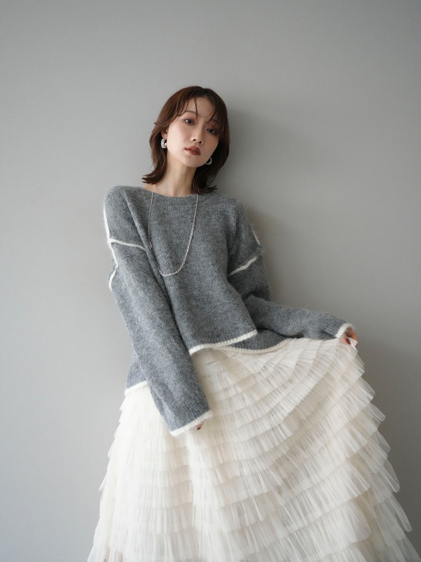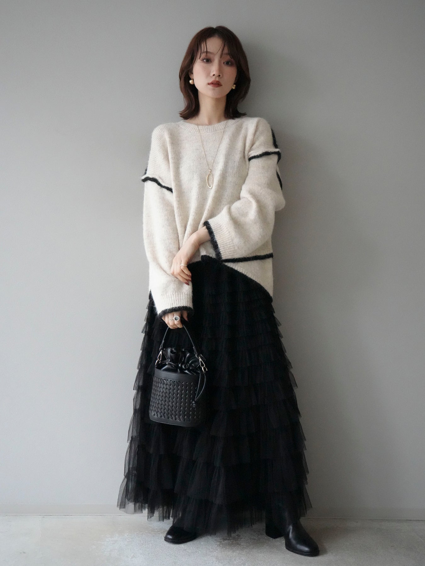 [SET]バイカラーレイヤードデザインニットプルオーバー+チュールティアードスカート(2set)