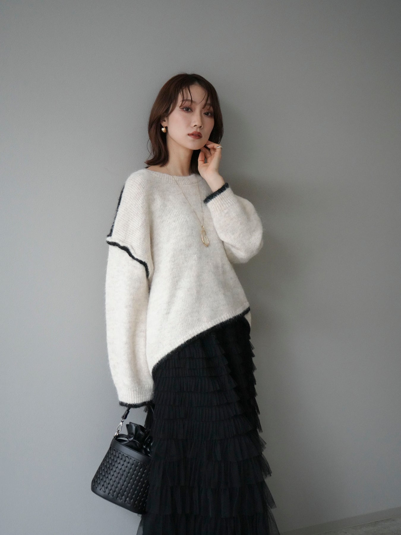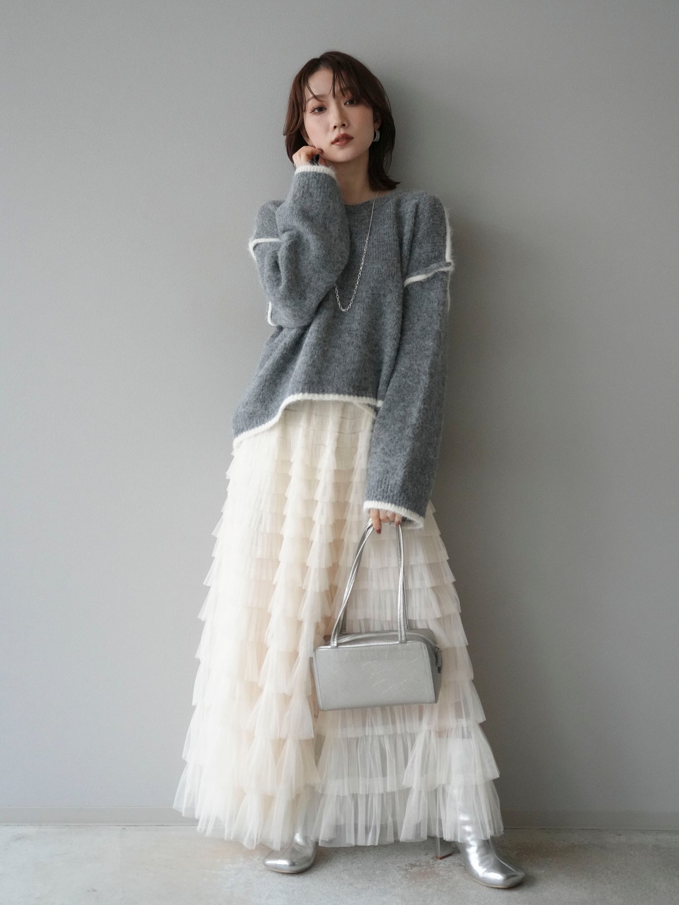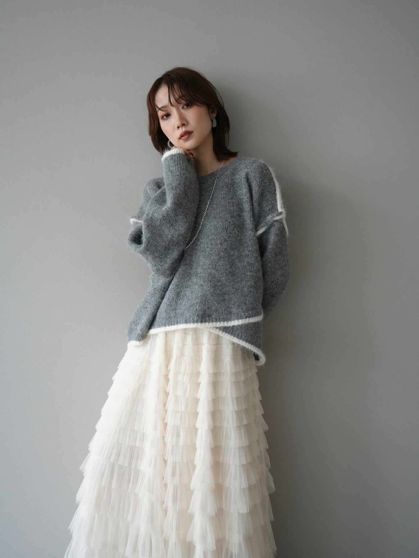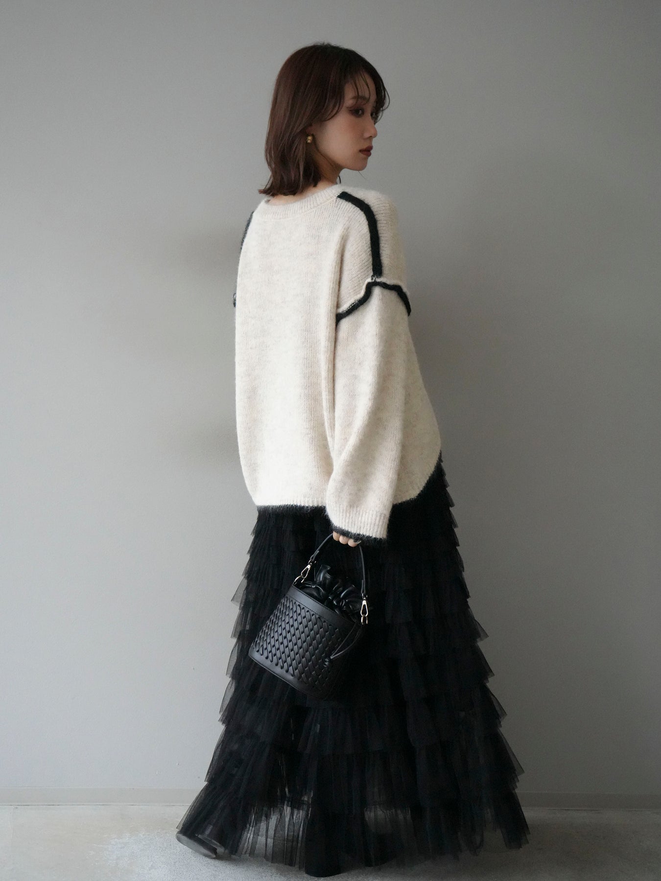 [SET]バイカラーレイヤードデザインニットプルオーバー+チュールティアードスカート(2set)