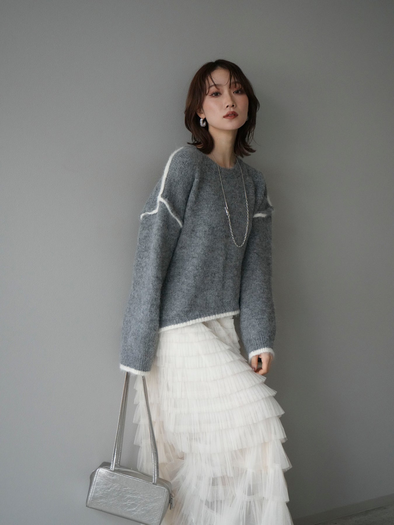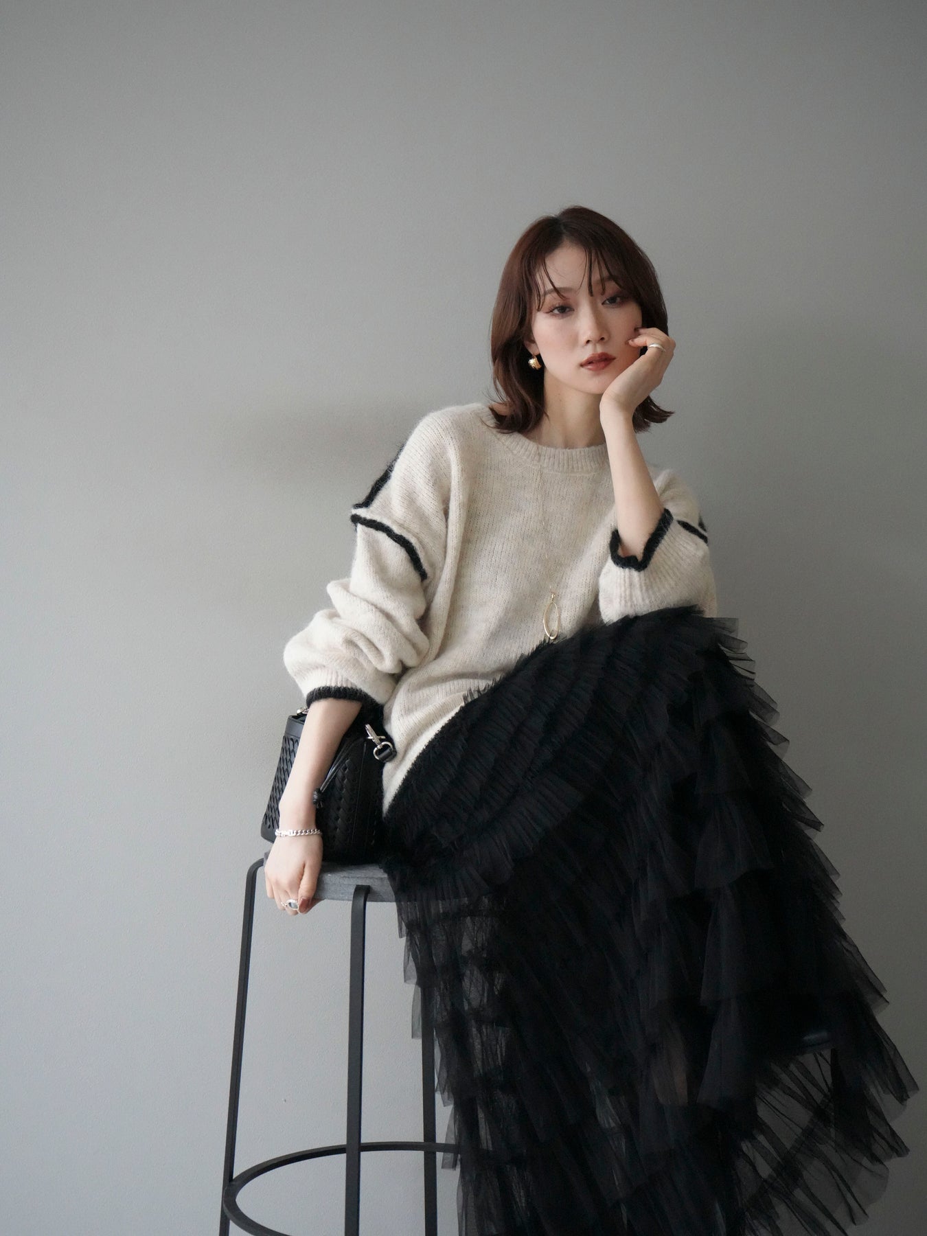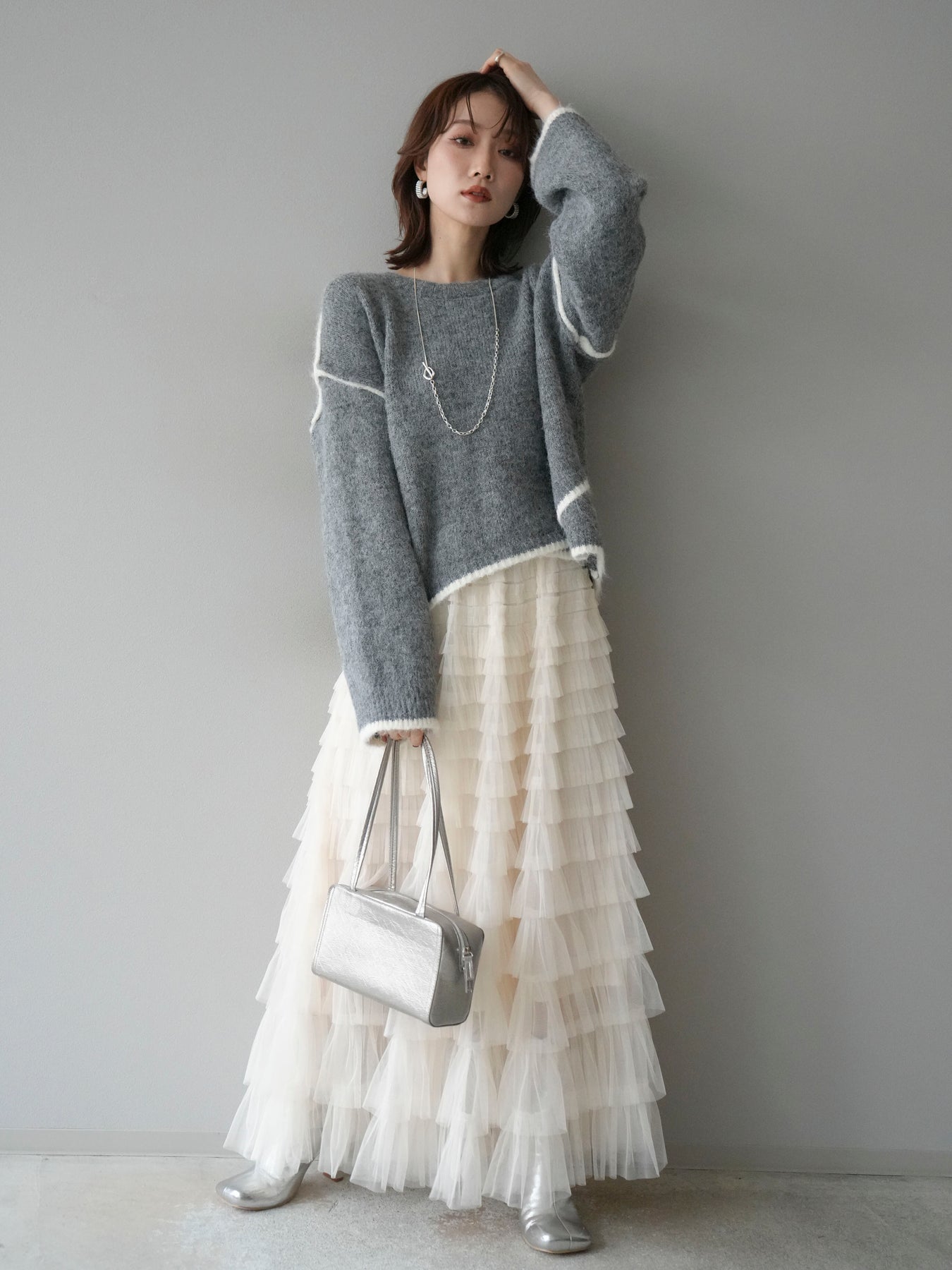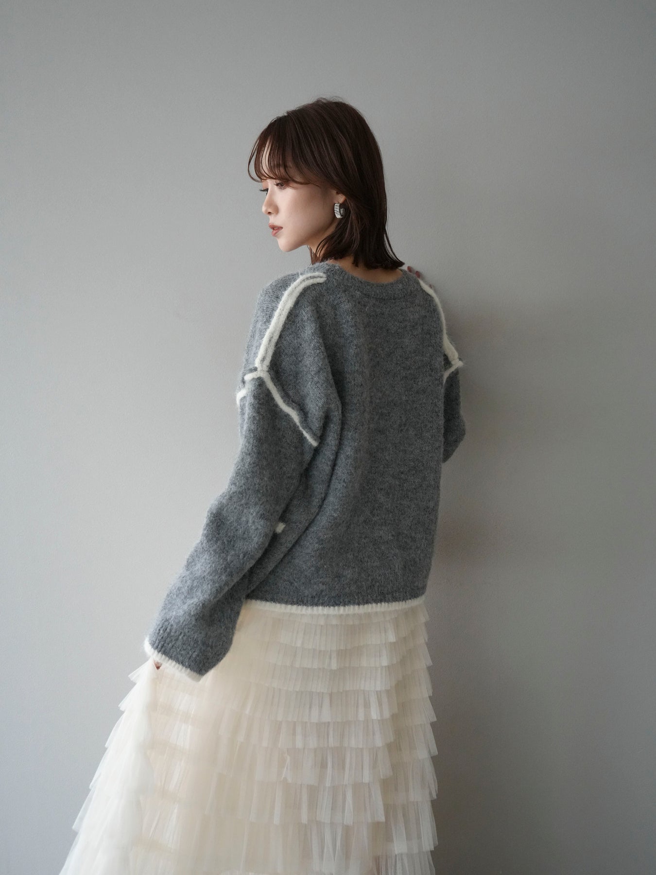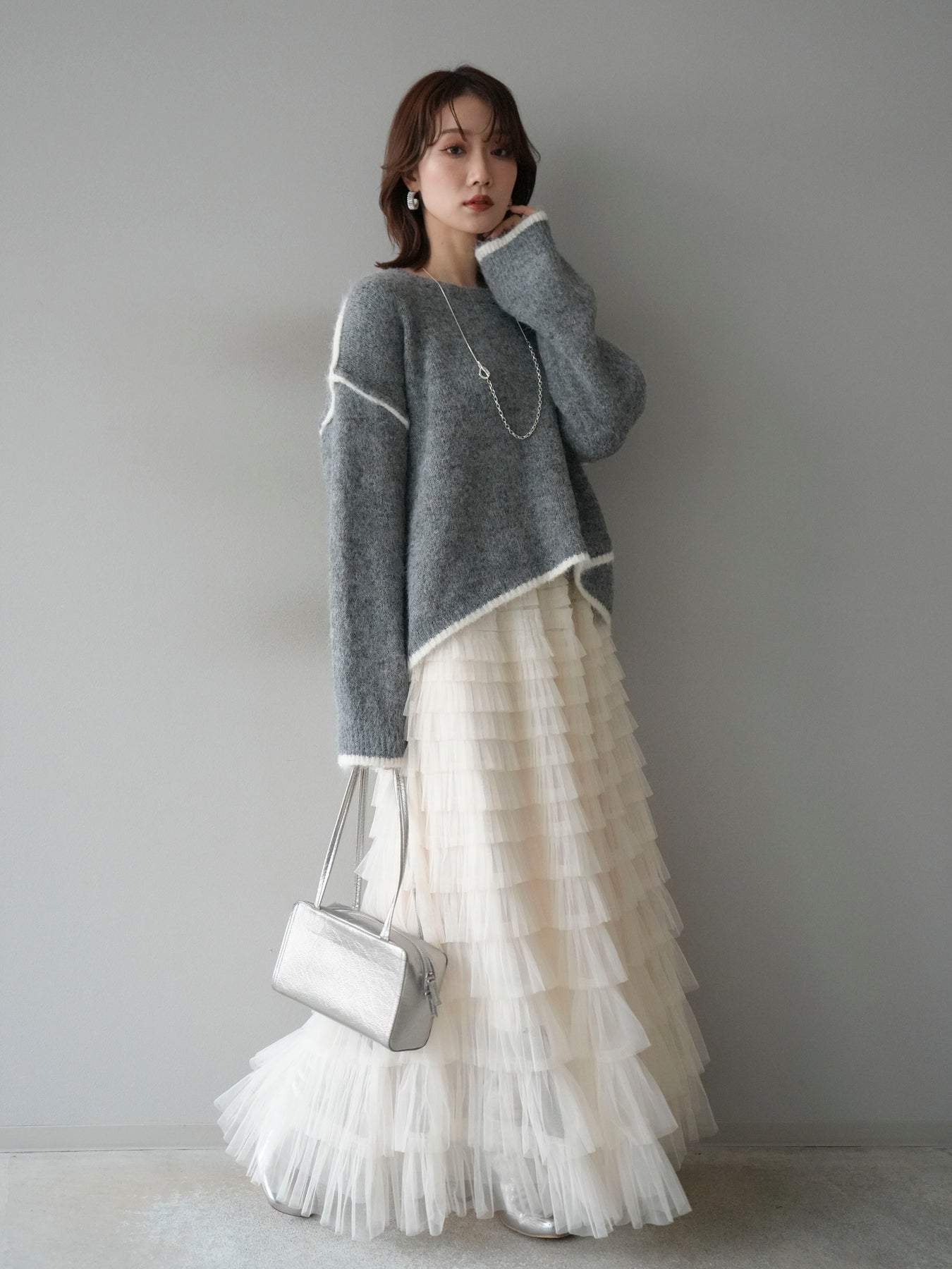 [SET]バイカラーレイヤードデザインニットプルオーバー+チュールティアードスカート(2set)