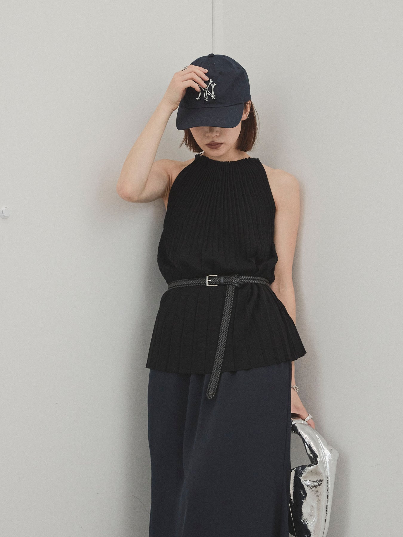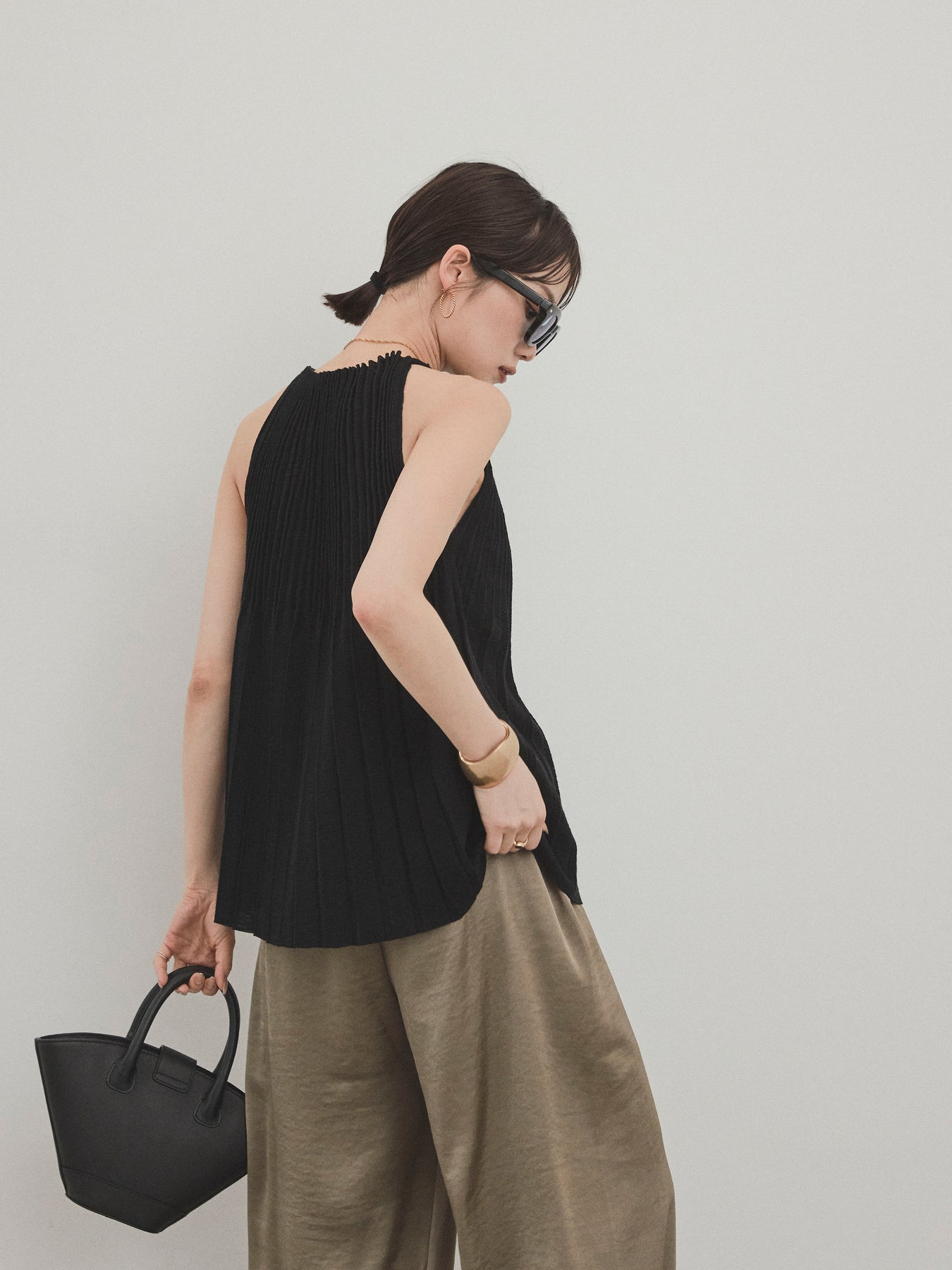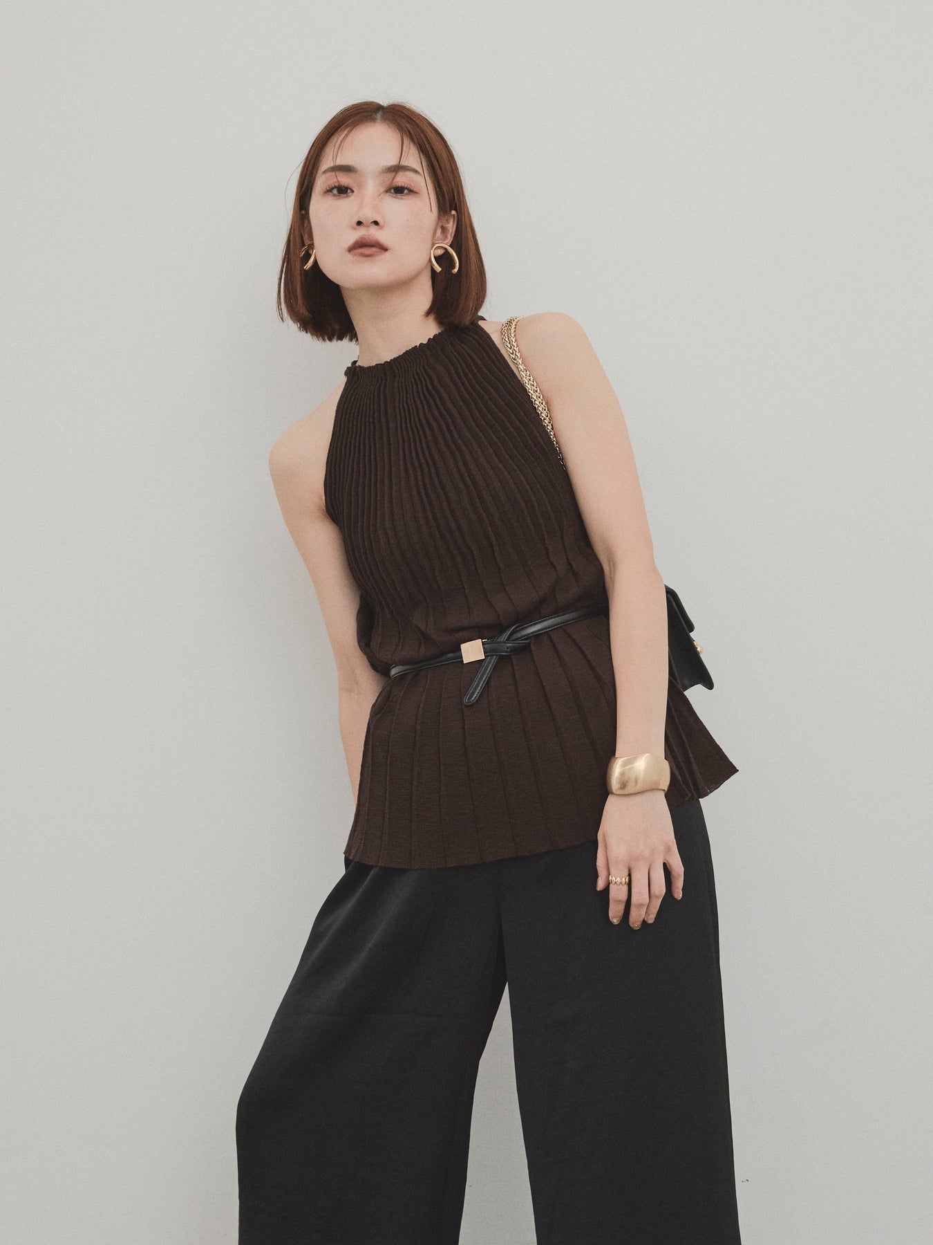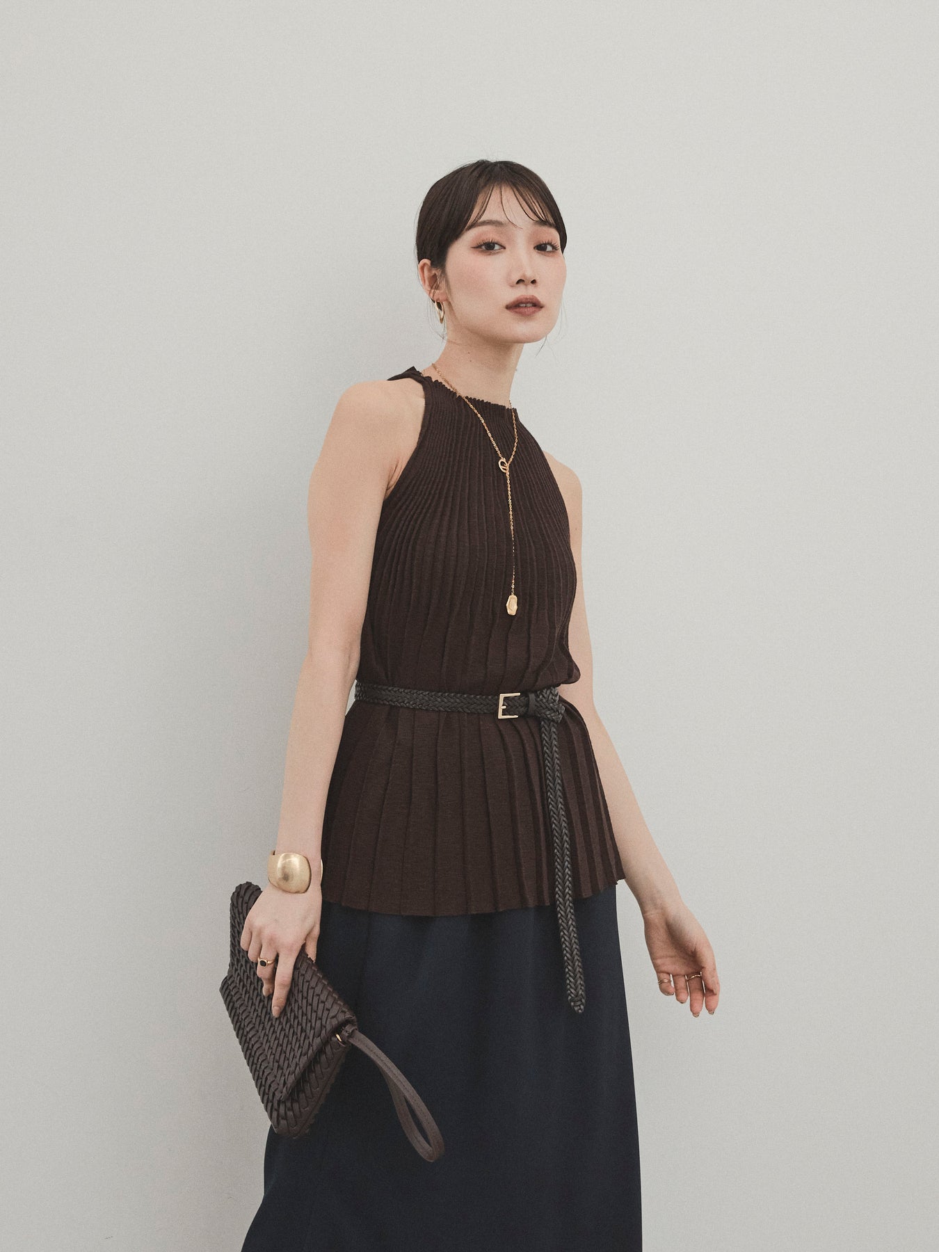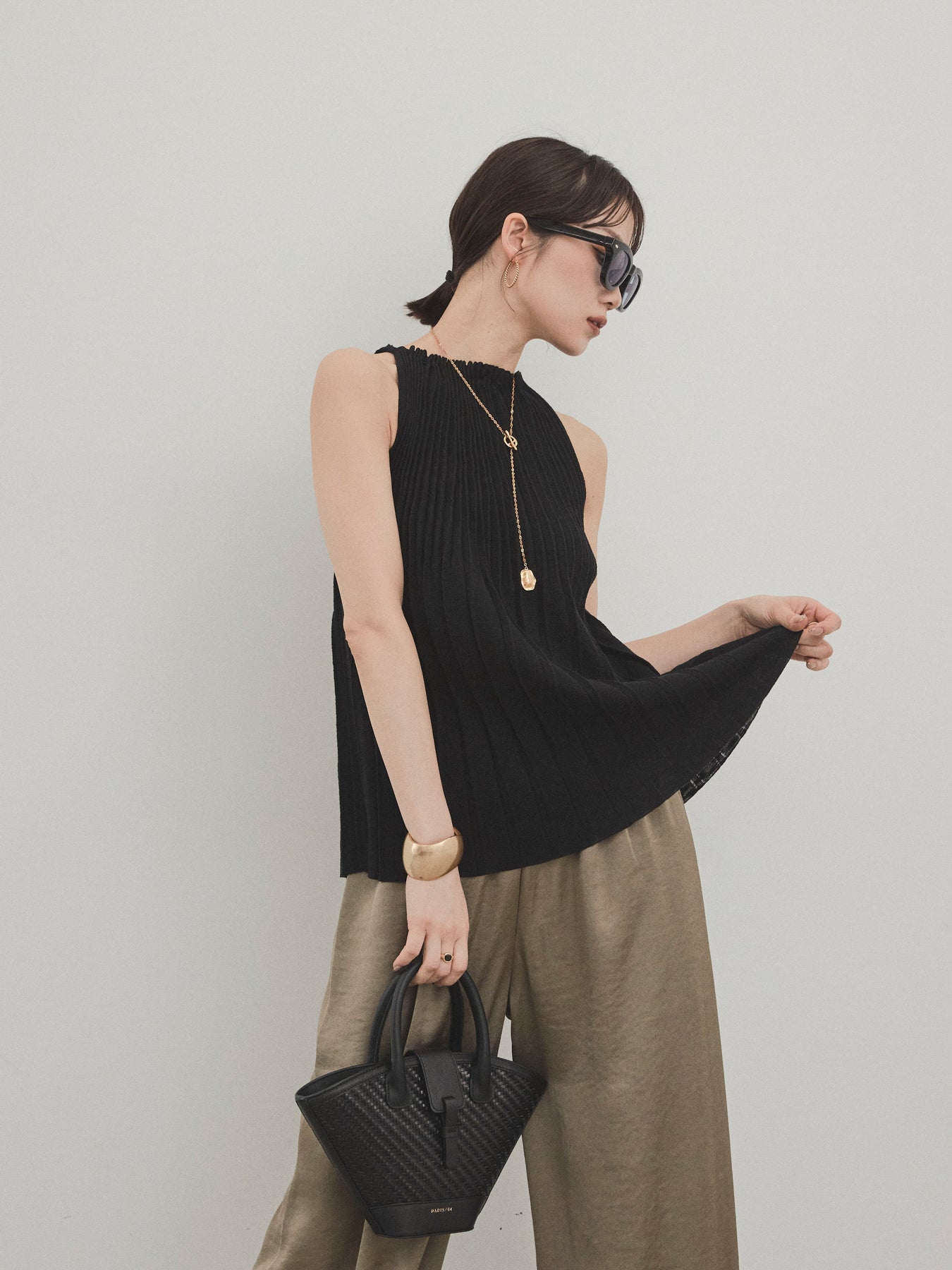 縦ラインが美しいプリーツ編みで仕立てた、大人の洗練を感じさせるニットキャミソール。 身体のラインを拾いすぎない絶妙なシルエットで、スタイルアップも叶える一枚です。 ややハイネック寄りのデザインと肩の露出を抑えた絶妙なアームホールのカットが、ヘルシーながらも上品な印象に。 さらりとした肌あたりのニット素材で、暑い季節でも快適に着用できます。 一枚での着用はもちろん、ジャケットやシャツのインナーとしても活躍する万能トップス。 カジュアルからきれいめまで、幅広いコーディネートに対応できるアイテムです。