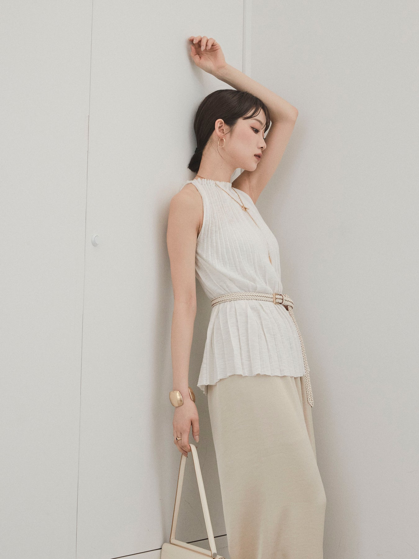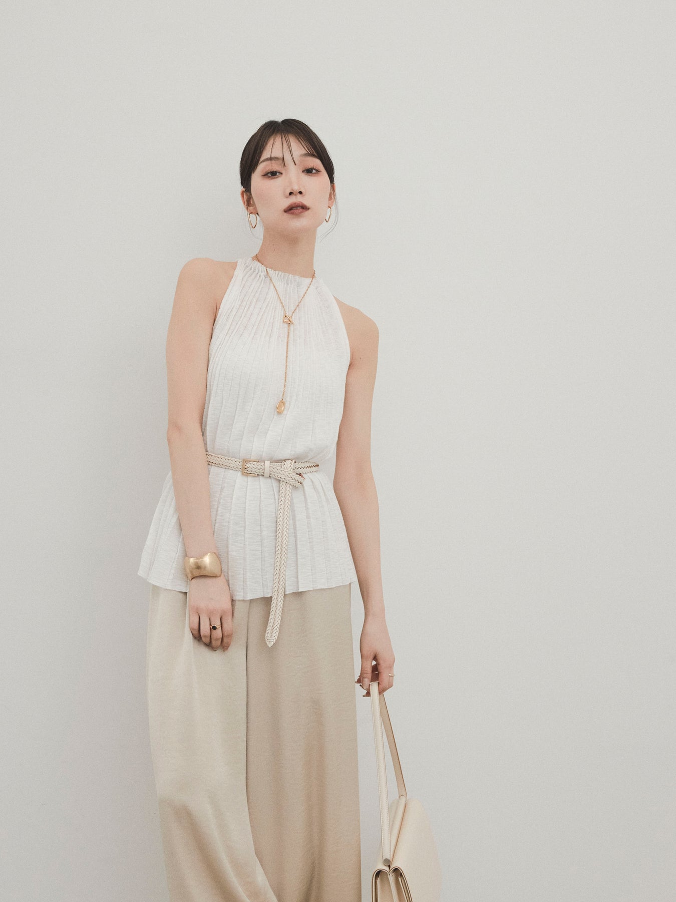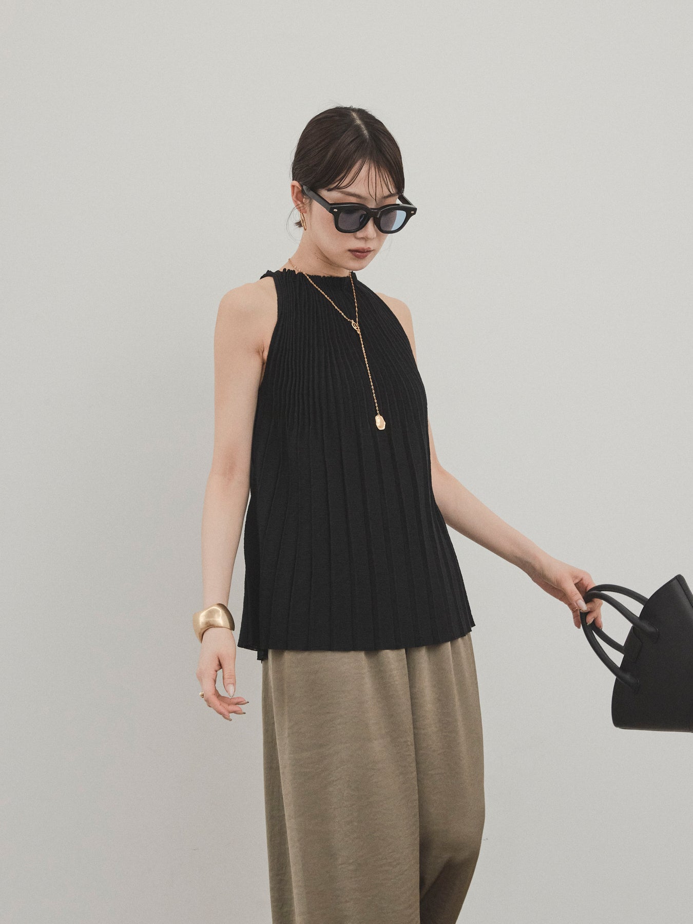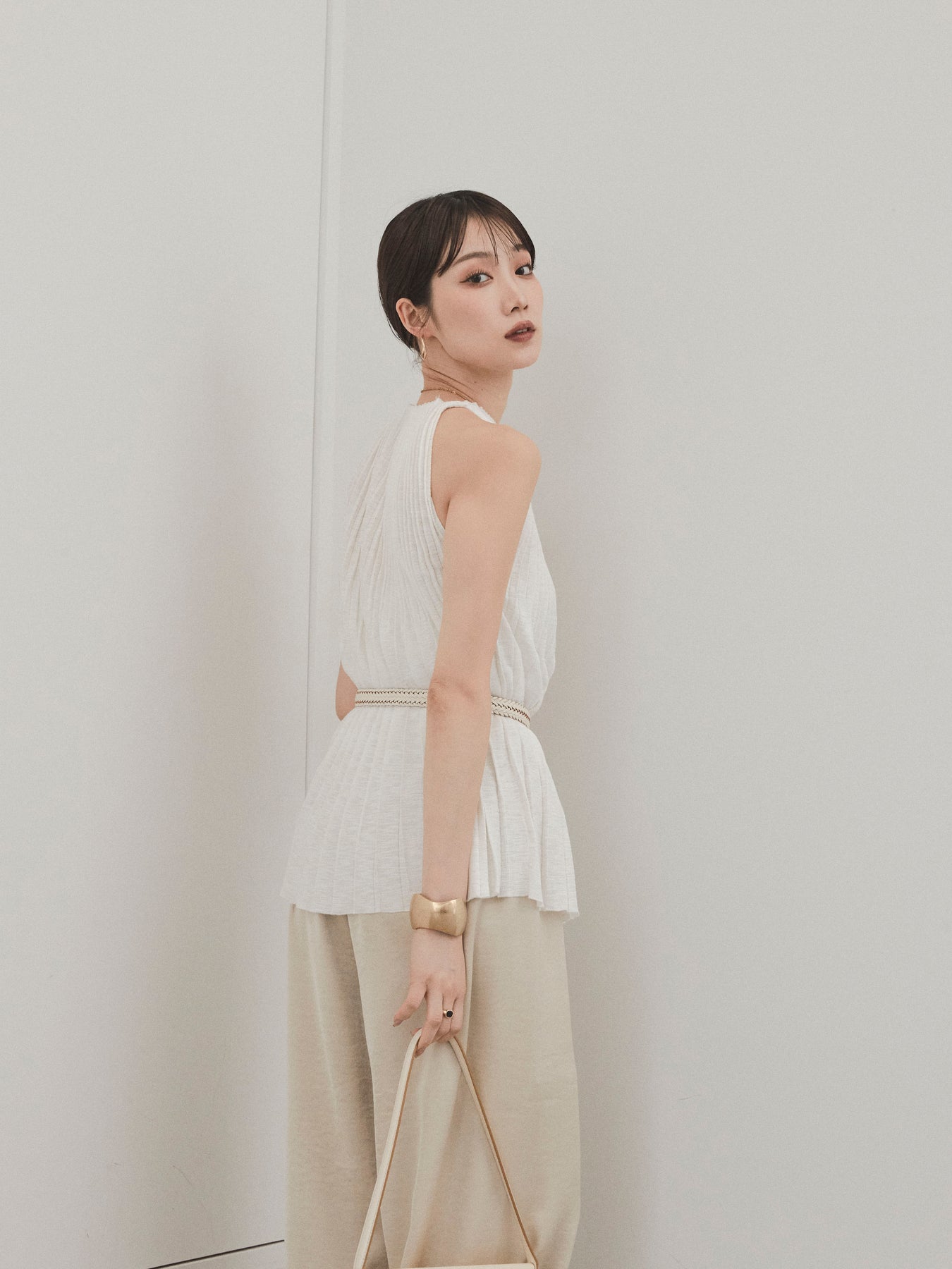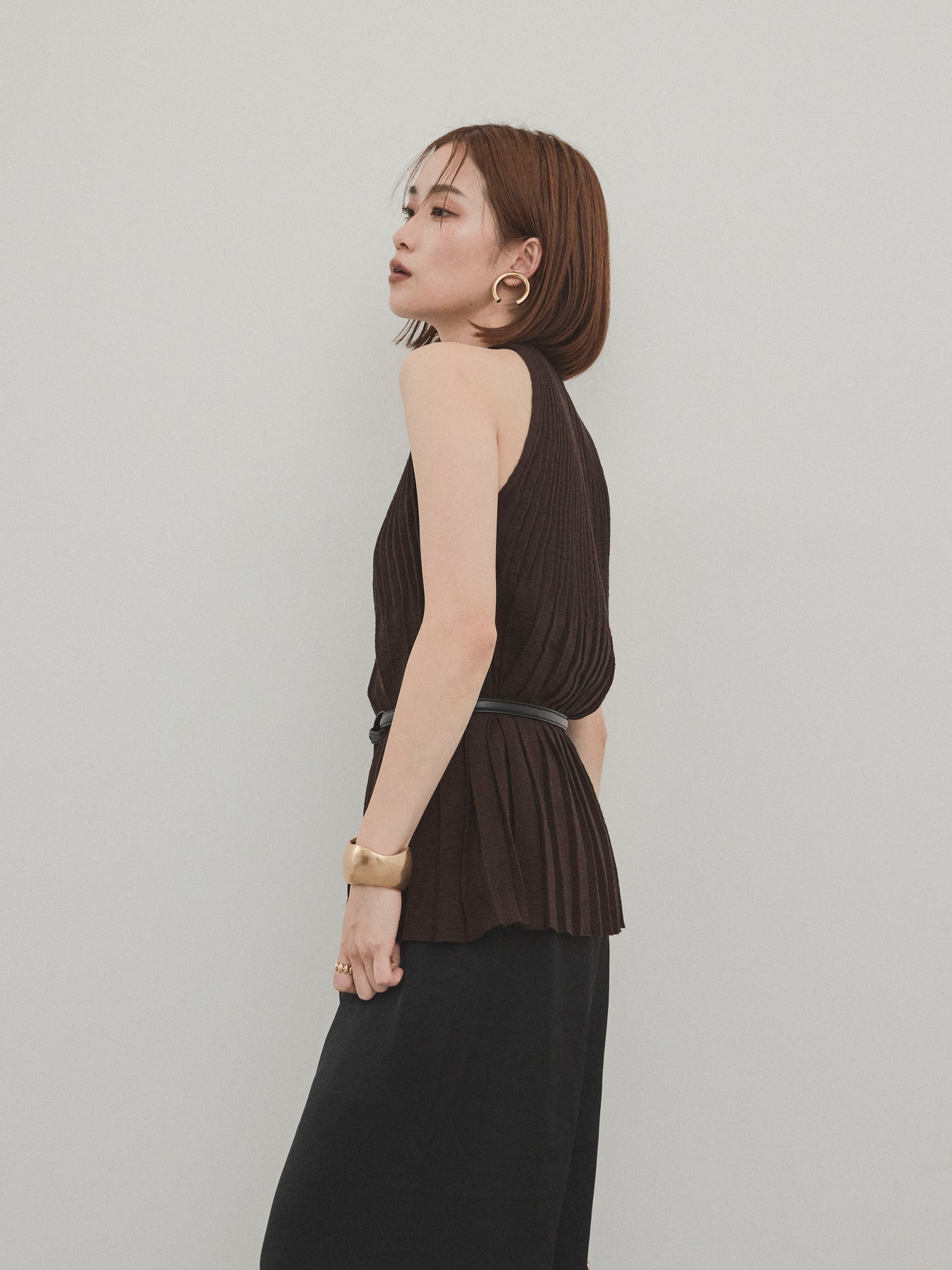 縦ラインが美しいプリーツ編みで仕立てた、大人の洗練を感じさせるニットキャミソール。 身体のラインを拾いすぎない絶妙なシルエットで、スタイルアップも叶える一枚です。 ややハイネック寄りのデザインと肩の露出を抑えた絶妙なアームホールのカットが、ヘルシーながらも上品な印象に。 さらりとした肌あたりのニット素材で、暑い季節でも快適に着用できます。 一枚での着用はもちろん、ジャケットやシャツのインナーとしても活躍する万能トップス。 カジュアルからきれいめまで、幅広いコーディネートに対応できるアイテムです。