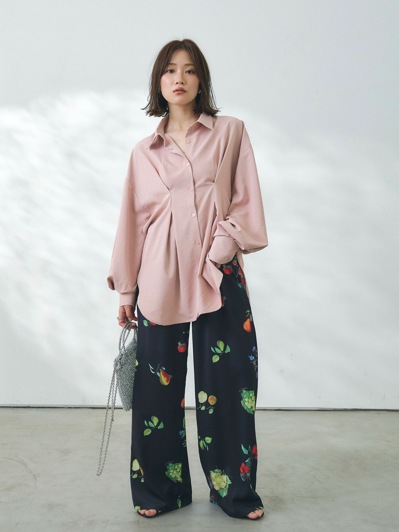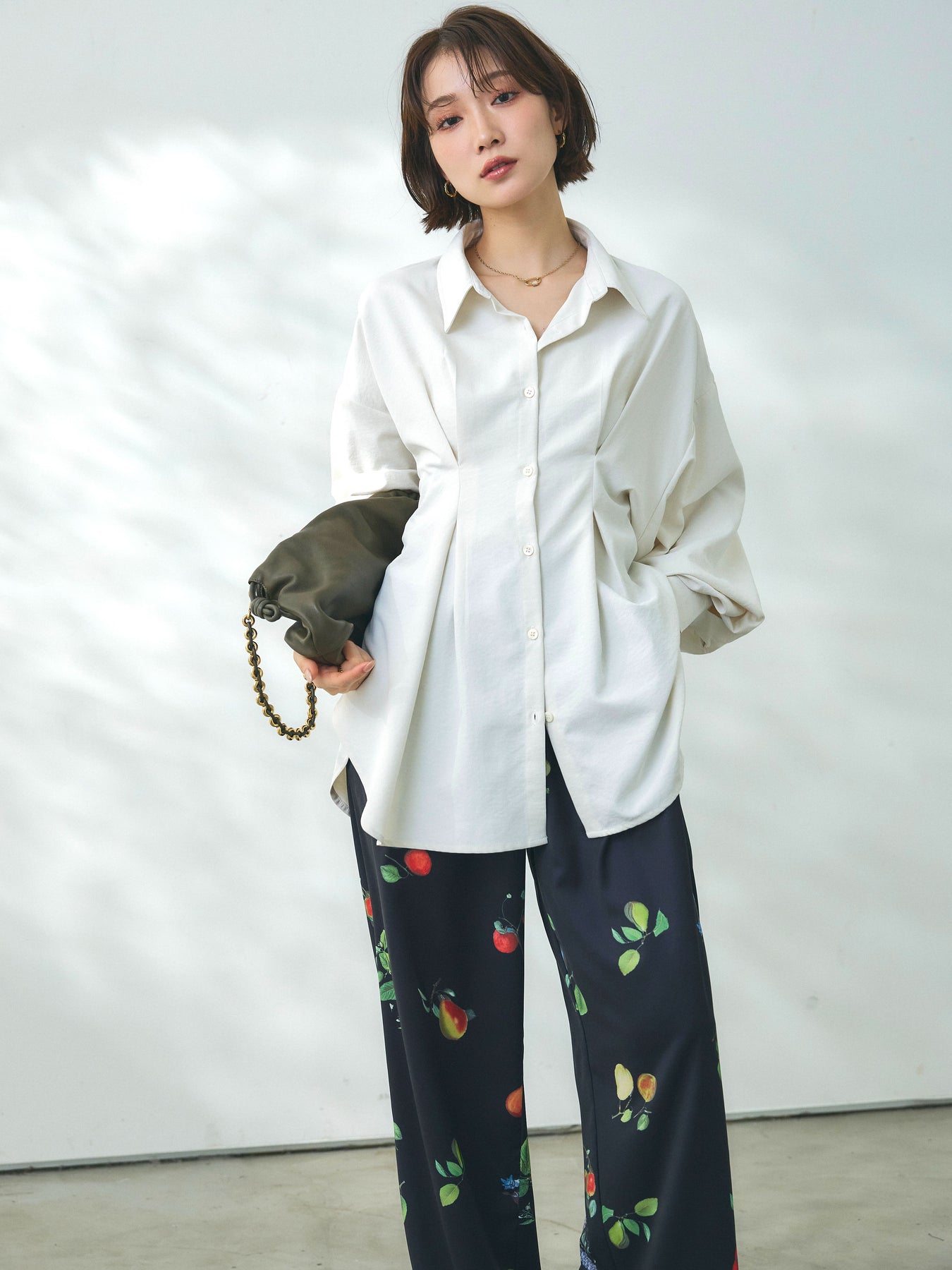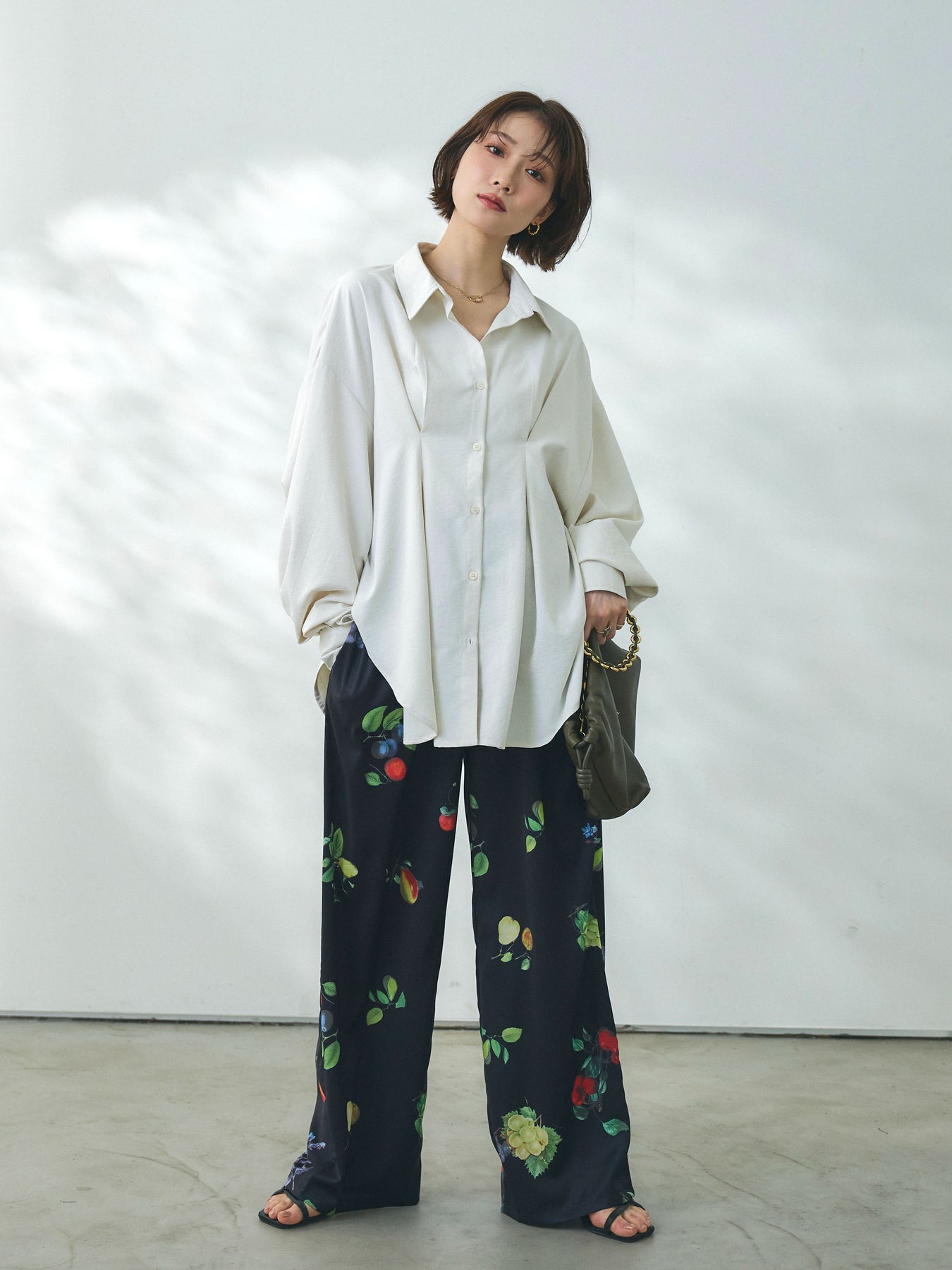 鮮やかなボタニカルプリントが目を惹くイージーパンツ。フルーツやフラワーをモチーフにした華やかな柄がスタイリングの主役になり、シンプルなトップスと合わせるだけで印象的なコーディネートが完成します。落ち感のある軽やかな素材が美しいドレープを生み、動くたびにしなやかな表情を演出。ウエストはゴム仕様でストレスフリーな穿き心地を叶えつつ、リラックス感のあるワイドシルエットで抜け感のある印象に仕上げています。デイリーからリゾートシーンまで幅広く活躍する、着映え力の高い一着です。